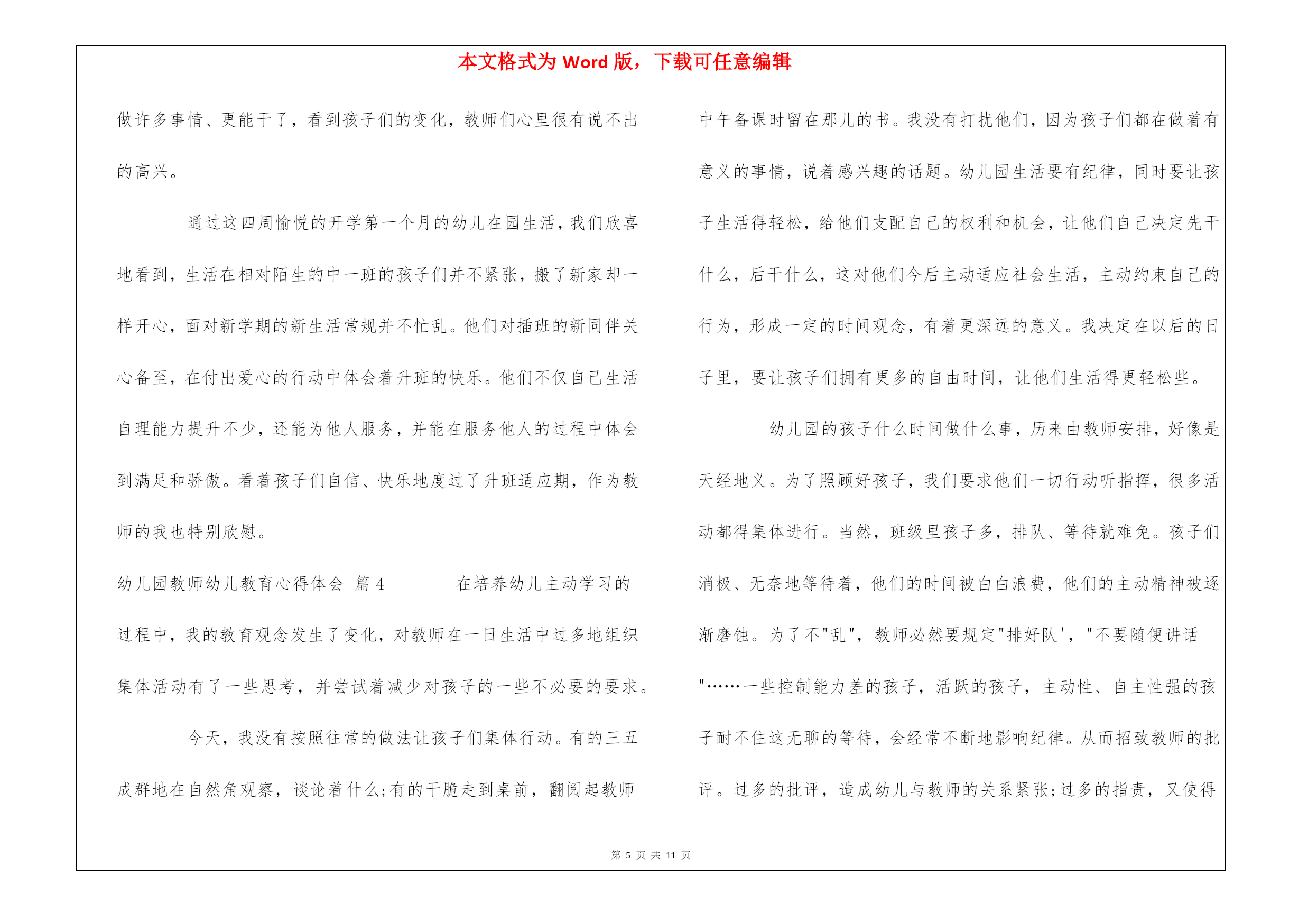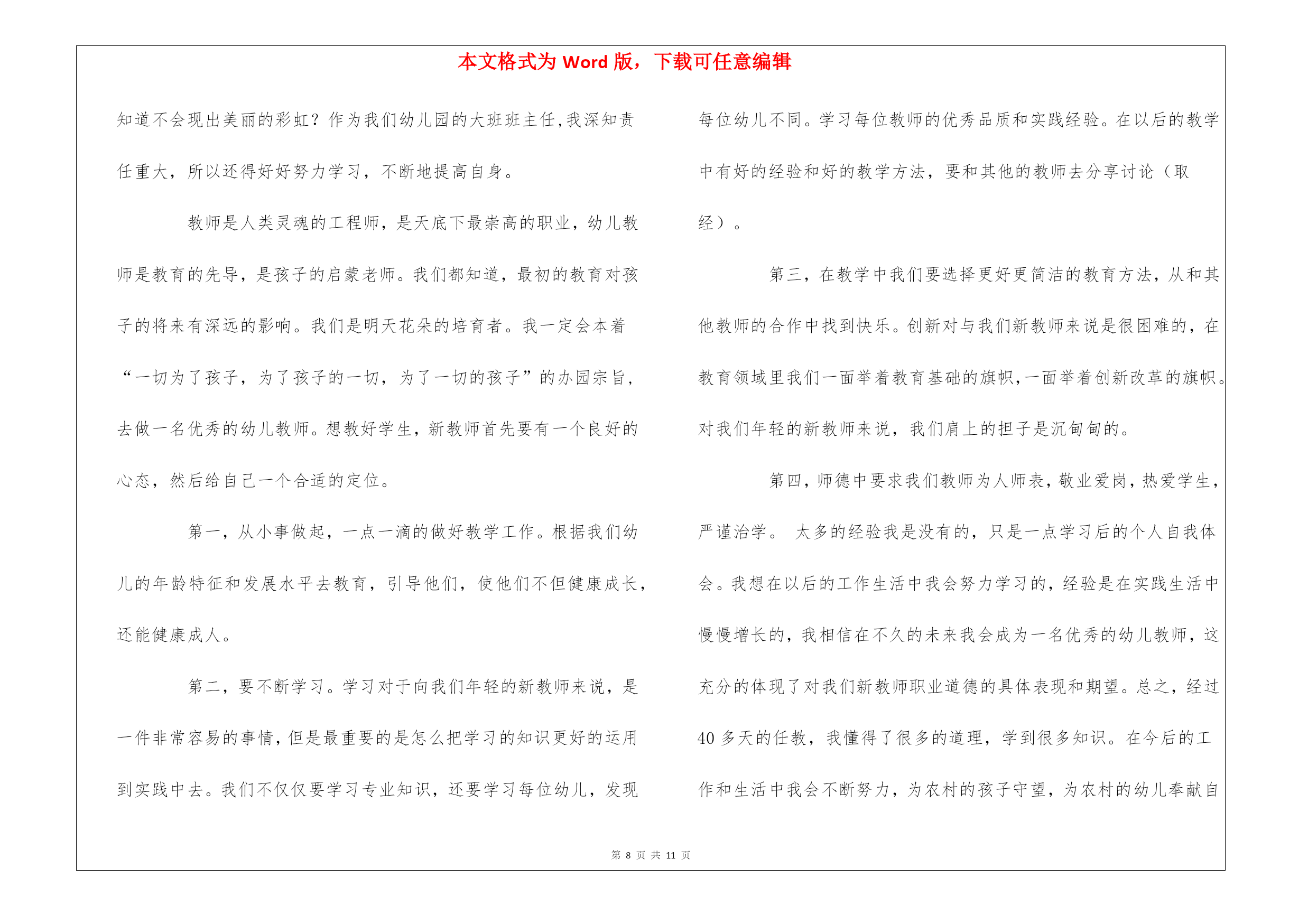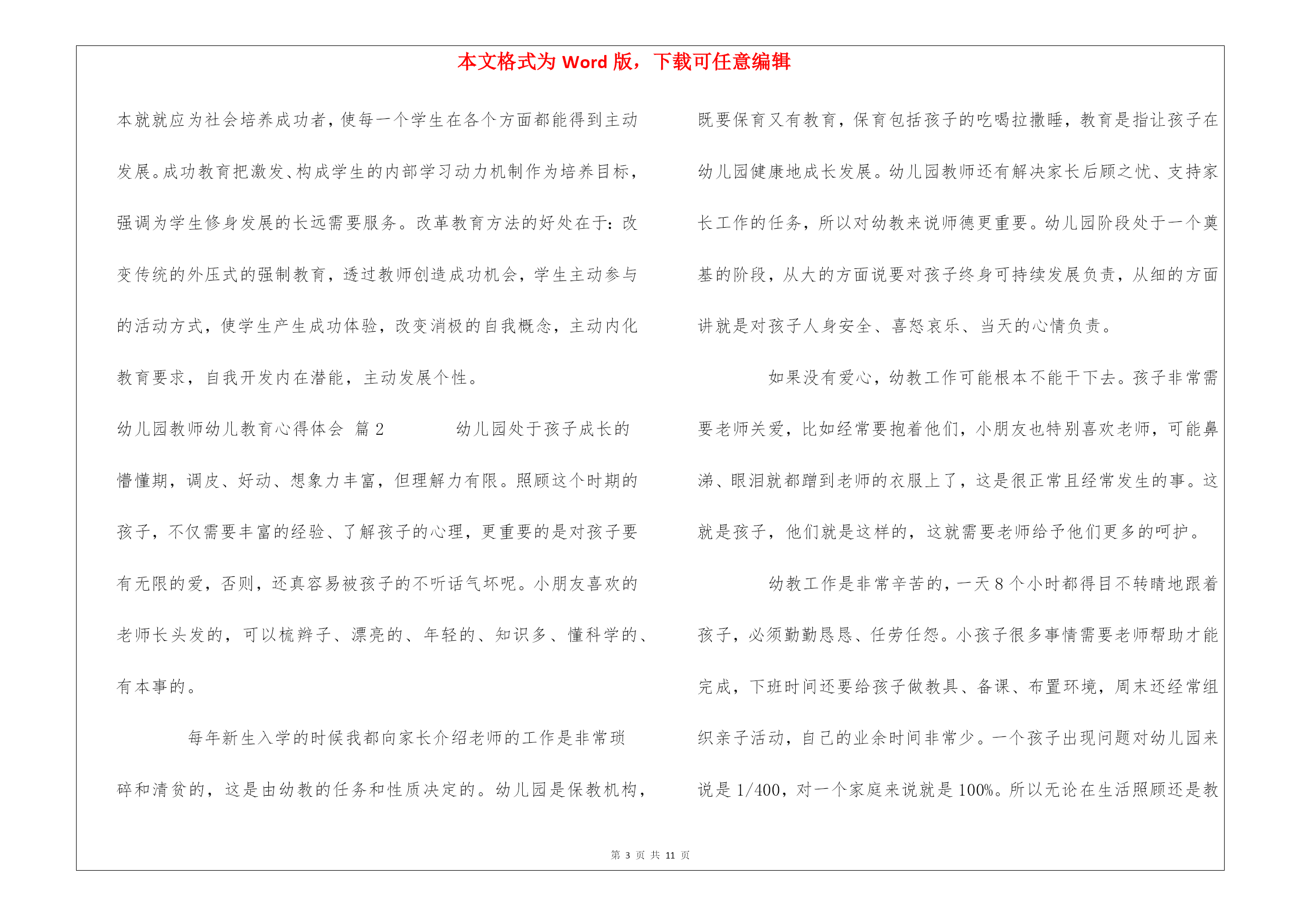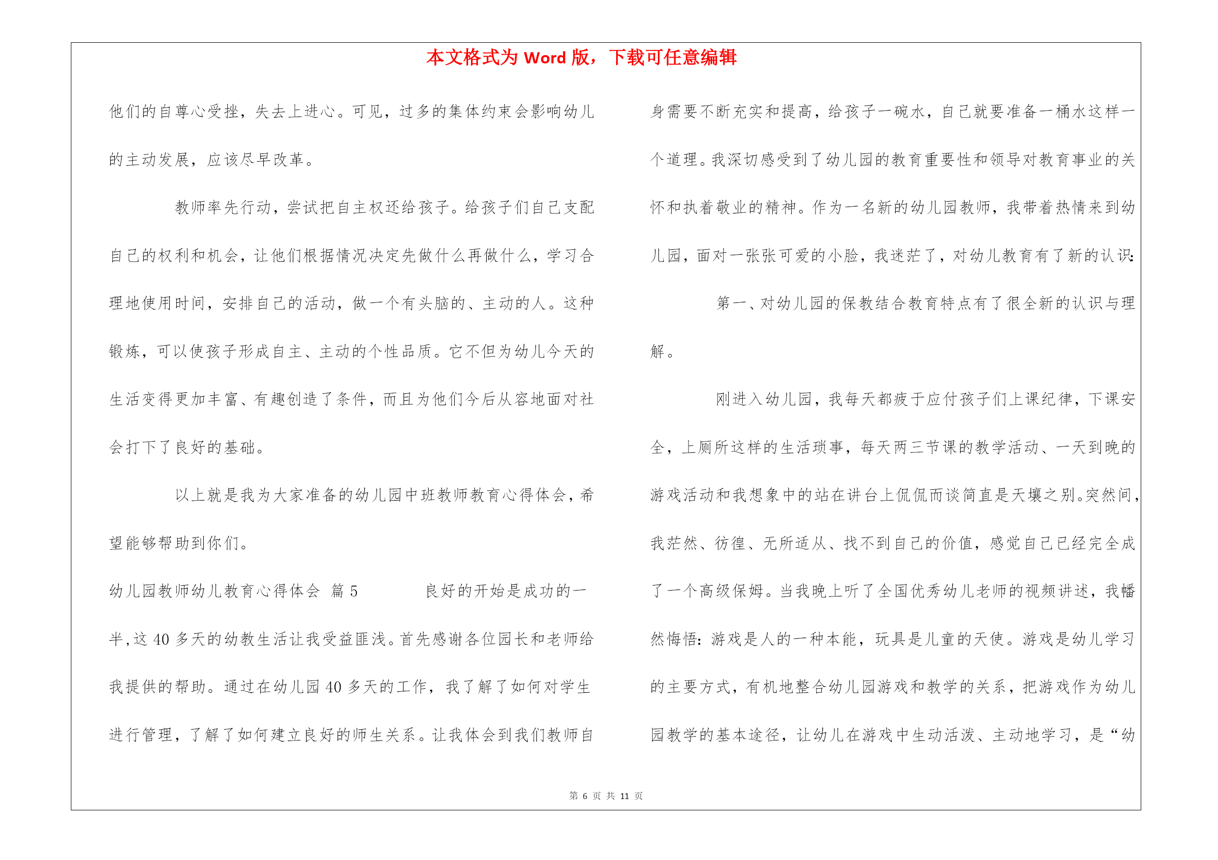 本文格式为Word版,下载可任意编辑第PAGE\*MERGEFORMAT11页共NUMPAGES\*MERGEFORMAT11页幼儿园教师幼儿教育心得体会汇总七篇>幼儿园教师幼儿教育心得体会汇总七篇我们有一些启发后,往往会写一篇心得体会,这么做可以让我们不断思考不断进步。那么要如何写呢?以下是我帮大家整理的幼儿园教师幼儿教育心得体会7篇,希望对大家有所帮助。幼儿园教师幼儿教育心得体会篇1教师是一个神圣的职业,肩负着为祖国培养下一代的历史重任。当一名教师容易,但是要当一名好幼儿教师却是不易的,透过这次培训,我有几点体会:一、教师务必具备创新观念与创新思想。教育的本质是培养人的社会属性,教育的价值在于促进人的发展和社会统一,这就是新的教育观。创新教师教育观的基本内涵包括:转变以教师为中心、以传授知识为主要目的的传统教育观,构成以培养学生潜力为主要教学目标的新教育观;改变严守纪律死气沉沉的课堂氛围,营造主动探索、生动活泼的课堂氛围;鼓励创新性学习,发挥学生的主体能动性;要敢于打破常规,激发学生创造性解决问题的欲望;尊重学生个性,善于发现和保护学生的创新意识,使每个学生都能发挥自身潜能;建立新型师生关系,尊重学生人格,以宽容、保护、用心的态度对待学生;注重实践,打破封闭式教学。传统教育中之所以出现高分低能的现象,就是教师思想上重知识轻实践造成的。一个大学物理教师不会修简单的收音机就是一例。要把教学活动延伸到相关联的现实生活中去,改变封闭的教学形式,让学生透过实践活动亲身感受具体而丰富的客观世界,从而激发其好奇心和求知欲,使其在实践过程中发现问题、解决问题。二、教师务必具备较高的业务素质。要实施创新教育理念,创新型教师务必具备以下几种业务素质:(1)有丰富的知识结构,这是教师发挥创造性的基本保证。(2)有较高的管理艺术。管理包括两方面,一是班级的整体管理,二是针对每个学生的个别指导。(3)有丰富的情感。教师声情并茂的朗诵,热情洋溢的赞赏以及在与学生接触时的仪态、表情和举止所表现出的用心情感能随时地激发、调动学生的热情,激发学生的学习动机,学生因“亲其师而信其教”,变苦学为乐学,单纯的知识传授变成了双向的情感交流,使教者亦乐、学者亦乐。三、教师要有敬业精神。能否成为一个好教师,首先在于有无敬业精神,是否喈叹这项职业。要有“捧着一颗心来,不代办根草去”精神,陶行知先生献身教育无怨无悔,关键在于有一种精神。从一个人心理角度看这是一种自我超越的境界。我们每个人都有本我、自我和超我三个心理层次,培养教师的敬业精神,弘扬好的风气,鼓励教师为神圣的教育事业奉献自己,会使每个人透过自我的修养,约束本我的不正当欲念,到达超我的境界。倘若不抓住教师敬业精神的培养,素质教育就可能是空中楼阁,只有培养出良好的教师敬业精神才能把素质教育落到实处。因此,欲兴事,先兴人,铸造爱岗敬业的高尚形象,并努力带给一切所必需的条件,使每个教师忠诚于党的教育事业。有了这个基础,教师的教育观、质量关、人生观等就比较容易调整到位,跟上时代的步伐,他们才会自觉地站到素质教育的前列,成为合格教师。四、力求成功教育。成功教育认为,教育面向的是人,培养的是社会需要的人。每一个学生都有成功的潜能,都有成功的愿望和需要。透过教育,每个学生都能够在原有的基础上获得成功,取得发展。成功教育强调,透过教育的改善,促使学生获得多方面的成功,激发其构成自我学习、自我教育的内部学习动力机制,自我开发潜能,成为学习的成功者,从额为其成为社会的成功者做好基础素质的准备。成功教育既有改革教育目标的好处,又有改革教育方法的好处。改革教育目标的好处在于:教育的本职任务、教师的本职任务原本就就应为社会培养成功者,使每一个学生在各个方面都能得到主动发展。成功教育把激发、构成学生的内部学习动力机制作为培养目标,强调为学生修身发展的长远需要服务。改革教育方法的好处在于:改变传统的外压式的强制教育,透过教师创造成功机会,学生主动参与的活动方式,使学生产生成功体验,改变消极的自我概念,主动内化教育要求,自我开发内在潜能,主动发展个性。幼儿园教师幼儿教育心得体会篇2幼儿园处于孩子成长的懵懂期,调皮、好动、想象力丰富,但理解力有限。照顾这个时期的孩子,不仅需要丰富的经验、了解孩子的心理,更重要的是对孩子要有无限的爱,否则,还真容易被孩子的不听话气坏呢。小朋友喜欢的老师长头发的,可以梳辫子、漂亮的、年轻的、知识多、懂科学的、有本事的。每年新生入学的时候我都向家长介绍老师的工作是非常琐碎和清贫的,这是由幼教的任务和性质决定的。幼儿园是保教机构,既要保育又有教育,保育包括孩子的吃喝拉撒睡,教育是指让孩子在幼儿园健康地成长发展。幼儿园教师还有解决家长后顾之忧、支持家长工作的任务,所以对幼教来说师德更重要。幼儿园阶段处于