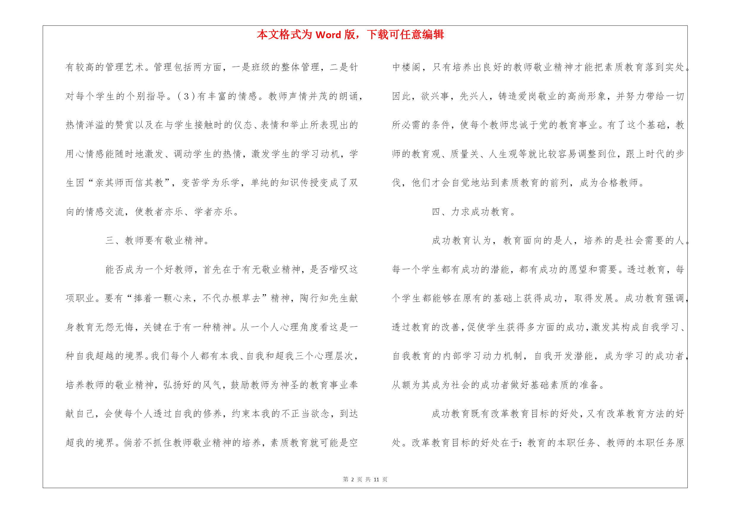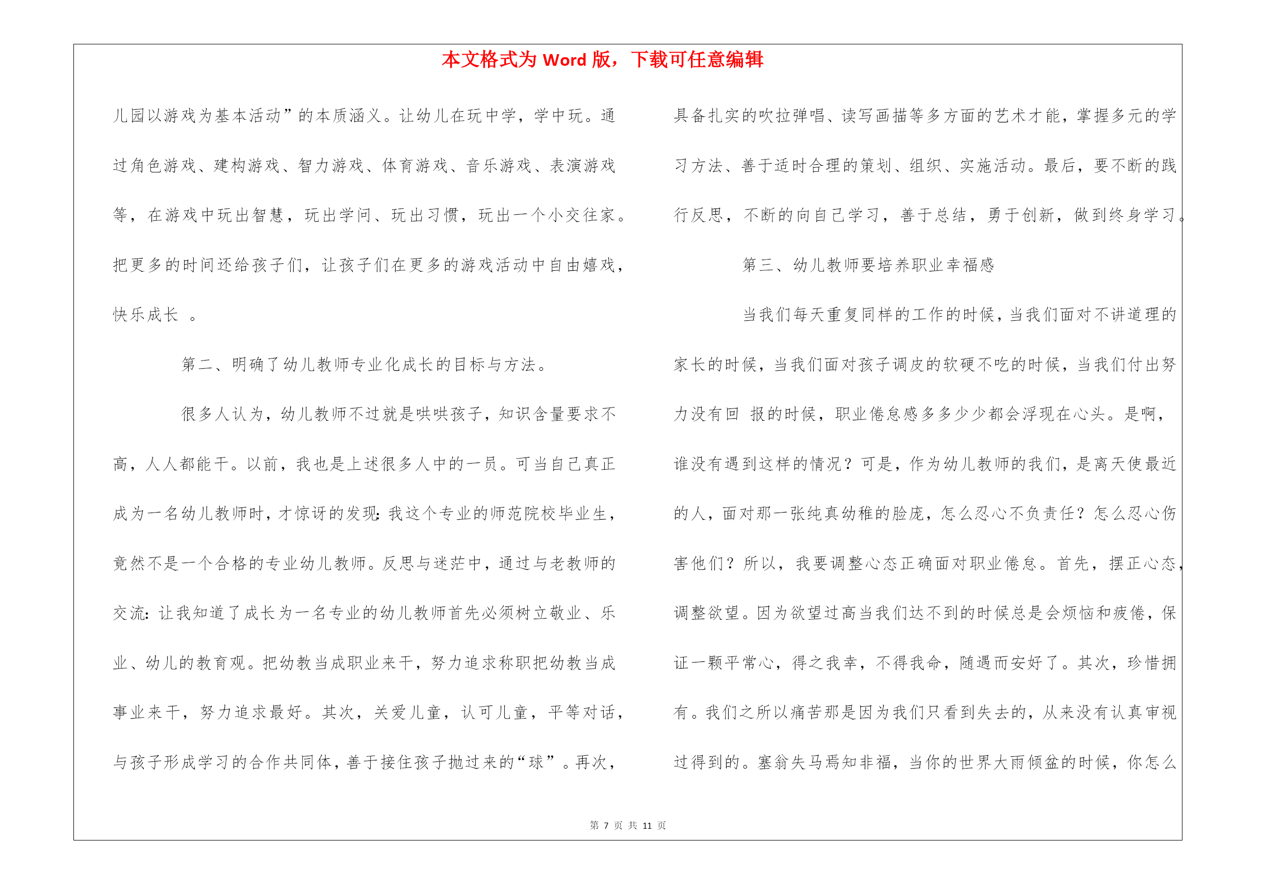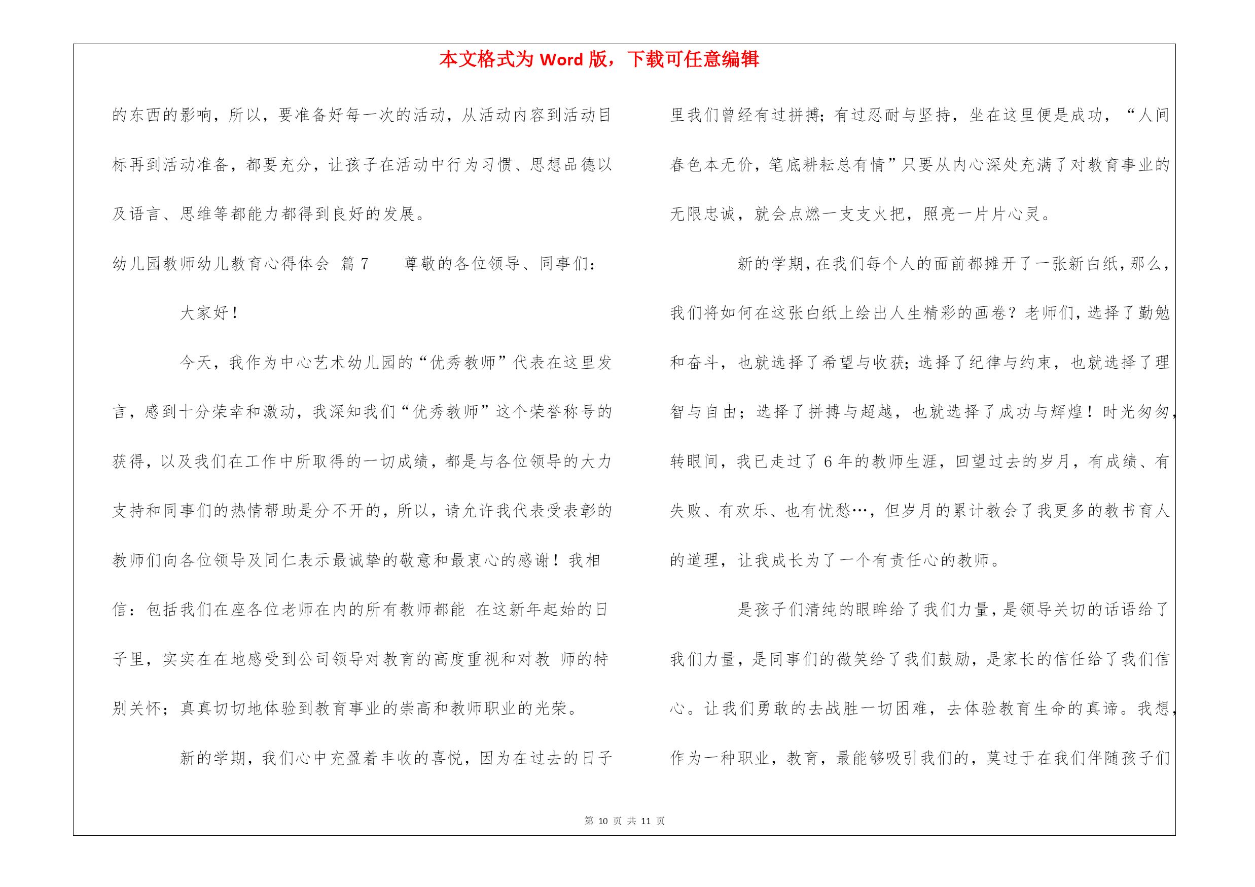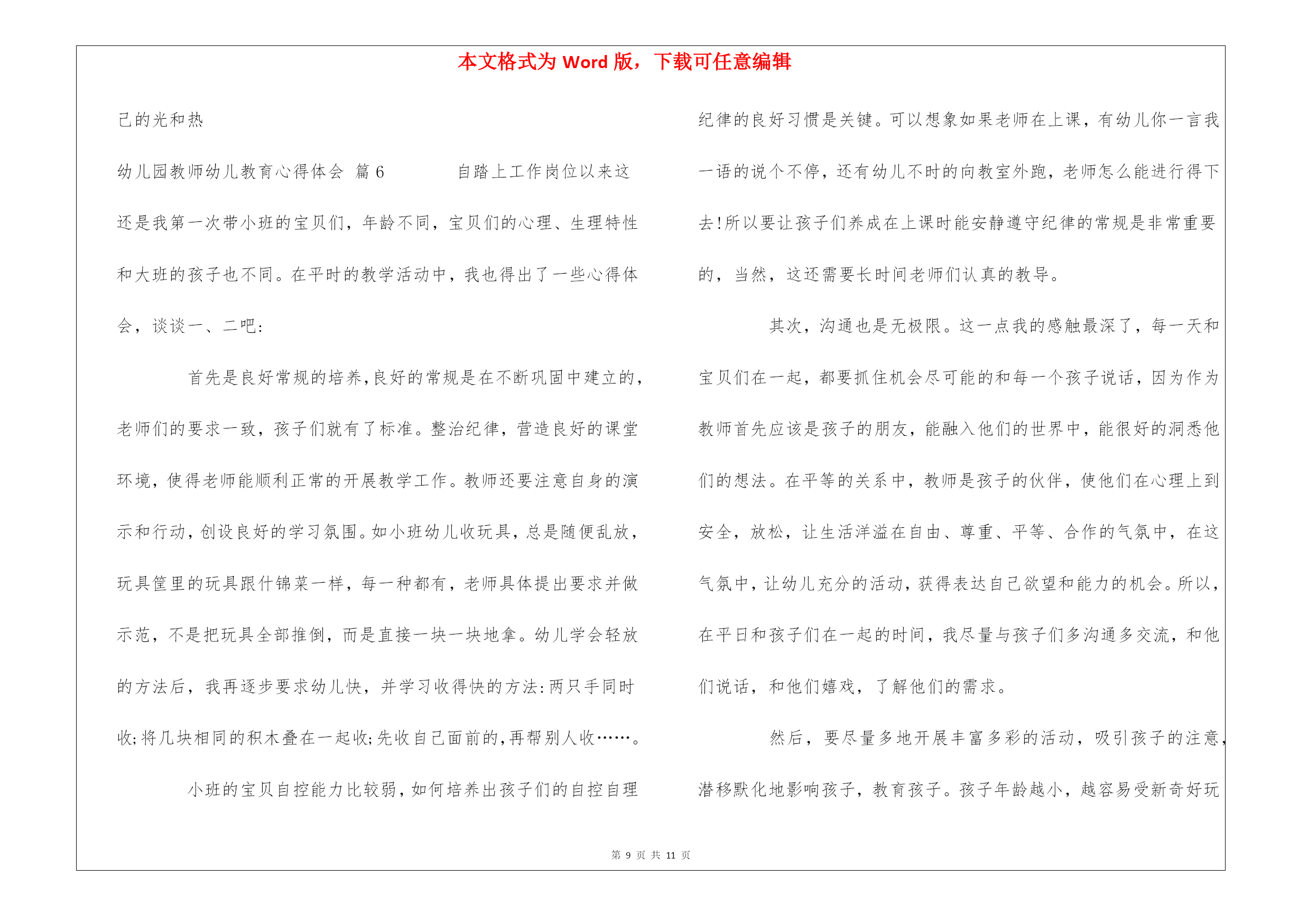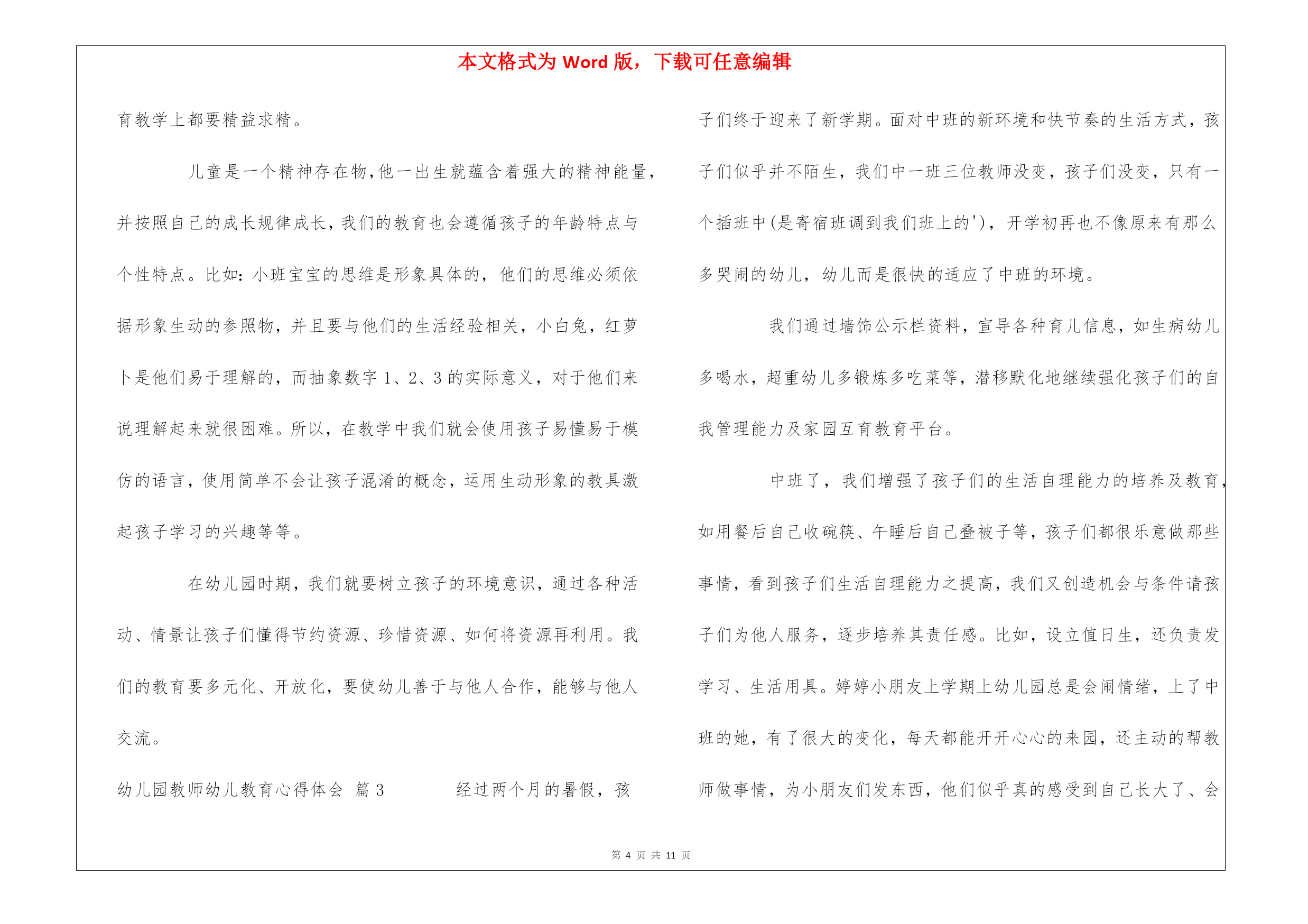 本文格式为Word版,下载可任意编辑第PAGE\*MERGEFORMAT11页共NUMPAGES\*MERGEFORMAT11页幼儿园教师幼儿教育心得体会汇总七篇>幼儿园教师幼儿教育心得体会汇总七篇我们有一些启发后,往往会写一篇心得体会,这么做可以让我们不断思考不断进步。那么要如何写呢?以下是我帮大家整理的幼儿园教师幼儿教育心得体会7篇,希望对大家有所帮助。幼儿园教师幼儿教育心得体会篇1教师是一个神圣的职业,肩负着为祖国培养下一代的历史重任。当一名教师容易,但是要当一名好幼儿教师却是不易的,透过这次培训,我有几点体会:一、教师务必具备创新观念与创新思想。教育的本质是培养人的社会属性,教育的价值在于促进人的发展和社会统一,这就是新的教育观。创新教师教育观的基本内涵包括:转变以教师为中心、以传授知识为主要目的的传统教育观,构成以培养学生潜力为主要教学目标的新教育观;改变严守纪律死气沉沉的课堂氛围,营造主动探索、生动活泼的课堂氛围;鼓励创新性学习,发挥学生的主体能动性;要敢于打破常规,激发学生创造性解决问题的欲望;尊重学生个性,善于发现和保护学生的创新意识,使每个学生都能发挥自身潜能;建立新型师生关系,尊重学生人格,以宽容、保护、用心的态度对待学生;注重实践,打破封闭式教学。传统教育中之所以出现高分低能的现象,就是教师思想上重知识轻实践造成的。一个大学物理教师不会修简单的收音机就是一例。要把教学活动延伸到相关联的现实生活中去,改变封闭的教学形式,让学生透过实践活动亲身感受具体而丰富的客观世界,从而激发其好奇心和求知欲,使其在实践过程中发现问题、解决问题。二、教师务必具备较高的业务素质。要实施创新教育理念,创新型教师务必具备以下几种业务素质:(1)有丰富的知识结构,这是教师发挥创造性的基本保证。(2)有较高的管理艺术。管理包括两方面,一是班级的整体管理,二是针对每个学生的个别指导。(3)有丰富的情感。教师声情并茂的朗诵,热情洋溢的赞赏以及在与学生接触时的仪态、表情和举止所表现出的用心情感能随时地激发、调动学生的热情,激发学生的学习动机,学生因“亲其师而信其教”,变苦学为乐学,单纯的知识传授变成了双向的情感交流,使教者亦乐、学者亦乐。三、教师要有敬业精神。能否成为一个好教师,首先在于有无敬业精神,是否喈叹这项职业。要有“捧着一颗心来,不代办根草去”精神,陶行知先生献身教育无怨无悔,关键在于有一种精神。从一个人心理角度看这是一种自我超越的境界。我们每个人都有本我、自我和超我三个心理层次,培养教师的敬业精神,弘扬好的风气,鼓励教师为神圣的教育事业奉献自己,会使每个人透过自我的修养,约束本我的不正当欲念,到达超我的境界。倘若不抓住教师敬业精神的培养,素质教育就可能是空中楼阁,只有培养出良好的教师敬业精神才能把素质教育落到实处。因此,欲兴事,先兴人,铸造爱岗敬业的高尚形象,并努力带给一切所必需的条件,使每个教师忠诚于党的教育事业。有了这个基础,教师的教育观、质量关、人生观等就比较容易调整到位,跟上时代的步伐,他们才会自觉地站到素质教育的前列,成为合格教师。四、力求成功教育。成功教育认为,教育面向的是人,培养的是社会需要的人。每一个学生都有成功的潜能,都有成功的愿望和需要。透过教育,每个学生都能够在原有的基础上获得成功,取得发展。成功教育强调,透过教育的改善,促使学生获得多方面的成功,激发其构成自我学习、自我教育的内部学习动力机制,自我开发潜能,成为学习的成功者,从额为其成为社会的成功者做好基础素质的准备。成功教育既有改革教育目标的好处,又有改革教育方法的好处。改革教育目标的好处在于:教育的本职任务、教师的本职任务原本就就应为社会培养成功者,使每一个学生在各个方面都能得到主动发展。成功教育把激发、构成学生的内部学习动力机制作为培养目标,强调为学生修身发展的长远需要服务。改革教育方法的好处在于:改变传统的外压式的强制教育,透过教师创造成功机会,学生主动参与的活动方式,使学生产生成功体验,改变消极的自我概念,主动内化教育要求,自我开发内在潜能,主动发展个性。幼儿园教师幼儿教育心得体会篇2幼儿园处于孩子成长的懵懂期,调皮、好动、想象力丰富,但理解力有限。照顾这个时期的孩子,不仅需要丰富的经验、了解孩子的心理,更重要的是对孩子要有无限的爱,否则,还真容易被孩子的不听话气坏呢。小朋友喜欢的老师长头发的,可以梳辫子、漂亮的、年轻的、知识多、懂科学的、有本事的。每年新生入学的时候我都向家长介绍老师的工作是非常琐碎和清贫的,这是由幼教的任务和性质决定的。幼儿园是保教机构,既要保育又有教育,保育包括孩子的吃喝拉撒睡,教育是指让孩子在幼儿园健康地成长发展。幼儿园教师还有解决家长后顾之忧、支持家长工作的任务,所以对幼教来说师德更重要。幼儿园阶段处于