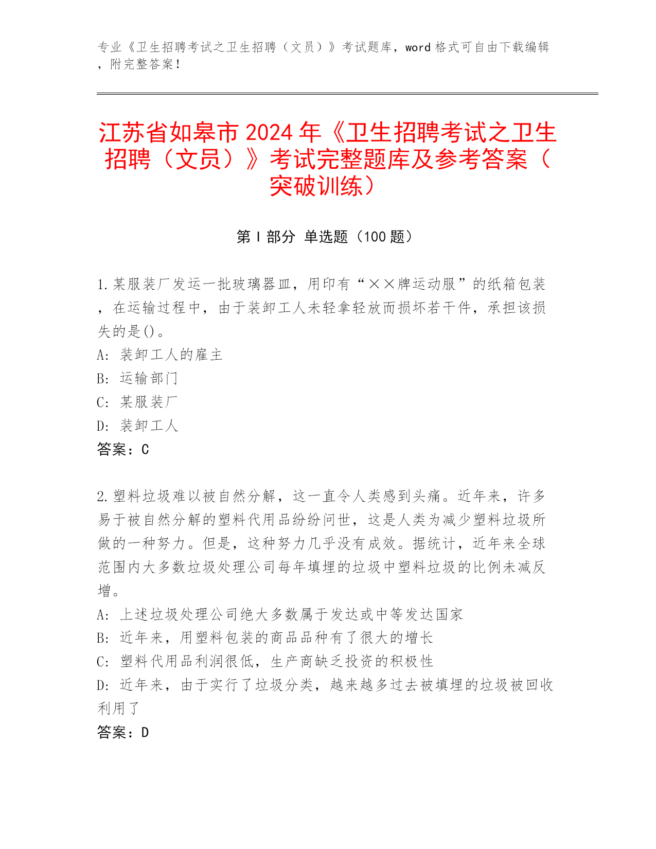 江苏省如皋市2024年《卫生招聘考试之卫生招聘(文员)》考试完整题库及参考答案(突破训练)