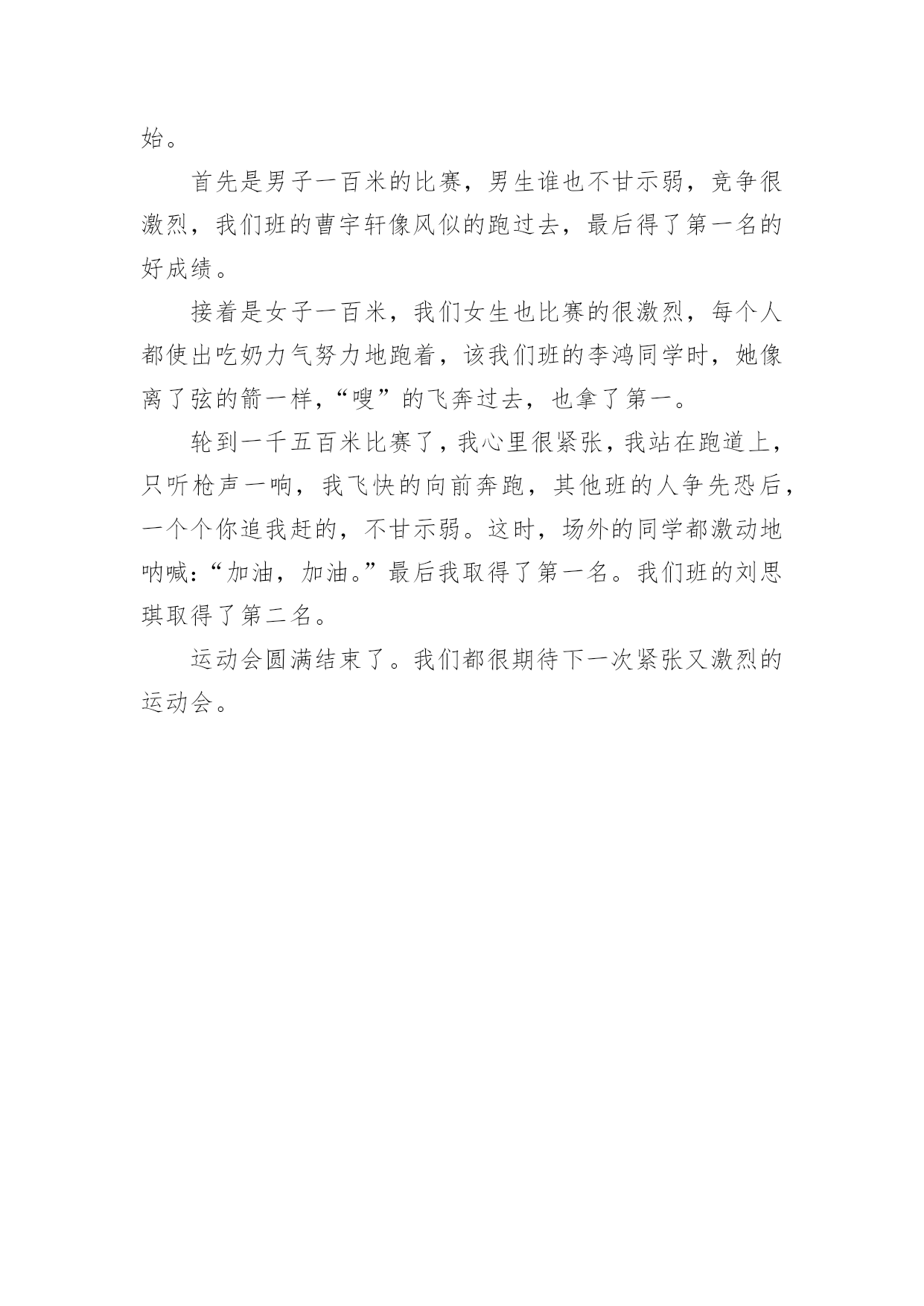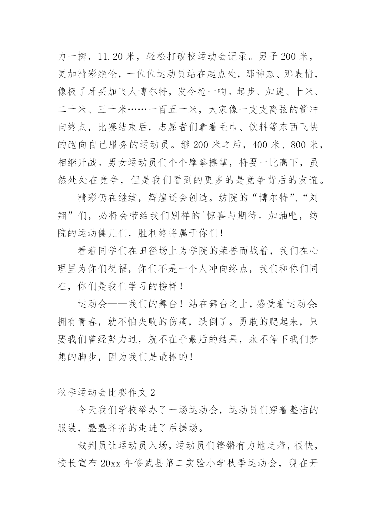 秋季运动会比赛作文秋季运动会比赛作文在学习、工作乃至生活中,许多人都写过作文吧,作文是人们把记忆中所存储的有关知识、经验和思想用书面形式表达出来的记叙方式。你写作文时总是无从下笔?以下是小编为大家收集的秋季运动会比赛作文,仅供参考,希望能够帮助到大家。秋季运动会比赛作文1即使天公不作美,下着滂沱大雨;即使场地湿滑,影响我们运动的脚步;即使我们没有健硕的躯体,身力微薄,但这一切地一切都不重要,我们有一颗青春的心、奋斗的梦。顶着绵绵秋雨,第一天的比赛在雨中开始了。第一项举行的是田赛男子一百米。运动员精神饱满的走向了一百米跑道,场边飘舞着各色的旗帜,看台上坐满了前来观看比赛的观众。主席台上广播站的同学们读着一篇篇热情洋溢的为运动员加油的通讯稿。场上百米赛跑开始了,运动员们在100米的跑道上竭尽全力地奔跑着,看台上同学们为场上的运动员加油着欢呼着。裁判员在终点认真的记录这成绩。跳远场地,一个个运动员快速地奔跑,奋力一跳,在空中划出一道完美的弧线。7.30米,离校运会纪录还有30厘米,男子铅球,那奋力一掷,11.20米,轻松打破校运动会记录。男子200米,更加精彩绝伦,一位位运动员站在起点处,那神态、那表情,像极了牙买加飞人博尔特,发令枪一响。起步、加速、十米、二十米、三十米……一百五十米,大家像一支支离弦的箭冲向终点,比赛结束后,志愿者们拿着毛巾、饮料等东西飞快的跑向自己服务的运动员。继200米之后,400米、800米,相继开战。男女运动员们个个摩拳擦掌,将要一比高下,虽然处处在竞争,但是我们看到的更多的是竞争背后的友谊。精彩仍在继续,辉煌还会创造。纺院的“博尔特”、“刘翔”们,必将会带给我们别样的'惊喜与期待。加油吧,纺院的运动健儿们,胜利终将属于你们!看着同学们在田径场上为学院的荣誉而战着,我们在心理里为你们祝福,你们不是一个人冲向终点,我们和你们同在,你们是我们学习的榜样!运动会——我们的舞台!站在舞台之上,感受着运动会:拥有青春,就不怕失败的伤痛,跌倒了。勇敢的爬起来,只要我们曾经努力过,就不在乎最后的结果,永不停下我们梦想的脚步,因为我们是最棒的!秋季运动会比赛作文2今天我们学校举办了一场运动会,运动员们穿着整洁的服装,整整齐齐的走进了后操场。裁判员让运动员入场,运动员们铿锵有力地走着,很快,校长宣布20xx年修武县第二实验小学秋季运动会,现在开始。首先是男子一百米的比赛,男生谁也不甘示弱,竞争很激烈,我们班的曹宇轩像风似的跑过去,最后得了第一名的好成绩。接着是女子一百米,我们女生也比赛的很激烈,每个人都使出吃奶力气努力地跑着,该我们班的李鸿同学时,她像离了弦的箭一样,“嗖”的飞奔过去,也拿了第一。轮到一千五百米比赛了,我心里很紧张,我站在跑道上,只听枪声一响,我飞快的向前奔跑,其他班的人争先恐后,一个个你追我赶的,不甘示弱。这时,场外的同学都激动地呐喊:“加油,加油。”最后我取得了第一名。我们班的刘思琪取得了第二名。运动会圆满结束了。我们都很期待下一次紧张又激烈的运动会。