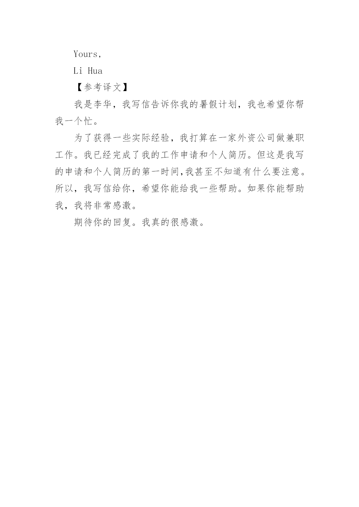 高考英语作文:暑假计划高考英语作文:暑假计划时间就如同白驹过隙般的流逝,我们的工作又进入新的`阶段,为了今后更好的工作发展,是时候开始制定计划了。我们该怎么拟定计划呢?下面是小编整理的高考英语作文:暑假计划,仅供参考,大家一起来看看吧。DearMsJenkins,IamLiHua,IamwritingtotellyousomethingaboutmyplanforthecomingsummervacationandIalsowantyoutodomeafavor.Inordertogetsomepracticalexperience,Iamplanningtotakeapart-timejobinaforeigncapitalcompany.Ihavealreadyfinishedmyjobapplicationandpersonalresume.ButthisisthefirsttimethatIhavewrittenanapplicationandthepersonalsresume,soIdon’tevenknowiftherearesomethingtopayattentionto.So,I’mwritingyoutheletter,hopingyoucangivemesomehelp.Iwillbeverygratefulifyoucanhelpme.Lookingforwardtoyourreply.AndI’dbereallythankful.Yours,LiHua【参考译文】我是李华,我写信告诉你我的暑假计划,我也希望你帮我一个忙。为了获得一些实际经验,我打算在一家外资公司做兼职工作。我已经完成了我的工作申请和个人简历。但这是我写的申请和个人简历的第一时间,我甚至不知道有什么要注意。所以,我写信给你,希望你能给我一些帮助。如果你能帮助我,我将非常感激。期待你的回复。我真的很感激。