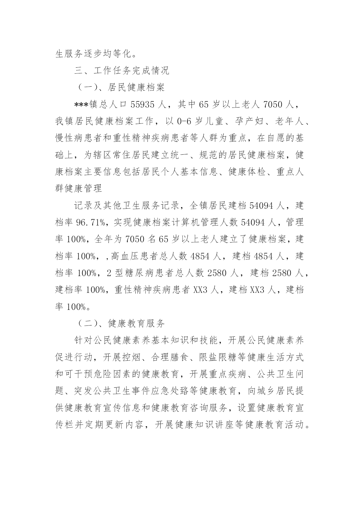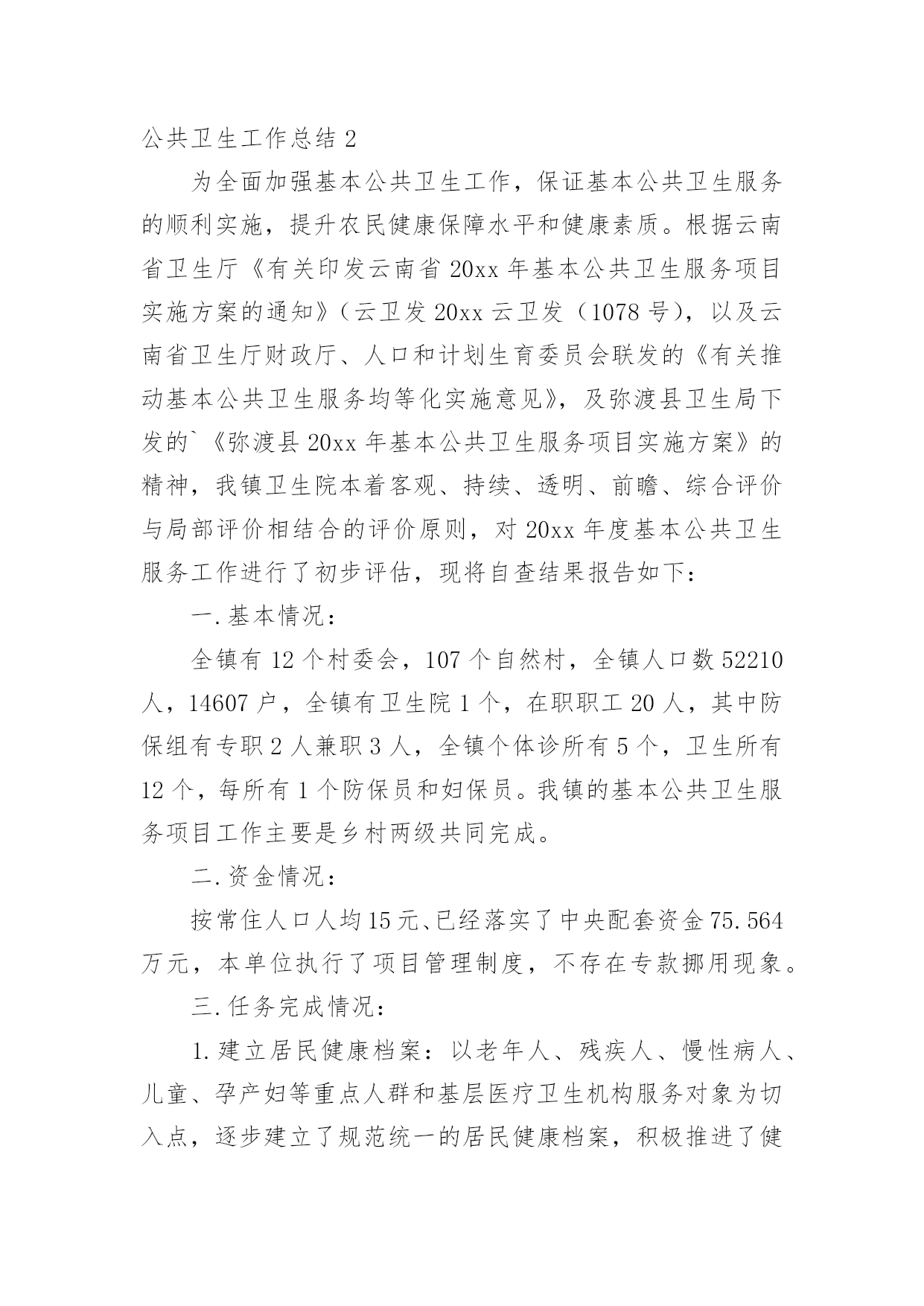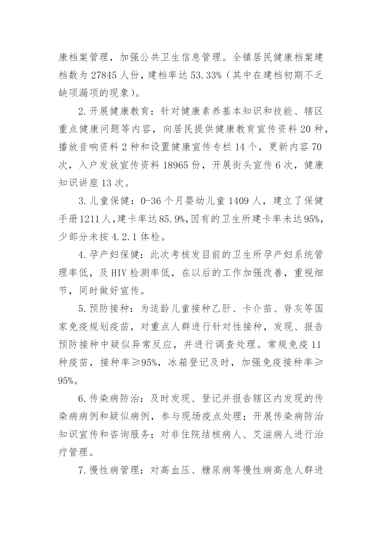 公共卫生工作总结总结是在某一时期、某一项目或某些工作告一段落或者全部完成后进行回顾检查、分析评价,从而得出教训和一些规律性认识的一种书面材料,它是增长才干的一种好办法,因此十分有必须要写一份总结哦。总结怎么写才不会流于形式呢?以下是小编为大家整理的公共卫生工作总结,欢迎大家借鉴与参考,希望对大家有所帮助。公共卫生工作总结120xx年,***镇在市卫生局的正确领导下,在市疾控中心、卫生监督所的'指导配合下,以国家基本公共卫生服务规范(20xx年版)为指导,紧密围绕基本公共卫生服务项目全年工作目标,积极开展基本公共卫生服务项目工作。现将20xx年基本公共卫生服务项目工作总结如下:一、组织管理及时调整了***镇基本公共卫生服务项目工作领导小组,依照国家基本公共卫生服务规范(20xx年版),重新制定了***镇基本公共卫生服务项目实施方案及考核办法。二、项目资金和财务管理我镇依据省级基本公共卫生服务项目经费使用补助标准,制定我镇基本公共卫生服务项目经费使用补助标准,加强资金使用管理,提高服务质量,充分发挥资金使用效率,保证城乡居民公平享有基本公共卫生服务,促进基本公共卫生服务逐步均等化。三、工作任务完成情况(一)、居民健康档案***镇总人口55935人,其中65岁以上老人7050人,我镇居民健康档案工作,以0-6岁儿童、孕产妇、老年人、慢性病患者和重性精神疾病患者等人群为重点,在自愿的基础上,为辖区常住居民建立统一、规范的居民健康档案,健康档案主要信息包括居民个人基本信息、健康体检、重点人群健康管理记录及其他卫生服务记录,全镇居民建档54094人,建档率96.71%,实现健康档案计算机管理人数54094人,管理率100%,全年为7050名65岁以上老人建立了健康档案,建档率100%,,高血压患者总人数4854人,建档4854人,建档率100%,2型糖尿病患者总人数2580人,建档2580人,建档率100%,重性精神疾病患者XX3人,建档XX3人,建档率100%。(二)、健康教育服务针对公民健康素养基本知识和技能,开展公民健康素养促进行动,开展控烟、合理膳食、限盐限糖等健康生活方式和可干预危险因素的健康教育,开展重点疾病、公共卫生问题、突发公共卫生事件应急处臵等健康教育,向城乡居民提供健康教育宣传信息和健康教育咨询服务,设置健康教育宣传栏并定期更新内容,开展健康知识讲座等健康教育活动。公共卫生工作总结2为全面加强基本公共卫生工作,保证基本公共卫生服务的顺利实施,提升农民健康保障水平和健康素质。根据云南省卫生厅《有关印发云南省20xx年基本公共卫生服务项目实施方案的通知》(云卫发20xx云卫发(1078号),以及云南省卫生厅财政厅、人口和计划生育委员会联发的《有关推动基本公共卫生服务均等化实施意见》,及弥渡县卫生局下发的`《弥渡县20xx年基本公共卫生服务项目实施方案》的精神,我镇卫生院本着客观、持续、透明、前瞻、综合评价与局部评价相结合的评价原则,对20xx年度基本公共卫生服务工作进行了初步评估,现将自查结果报告如下:一.基本情况:全镇有12个村委会,107个自然村,全镇人口数52210人,14607户,全镇有卫生院1个,在职职工20人,其中防保组有专职2人兼职3人,全镇个体诊所有5个,卫生所有12个,每所有1个防保员和妇保员。我镇的基本公共卫生服务项目工作主要是乡村两级共同完成。二.资金情况:按常住人口人均15元、已经落实了中央配套资金75.564万元,本单位执行了项目管理制度,不存在专款挪用现象。三.任务完成情况:1.建立居民健康档案:以老年人、残疾人、慢性病人、儿童、孕产妇等重点人群和基层医疗卫生机构服务对象为切入点,逐步建立了规范统一的居民健康档案,积极推进了健康档案管理,加强公共卫生信息管理。全镇居民健康档案建档数为27845人份,建档率达53.33%(其中在建档初期不乏缺项漏项的现象)。2.开展健康教育:针对健康素养基本知识和技能、辖区重点健康问题等内容,向居民提供健康教育宣传资料20种,播放音响资料2种和设置健康宣传专栏14个,更新内容70次,入户发放宣传资料18965份,开展街头宣传6次,健康知识讲座13次。3.儿童保健:0-36个月婴幼儿童1409人,建立了保健手册1211人,建卡率达85.9%,因有的卫生所建卡率未达95%,少部分未按4.2.1体检。4.孕产妇保健:此次考核发目前的卫生所孕产妇系统管理率低,及HIV检测率低,在以后的工作加强改善,重视细节,同时做好宣传。5.预防接种:为适龄儿童接种乙肝、卡介苗、脊灰等国家免疫规划疫苗,对重点人群进行针对性接种,发现、报告预防接种中疑似异常反应,并进行调查处理。常规免疫11种疫苗,接种率≥95%,冰箱登记及时,加强免疫接种率≥95%。6.传染病防治:及时发现、登记并报