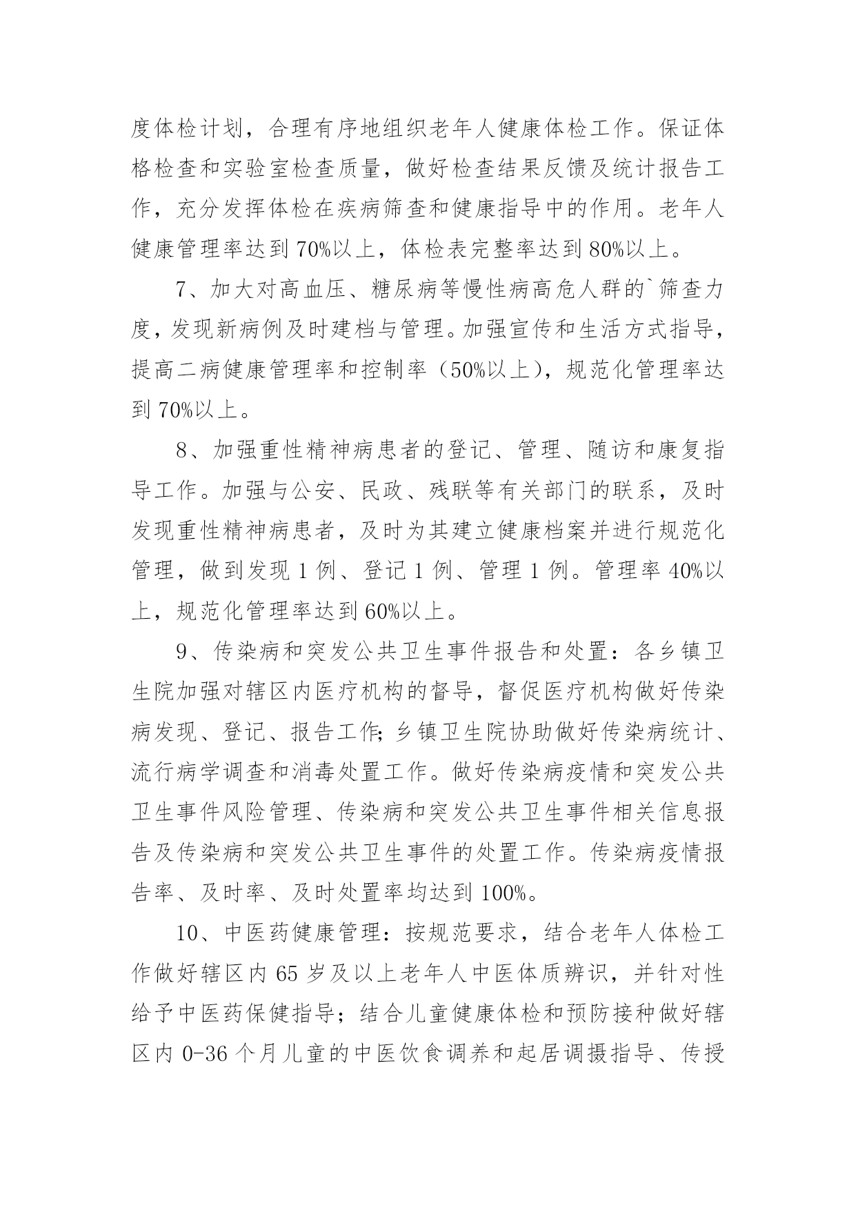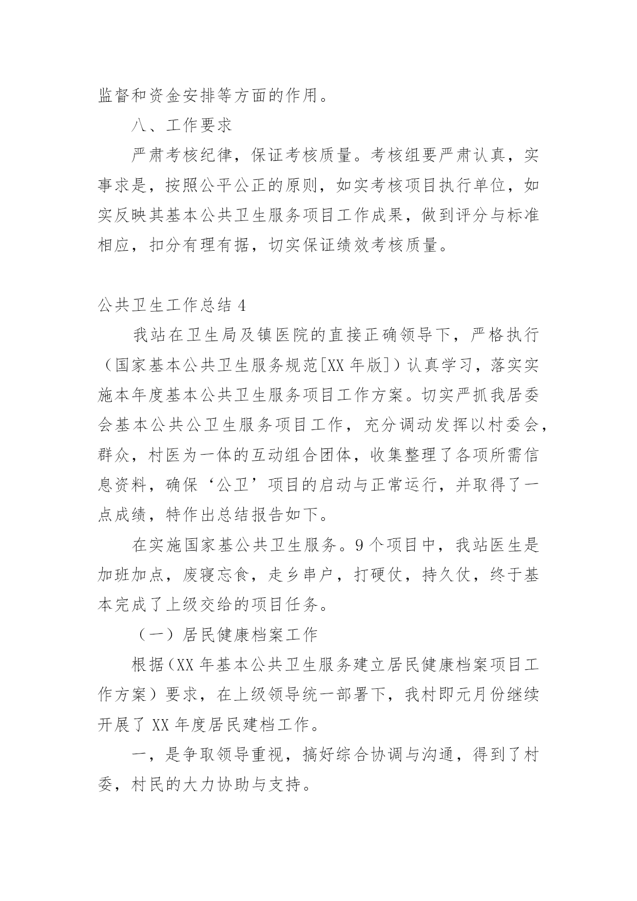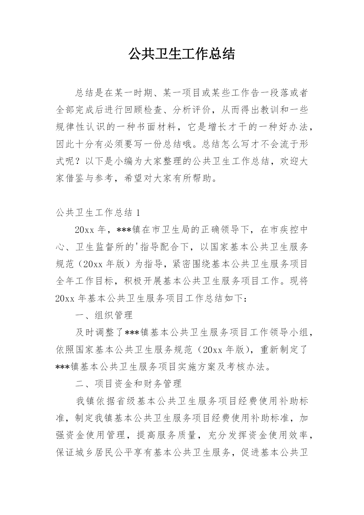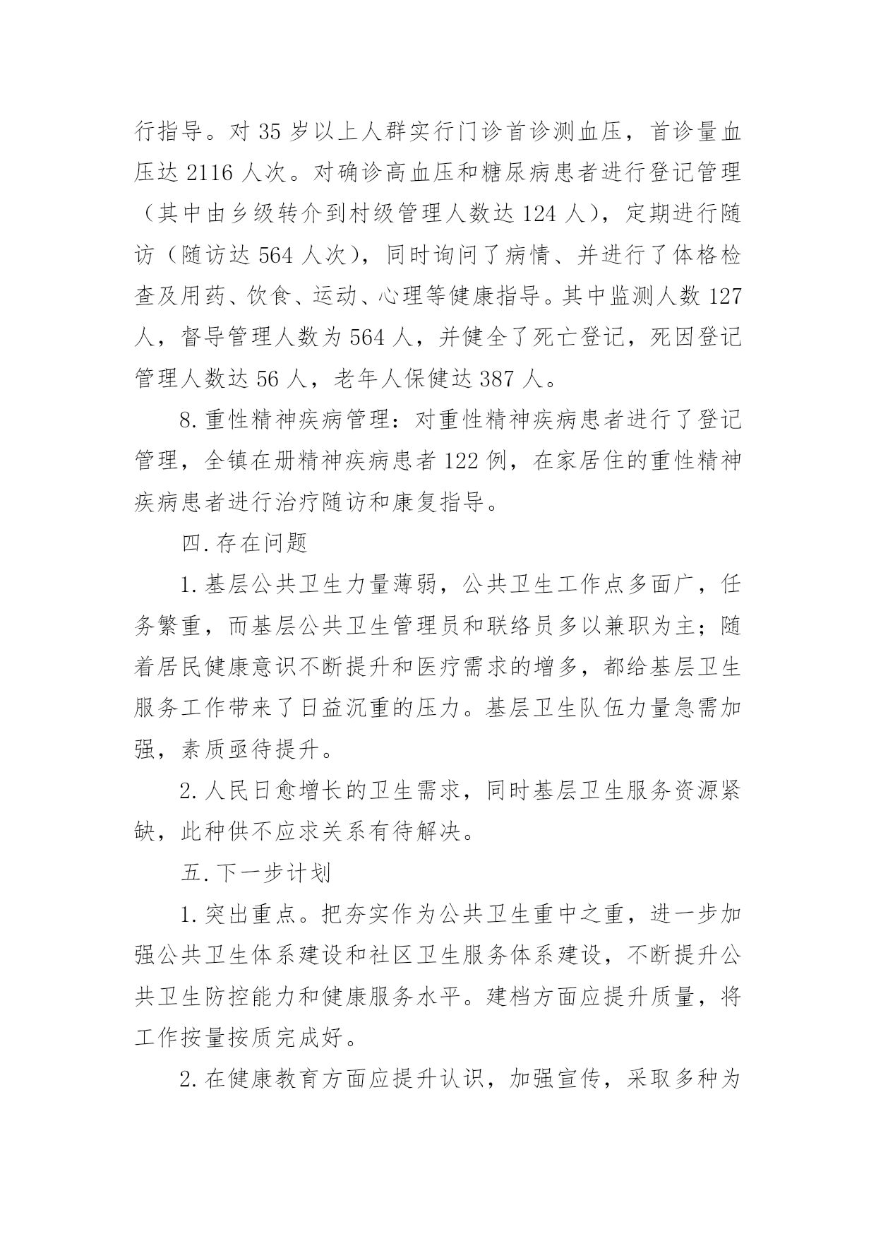 公共卫生工作总结总结是在某一时期、某一项目或某些工作告一段落或者全部完成后进行回顾检查、分析评价,从而得出教训和一些规律性认识的一种书面材料,它是增长才干的一种好办法,因此十分有必须要写一份总结哦。总结怎么写才不会流于形式呢?以下是小编为大家整理的公共卫生工作总结,欢迎大家借鉴与参考,希望对大家有所帮助。公共卫生工作总结120xx年,***镇在市卫生局的正确领导下,在市疾控中心、卫生监督所的'指导配合下,以国家基本公共卫生服务规范(20xx年版)为指导,紧密围绕基本公共卫生服务项目全年工作目标,积极开展基本公共卫生服务项目工作。现将20xx年基本公共卫生服务项目工作总结如下:一、组织管理及时调整了***镇基本公共卫生服务项目工作领导小组,依照国家基本公共卫生服务规范(20xx年版),重新制定了***镇基本公共卫生服务项目实施方案及考核办法。二、项目资金和财务管理我镇依据省级基本公共卫生服务项目经费使用补助标准,制定我镇基本公共卫生服务项目经费使用补助标准,加强资金使用管理,提高服务质量,充分发挥资金使用效率,保证城乡居民公平享有基本公共卫生服务,促进基本公共卫生服务逐步均等化。三、工作任务完成情况(一)、居民健康档案***镇总人口55935人,其中65岁以上老人7050人,我镇居民健康档案工作,以0-6岁儿童、孕产妇、老年人、慢性病患者和重性精神疾病患者等人群为重点,在自愿的基础上,为辖区常住居民建立统一、规范的居民健康档案,健康档案主要信息包括居民个人基本信息、健康体检、重点人群健康管理记录及其他卫生服务记录,全镇居民建档54094人,建档率96.71%,实现健康档案计算机管理人数54094人,管理率100%,全年为7050名65岁以上老人建立了健康档案,建档率100%,,高血压患者总人数4854人,建档4854人,建档率100%,2型糖尿病患者总人数2580人,建档2580人,建档率100%,重性精神疾病患者XX3人,建档XX3人,建档率100%。(二)、健康教育服务针对公民健康素养基本知识和技能,开展公民健康素养促进行动,开展控烟、合理膳食、限盐限糖等健康生活方式和可干预危险因素的健康教育,开展重点疾病、公共卫生问题、突发公共卫生事件应急处臵等健康教育,向城乡居民提供健康教育宣传信息和健康教育咨询服务,设置健康教育宣传栏并定期更新内容,开展健康知识讲座等健康教育活动。公共卫生工作总结2为全面加强基本公共卫生工作,保证基本公共卫生服务的顺利实施,提升农民健康保障水平和健康素质。根据云南省卫生厅《有关印发云南省20xx年基本公共卫生服务项目实施方案的通知》(云卫发20xx云卫发(1078号),以及云南省卫生厅财政厅、人口和计划生育委员会联发的《有关推动基本公共卫生服务均等化实施意见》,及弥渡县卫生局下发的`《弥渡县20xx年基本公共卫生服务项目实施方案》的精神,我镇卫生院本着客观、持续、透明、前瞻、综合评价与局部评价相结合的评价原则,对20xx年度基本公共卫生服务工作进行了初步评估,现将自查结果报告如下:一.基本情况:全镇有12个村委会,107个自然村,全镇人口数52210人,14607户,全镇有卫生院1个,在职职工20人,其中防保组有专职2人兼职3人,全镇个体诊所有5个,卫生所有12个,每所有1个防保员和妇保员。我镇的基本公共卫生服务项目工作主要是乡村两级共同完成。二.资金情况:按常住人口人均15元、已经落实了中央配套资金75.564万元,本单位执行了项目管理制度,不存在专款挪用现象。三.任务完成情况:1.建立居民健康档案:以老年人、残疾人、慢性病人、儿童、孕产妇等重点人群和基层医疗卫生机构服务对象为切入点,逐步建立了规范统一的居民健康档案,积极推进了健康档案管理,加强公共卫生信息管理。全镇居民健康档案建档数为27845人份,建档率达53.33%(其中在建档初期不乏缺项漏项的现象)。2.开展健康教育:针对健康素养基本知识和技能、辖区重点健康问题等内容,向居民提供健康教育宣传资料20种,播放音响资料2种和设置健康宣传专栏14个,更新内容70次,入户发放宣传资料18965份,开展街头宣传6次,健康知识讲座13次。3.儿童保健:0-36个月婴幼儿童1409人,建立了保健手册1211人,建卡率达85.9%,因有的卫生所建卡率未达95%,少部分未按4.2.1体检。4.孕产妇保健:此次考核发目前的卫生所孕产妇系统管理率低,及HIV检测率低,在以后的工作加强改善,重视细节,同时做好宣传。5.预防接种:为适龄儿童接种乙肝、卡介苗、脊灰等国家免疫规划疫苗,对重点人群进行针对性接种,发现、报告预防接种中疑似异常反应,并进行调查处理。常规免疫11种疫苗,接种率≥95%,冰箱登记及时,加强免疫接种率≥95%。6.传染病防治:及时发现、登记并报