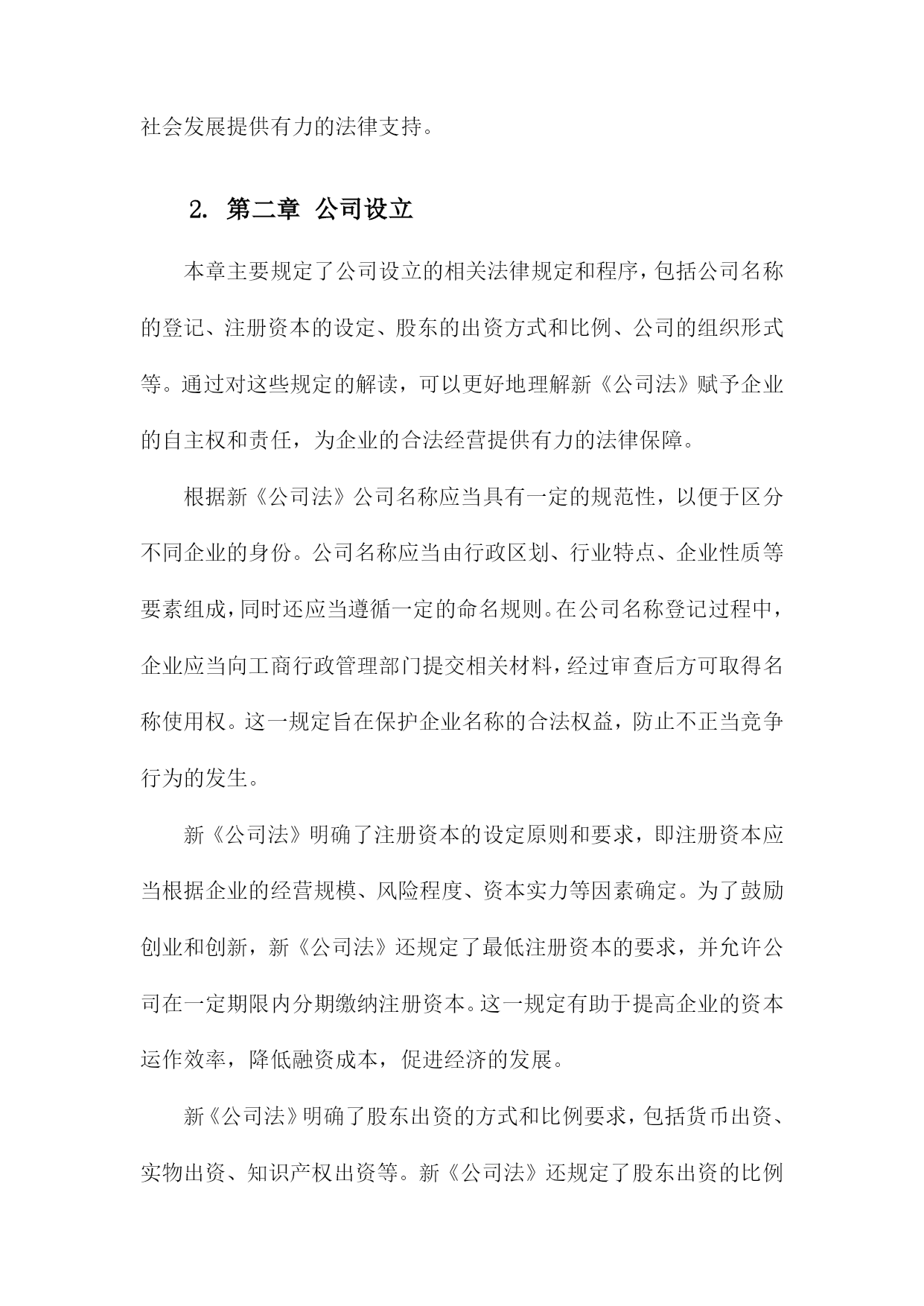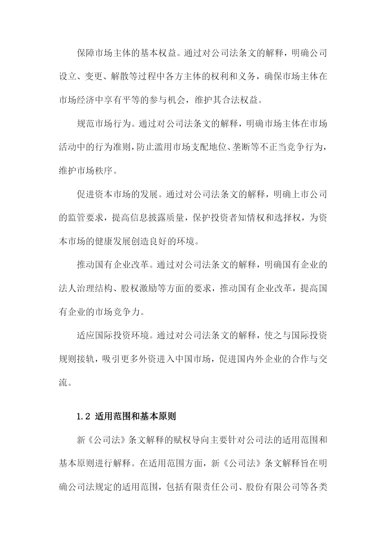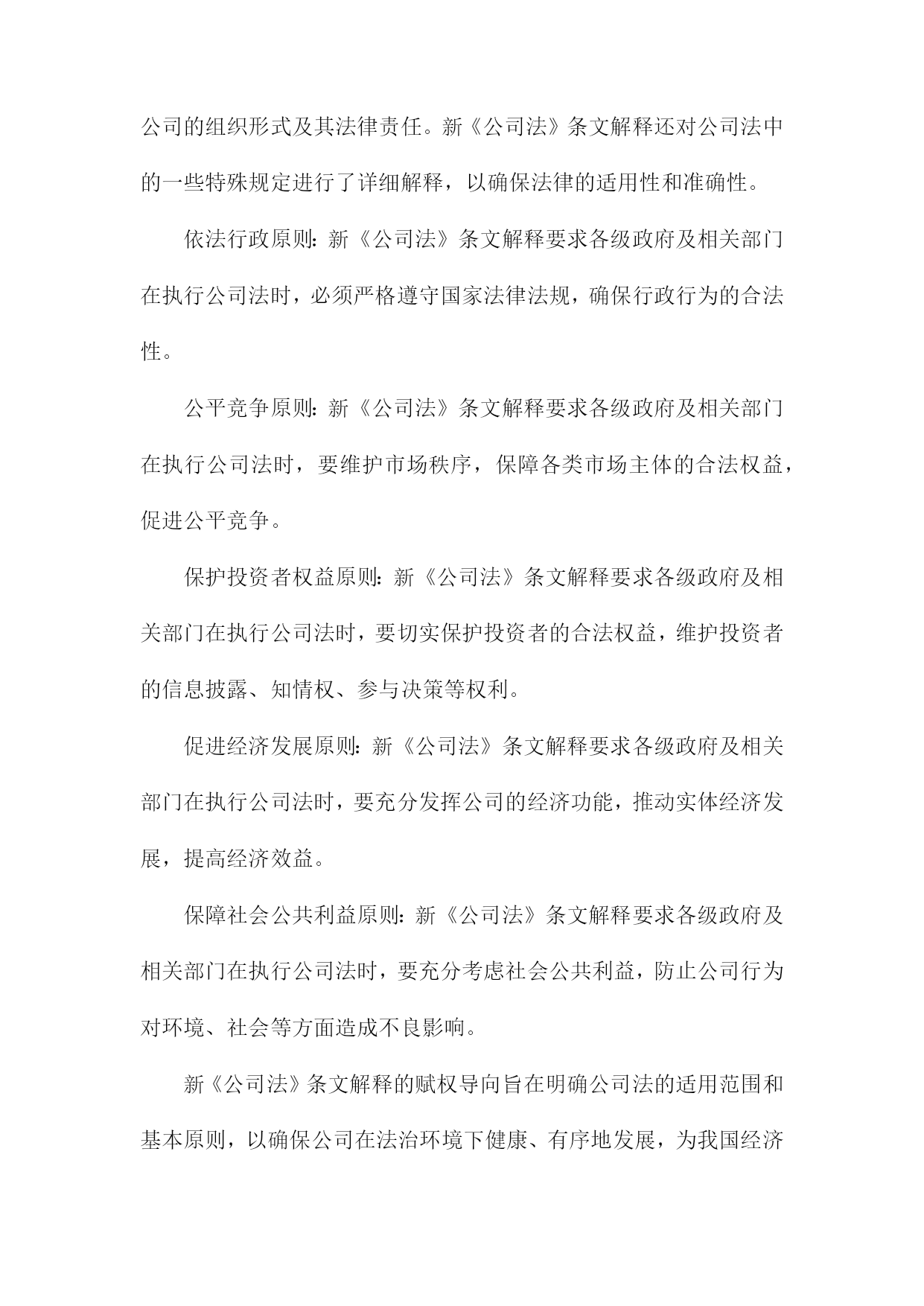新《公司法》条文解释的赋权导向1.第一章总则第一条为了规范公司行为,保障公司债权人、股东和其他利益相关者的合法权益,维护社会经济秩序,制定本法。第二条本法所称公司是指依法设立,以盈利为目的,具有独立法人资格的企业组织。第四条公司设立应当依照法定程序,向工商行政管理部门申请登记。经审查批准后,取得法人资格。未经登记或者未经核准擅自设立的公司为非法人组织。第五条公司的股东应当履行出资义务,不得滥用公司法人独立地位和股东有限责任,损害公司债权人和其他利益相关者的合法权益。第六条公司应当建立健全内部管理制度,保障股东大会、董事会、监事会等机构的有效运作,实现公司决策、执行、监督的制衡与协调。第七条公司的董事、监事、高级管理人员应当忠实履行职责,维护公司利益,不得利用职权谋取私利。第八条公司应当按照法律规定和公司章程,建立透明度高、公开公平公正的财务报告制度,接受社会监督。1.1目的和依据保障市场主体的基本权益。通过对公司法条文的解释,明确公司设立、变更、解散等过程中各方主体的权利和义务,确保市场主体在市场经济中享有平等的参与机会,维护其合法权益。规范市场行为。通过对公司法条文的解释,明确市场主体在市场活动中的行为准则,防止滥用市场支配地位、垄断等不正当竞争行为,维护市场秩序。促进资本市场的发展。通过对公司法条文的解释,明确上市公司的监管要求,提高信息披露质量,保护投资者知情权和选择权,为资本市场的健康发展创造良好的环境。推动国有企业改革。通过对公司法条文的解释,明确国有企业的法人治理结构、股权激励等方面的要求,推动国有企业改革,提高国有企业的市场竞争力。适应国际投资环境。通过对公司法条文的解释,使之与国际投资规则接轨,吸引更多外资进入中国市场,促进国内外企业的合作与交流。1.2适用范围和基本原则新《公司法》条文解释的赋权导向主要针对公司法的适用范围和基本原则进行解释。在适用范围方面,新《公司法》条文解释旨在明确公司法规定的适用范围,包括有限责任公司、股份有限公司等各类公司的组织形式及其法律责任。新《公司法》条文解释还对公司法中的一些特殊规定进行了详细解释,以确保法律的适用性和准确性。依法行政原则:新《公司法》条文解释要求各级政府及相关部门在执行公司法时,必须严格遵守国家法律法规,确保行政行为的合法性。公平竞争原则:新《公司法》条文解释要求各级政府及相关部门在执行公司法时,要维护市场秩序,保障各类市场主体的合法权益,促进公平竞争。保护投资者权益原则:新《公司法》条文解释要求各级政府及相关部门在执行公司法时,要切实保护投资者的合法权益,维护投资者的信息披露、知情权、参与决策等权利。促进经济发展原则:新《公司法》条文解释要求各级政府及相关部门在执行公司法时,要充分发挥公司的经济功能,推动实体经济发展,提高经济效益。保障社会公共利益原则:新《公司法》条文解释要求各级政府及相关部门在执行公司法时,要充分考虑社会公共利益,防止公司行为对环境、社会等方面造成不良影响。新《公司法》条文解释的赋权导向旨在明确公司法的适用范围和基本原则,以确保公司在法治环境下健康、有序地发展,为我国经济社会发展提供有力的法律支持。2.第二章公司设立本章主要规定了公司设立的相关法律规定和程序,包括公司名称的登记、注册资本的设定、股东的出资方式和比例、公司的组织形式等。通过对这些规定的解读,可以更好地理解新《公司法》赋予企业的自主权和责任,为企业的合法经营提供有力的法律保障。根据新《公司法》公司名称应当具有一定的规范性,以便于区分不同企业的身份。公司名称应当由行政区划、行业特点、企业性质等要素组成,同时还应当遵循一定的命名规则。在公司名称登记过程中,企业应当向工商行政管理部门提交相关材料,经过审查后方可取得名称使用权。这一规定旨在保护企业名称的合法权益,防止不正当竞争行为的发生。新《公司法》明确了注册资本的设定原则和要求,即注册资本应当根据企业的经营规模、风险程度、资本实力等因素确定。为了鼓励创业和创新,新《公司法》还规定了最低注册资本的要求,并允许公司在一定期限内分期缴纳注册资本。这一规定有助于提高企业的资本运作效率,降低融资成本,促进经济的发展。新《公司法》明确了股东出资的方式和比例要求,包括货币出资、实物出资、知识产权出资等。新《公司法》还规定了股东出资的比例限制,以防止大股东滥用控股地位。新《公司法》还明确了股权转让的规定,包括股权转让的条件、程序和价格等方面的要求。这一系列规定有助于保护股东的合法权益,维护公司治理秩序。新《公司法》明确了公司的组织形式,包括有限责任公司、股份有限公司等。不同的组织形式有不同的法律规定和适用范围,企业在选择组织形式时应当根据自身实际情况进行合理选择。新《公司法》还规定了公司章程