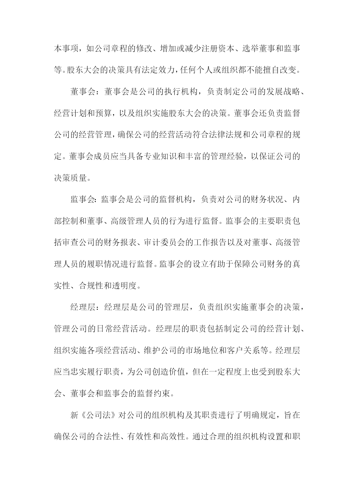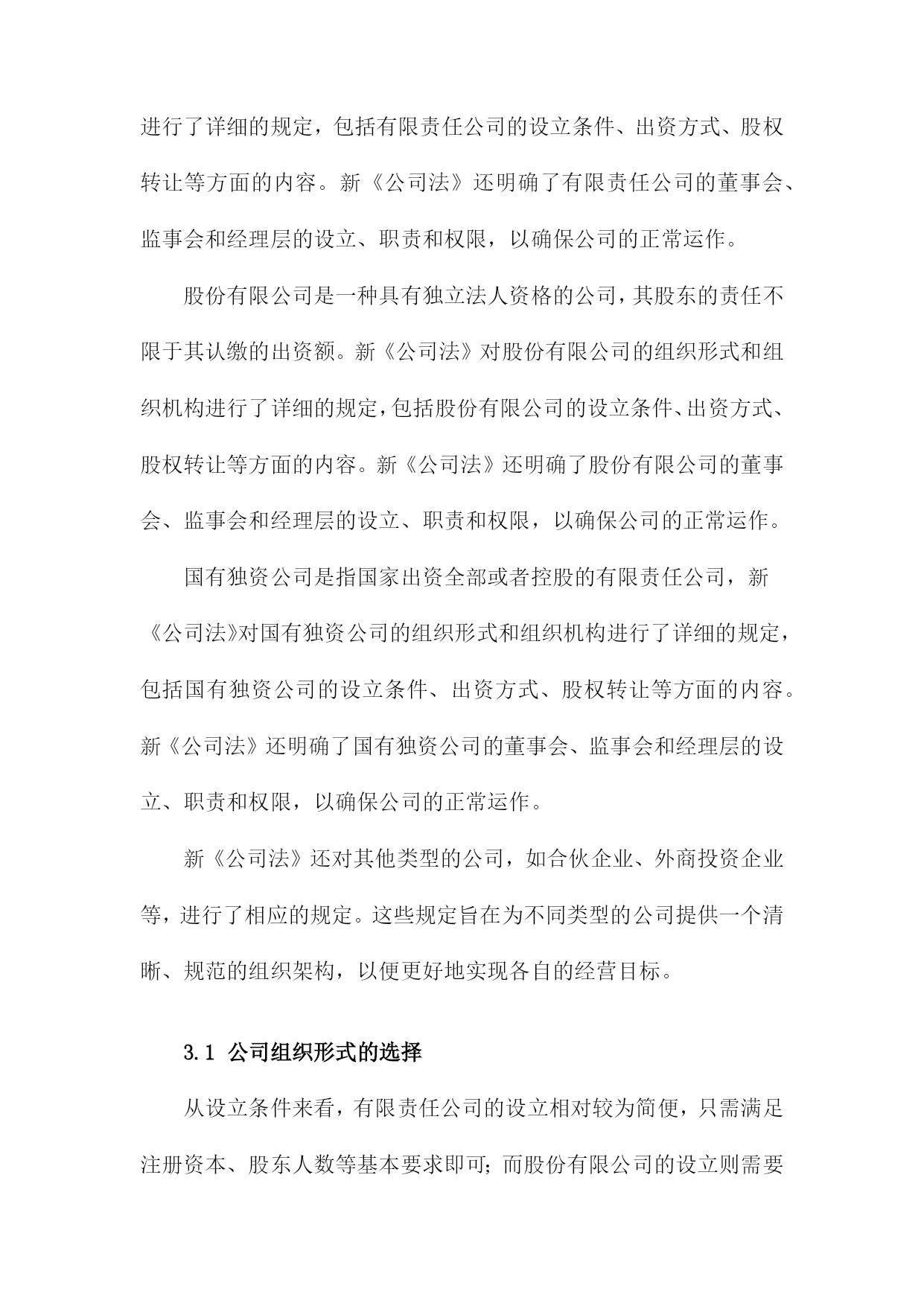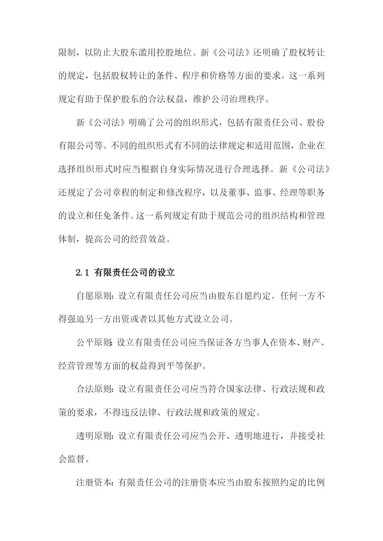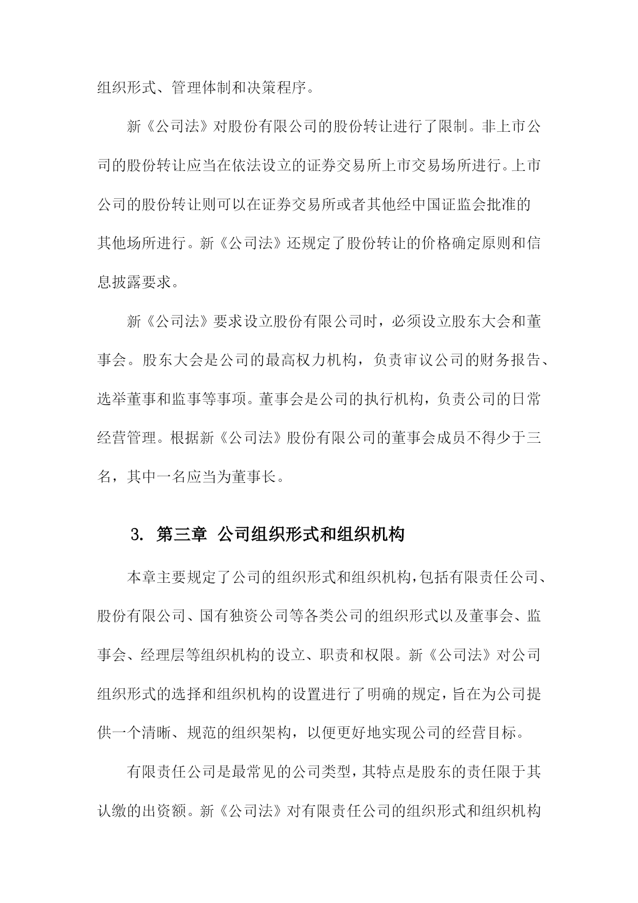 新《公司法》条文解释的赋权导向1.第一章总则第一条为了规范公司行为,保障公司债权人、股东和其他利益相关者的合法权益,维护社会经济秩序,制定本法。第二条本法所称公司是指依法设立,以盈利为目的,具有独立法人资格的企业组织。第四条公司设立应当依照法定程序,向工商行政管理部门申请登记。经审查批准后,取得法人资格。未经登记或者未经核准擅自设立的公司为非法人组织。第五条公司的股东应当履行出资义务,不得滥用公司法人独立地位和股东有限责任,损害公司债权人和其他利益相关者的合法权益。第六条公司应当建立健全内部管理制度,保障股东大会、董事会、监事会等机构的有效运作,实现公司决策、执行、监督的制衡与协调。第七条公司的董事、监事、高级管理人员应当忠实履行职责,维护公司利益,不得利用职权谋取私利。第八条公司应当按照法律规定和公司章程,建立透明度高、公开公平公正的财务报告制度,接受社会监督。1.1目的和依据保障市场主体的基本权益。通过对公司法条文的解释,明确公司设立、变更、解散等过程中各方主体的权利和义务,确保市场主体在市场经济中享有平等的参与机会,维护其合法权益。规范市场行为。通过对公司法条文的解释,明确市场主体在市场活动中的行为准则,防止滥用市场支配地位、垄断等不正当竞争行为,维护市场秩序。促进资本市场的发展。通过对公司法条文的解释,明确上市公司的监管要求,提高信息披露质量,保护投资者知情权和选择权,为资本市场的健康发展创造良好的环境。推动国有企业改革。通过对公司法条文的解释,明确国有企业的法人治理结构、股权激励等方面的要求,推动国有企业改革,提高国有企业的市场竞争力。适应国际投资环境。通过对公司法条文的解释,使之与国际投资规则接轨,吸引更多外资进入中国市场,促进国内外企业的合作与交流。1.2适用范围和基本原则新《公司法》条文解释的赋权导向主要针对公司法的适用范围和基本原则进行解释。在适用范围方面,新《公司法》条文解释旨在明确公司法规定的适用范围,包括有限责任公司、股份有限公司等各类公司的组织形式及其法律责任。新《公司法》条文解释还对公司法中的一些特殊规定进行了详细解释,以确保法律的适用性和准确性。依法行政原则:新《公司法》条文解释要求各级政府及相关部门在执行公司法时,必须严格遵守国家法律法规,确保行政行为的合法性。公平竞争原则:新《公司法》条文解释要求各级政府及相关部门在执行公司法时,要维护市场秩序,保障各类市场主体的合法权益,促进公平竞争。保护投资者权益原则:新《公司法》条文解释要求各级政府及相关部门在执行公司法时,要切实保护投资者的合法权益,维护投资者的信息披露、知情权、参与决策等权利。促进经济发展原则:新《公司法》条文解释要求各级政府及相关部门在执行公司法时,要充分发挥公司的经济功能,推动实体经济发展,提高经济效益。保障社会公共利益原则:新《公司法》条文解释要求各级政府及相关部门在执行公司法时,要充分考虑社会公共利益,防止公司行为对环境、社会等方面造成不良影响。新《公司法》条文解释的赋权导向旨在明确公司法的适用范围和基本原则,以确保公司在法治环境下健康、有序地发展,为我国经济社会发展提供有力的法律支持。2.第二章公司设立本章主要规定了公司设立的相关法律规定和程序,包括公司名称的登记、注册资本的设定、股东的出资方式和比例、公司的组织形式等。通过对这些规定的解读,可以更好地理解新《公司法》赋予企业的自主权和责任,为企业的合法经营提供有力的法律保障。根据新《公司法》公司名称应当具有一定的规范性,以便于区分不同企业的身份。公司名称应当由行政区划、行业特点、企业性质等要素组成,同时还应当遵循一定的命名规则。在公司名称登记过程中,企业应当向工商行政管理部门提交相关材料,经过审查后方可取得名称使用权。这一规定旨在保护企业名称的合法权益,防止不正当竞争行为的发生。新《公司法》明确了注册资本的设定原则和要求,即注册资本应当根据企业的经营规模、风险程度、资本实力等因素确定。为了鼓励创业和创新,新《公司法》还规定了最低注册资本的要求,并允许公司在一定期限内分期缴纳注册资本。这一规定有助于提高企业的资本运作效率,降低融资成本,促进经济的发展。新《公司法》明确了股东出资的方式和比例要求,包括货币出资、实物出资、知识产权出资等。新《公司法》还规定了股东出资的比例限制,以防止大股东滥用控股地位。新《公司法》还明确了股权转让的规定,包括股权转让的条件、程序和价格等方面的要求。这一系列规定有助于保护股东的合法权益,维护公司治理秩序。新《公司法》明确了公司的组织形式,包括有限责任公司、股份有限公司等。不同的组织形式有不同的法律规定和适用范围,企业在选择组织形式时应当根据自身实际情况进行合理选择。新《公司法》还规定了公司章程