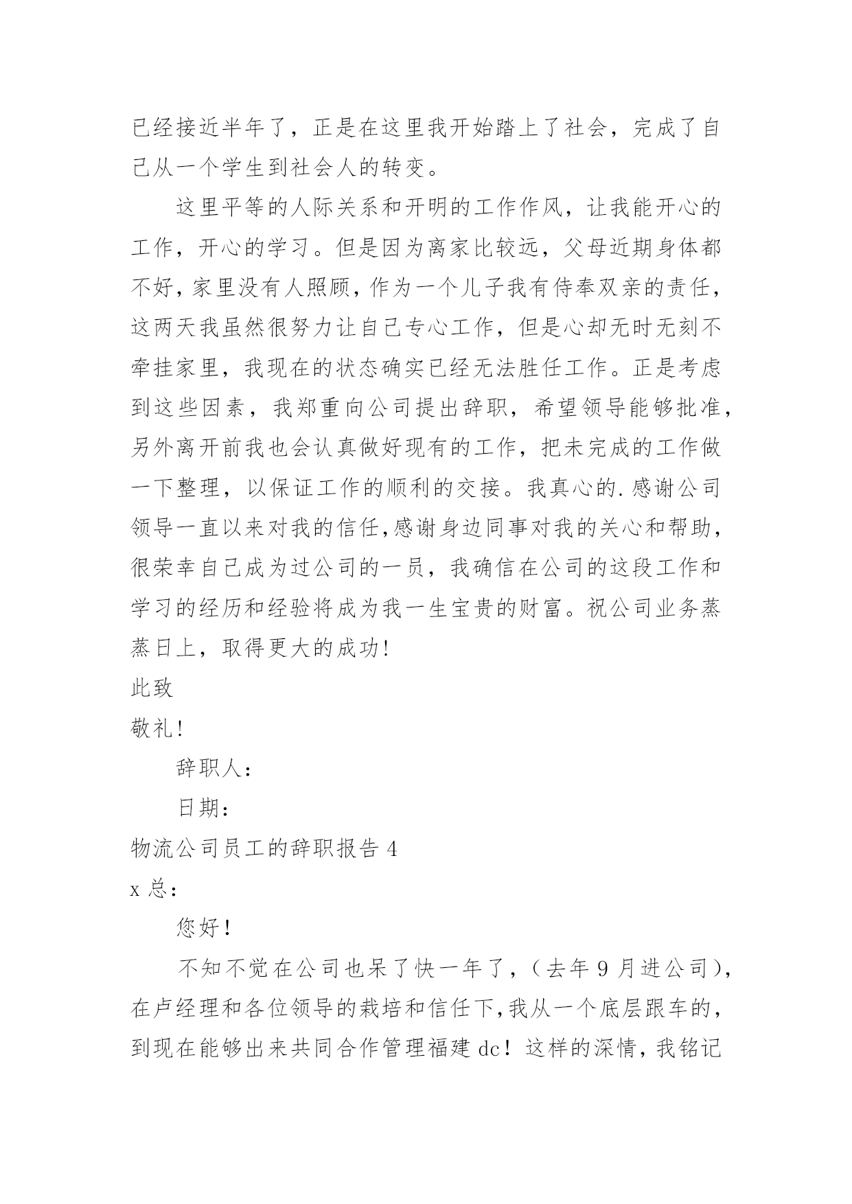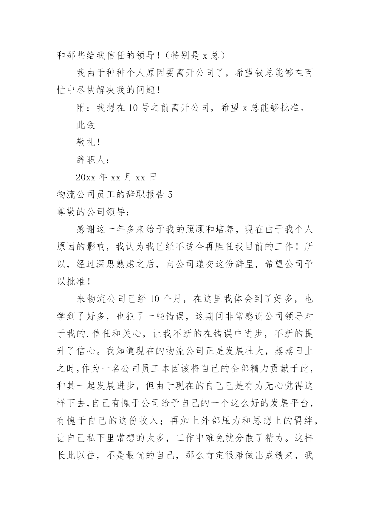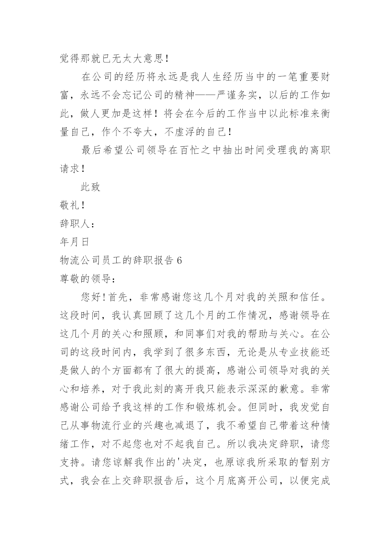 物流公司员工的辞职报告物流公司员工的辞职报告6篇随着个人的文明素养不断提升,报告的用途越来越大,报告具有双向沟通性的特点。其实写报告并没有想象中那么难,以下是小编为大家整理的物流公司员工的辞职报告,希望能够帮助到大家。物流公司员工的辞职报告1尊敬的领导:您好!我因为诸多个人原因,经过深刻冷静的思考后,郑重的向贵厂提出辞职申请。由于部门领导对我的能力的信任,使我得以加入贵公司,并且组织学习来提高个人能力,经过这两年多在贵公司的工作,使我学到了很多知识、积累了一定的经验。对此我深怀感激!感谢部门领导给我提供了一个发展舞台,并且给了我一个能与一群出色员工一起工作的机会,感谢在我们共同工作的这段时间给予我的支持与鼓励!我很满意贵公司的'工作环境,但是由于一些个人原因,我不得不向贵公司提出辞职申请。现提前一个月提交辞职申请报告,希望能在1月份正式离职。并在办完手续后搬离宿舍。对于由此为贵公司造成的不便,我深感抱歉。但同时也希望贵厂能体恤我的个人实际情况,对我的申请予以考虑并批准作顺利、身体健康。此致敬礼!辞职人:年月日物流公司员工的辞职报告2尊敬的公司领导:感谢这一年多来给予我的照顾和培养,现在由于我个人原因的影响,我认为我已经不适合再胜任我目前的工作!所以,经过深思熟虑之后,向公司递交这份辞呈,希望公司予以批准!来物流公司已经10个月,在这里我体会到了好多,也学到了好多,也犯了一些错误,这期间非常感谢公司领导对于我的信任和关心,让我不断的在错误中进步,不断的提升了信心。我知道现在的物流公司正是发展壮大,蒸蒸日上之时,作为一名公司员工本因该将自己的全部精力贡献于此,和其一起发展进步,但由于现在的自己已是有力无心觉得这样下去,自己有愧于公司给予自己的一个这么好的发展平台,有愧于自己的这份收入;再加上外部压力和思想上的羁绊,让自己私下里常想的太多,工作中难免就分散了精力。这样长此以往,不是最优的`自己,那么肯定很难做出成绩来,我觉得那就已无太大意思!在公司的经历将永远是我人生经历当中的一笔重要财富,永远不会忘记公司的精神——严谨务实,以后的工作如此,做人更加是这样!将会在今后的工作当中以此标准来衡量自己,作个不夸大,不虚浮的自己!最后希望公司领导在百忙之中抽出时间受理我的离职请求!此致敬礼!辞职人:年月日物流公司员工的辞职报告3尊敬的领导:您好!首先,非常感谢您这几个月对我的关照和信任。这段时间,我认真回顾了这几个月的工作情况,感谢领导在这几个月的关心和照顾,和同事们对我的帮助与关心。在公司的这段时间内,我学到了很多东西,无论是从专业技能还是做人的个方面都有了很大的提高,感谢公司领导对我的关心和培养,对于我此刻的离开我只能表示深深的歉意。非常感谢公司给予我这样的工作和锻炼机会。但同时,我发觉自己从事物流行业的兴趣也减退了,我不希望自己带着这种情绪工作,对不起您也对不起我自己。所以我决定辞职,请您支持。请您谅解我作出的决定,也原谅我所采取的暂别方式,我会在上交辞职报告后,这个月底离开公司,以便完成工作交接。在短短的几个月时间我们公司已经发生了巨大可喜的变化,我很遗憾不能为公司辉煌的明天贡献自己的力量。我只有衷心的祝福公司的业绩一路飙升,公司领导以及各位同事工作顺利、身体健康。此致敬礼!辞职人:20xx年xx月xx日20xx年物流公司员工辞职报告尊敬的xxx领导:我很遗憾自己在这个时候向公司正式提出辞职。来到xx物流中心已经接近半年了,正是在这里我开始踏上了社会,完成了自己从一个学生到社会人的转变。这里平等的人际关系和开明的工作作风,让我能开心的工作,开心的学习。但是因为离家比较远,父母近期身体都不好,家里没有人照顾,作为一个儿子我有侍奉双亲的责任,这两天我虽然很努力让自己专心工作,但是心却无时无刻不牵挂家里,我现在的状态确实已经无法胜任工作。正是考虑到这些因素,我郑重向公司提出辞职,希望领导能够批准,另外离开前我也会认真做好现有的工作,把未完成的工作做一下整理,以保证工作的顺利的交接。我真心的.感谢公司领导一直以来对我的信任,感谢身边同事对我的关心和帮助,很荣幸自己成为过公司的一员,我确信在公司的这段工作和学习的经历和经验将成为我一生宝贵的财富。祝公司业务蒸蒸日上,取得更大的成功!此致敬礼!辞职人:日期:物流公司员工的辞职报告4x总:您好!不知不觉在公司也呆了快一年了,(去年9月进公司),在卢经理和各位领导的栽培和信任下,我从一个底层跟车的,到现在能够出来共同合作管理福建dc!这样的深情,我铭记在心!想来,当初进迪申物流的时候,第一个是对“乐事”这样年轻的休闲食品的所包含的文化的认同,我想我们的公司也是这样的一个年轻的公司,或者说具有年轻力量的公司,!我也体会到了这样的氛围:年轻,拼搏,能力,创新,团结!公司也在飞速的发展,从济南到福建,