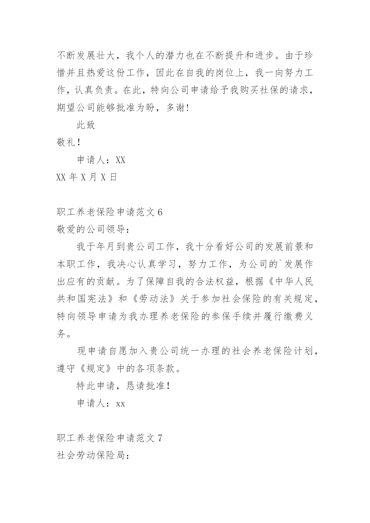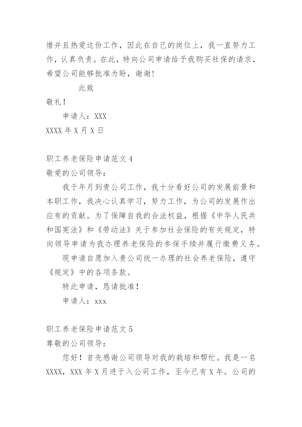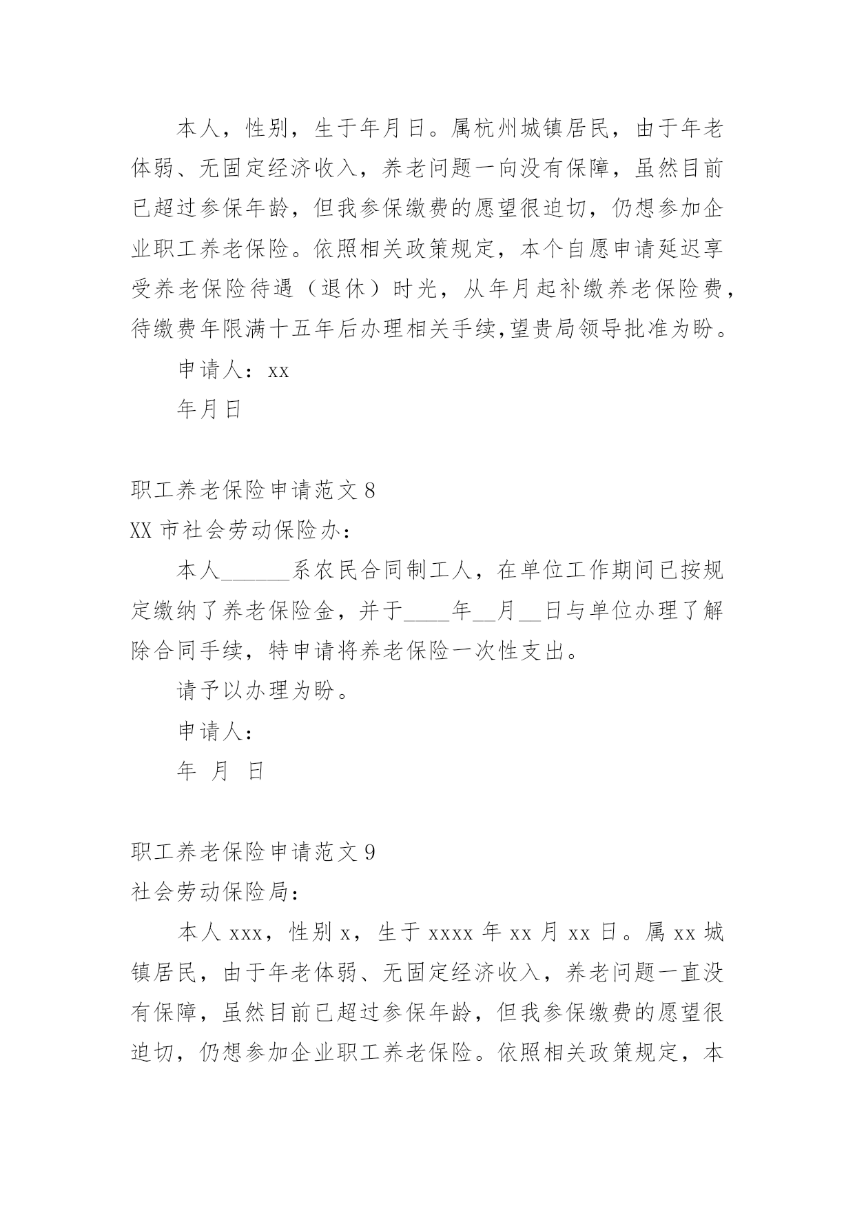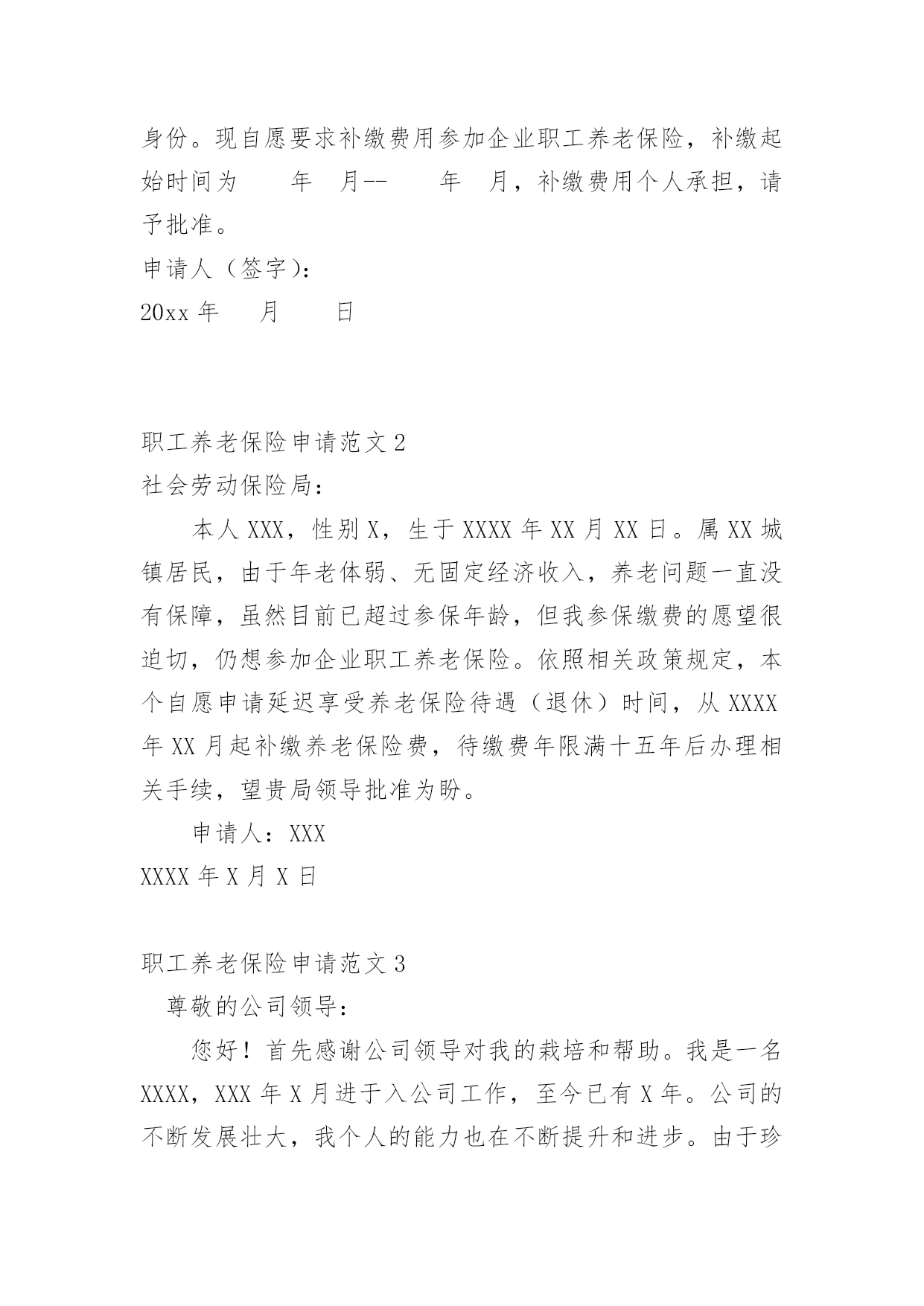 职工养老保险申请职工养老保险申请范文职工养老保险申请范文1xx人事处:本人为公司员工,按照劳动法有关规定,职工应缴纳养老保险和医疗保险。本人愿意参加公司的养老保险和医疗保险。特提出申请,请批准。申请人:xx-x年月日职工养老保险申请范文[篇2]XXXX区社会保险基金管理局:本人姓名:XXXX,性别:XXXX,身份证号码:XXXXXXXXXXXXXX,由于当时对购买社保意识不足,从XXXX年XX月至XXXX年XX月从事XXXXXXXX公司工作期间没有参加社保,现申请补缴这段时间的社保费,本人愿意从现在起按有关规定缴交社保,望批准补缴。申请人:联系电话:年月日职工养老保险申请范文[篇3]鸠江区人社局:本人是原和县单位职工,属于大集体职工身份。现自愿要求补缴费用参加企业职工养老保险,补缴起始时间为年月--年月,补缴费用个人承担,请予批准。申请人(签字):20xx年月日职工养老保险申请范文2社会劳动保险局:本人XXX,性别X,生于XXXX年XX月XX日。属XX城镇居民,由于年老体弱、无固定经济收入,养老问题一直没有保障,虽然目前已超过参保年龄,但我参保缴费的愿望很迫切,仍想参加企业职工养老保险。依照相关政策规定,本个自愿申请延迟享受养老保险待遇(退休)时间,从XXXX年XX月起补缴养老保险费,待缴费年限满十五年后办理相关手续,望贵局领导批准为盼。申请人:XXXXXXX年X月X日职工养老保险申请范文3尊敬的公司领导:您好!首先感谢公司领导对我的栽培和帮助。我是一名XXXX,XXX年X月进于入公司工作,至今已有X年。公司的不断发展壮大,我个人的能力也在不断提升和进步。由于珍惜并且热爱这份工作,因此在自己的岗位上,我一直努力工作,认真负责。在此,特向公司申请给予我购买社保的请求,希望公司能够批准为盼,谢谢!此致敬礼!申请人:XXXXXXX年X月X日职工养老保险申请范文4敬爱的公司领导:我于年月到贵公司工作,我十分看好公司的发展前景和本职工作,我决心认真学习,努力工作,为公司的发展作出应有的贡献。为了保障自我的合法权益,根据《中华人民共和国宪法》和《劳动法》关于参加社会保险的有关规定,特向领导申请为我办理养老保险的参保手续并履行缴费义务。现申请自愿加入贵公司统一办理的社会养老保险,遵守《规定》中的各项条款。特此申请,恳请批准!申请人:xxx职工养老保险申请范文5尊敬的公司领导:您好!首先感谢公司领导对我的栽培和帮忙。我是一名XXXX,XXX年X月进于入公司工作,至今已有X年。公司的不断发展壮大,我个人的潜力也在不断提升和进步。由于珍惜并且热爱这份工作,因此在自我的岗位上,我一向努力工作,认真负责。在此,特向公司申请给予我购买社保的请求,期望公司能够批准为盼,多谢!此致敬礼!申请人:XXXX年X月X日职工养老保险申请范文6敬爱的公司领导:我于年月到贵公司工作,我十分看好公司的发展前景和本职工作,我决心认真学习,努力工作,为公司的`发展作出应有的贡献。为了保障自我的合法权益,根据《中华人民共和国宪法》和《劳动法》关于参加社会保险的有关规定,特向领导申请为我办理养老保险的参保手续并履行缴费义务。现申请自愿加入贵公司统一办理的社会养老保险计划,遵守《规定》中的各项条款。特此申请,恳请批准!申请人:xx职工养老保险申请范文7社会劳动保险局:本人,性别,生于年月日。属杭州城镇居民,由于年老体弱、无固定经济收入,养老问题一向没有保障,虽然目前已超过参保年龄,但我参保缴费的愿望很迫切,仍想参加企业职工养老保险。依照相关政策规定,本个自愿申请延迟享受养老保险待遇(退休)时光,从年月起补缴养老保险费,待缴费年限满十五年后办理相关手续,望贵局领导批准为盼。申请人:xx年月日职工养老保险申请范文8XX市社会劳动保险办:本人______系农民合同制工人,在单位工作期间已按规定缴纳了养老保险金,并于____年__月__日与单位办理了解除合同手续,特申请将养老保险一次性支出。请予以办理为盼。申请人:年月日职工养老保险申请范文9社会劳动保险局:本人xxx,性别x,生于xxxx年xx月xx日。属xx城镇居民,由于年老体弱、无固定经济收入,养老问题一直没有保障,虽然目前已超过参保年龄,但我参保缴费的愿望很迫切,仍想参加企业职工养老保险。依照相关政策规定,本个自愿申请延迟享受养老保险待遇(退休)时间,从xxxx年xx月起补缴养老保险费,待缴费年限满十五年后办理相关手续,望贵局领导批准为盼。此致敬礼!xxx20xx年xx月xx日