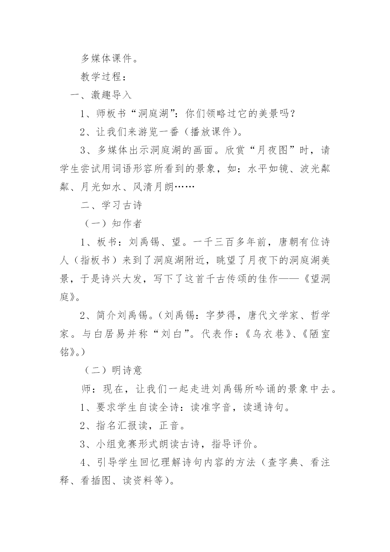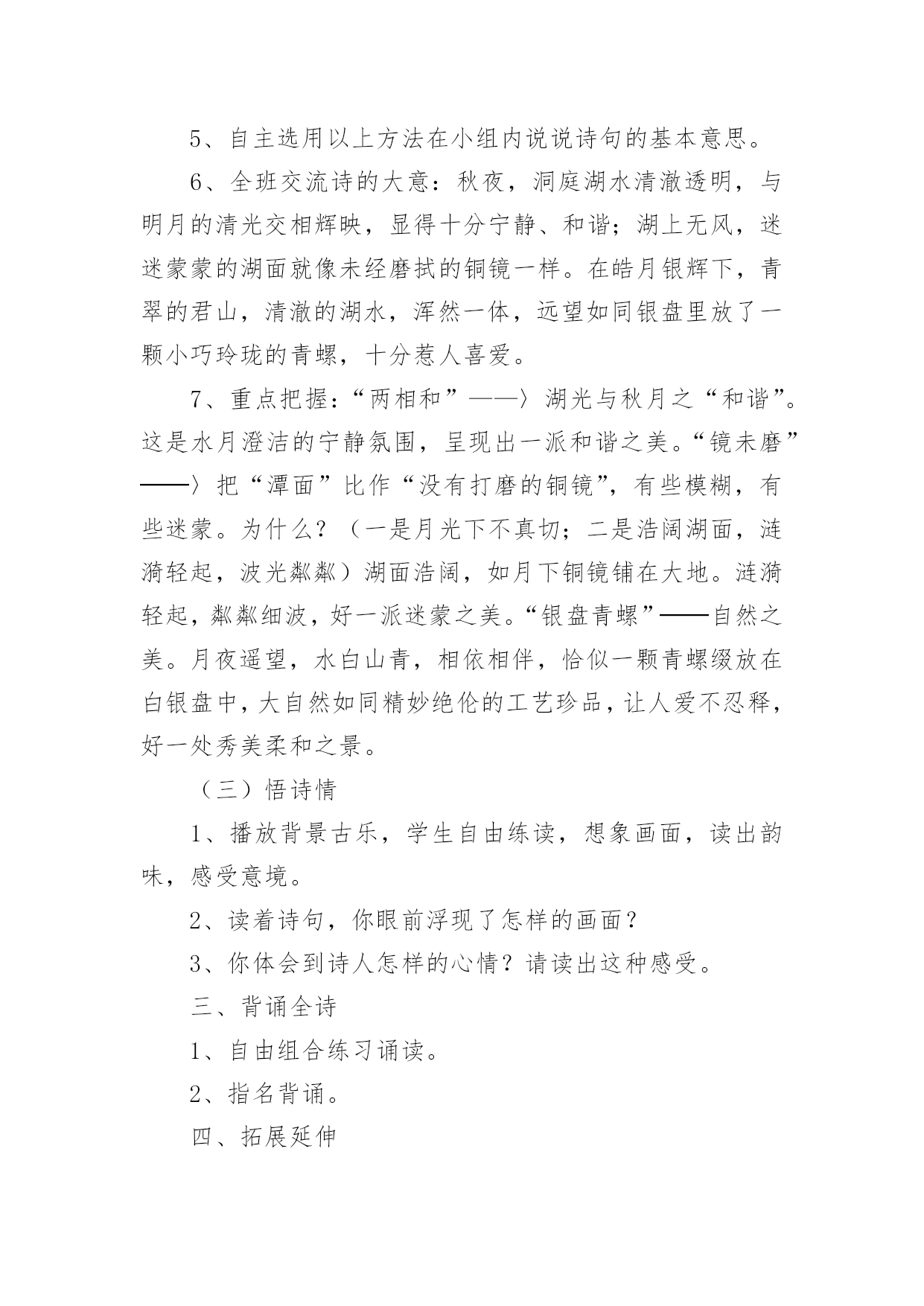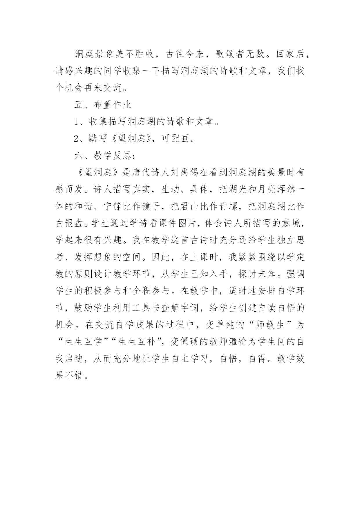 《望洞庭》教学设计《望洞庭》教学设计【实用】作为一名教师,往往需要进行教学设计编写工作,教学设计一般包括教学目标、教学重难点、教学方法、教学步骤与时间分配等环节。优秀的教学设计都具备一些什么特点呢?以下是小编整理的《望洞庭》教学设计,欢迎大家分享。学习目标:1、正确、流利、有感情地朗读古诗,理解古诗的意思。2、反复诵读古诗,于品词析句、想象意境中熟读成诵。3、感受月夜洞庭山水的柔美皎洁和精美绝伦,体会诗人的思想感情,激发对洞庭湖的喜爱和赞美之情,受到美的熏陶。教学重难点:重点:感情朗读古诗,理解古诗的意思;感受月夜洞庭山水的柔美皎洁和精美绝伦,体会诗人对洞庭湖的喜爱和赞美之情。难点:对“两相和”、“镜未磨”“白银盘里一青螺”景象的感悟。教学时间:1课时。教学准备:多媒体课件。教学过程:一、激趣导入1、师板书“洞庭湖”:你们领略过它的美景吗?2、让我们来游览一番(播放课件)。3、多媒体出示洞庭湖的画面。欣赏“月夜图”时,请学生尝试用词语形容所看到的景象,如:水平如镜、波光粼粼、月光如水、风清月朗……二、学习古诗(一)知作者1、板书:刘禹锡、望。一千三百多年前,唐朝有位诗人(指板书)来到了洞庭湖附近,眺望了月夜下的洞庭湖美景,于是诗兴大发,写下了这首千古传颂的佳作——《望洞庭》。2、简介刘禹锡。(刘禹锡:字梦得,唐代文学家、哲学家。与白居易并称“刘白”。代表作:《乌衣巷》、《陋室铭》。)(二)明诗意师:现在,让我们一起走进刘禹锡所吟诵的景象中去。1、要求学生自读全诗:读准字音,读通诗句。2、指名汇报读,正音。3、小组竞赛形式朗读古诗,指导评价。4、引导学生回忆理解诗句内容的方法(查字典、看注释、看插图、读资料等)。5、自主选用以上方法在小组内说说诗句的基本意思。6、全班交流诗的大意:秋夜,洞庭湖水清澈透明,与明月的清光交相辉映,显得十分宁静、和谐;湖上无风,迷迷蒙蒙的湖面就像未经磨拭的铜镜一样。在皓月银辉下,青翠的君山,清澈的湖水,浑然一体,远望如同银盘里放了一颗小巧玲珑的青螺,十分惹人喜爱。7、重点把握:“两相和”——〉湖光与秋月之“和谐”。这是水月澄洁的宁静氛围,呈现出一派和谐之美。“镜未磨”──〉把“潭面”比作“没有打磨的铜镜”,有些模糊,有些迷蒙。为什么?(一是月光下不真切;二是浩阔湖面,涟漪轻起,波光粼粼)湖面浩阔,如月下铜镜铺在大地。涟漪轻起,粼粼细波,好一派迷蒙之美。“银盘青螺”──自然之美。月夜遥望,水白山青,相依相伴,恰似一颗青螺缀放在白银盘中,大自然如同精妙绝伦的工艺珍品,让人爱不忍释,好一处秀美柔和之景。(三)悟诗情1、播放背景古乐,学生自由练读,想象画面,读出韵味,感受意境。2、读着诗句,你眼前浮现了怎样的画面?3、你体会到诗人怎样的心情?请读出这种感受。三、背诵全诗1、自由组合练习诵读。2、指名背诵。四、拓展延伸洞庭景象美不胜收,古往今来,歌颂者无数。回家后,请感兴趣的同学收集一下描写洞庭湖的诗歌和文章,我们找个机会再来交流。五、布置作业1、收集描写洞庭湖的诗歌和文章。2、默写《望洞庭》,可配画。六、教学反思:《望洞庭》是唐代诗人刘禹锡在看到洞庭湖的美景时有感而发。诗人描写真实,生动、具体,把湖光和月亮浑然一体的和谐、宁静比作镜子,把君山比作青螺,把洞庭湖比作白银盘。学生通过学诗看课件图片,体会诗人所描写的意境,学起来很有兴趣。我在教学这首古诗时充分还给学生独立思考、发挥想象的空间。因此,在上课时,我紧紧围绕以学定教的原则设计教学环节,从学生已知入手,探讨未知。强调学生的积极参与和全程参与。在教学中,适时地安排自学环节,鼓励学生利用工具书查解字词,给学生创建自读自悟的机会。在交流自学成果的过程中,变单纯的“师教生”为“生生互学”“生生互补”,变僵硬的教师灌输为学生间的自我启迪,从而充分地让学生自主学习,自悟,自得。教学效果不错。