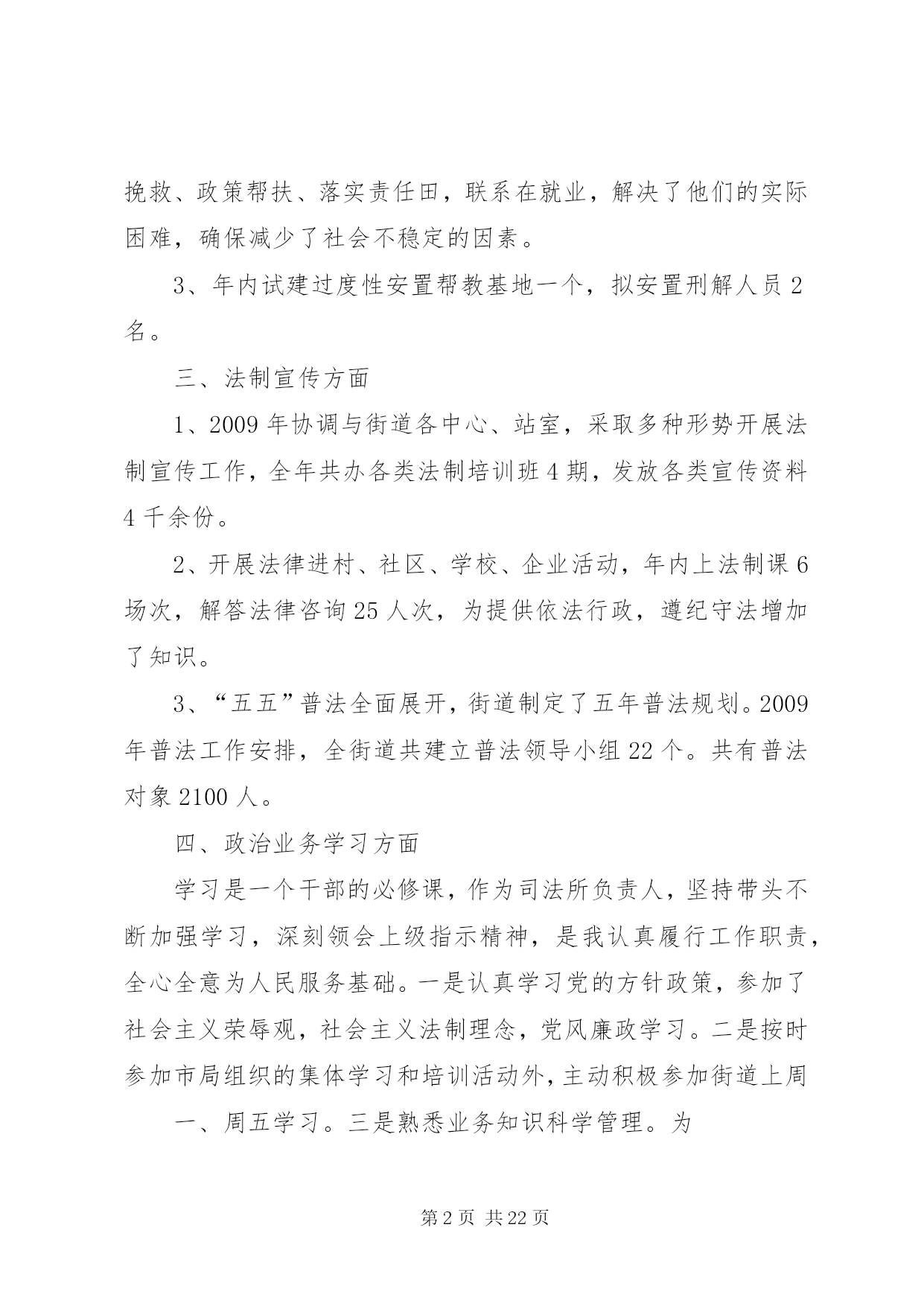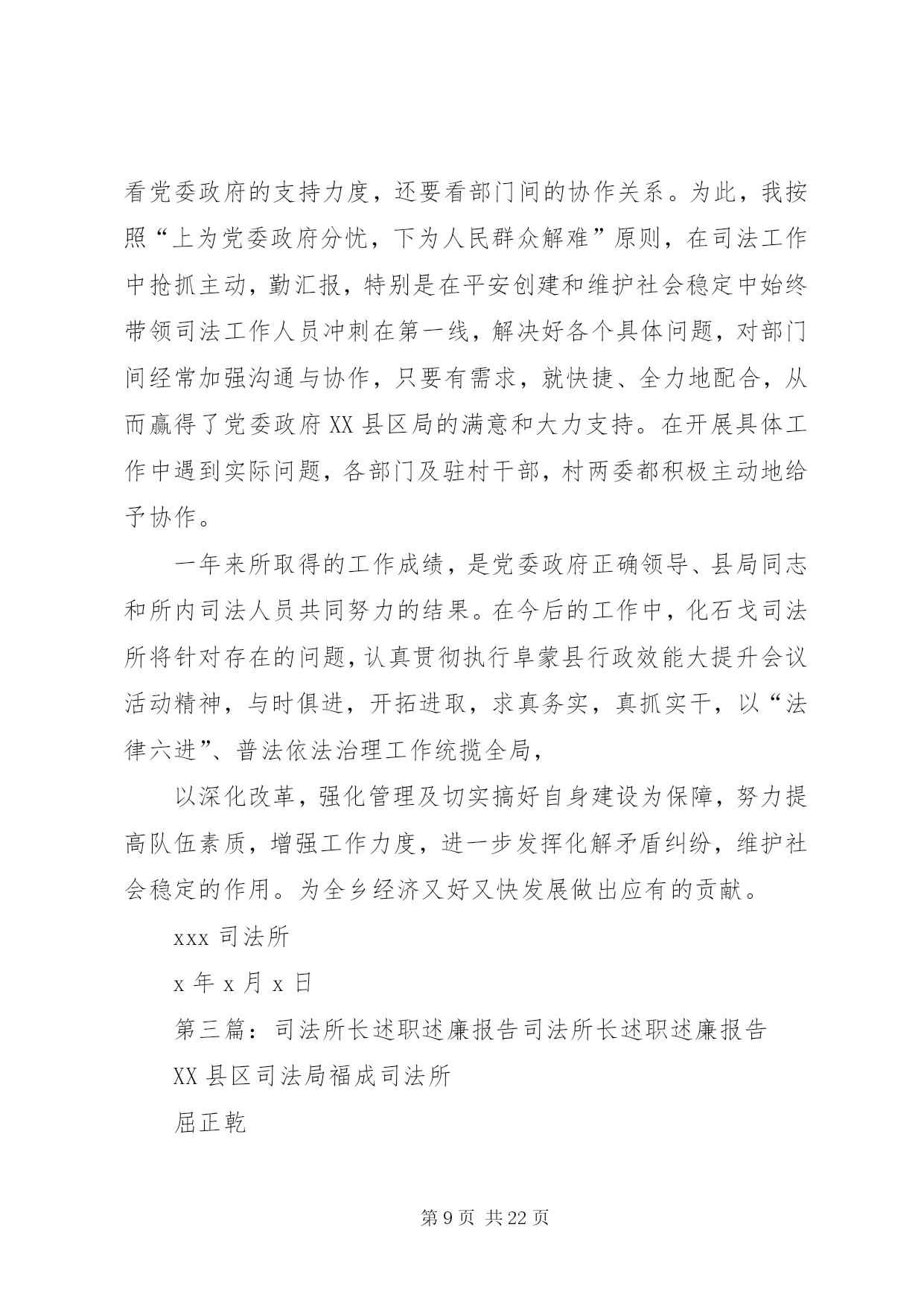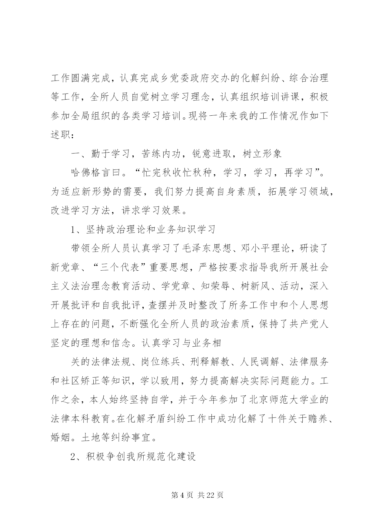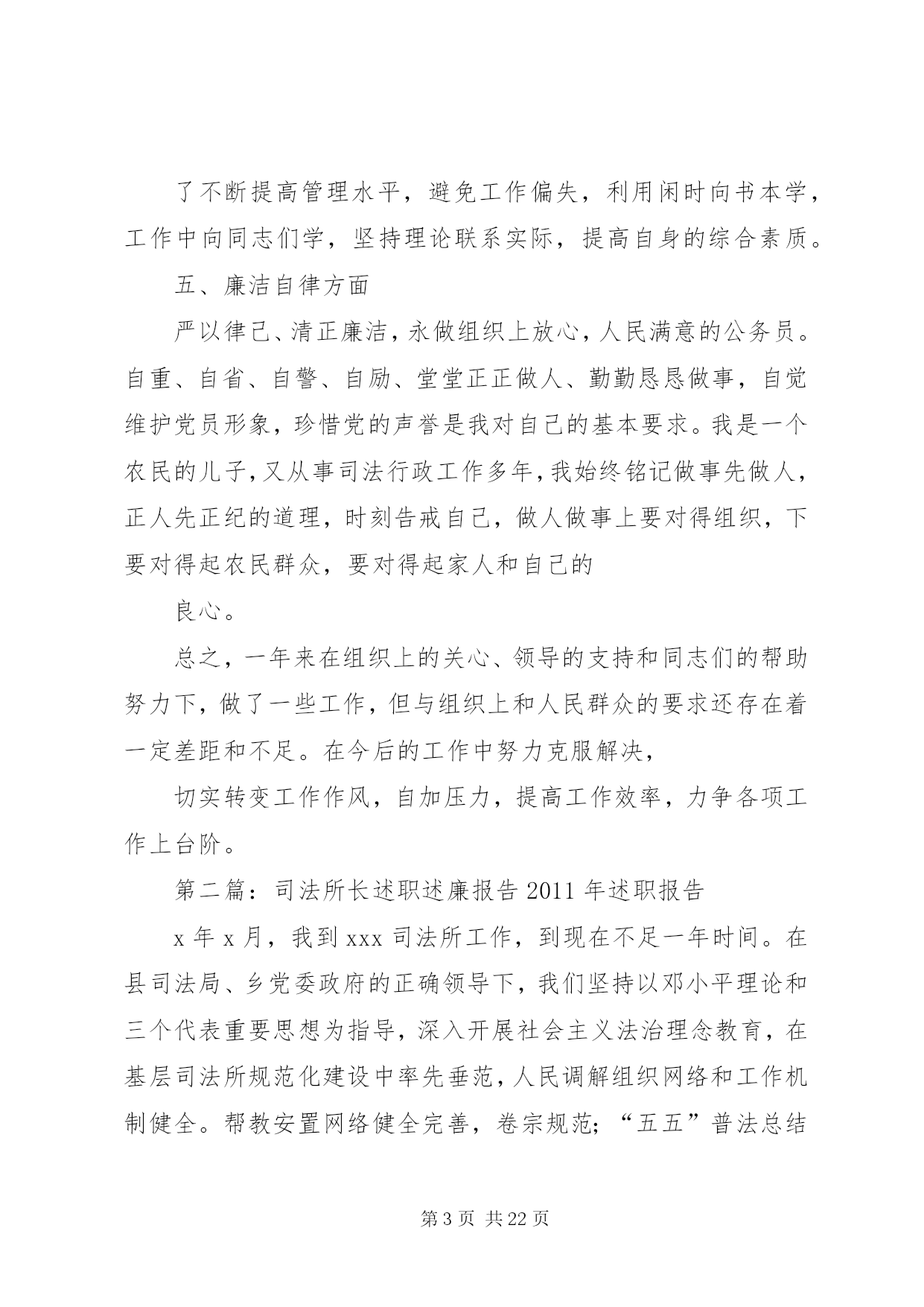 第PAGE\*Arabic\*MERGEFORMAT22页共NUMPAGES\*MERGEFORMAT22页司法所长述职述廉报告一年来,我在区司法局的正确领导下,在街道党工委、街道办事处的大力支持下,紧紧围绕2009年工作目标,以科学经济发展观、服务于人民群众为宗旨,认真履行职责,现就任职一年来工作任务完成情况汇报如下,如有不妥之处,请各位领导、同志们批评指正。一、业务工作方面1、建立健全街道各级人民调解委员会12个,其中,街道街道办事处1个,村调委会10个,社区调解委员会1个。村、居调委会达到了“四有”、“六落实”。2、坚持每月两排查一分析制度,全年共排查调处各类矛盾纠纷63起,调解率100%,调解成功率98%。无因调解不及时而引起的民转刑案件和群众性集体上访案件的发生。3、强化调解人民的培训利用每月20日的调解主任例会和年初集中培训的方法,对69名调解员进行了法律、法规业务知识的培训学习,提高了他们的调解技能。二、安置帮教工作方面1、加强对刑释解教人员的排查,全街道共排摸出5年内的刑释解教人员19名,其中:刑释18名,解教1名,并建档立卡进行安置帮教,帮教率为100%。安置率100%。2、积极主动与各单位和基层安置帮教小组协调,采取感化、挽救、政策帮扶、落实责任田,联系在就业,解决了他们的实际困难,确保减少了社会不稳定的因素。3、年内试建过度性安置帮教基地一个,拟安置刑解人员2名。三、法制宣传方面1、2009年协调与街道各中心、站室,采取多种形势开展法制宣传工作,全年共办各类法制培训班4期,发放各类宣传资料4千余份。2、开展法律进村、社区、学校、企业活动,年内上法制课6场次,解答法律咨询25人次,为提供依法行政,遵纪守法增加了知识。3、“五五”普法全面展开,街道制定了五年普法规划。2009年普法工作安排,全街道共建立普法领导小组22个。共有普法对象2100人。四、政治业务学习方面学习是一个干部的必修课,作为司法所负责人,坚持带头不断加强学习,深刻领会上级指示精神,是我认真履行工作职责,全心全意为人民服务基础。一是认真学习党的方针政策,参加了社会主义荣辱观,社会主义法制理念,党风廉政学习。二是按时参加市局组织的集体学习和培训活动外,主动积极参加街道上周一、周五学习。三是熟悉业务知识科学管理。为了不断提高管理水平,避免工作偏失,利用闲时向书本学,工作中向同志们学,坚持理论联系实际,提高自身的综合素质。五、廉洁自律方面严以律己、清正廉洁,永做组织上放心,人民满意的公务员。自重、自省、自警、自励、堂堂正正做人、勤勤恳恳做事,自觉维护党员形象,珍惜党的声誉是我对自己的基本要求。我是一个农民的儿子,又从事司法行政工作多年,我始终铭记做事先做人,正人先正纪的道理,时刻告戒自己,做人做事上要对得组织,下要对得起农民群众,要对得起家人和自己的良心。总之,一年来在组织上的关心、领导的支持和同志们的帮助努力下,做了一些工作,但与组织上和人民群众的要求还存在着一定差距和不足。在今后的工作中努力克服解决,切实转变工作作风,自加压力,提高工作效率,力争各项工作上台阶。第二篇:司法所长述职述廉报告2011年述职报告x年x月,我到xxx司法所工作,到现在不足一年时间。在县司法局、乡党委政府的正确领导下,我们坚持以邓小平理论和三个代表重要思想为指导,深入开展社会主义法治理念教育,在基层司法所规范化建设中率先垂范,人民调解组织网络和工作机制健全。帮教安置网络健全完善,卷宗规范;“五五”普法总结工作圆满完成,认真完成乡党委政府交办的化解纠纷、综合治理等工作,全所人员自觉树立学习理念,认真组织培训讲课,积极参加全局组织的各类学习培训。现将一年来我的工作情况作如下述职:一、勤于学习,苦练内功,锐意进取,树立形象哈佛格言曰。“忙完秋收忙秋种,学习,学习,再学习”。为适应新形势的需要,我们努力提高自身素质,拓展学习领域,改进学习方法,讲求学习效果。1、坚持政治理论和业务知识学习带领全所人员认真学习了毛泽东思想、邓小平理论,研读了新党章、“三个代表”重要思想,严格按要求指导我所开展社会主义法治理念教育活动、学党章、知荣辱、树新风、活动,深入开展批评和自我批评,查摆并及时整改了所务工作中和个人思想上存在的问题,不断强化全所人员的政治素质,保持了共产党人坚定的理想和信念。认真学习与业务相关的法律法规、岗位练兵、刑释解教、人民调解、法律服务和社区矫正等知识,学以致用,努力提高解决实际问题能力。工作之余,本人始终坚持自学,并于今年参加了北京师范大学业的法律本科教育。在化解矛盾纠纷工作中成功化解了十件关于赡养、婚姻。土地等纠纷事宜。2、积极争创我所规范化建设在我所规范化建设中积极争取乡党委、政府XX县区司法局的支持。认真规范完善了xxx司法所软硬件设施资