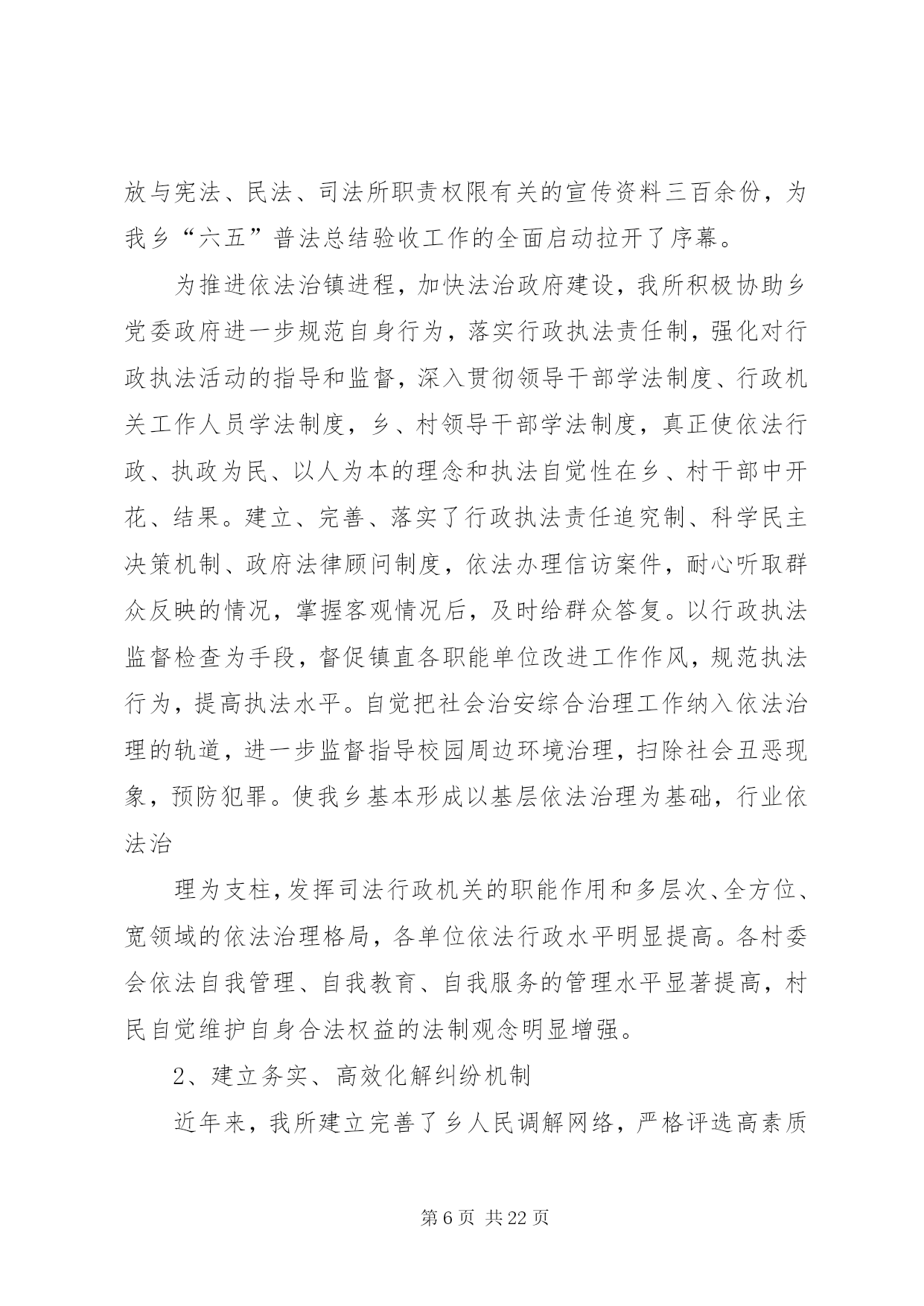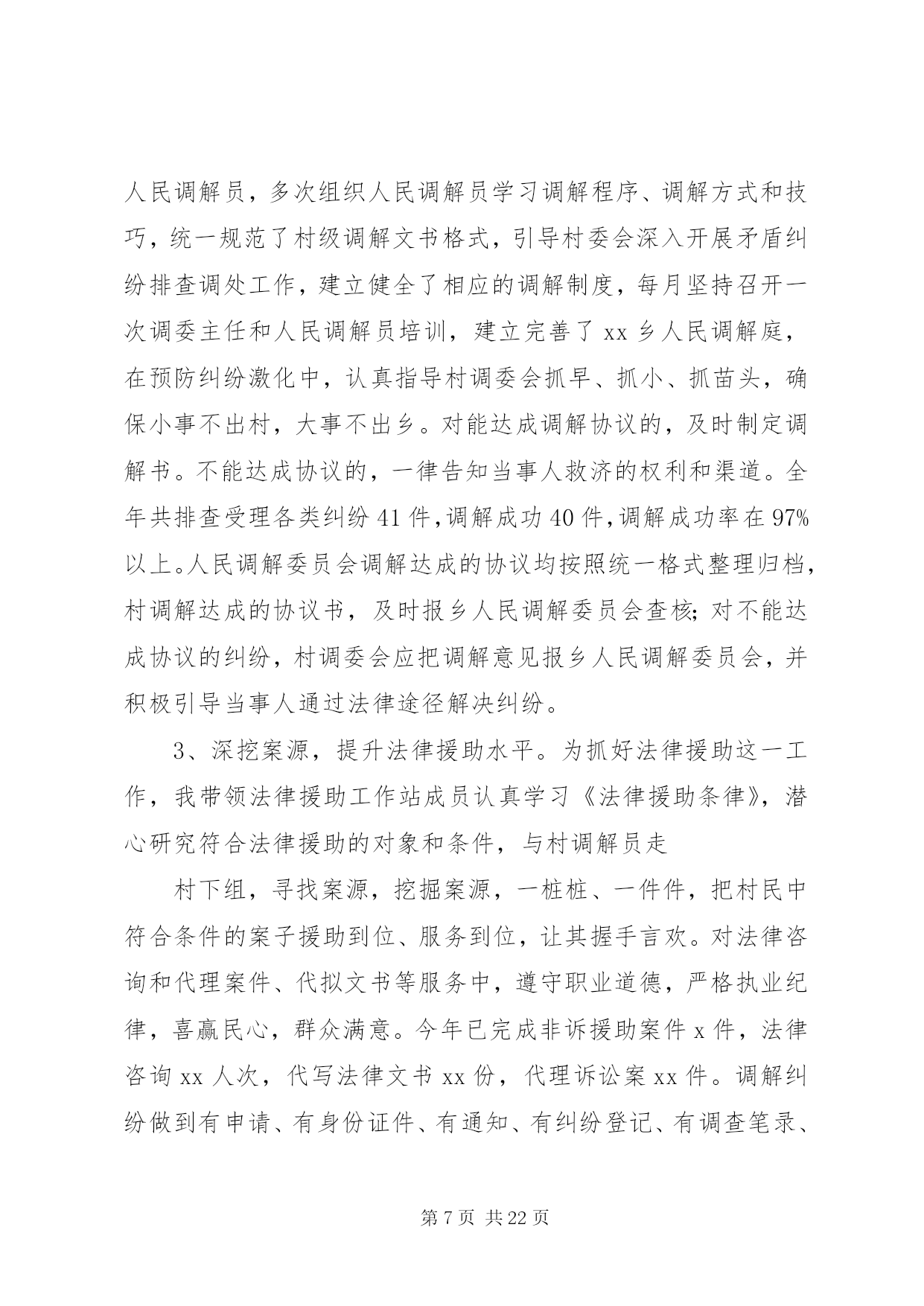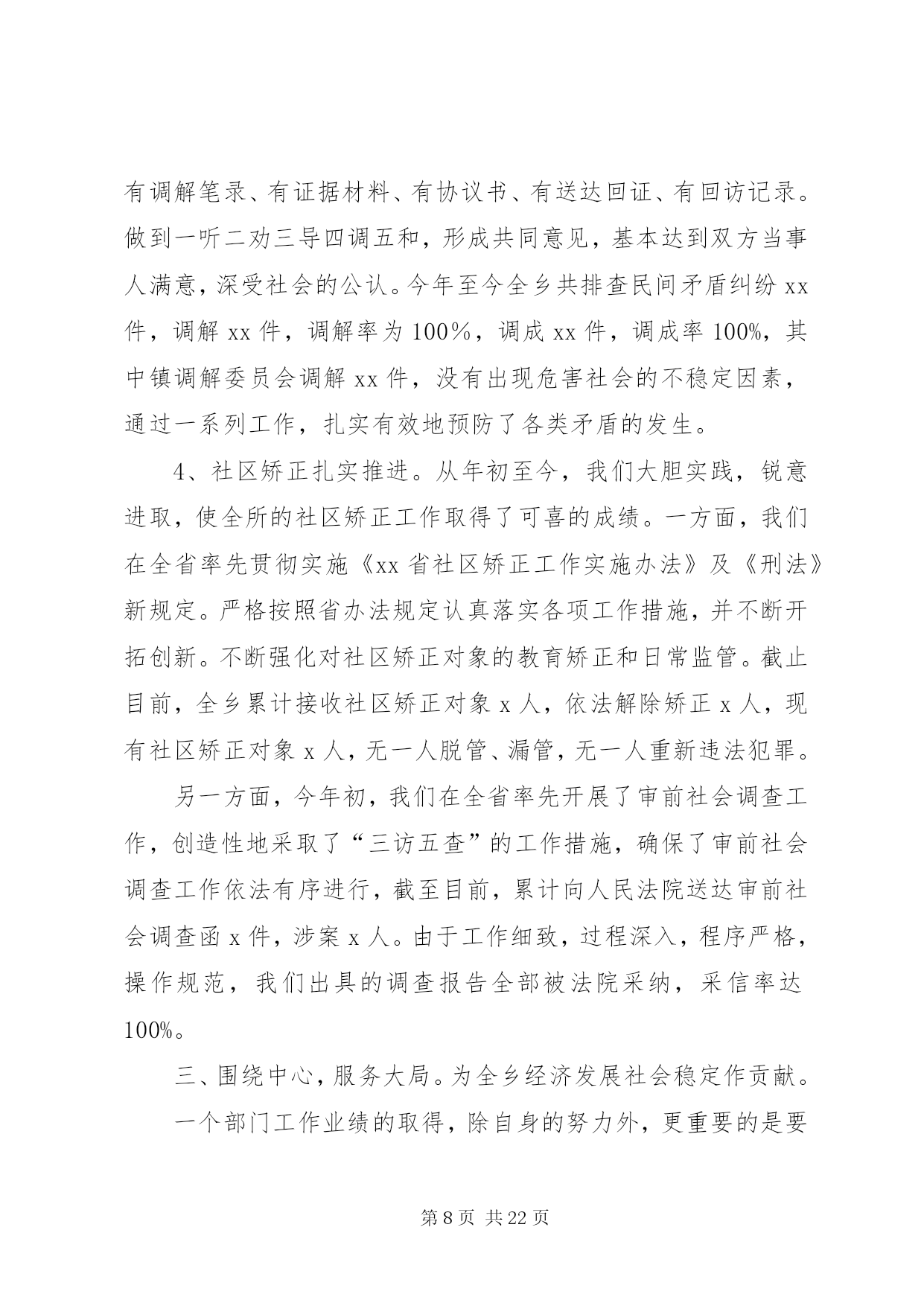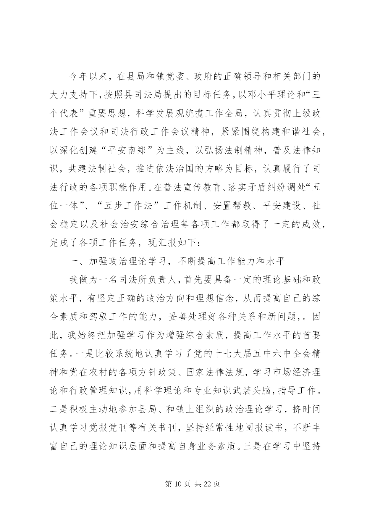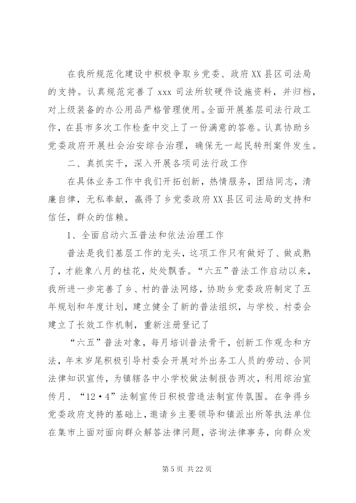 第PAGE\*Arabic\*MERGEFORMAT22页共NUMPAGES\*MERGEFORMAT22页司法所长述职述廉报告一年来,我在区司法局的正确领导下,在街道党工委、街道办事处的大力支持下,紧紧围绕2009年工作目标,以科学经济发展观、服务于人民群众为宗旨,认真履行职责,现就任职一年来工作任务完成情况汇报如下,如有不妥之处,请各位领导、同志们批评指正。一、业务工作方面1、建立健全街道各级人民调解委员会12个,其中,街道街道办事处1个,村调委会10个,社区调解委员会1个。村、居调委会达到了“四有”、“六落实”。2、坚持每月两排查一分析制度,全年共排查调处各类矛盾纠纷63起,调解率100%,调解成功率98%。无因调解不及时而引起的民转刑案件和群众性集体上访案件的发生。3、强化调解人民的培训利用每月20日的调解主任例会和年初集中培训的方法,对69名调解员进行了法律、法规业务知识的培训学习,提高了他们的调解技能。二、安置帮教工作方面1、加强对刑释解教人员的排查,全街道共排摸出5年内的刑释解教人员19名,其中:刑释18名,解教1名,并建档立卡进行安置帮教,帮教率为100%。安置率100%。2、积极主动与各单位和基层安置帮教小组协调,采取感化、挽救、政策帮扶、落实责任田,联系在就业,解决了他们的实际困难,确保减少了社会不稳定的因素。3、年内试建过度性安置帮教基地一个,拟安置刑解人员2名。三、法制宣传方面1、2009年协调与街道各中心、站室,采取多种形势开展法制宣传工作,全年共办各类法制培训班4期,发放各类宣传资料4千余份。2、开展法律进村、社区、学校、企业活动,年内上法制课6场次,解答法律咨询25人次,为提供依法行政,遵纪守法增加了知识。3、“五五”普法全面展开,街道制定了五年普法规划。2009年普法工作安排,全街道共建立普法领导小组22个。共有普法对象2100人。四、政治业务学习方面学习是一个干部的必修课,作为司法所负责人,坚持带头不断加强学习,深刻领会上级指示精神,是我认真履行工作职责,全心全意为人民服务基础。一是认真学习党的方针政策,参加了社会主义荣辱观,社会主义法制理念,党风廉政学习。二是按时参加市局组织的集体学习和培训活动外,主动积极参加街道上周一、周五学习。三是熟悉业务知识科学管理。为了不断提高管理水平,避免工作偏失,利用闲时向书本学,工作中向同志们学,坚持理论联系实际,提高自身的综合素质。五、廉洁自律方面严以律己、清正廉洁,永做组织上放心,人民满意的公务员。自重、自省、自警、自励、堂堂正正做人、勤勤恳恳做事,自觉维护党员形象,珍惜党的声誉是我对自己的基本要求。我是一个农民的儿子,又从事司法行政工作多年,我始终铭记做事先做人,正人先正纪的道理,时刻告戒自己,做人做事上要对得组织,下要对得起农民群众,要对得起家人和自己的良心。总之,一年来在组织上的关心、领导的支持和同志们的帮助努力下,做了一些工作,但与组织上和人民群众的要求还存在着一定差距和不足。在今后的工作中努力克服解决,切实转变工作作风,自加压力,提高工作效率,力争各项工作上台阶。第二篇:司法所长述职述廉报告2011年述职报告x年x月,我到xxx司法所工作,到现在不足一年时间。在县司法局、乡党委政府的正确领导下,我们坚持以邓小平理论和三个代表重要思想为指导,深入开展社会主义法治理念教育,在基层司法所规范化建设中率先垂范,人民调解组织网络和工作机制健全。帮教安置网络健全完善,卷宗规范;“五五”普法总结工作圆满完成,认真完成乡党委政府交办的化解纠纷、综合治理等工作,全所人员自觉树立学习理念,认真组织培训讲课,积极参加全局组织的各类学习培训。现将一年来我的工作情况作如下述职:一、勤于学习,苦练内功,锐意进取,树立形象哈佛格言曰。“忙完秋收忙秋种,学习,学习,再学习”。为适应新形势的需要,我们努力提高自身素质,拓展学习领域,改进学习方法,讲求学习效果。1、坚持政治理论和业务知识学习带领全所人员认真学习了毛泽东思想、邓小平理论,研读了新党章、“三个代表”重要思想,严格按要求指导我所开展社会主义法治理念教育活动、学党章、知荣辱、树新风、活动,深入开展批评和自我批评,查摆并及时整改了所务工作中和个人思想上存在的问题,不断强化全所人员的政治素质,保持了共产党人坚定的理想和信念。认真学习与业务相关的法律法规、岗位练兵、刑释解教、人民调解、法律服务和社区矫正等知识,学以致用,努力提高解决实际问题能力。工作之余,本人始终坚持自学,并于今年参加了北京师范大学业的法律本科教育。在化解矛盾纠纷工作中成功化解了十件关于赡养、婚姻。土地等纠纷事宜。2、积极争创我所规范化建设在我所规范化建设中积极争取乡党委、政府XX县区司法局的支持。认真规范完善了xxx司法所软硬件设施资