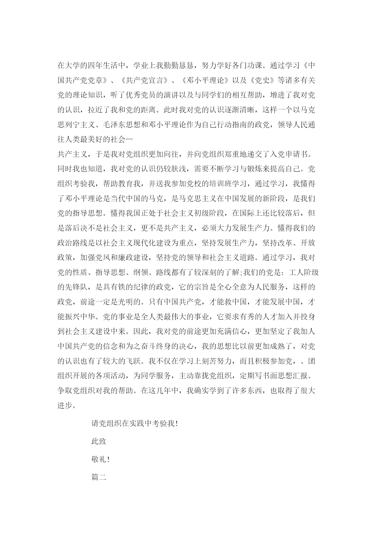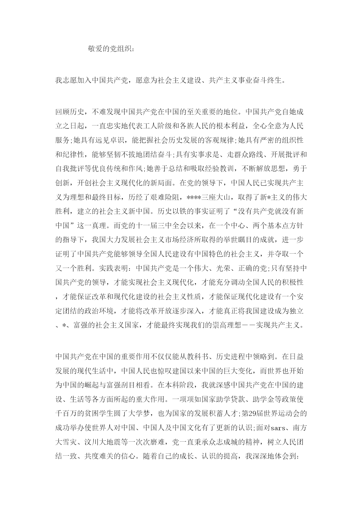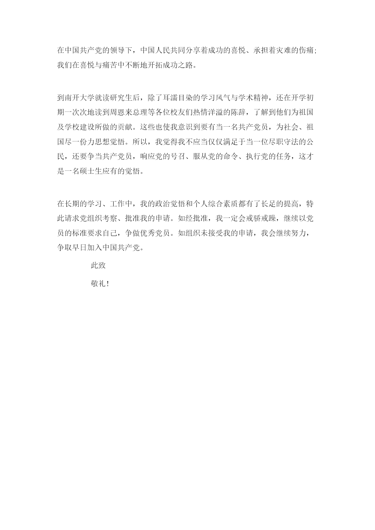 2020年研究生入党申请书模板2000字篇一敬爱的党组织:我于一九八零年四月五日出生在一个普通的知识分子家庭,我是沐浴着党的阳光、伴随着祖国的改革开放而成长起来的。我的母亲是一名质检工作者,父亲是一名工程师。在这样的家庭中长大,从小时候起,母亲谦虚严谨、细致谨慎的生活态度,父亲刻苦好学、兢兢业业的工作作风就深深地感染着我,教育着我。一九八六年九月我进入了天津市×××小学,从此开始了我的学习生涯。临学前,母亲教导我,鲜艳的红领巾是革命先辈们的鲜血染红的,是少年先锋队的标志,只有像毛主席、周总理那样为革命奋斗终生的老前辈们才配戴上它;只有像钱学森、李四光那样为祖国的科学事业奉献出毕生精力的科学家们才配戴上它;只有像雷锋、王进喜那样为保卫祖国、建设祖国不怕苦、不怕累的解放军战士们和劳动模范们才配戴上它。我牢记母亲的话,进入小学后,我在各科学习上努力刻苦、争当先进;在各项劳动中处处争先、不怕苦、不怕累;在各种活动中踊跃参加、积极表现。在小学二年级首批光荣地加入了中国少年先锋队,我抚摸着胸前的红领巾暗暗下定决心,一定要更加进步,更加努力。在小学阶段,我连续六年担任班委、班长,连续五年被评为校级三好学生、区级三好学生,并在五、六年级的时候担任校大队委、大队长。一九九二年六月,我作为优秀毕业生被所在校推荐到当时的天津市级重点中学——天津市×××中学,并在随后的入学考试中取得了总分第七名的优异成绩。在这个陌生的环境下,我和我的红领巾决定成为最勇敢最坚韧的小战士,这个时候我已经按照一个共青团员的标准来要求自己。在初中一年级的第二学期,我终于盼来了期待已久的入团宣誓!中国共产主义青年团是广大青年在实践中学习共产主义的学校,在那里我加强了对党的认识。我告诫自己要做一个党的好孩子,并且时刻督促着我自己一定要戒骄戒躁,要继续努力,将来向党组织靠拢。在初中阶段,我同样连续三年担任班长,连续三年被评为优秀学生干部。一九xx年五月,我又是作为优秀毕业生被所在校推荐到当时的天津市直属五所重点高级中学之一的天津市××中学参加先期考试,入学考试的时候在将近五千名的考生中,我以总分排名第七十九的骄人成绩顺利考入我梦寐以求的学校。十五岁的我是一个充满青春朝气、奋发向上的我;是一个对事物有着无穷无尽的好奇心和求知欲的我;是一个永远不知疲倦、事事争先的我;是一个对未来有着各种各样的憧憬和希望的我,也正是在这三年的学习生活中,我开始大量的阅读书籍,尤其是马克思主义著作,这让我渐渐的对马列主义、毛泽东思想有了初步的认识,并逐渐确立起了正确地世界观和人生观。在我上高中二年级的时候,我们敬爱的无产阶级革命家——邓小平同志逝世了,我当时的心情和全国人民一样的悲痛,我在心里告诉自己一定要加倍努力,做一名共产主义战士,学好科学文化知识,为以后继续完成祖国的改革开放事业做准备,并为了建设中国特色的社会主义和实现共产主义奋斗终身。在整个高中阶段由于我成绩优异,连续三年获得减免全部学杂费的奖学金。在学业上,我是学科骨干,连续两年被选入校奥林匹克物理竞赛集训队;在学习之外,我一直担任校广播站的站长、播音员,校辩论队队员,在高中二年级加入校羽毛球队,多次代表学校参加各类比赛。在高中阶段,我一直担任副班长,连续三年被评为优秀学生干部、文艺骨干和校优秀运动员。一九九八年七月,我参加了“高考”。在填报志愿的时候我选择了具有悠久历史和光荣革命传统的南开大学。南开大学作为一所教育部直属的国家重点大学,她同样也是我们敬爱的周总理的母校。她学科门类齐全、教学设施齐备、教师水平一流,她的校训“允公允能、日新月异”更是早就深深植根于我的心里,从小我就立志要做一“南开人”,这些都是我要选择南开大学的原因。即使是这样,在是否服从分配的一栏中,我还是义无反顾的填上了“愿意”,因为我知道如果我不能进入像南开大学这样的学府,我就应该服从国家的需要,到党和人民最需要我的地方去、到国家建设最需要人才的学科去。幸运的是我在随后的录取中如愿的进入了南开大学,并且以第一志愿分配到生命科学学院微生物系。在大学的四年生活中,学业上我勤勤恳恳,努力学好各门功课。通过学习《中国共产党党章》、《共产党宣言》、《邓小平理论》以及《党史》等诸多有关党的理论知识,听了优秀党员的演讲以及与同学们的相互帮助,增进了我对党的认识,拉近了我和党的距离。此时我对党的认识逐渐清晰,这样一个以马克思列宁主义、毛泽东思想和邓小平理论作为自己行动指南的政党,领导人民通往人类最美好的社会--共产主义,于是我对党组织更加向往,并向党组织郑重地递交了入党申请书。同时我也知道,我对党的认识仍较肤浅,需要不断学习与锻炼来提高自己。党组织考验我,帮助教育我,并送我参加党校的培训班学习,通过学习,我懂得了邓小平理论是当代中国的马克,是马克思主义在中国发展的新阶段,是