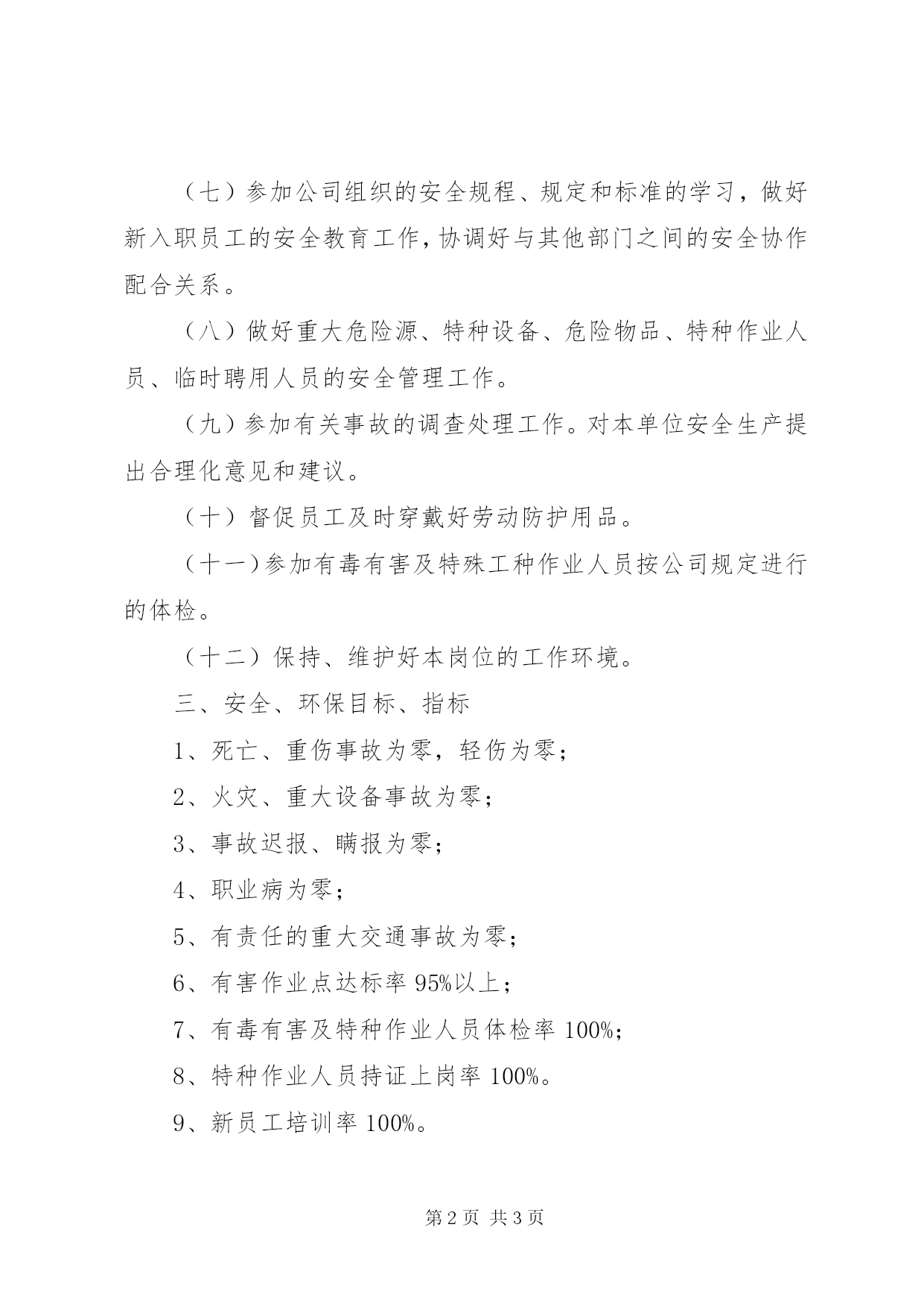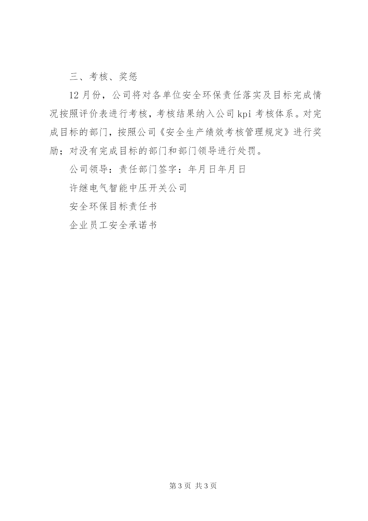 第PAGE\*Arabic\*MERGEFORMAT3页共NUMPAGES\*MERGEFORMAT3页安全环保责任书安全环保目标责任书责任部门:一、安全目标为贯彻“安全第一、预防为主、综合治理”的安全方针,切实抓好安全管理,落实安全生产责任,严格执行安全规章制度,提高全员安全生产意识,防止和杜绝事故及违章现象的发生,确保员工人身安全,特制订本责任书。二、安全、环保责任(一)按公司规定设置部门兼职安全员。(二)根据公司的年度安全、环保目标计划,层层落实安全环保责任,确保本部门安全环保目标的实现。(三)组织开展安全性评价或安全标准化工作,推行危险点分析和预控、标准化作业,切实落实各项现场安全措施。(四)组织或参加制定重要或大型检修(施工、操作)项目安全组织技术措施,并对措施的正确性、完备性承担相应的责任。(五)每月定期召开安全分析会,组织开展班前会、班后会、班组每周安全日活动。(六)参加公司组织的安全检查,检查指导安全生产工作,严肃查处违章违纪行为,对查出的隐患及时整改。(七)参加公司组织的安全规程、规定和标准的学习,做好新入职员工的安全教育工作,协调好与其他部门之间的安全协作配合关系。(八)做好重大危险源、特种设备、危险物品、特种作业人员、临时聘用人员的安全管理工作。(九)参加有关事故的调查处理工作。对本单位安全生产提出合理化意见和建议。(十)督促员工及时穿戴好劳动防护用品。(十一)参加有毒有害及特殊工种作业人员按公司规定进行的体检。(十二)保持、维护好本岗位的工作环境。三、安全、环保目标、指标1、死亡、重伤事故为零,轻伤为零;2、火灾、重大设备事故为零;3、事故迟报、瞒报为零;4、职业病为零;5、有责任的重大交通事故为零;6、有害作业点达标率95%以上;7、有毒有害及特种作业人员体检率100%;8、特种作业人员持证上岗率100%。9、新员工培训率100%。三、考核、奖惩12月份,公司将对各单位安全环保责任落实及目标完成情况按照评价表进行考核,考核结果纳入公司kpi考核体系。对完成目标的部门,按照公司《安全生产绩效考核管理规定》进行奖励;对没有完成目标的部门和部门领导进行处罚。公司领导:责任部门签字:年月日年月日许继电气智能中压开关公司安全环保目标责任书企业员工安全承诺书