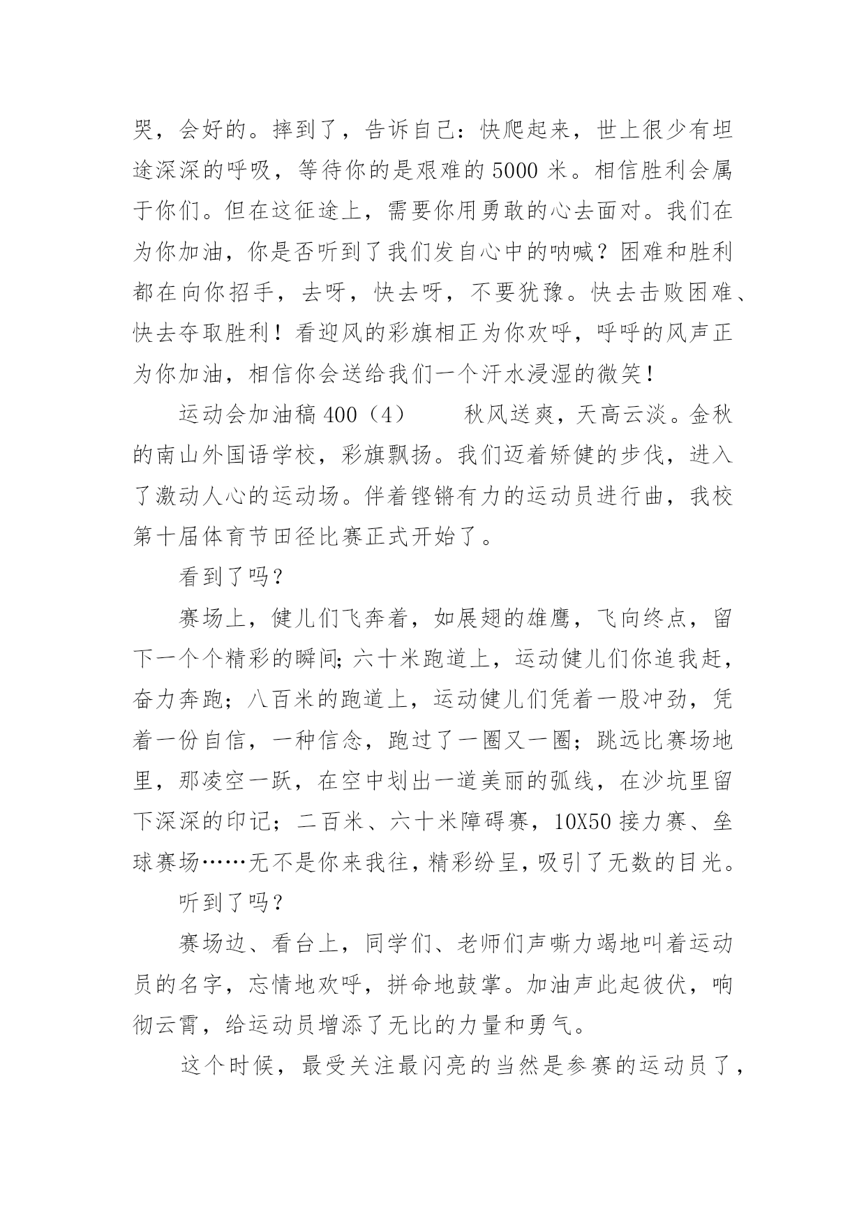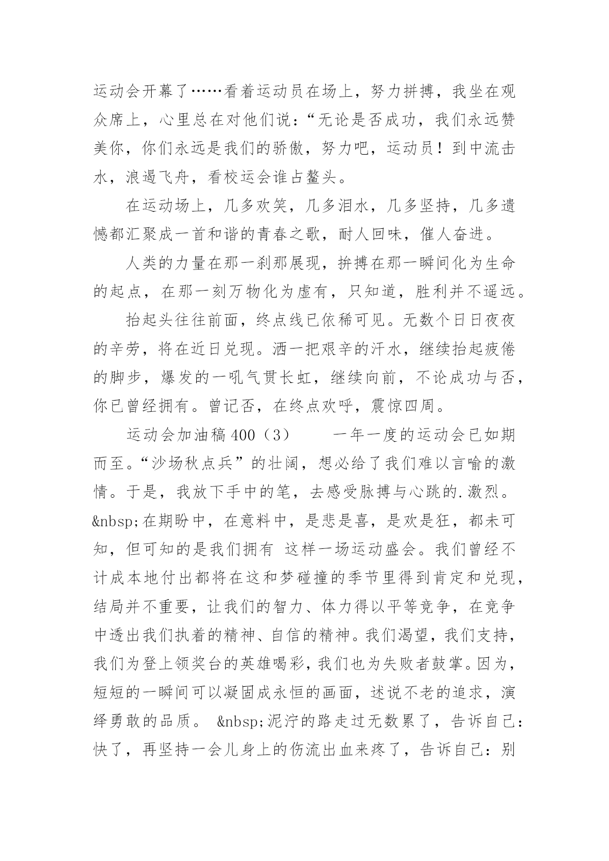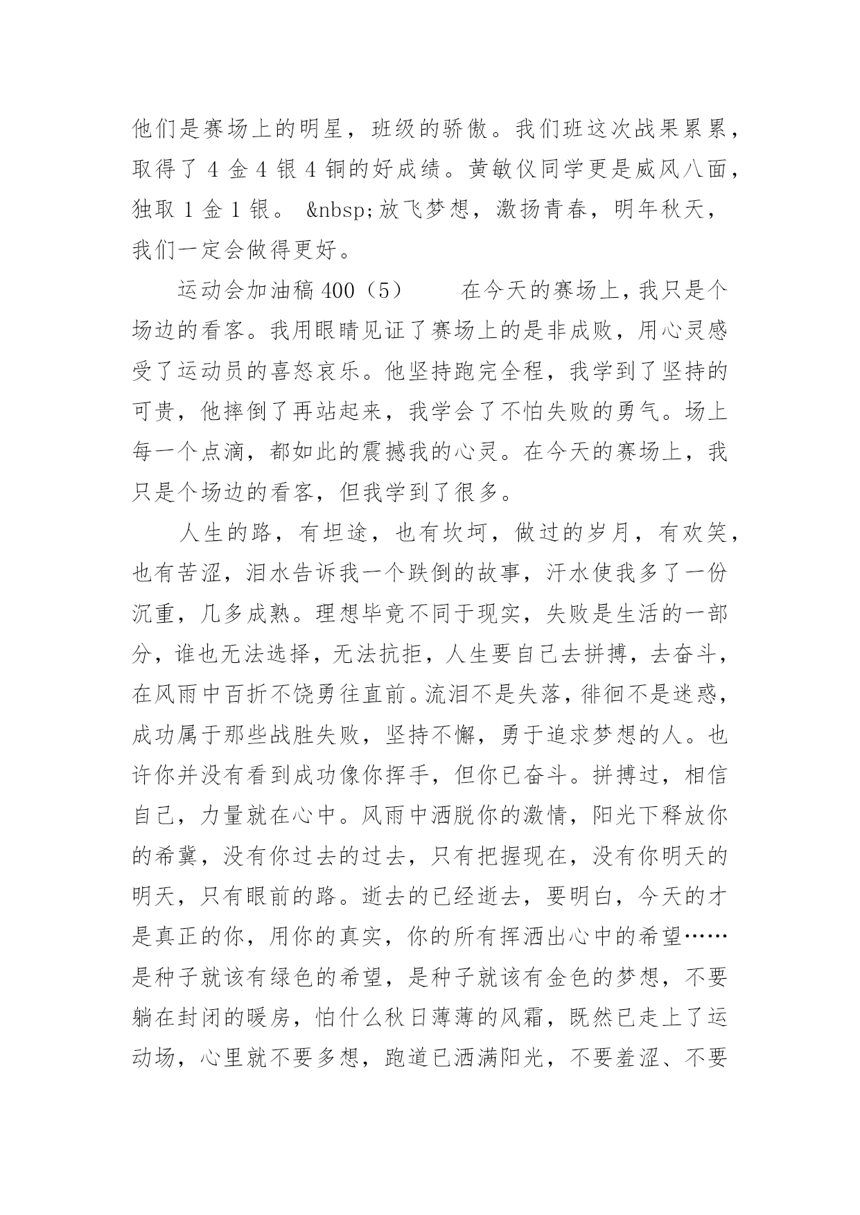 运动会广播稿「」运动会广播稿400字「精选」运动会是激动人心的,关于运动会的广播稿也是有很多的,以下就是小编分享运动会广播稿400字,我们一起来阅读!运动会加油稿400(1)生活中,我们每天都在尝试中,我们走向成功品味失败,走过心灵的阴雨晴空运动员们,不要放弃尝试无论失败与否重的是你勇于参与的精神,付出的背后是胜利无论是否成功,我们永远赞美你,你们永远是我们的骄傲,秋风羽,天气淡淡的转凉。然而这人的秋在今天更加迷人,不是因为它的秋高气爽,也不是因为它的明媚阳光,是因为今天的人儿倍加精神气爽。看!运动场上那一幕幕,一股股,无论是哭是笑,市喜是悲,其中都融入了他们的汗水、辛劳。他们是真正的矫健者,是运动场上的骄儿,更是我们心中的英雄。加油吧!英雄们!35每一份辛劳都有一份收获,每一次的痛苦都是快乐的开始,没一声呐喊都是力量的呼唤。我们有着大浪拍岸的豪迈,所以你不必在乎小荷初露的恬静,我们有着春日的阳光明媚,所以不用去羡慕冬日乱玉碎琼,我们是雨天的一把伞,是寒冷冬日里的一盆碳火,温暖的不只是你我,而是大家的心。运动场上的健儿,掌声属于你们,鲜花属于你们,成功也是属于你们的!运动会加油稿400(2)今天就是X中学第X届运动会开幕了……看着运动员在场上,努力拼搏,我坐在观众席上,心里总在对他们说:“无论是否成功,我们永远赞美你,你们永远是我们的骄傲,努力吧,运动员!到中流击水,浪遏飞舟,看校运会谁占鳌头。在运动场上,几多欢笑,几多泪水,几多坚持,几多遗憾都汇聚成一首和谐的青春之歌,耐人回味,催人奋进。人类的力量在那一刹那展现,拚搏在那一瞬间化为生命的起点,在那一刻万物化为虚有,只知道,胜利并不遥远。抬起头往往前面,终点线已依稀可见。无数个日日夜夜的辛劳,将在近日兑现。洒一把艰辛的汗水,继续抬起疲倦的脚步,爆发的一吼气贯长虹,继续向前,不论成功与否,你已曾经拥有。曾记否,在终点欢呼,震惊四周。运动会加油稿400(3)一年一度的运动会已如期而至。“沙场秋点兵”的壮阔,想必给了我们难以言喻的激情。于是,我放下手中的笔,去感受脉搏与心跳的.激烈。 在期盼中,在意料中,是悲是喜,是欢是狂,都未可知,但可知的是我们拥有这样一场运动盛会。我们曾经不计成本地付出都将在这和梦碰撞的季节里得到肯定和兑现,结局并不重要,让我们的智力、体力得以平等竞争,在竞争中透出我们执着的精神、自信的精神。我们渴望,我们支持,我们为登上领奖台的英雄喝彩,我们也为失败者鼓掌。因为,短短的一瞬间可以凝固成永恒的画面,述说不老的追求,演绎勇敢的品质。 泥泞的路走过无数累了,告诉自己:快了,再坚持一会儿身上的伤流出血来疼了,告诉自己:别哭,会好的。摔到了,告诉自己:快爬起来,世上很少有坦途深深的呼吸,等待你的是艰难的5000米。相信胜利会属于你们。但在这征途上,需要你用勇敢的心去面对。我们在为你加油,你是否听到了我们发自心中的呐喊?困难和胜利都在向你招手,去呀,快去呀,不要犹豫。快去击败困难、快去夺取胜利!看迎风的彩旗相正为你欢呼,呼呼的风声正为你加油,相信你会送给我们一个汗水浸湿的微笑!运动会加油稿400(4)秋风送爽,天高云淡。金秋的南山外国语学校,彩旗飘扬。我们迈着矫健的步伐,进入了激动人心的运动场。伴着铿锵有力的运动员进行曲,我校第十届体育节田径比赛正式开始了。看到了吗?赛场上,健儿们飞奔着,如展翅的雄鹰,飞向终点,留下一个个精彩的瞬间;六十米跑道上,运动健儿们你追我赶,奋力奔跑;八百米的跑道上,运动健儿们凭着一股冲劲,凭着一份自信,一种信念,跑过了一圈又一圈;跳远比赛场地里,那凌空一跃,在空中划出一道美丽的弧线,在沙坑里留下深深的印记;二百米、六十米障碍赛,10X50接力赛、垒球赛场……无不是你来我往,精彩纷呈,吸引了无数的目光。听到了吗?赛场边、看台上,同学们、老师们声嘶力竭地叫着运动员的名字,忘情地欢呼,拼命地鼓掌。加油声此起彼伏,响彻云霄,给运动员增添了无比的力量和勇气。这个时候,最受关注最闪亮的当然是参赛的运动员了,他们是赛场上的明星,班级的骄傲。我们班这次战果累累,取得了4金4银4铜的好成绩。黄敏仪同学更是威风八面,独取1金1银。 放飞梦想,激扬青春,明年秋天,我们一定会做得更好。运动会加油稿400(5)在今天的赛场上,我只是个场边的看客。我用眼睛见证了赛场上的是非成败,用心灵感受了运动员的喜怒哀乐。他坚持跑完全程,我学到了坚持的可贵,他摔倒了再站起来,我学会了不怕失败的勇气。场上每一个点滴,都如此的震撼我的心灵。在今天的赛场上,我只是个场边的看客,但我学到了很多。人生的路,有坦途,也有坎坷,做过的岁月,有欢笑,也有苦涩,泪水告诉我一个跌倒的故事,汗水使我多了一份沉重,几多成熟。理想毕竟不同于现实,失败是生活的一部分,谁也无法选