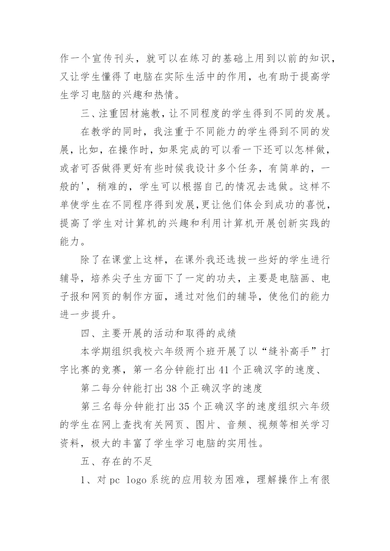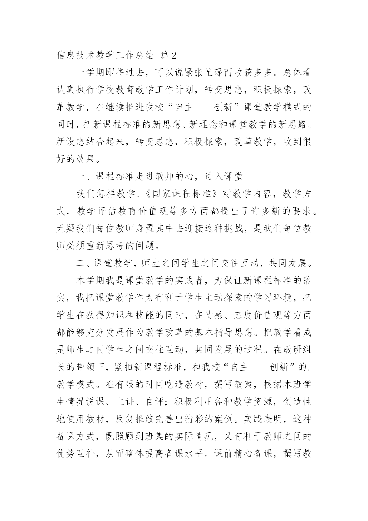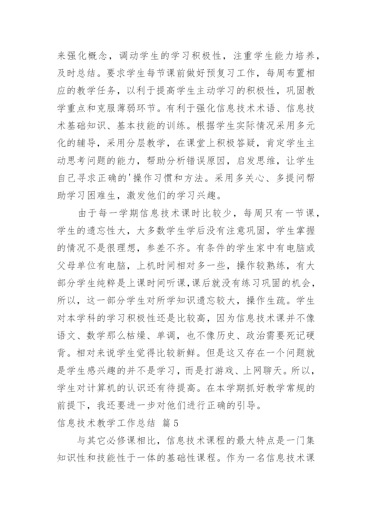 信息技术教学工作总结关于信息技术教学工作总结合集5篇总结是把一定阶段内的有关情况分析研究,做出有指导性结论的书面材料,它能使我们及时找出错误并改正,不如静下心来好好写写总结吧。我们该怎么去写总结呢?以下是小编收集整理的信息技术教学工作总结5篇,仅供参考,大家一起来看看吧。信息技术教学工作总结篇1本学期我担任的是信息技术教学工作,在教学上从各方面严格要求自己,积极向老教师请教,结合本校的实际条件和学生的实际情况,勤勤恳恳,兢兢业业,使教学工作有计划,有组织,有步骤地开展。立足现在,放眼未来,为使今后的工作取得更大的进步,现对本学期教学工作作出总结,希望能发扬优点,克服不足,总结经验教训,继往开来,以促进教育教学工作更上一层楼。一、认真备课不但备学生而且备教材备教法,根据教材内容及学生的实际,设计课的类型,拟定采用的教学方法,并对教学过程的程序及时间安排都作了详细的记录,认真写好教案。每一课都做到“有备而来”,每堂课都在课前做好充分的准备,并制作各种利于吸引学生注意力的有趣教具,课后及时对该课作出总结,写好教学反思,并认真按每课书的知识要点,归纳成集。二、增强上课技能提高教学质量,使讲解清晰化,条理化,生动化,做到线索清晰,层次分明,深入浅出。在课堂上特别注意调动学生的积极性,加强师生交流,充分体现学生的自主作用,让学生学得容易,学得轻松,学得愉快;注意精讲精练,在课堂上老师讲得尽量少,学生动口动手动脑尽量多;同时在每一堂课上都充分考虑每一个层次的学生学习需求和学习能力,让各个层次的学生都得到提高。三、虚心请教其他老师在教学上,有疑必问。在各个章节的学习上都积极征求其他老师的意见,学习他们的方法,同时,多听老师的.课,做到边听边讲,学习别人的优点,克服自己的不足,并常常邀请其他老师来听课,征求他们的意见,改进工作。四、积极推进素质教育目前的考试模式仍然比较传统,这决定了教师的教学模式要停留在应试教育的层次上,为此,我在教学工作中注意了学生能力的培养,把传受知识、技能和发展智力、能力结合起来,在知识层面上注入了思想情感教育的因素,发挥学生的创新意识和创新能力。让学生的各种素质都得到有效的发展和培养。存在的不足是:学生的知识结构还不是很完整,不系统,再加上学生们刚上初中,自律能力不是太好,所以在抓纪律方面下了不少功夫,相对来讲预先预备的教学内容的进行有一定的难度,这些都有待以后改进。信息技术教学工作总结篇2一学期即将过去,可以说紧张忙碌而收获多多。总体看认真执行学校教育教学工作计划,转变思想,积极探索,改革教学,在继续推进我校“自主——创新”课堂教学模式的同时,把新课程标准的新思想、新理念和课堂教学的新思路、新设想结合起来,转变思想,积极探索,改革教学,收到很好的效果。一、课程标准走进教师的心,进入课堂我们怎样教学,《国家课程标准》对教学内容,教学方式,教学评估教育价值观等多方面都提出了许多新的要求。无疑我们每位教师身置其中去迎接这种挑战,是我们每位教师必须重新思考的问题。二、课堂教学,师生之间学生之间交往互动,共同发展。本学期我是课堂教学的实践者,为保证新课程标准的落实,我把课堂教学作为有利于学生主动探索的学习环境,把学生在获得知识和技能的同时,在情感、态度价值观等方面都能够充分发展作为教学改革的基本指导思想。把教学看成是师生之间学生之间交往互动,共同发展的过程。在教研组长的带领下,紧扣新课程标准,和我校“自主——创新”的.教学模式。在有限的时间吃透教材,撰写教案,根据本班学生情况说课、主讲、自评;积极利用各种教学资源,创造性地使用教材,反复推敲完善出精彩的案例。实践表明,这种备课方式,既照顾到班集的实际情况,又有利于教师之间的优势互补,从而整体提高备课水平。课前精心备课,撰写教案,实施以后趁记忆犹新,回顾、反思写下自己执教时的切身体会或疏漏,记下学生学习中的闪光点或困惑,是教师最宝贵的第一手资料,教学经验的积累和教训的吸取,对今后改进课堂教学和提高教学水评是十分有用。课前准备不流于形式,变成一种实实在在的研究,课后的反思为以后的教学积累了许多有益的经验与启示。综合起来看教学活动兼顾到知识教育与人文教育的和谐统一,而这些都并非是一朝一夕就能完成的。需要不断学习、不断修炼,提高文化水平与做人境界,这将是一个长期而非常有价值的努力过程。我在总结成绩的同时,不断反思教学,以科研促课改,以创新求发展,不断地将公开课上的精华延伸运用于日常教学实践。努力处理好教学与现实生活的联系,努力处理好应用意识与解决问题的重要性,重视培养学生应用信息技术的意识和能力。重视培养学生的探究意识和创新能力。常思考,常研究,常总结,以科研促课改,以创新求发展,进一步转变教育观念,坚持“以人为本,促进学生全面发展,打好基础,培养学生创新能力”,以“自主——创新”