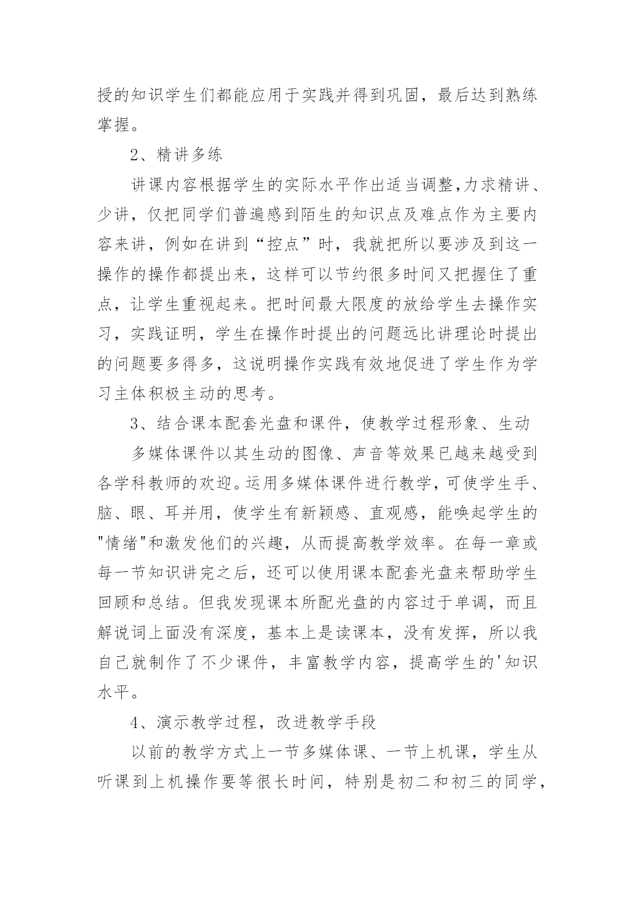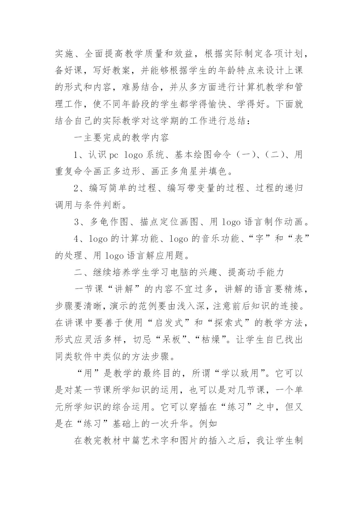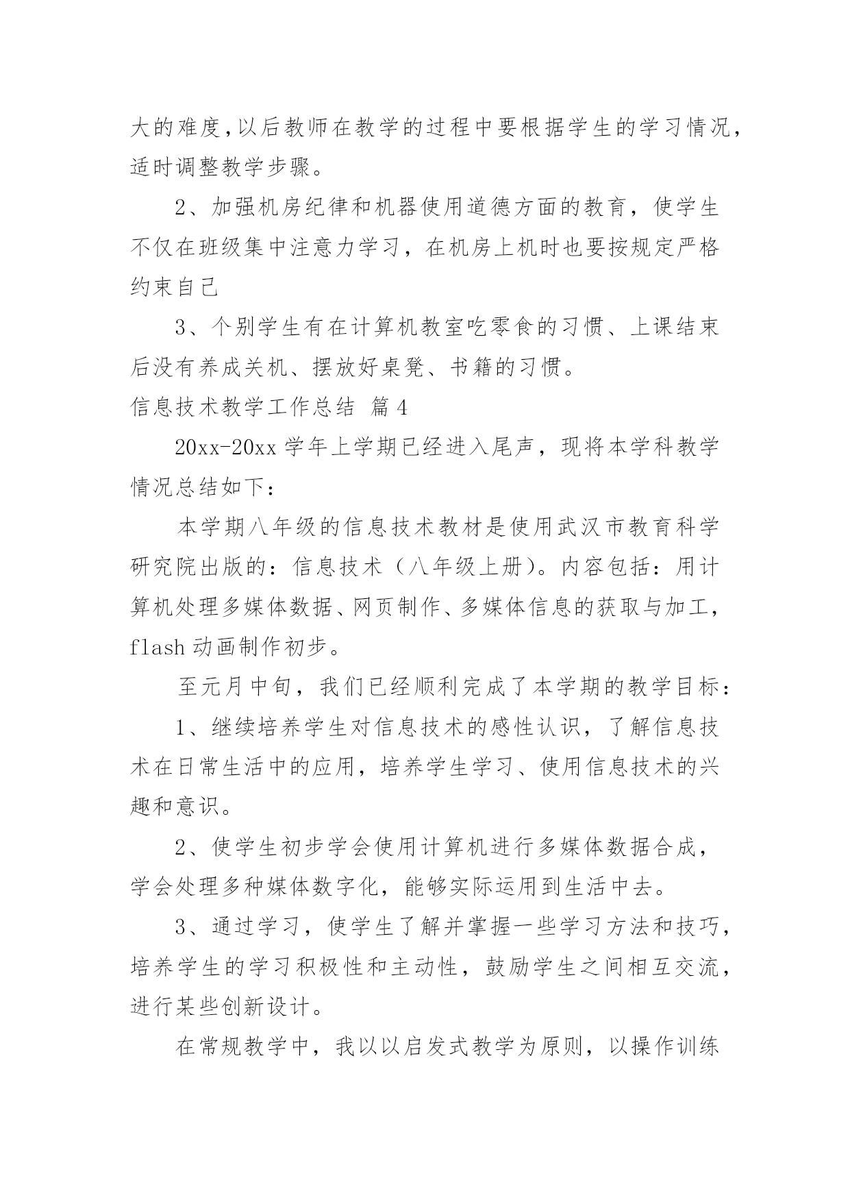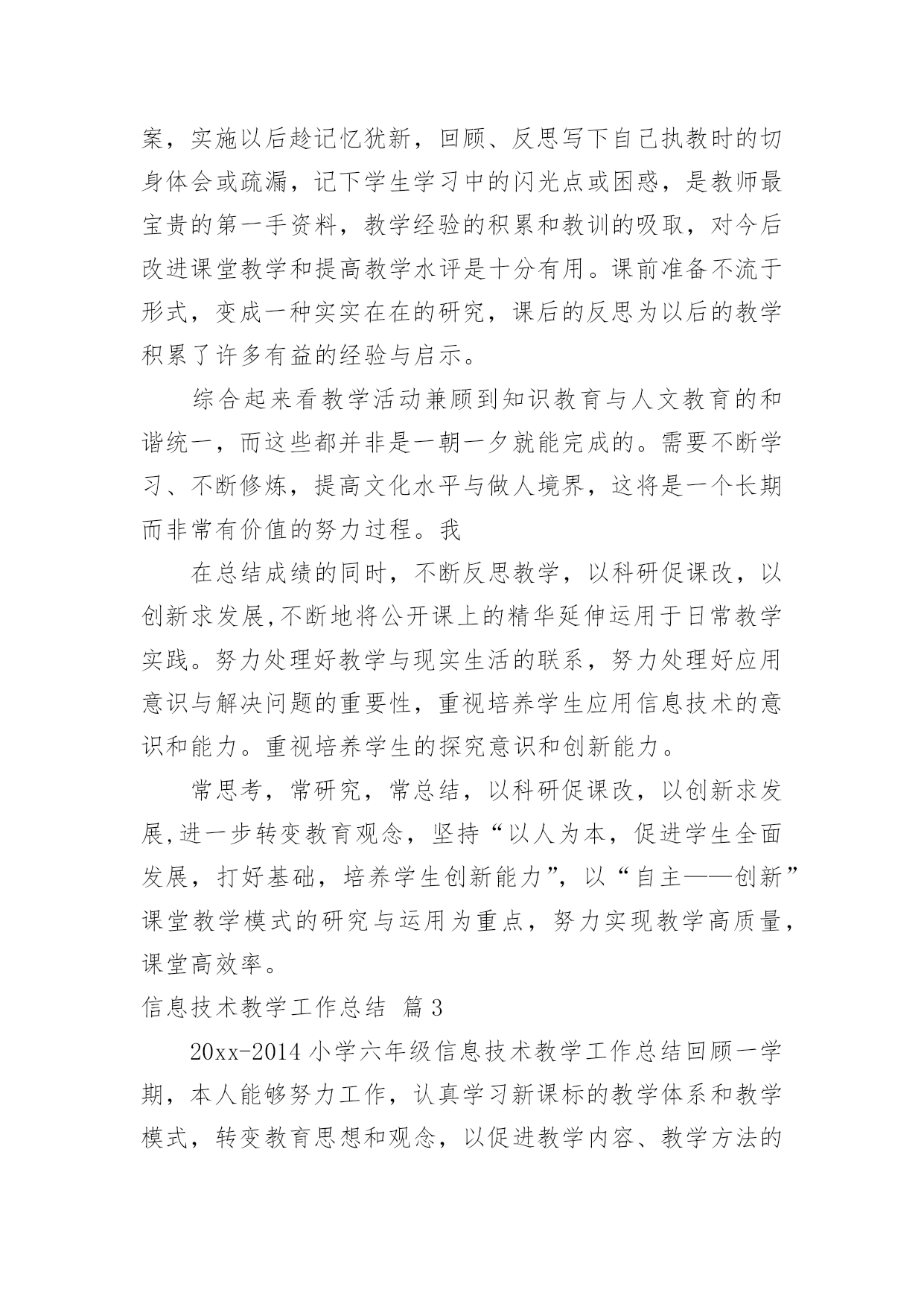 信息技术教学工作总结关于信息技术教学工作总结合集5篇总结是把一定阶段内的有关情况分析研究,做出有指导性结论的书面材料,它能使我们及时找出错误并改正,不如静下心来好好写写总结吧。我们该怎么去写总结呢?以下是小编收集整理的信息技术教学工作总结5篇,仅供参考,大家一起来看看吧。信息技术教学工作总结篇1本学期我担任的是信息技术教学工作,在教学上从各方面严格要求自己,积极向老教师请教,结合本校的实际条件和学生的实际情况,勤勤恳恳,兢兢业业,使教学工作有计划,有组织,有步骤地开展。立足现在,放眼未来,为使今后的工作取得更大的进步,现对本学期教学工作作出总结,希望能发扬优点,克服不足,总结经验教训,继往开来,以促进教育教学工作更上一层楼。一、认真备课不但备学生而且备教材备教法,根据教材内容及学生的实际,设计课的类型,拟定采用的教学方法,并对教学过程的程序及时间安排都作了详细的记录,认真写好教案。每一课都做到“有备而来”,每堂课都在课前做好充分的准备,并制作各种利于吸引学生注意力的有趣教具,课后及时对该课作出总结,写好教学反思,并认真按每课书的知识要点,归纳成集。二、增强上课技能提高教学质量,使讲解清晰化,条理化,生动化,做到线索清晰,层次分明,深入浅出。在课堂上特别注意调动学生的积极性,加强师生交流,充分体现学生的自主作用,让学生学得容易,学得轻松,学得愉快;注意精讲精练,在课堂上老师讲得尽量少,学生动口动手动脑尽量多;同时在每一堂课上都充分考虑每一个层次的学生学习需求和学习能力,让各个层次的学生都得到提高。三、虚心请教其他老师在教学上,有疑必问。在各个章节的学习上都积极征求其他老师的意见,学习他们的方法,同时,多听老师的.课,做到边听边讲,学习别人的优点,克服自己的不足,并常常邀请其他老师来听课,征求他们的意见,改进工作。四、积极推进素质教育目前的考试模式仍然比较传统,这决定了教师的教学模式要停留在应试教育的层次上,为此,我在教学工作中注意了学生能力的培养,把传受知识、技能和发展智力、能力结合起来,在知识层面上注入了思想情感教育的因素,发挥学生的创新意识和创新能力。让学生的各种素质都得到有效的发展和培养。存在的不足是:学生的知识结构还不是很完整,不系统,再加上学生们刚上初中,自律能力不是太好,所以在抓纪律方面下了不少功夫,相对来讲预先预备的教学内容的进行有一定的难度,这些都有待以后改进。信息技术教学工作总结篇2一学期即将过去,可以说紧张忙碌而收获多多。总体看认真执行学校教育教学工作计划,转变思想,积极探索,改革教学,在继续推进我校“自主——创新”课堂教学模式的同时,把新课程标准的新思想、新理念和课堂教学的新思路、新设想结合起来,转变思想,积极探索,改革教学,收到很好的效果。一、课程标准走进教师的心,进入课堂我们怎样教学,《国家课程标准》对教学内容,教学方式,教学评估教育价值观等多方面都提出了许多新的要求。无疑我们每位教师身置其中去迎接这种挑战,是我们每位教师必须重新思考的问题。二、课堂教学,师生之间学生之间交往互动,共同发展。本学期我是课堂教学的实践者,为保证新课程标准的落实,我把课堂教学作为有利于学生主动探索的学习环境,把学生在获得知识和技能的同时,在情感、态度价值观等方面都能够充分发展作为教学改革的基本指导思想。把教学看成是师生之间学生之间交往互动,共同发展的过程。在教研组长的带领下,紧扣新课程标准,和我校“自主——创新”的.教学模式。在有限的时间吃透教材,撰写教案,根据本班学生情况说课、主讲、自评;积极利用各种教学资源,创造性地使用教材,反复推敲完善出精彩的案例。实践表明,这种备课方式,既照顾到班集的实际情况,又有利于教师之间的优势互补,从而整体提高备课水平。课前精心备课,撰写教案,实施以后趁记忆犹新,回顾、反思写下自己执教时的切身体会或疏漏,记下学生学习中的闪光点或困惑,是教师最宝贵的第一手资料,教学经验的积累和教训的吸取,对今后改进课堂教学和提高教学水评是十分有用。课前准备不流于形式,变成一种实实在在的研究,课后的反思为以后的教学积累了许多有益的经验与启示。综合起来看教学活动兼顾到知识教育与人文教育的和谐统一,而这些都并非是一朝一夕就能完成的。需要不断学习、不断修炼,提高文化水平与做人境界,这将是一个长期而非常有价值的努力过程。我在总结成绩的同时,不断反思教学,以科研促课改,以创新求发展,不断地将公开课上的精华延伸运用于日常教学实践。努力处理好教学与现实生活的联系,努力处理好应用意识与解决问题的重要性,重视培养学生应用信息技术的意识和能力。重视培养学生的探究意识和创新能力。常思考,常研究,常总结,以科研促课改,以创新求发展,进一步转变教育观念,坚持“以人为本,促进学生全面发展,打好基础,培养学生创新能力”,以“自主——创新”