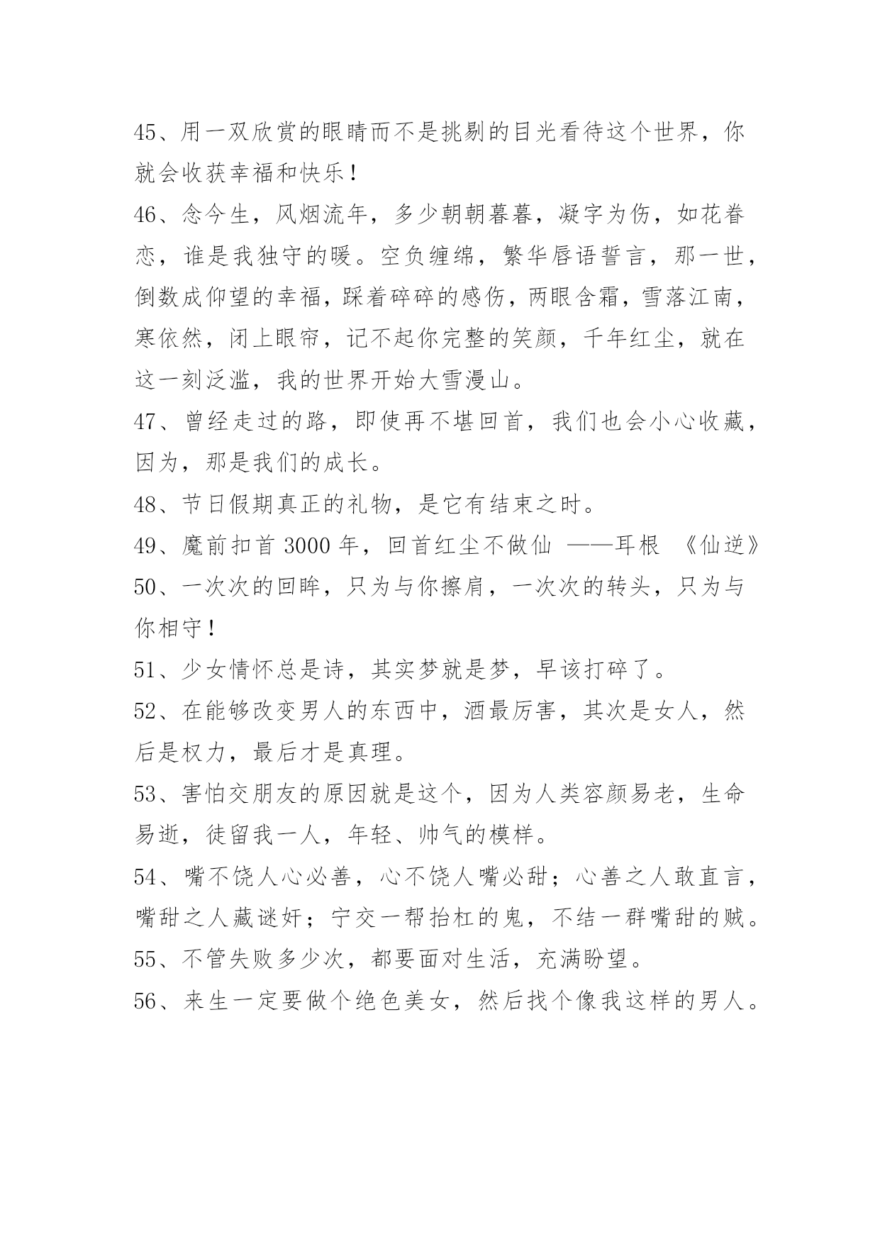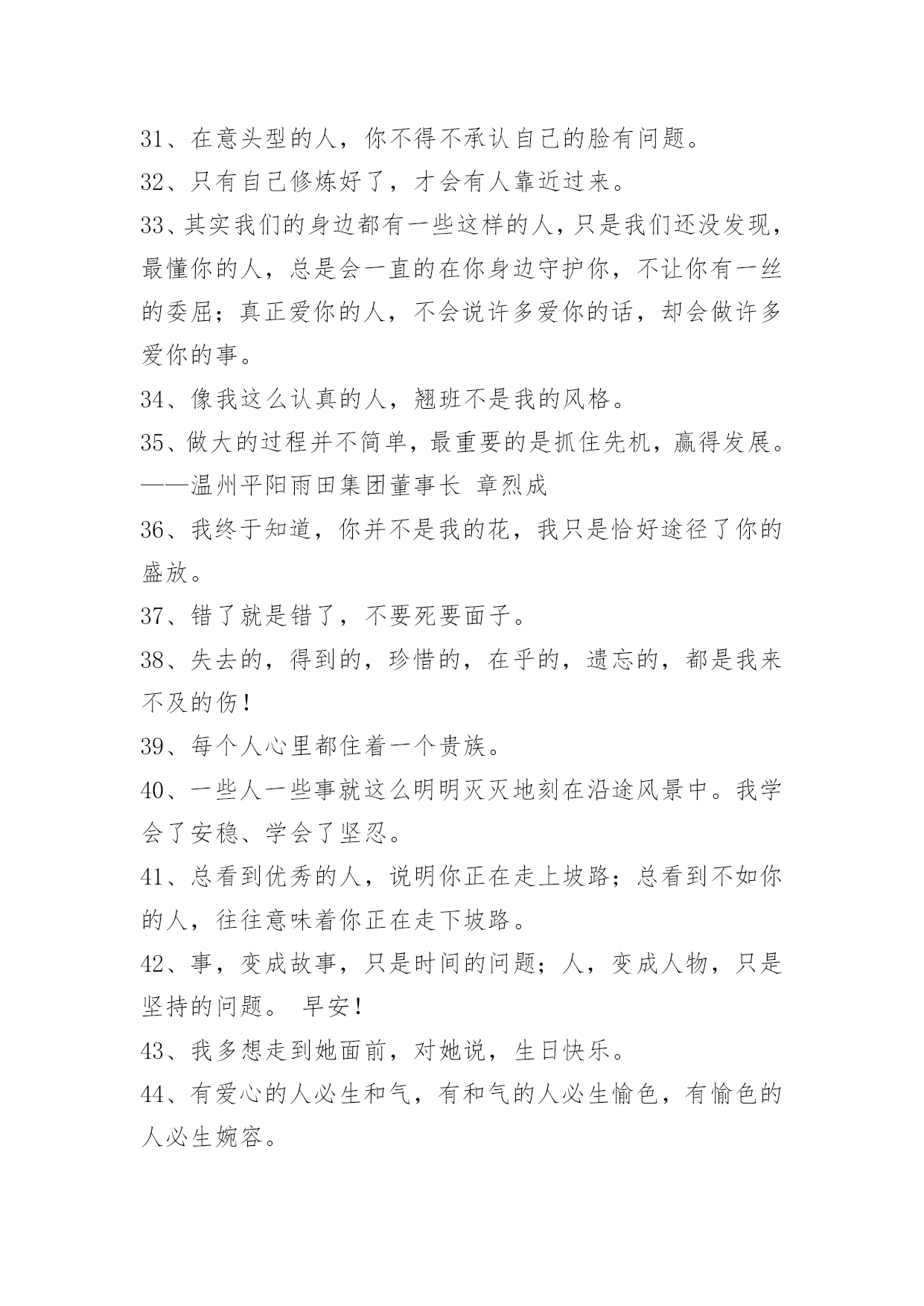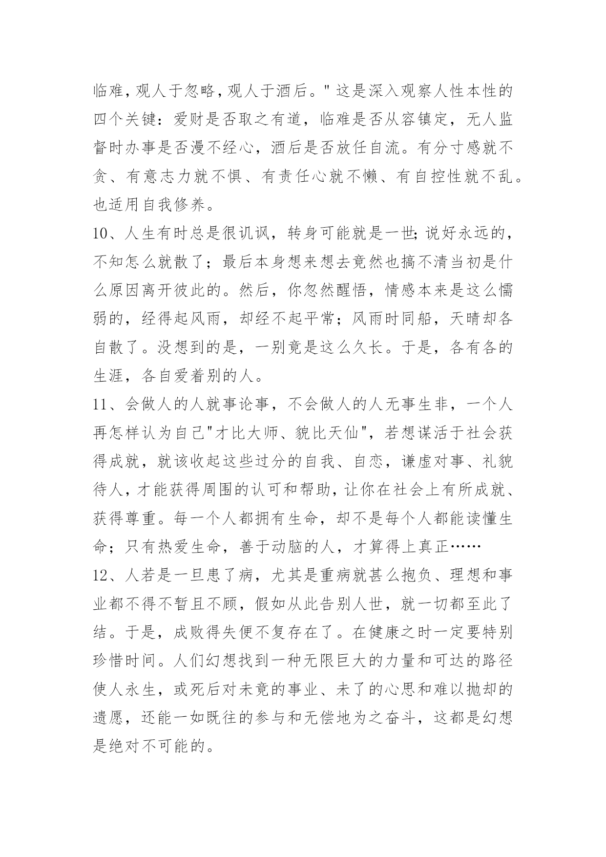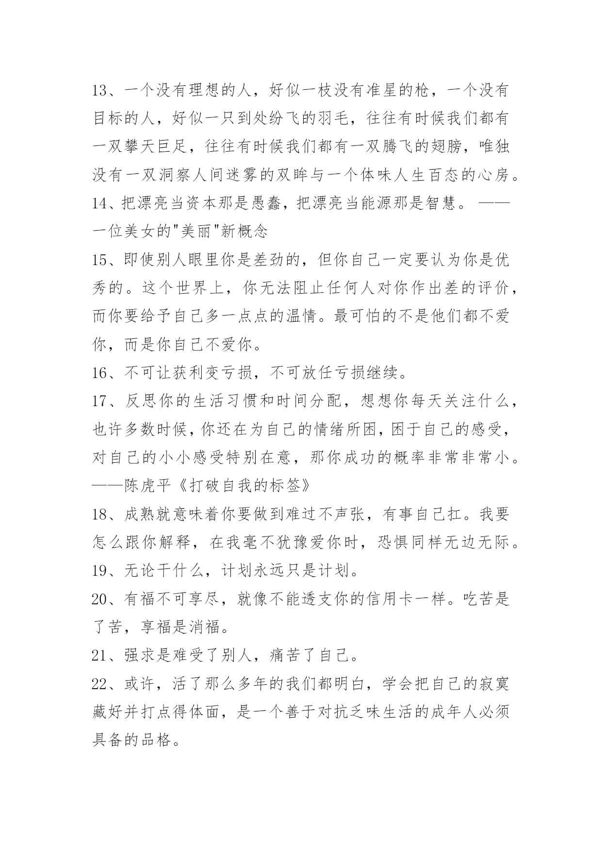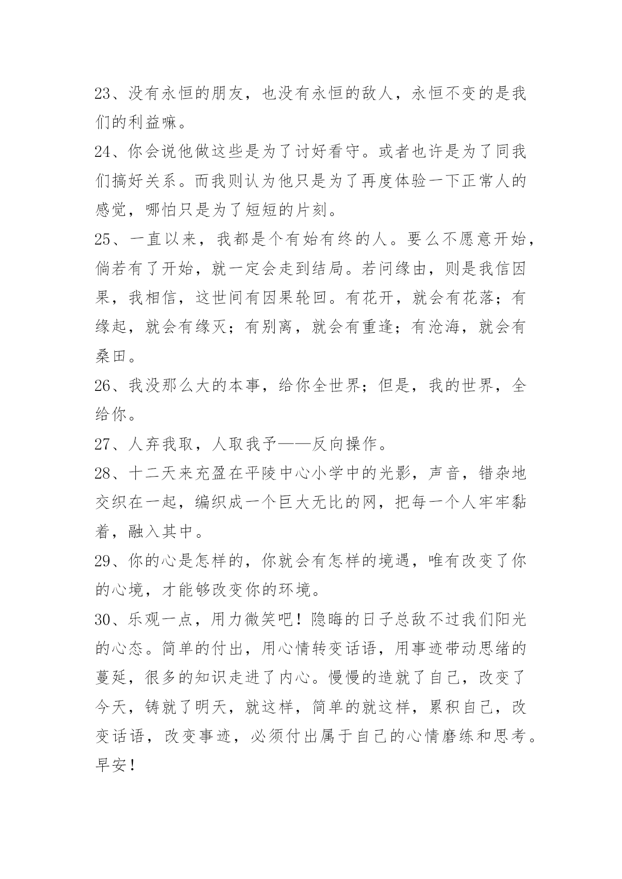 社会的语录56条2023年经典社会的语录锦集56条如果是上天选中的人,他们自然会跟上来。如果是拖后腿的,他们死有余辜!下面是小编收集整理的社会的语录56条,欢迎阅读,希望能够对大家有所帮助。1、别到处嚷嚷这个世界抛弃了你,其实世界原本就不属于你。2、也就是说,他有今天也是因为我。3、过分期待是所有心痛的根源。4、啥叫白领?今天发了薪水,还了贷款,交了房租、水电煤气费,买了油、米和泡面,摸摸口袋剩下的钱,感叹一声:这月工资又白领了。啥叫蓝领?工头说快到发工资的时间了,一算自己的住宿费,伙食费,误工费,医药费,还欠老板100多,也就懒得去领了,叫蓝领。5、如果一个一直对你不好的人偶尔对你好一次,你会无比感动;如果一个一直对你好的人偶尔对你不好一次,你就会无比愤怒。6、别再给自己找借口了,你就是想走捷径,你就是想不劳而获。7、繁芜之中,留住本真,以一颗安静的心,去看待人生的聚散离合。8、记得在醒来的时候微笑。9、古人有"四观"来看人是否可交:"观人于临财,观人于临难,观人于忽略,观人于酒后。"这是深入观察人性本性的四个关键:爱财是否取之有道,临难是否从容镇定,无人监督时办事是否漫不经心,酒后是否放任自流。有分寸感就不贪、有意志力就不惧、有责任心就不懒、有自控性就不乱。也适用自我修养。10、人生有时总是很讥讽,转身可能就是一世;说好永远的,不知怎么就散了;最后本身想来想去竟然也搞不清当初是什么原因离开彼此的。然后,你忽然醒悟,情感本来是这么懦弱的,经得起风雨,却经不起平常;风雨时同船,天晴却各自散了。没想到的是,一别竟是这么久长。于是,各有各的生涯,各自爱着别的人。11、会做人的人就事论事,不会做人的人无事生非,一个人再怎样认为自己"才比大师、貌比天仙",若想谋活于社会获得成就,就该收起这些过分的自我、自恋,谦虚对事、礼貌待人,才能获得周围的认可和帮助,让你在社会上有所成就、获得尊重。每一个人都拥有生命,却不是每个人都能读懂生命;只有热爱生命,善于动脑的人,才算得上真正……12、人若是一旦患了病,尤其是重病就甚么抱负、理想和事业都不得不暂且不顾,假如从此告别人世,就一切都至此了结。于是,成败得失便不复存在了。在健康之时一定要特别珍惜时间。人们幻想找到一种无限巨大的力量和可达的路径使人永生,或死后对未竟的事业、未了的心思和难以抛却的遗愿,还能一如既往的参与和无偿地为之奋斗,这都是幻想是绝对不可能的。13、一个没有理想的人,好似一枝没有准星的枪,一个没有目标的人,好似一只到处纷飞的羽毛,往往有时候我们都有一双攀天巨足,往往有时候我们都有一双腾飞的翅膀,唯独没有一双洞察人间迷雾的双眸与一个体味人生百态的心房。14、把漂亮当资本那是愚蠢,把漂亮当能源那是智慧。——一位美女的"美丽"新概念15、即使别人眼里你是差劲的,但你自己一定要认为你是优秀的。这个世界上,你无法阻止任何人对你作出差的评价,而你要给予自己多一点点的温情。最可怕的不是他们都不爱你,而是你自己不爱你。16、不可让获利变亏损,不可放任亏损继续。17、反思你的生活习惯和时间分配,想想你每天关注什么,也许多数时候,你还在为自己的情绪所困,困于自己的感受,对自己的小小感受特别在意,那你成功的概率非常非常小。——陈虎平《打破自我的标签》18、成熟就意味着你要做到难过不声张,有事自己扛。我要怎么跟你解释,在我毫不犹豫爱你时,恐惧同样无边无际。19、无论干什么,计划永远只是计划。20、有福不可享尽,就像不能透支你的信用卡一样。吃苦是了苦,享福是消福。21、强求是难受了别人,痛苦了自己。22、或许,活了那么多年的我们都明白,学会把自己的寂寞藏好并打点得体面,是一个善于对抗乏味生活的成年人必须具备的品格。23、没有永恒的朋友,也没有永恒的敌人,永恒不变的是我们的利益嘛。24、你会说他做这些是为了讨好看守。或者也许是为了同我们搞好关系。而我则认为他只是为了再度体验一下正常人的感觉,哪怕只是为了短短的片刻。25、一直以来,我都是个有始有终的人。要么不愿意开始,倘若有了开始,就一定会走到结局。若问缘由,则是我信因果,我相信,这世间有因果轮回。有花开,就会有花落;有缘起,就会有缘灭;有别离,就会有重逢;有沧海,就会有桑田。26、我没那么大的本事,给你全世界;但是,我的世界,全给你。27、人弃我取,人取我予——反向操作。28、十二天来充盈在平陵中心小学中的光影,声音,错杂地交织在一起,编织成一个巨大无比的网,把每一个人牢牢黏着,融入其中。29、你的心是怎样的,你就会有怎样的境遇,唯有改变了你的心境,才能够改变你的环境。30、乐观一点,用力微笑吧!隐晦的日子总敌不过我们阳光的心态。简单的付出,用心情转变话语,用事迹带动思绪的蔓延,很多的知识走进了内心。慢慢的造就了自己,改变了今天,铸就了明天,就这样,简单