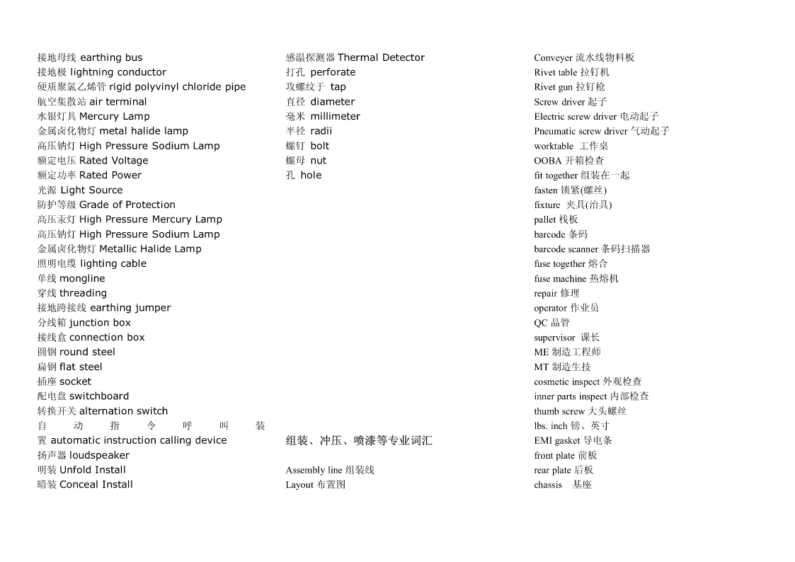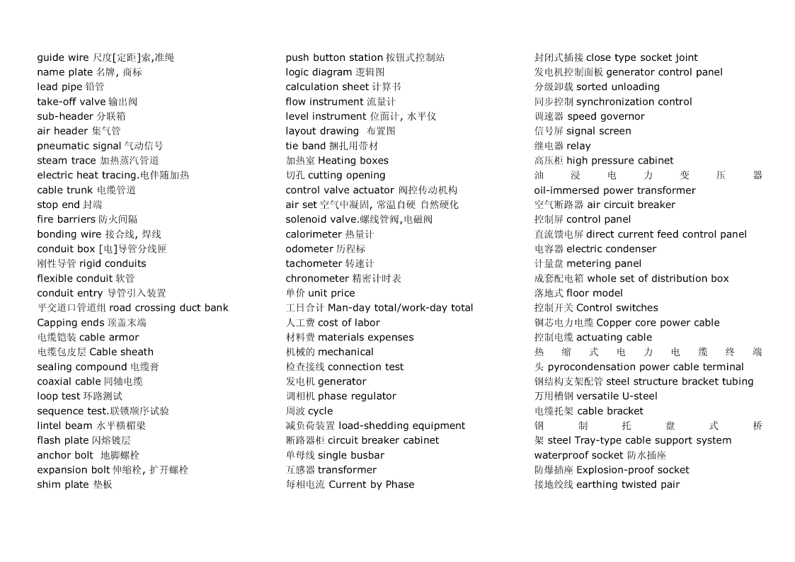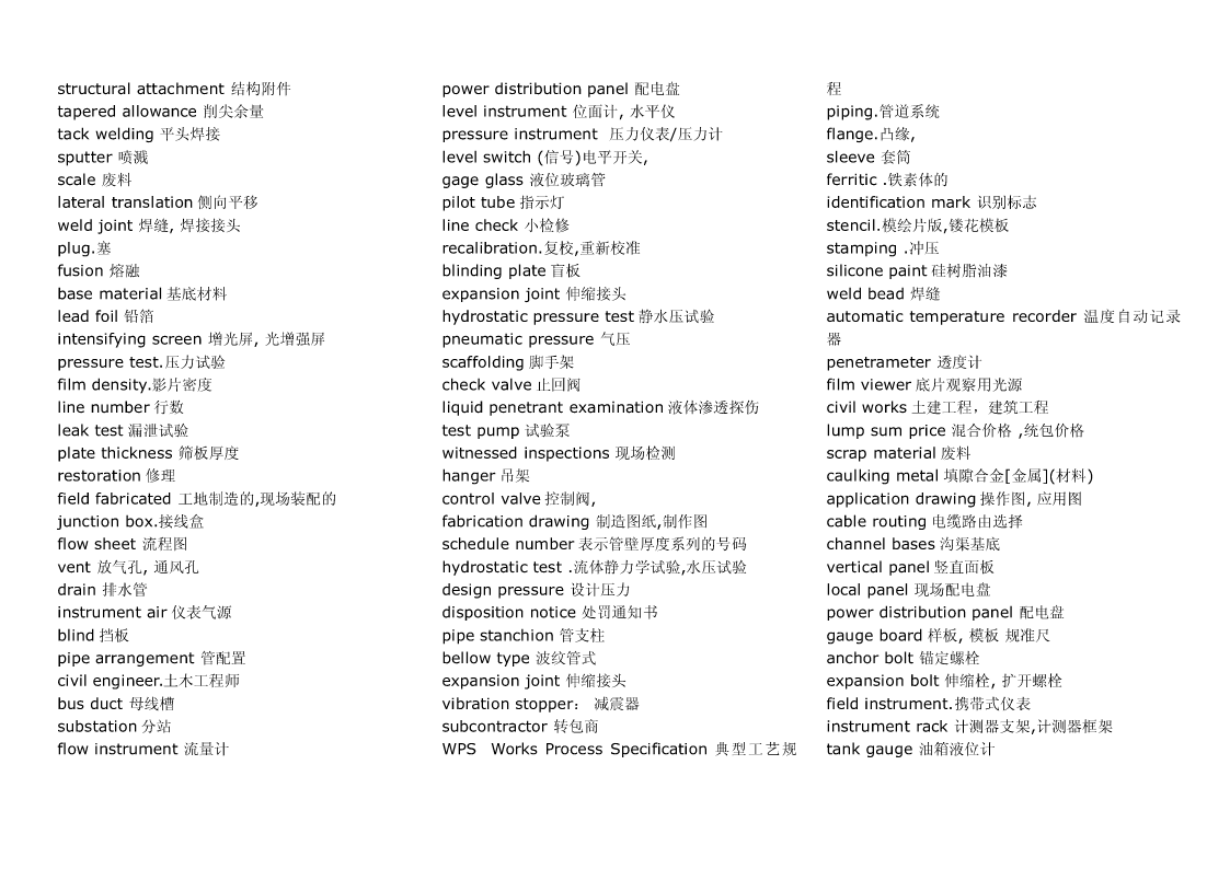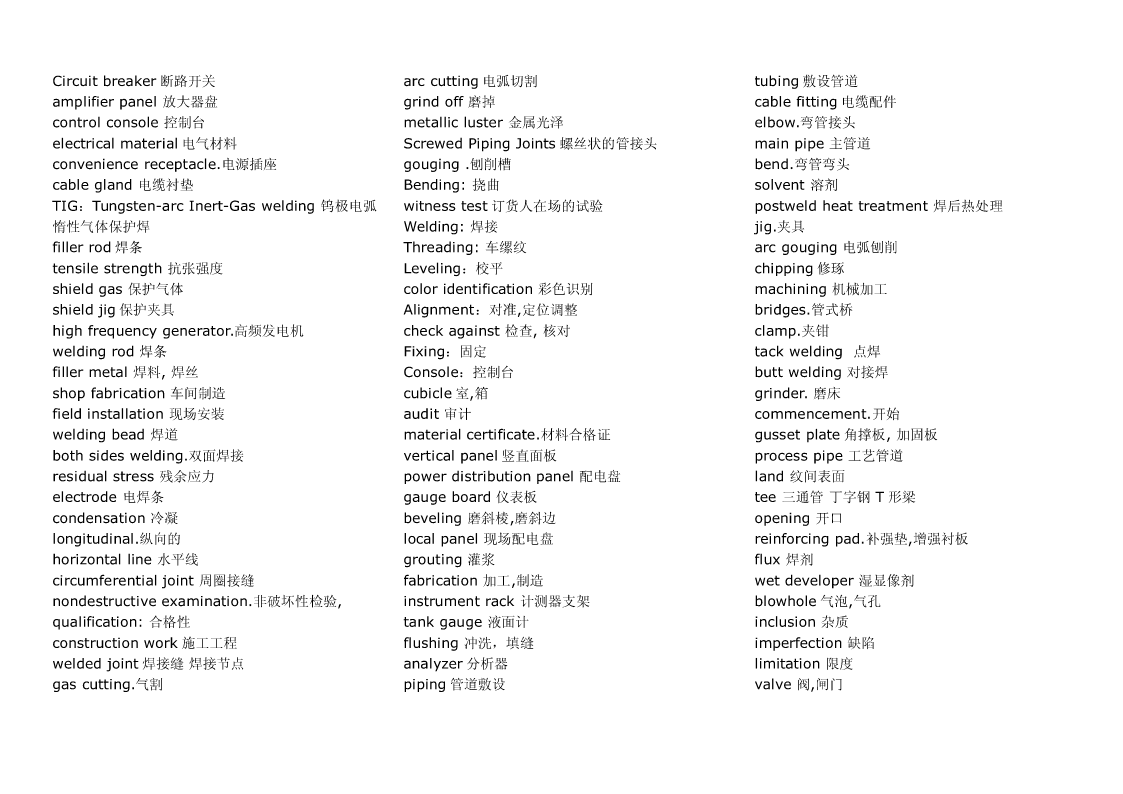 Pipingwork:铺管工程flangeconnection.凸缘联接magneticparticleexamination磁粉检验Steamtrace:加热蒸汽管道Hardhat:安全帽girthweld环形焊缝Cutting:切割Goggles:护目镜cementlinedpiping水泥衬里socketweld承插焊接stockpile贮存weldjoint焊缝,焊接接头filletweld角焊,填角焊packinglist装箱单spooldrawing管路图,管路详图branchconnection分支接续crate:柳条箱spottest抽查,当场测试fabricationtolerance.制造容差purchasedmateriallist原材料进货单buttweld对接焊缝localheattreatment局部热处理back-feed反馈RandomRadiography随机射线照相检查threadedpipe螺纹管wirecoil线盘,线卷,radiographicexamination射线照相检查sealwelding.密封焊接NPTthread.美国标准锥管螺纹assembly.装配flangejoint凸缘接头cablegland电缆衬垫erection架设undercut底切terminalblock线弧,接头排接线盒,接线板,线夹examination试验feeder馈电线powerdrill机械钻cabletray.电缆盘conduitoutlet电线引出口connector.接线器rigidsteelconduit钢制电线管sealfitting密封接头,密封配件insulatedsleeve绝缘套管powercontrol功率控制Screwthreadlubricant螺纹润滑剂wireconnector接线器arcwelding电弧焊Seal:绝缘层wireterminal电线接头controlcable控制电缆操纵索weldreinforcement焊缝补强controlwiring控制线路normalbend法向[法线]弯管lockwasher锁紧[止动,防松]垫圈motorlead电动机引出线cableglands:电缆衬垫electricalpanel.配电板,配电盘powerwiring电力布线exfoliation剥落nipple螺纹接头tenderdocument.提供证件powerreceptacle电力插座zincplated.镀锌的orificeplate.挡板groundingconductor接地导体ringjoint环接,围缘接合nut螺母lightingfixture照明器材bolt螺栓flangegasket法兰垫片junctionbox分线箱control:控制器dimensionalinspection尺寸检验raceway电缆管道NationalElectricalCode全国电气规程burnthrough烧蚀terminalbox接线盒masterschedule主要图表,综合图表,设计任务pipingsystem.管道系统distributionboard配电盘,配电屏书,主要作业表reinforcementofweld加强焊缝receptacle插座torquewrench转矩扳手fabrication.制造tumbleswitch.翻转开关,拨动式开关jobsite施工现场dyepenetrantexamination染料渗透试验法cathodicprotectionsystem阴极保护系统Circuitbreaker断路开关arccutting电弧切割tubing敷设管道amplifierpanel放大器盘grindoff磨掉cablefitting电缆配件controlconsole控制台metallicluster金属光泽elbow.弯管接头electricalmaterial电气材料ScrewedPipingJoints螺丝状的管接头mainpipe主管道conveniencereceptacle.电源插座gouging.刨削槽bend.弯管弯头cablegland电缆衬垫Bending:挠曲solvent溶剂TIG:Tungsten-arcInert-Gaswelding钨极电弧witnesstest订货人在场的试验postweldheattreatment焊后热处理惰性气体保护焊Welding:焊接jig.夹具fillerrod焊条Threading:车缧纹arcgouging电弧刨削tensilestrength抗张强度Leveling:校平chippi