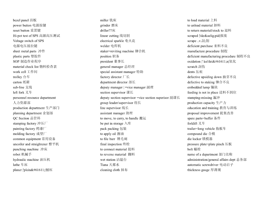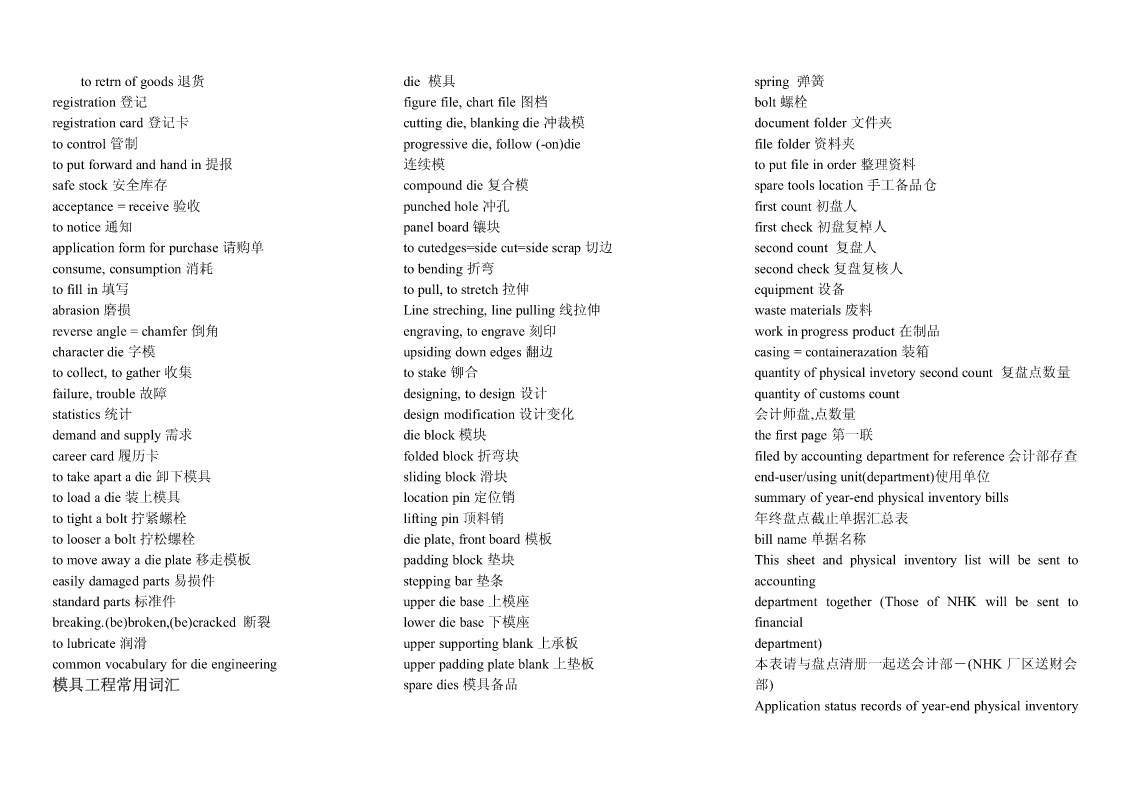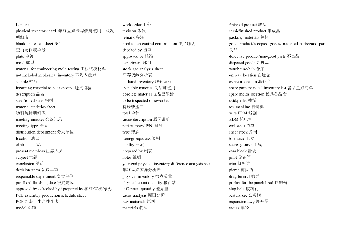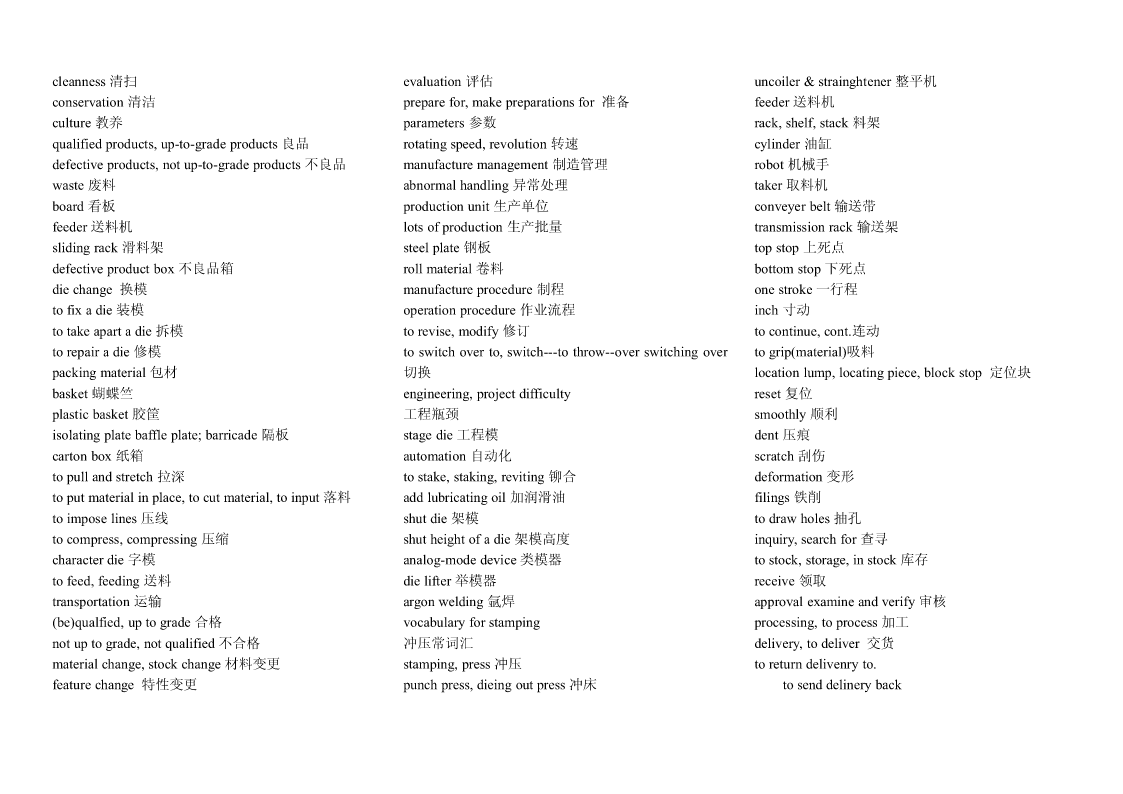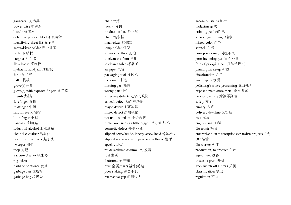 Pipingwork:铺管工程flangeconnection.凸缘联接magneticparticleexamination磁粉检验Steamtrace:加热蒸汽管道Hardhat:安全帽girthweld环形焊缝Cutting:切割Goggles:护目镜cementlinedpiping水泥衬里socketweld承插焊接stockpile贮存weldjoint焊缝,焊接接头filletweld角焊,填角焊packinglist装箱单spooldrawing管路图,管路详图branchconnection分支接续crate:柳条箱spottest抽查,当场测试fabricationtolerance.制造容差purchasedmateriallist原材料进货单buttweld对接焊缝localheattreatment局部热处理back-feed反馈RandomRadiography随机射线照相检查threadedpipe螺纹管wirecoil线盘,线卷,radiographicexamination射线照相检查sealwelding.密封焊接NPTthread.美国标准锥管螺纹assembly.装配flangejoint凸缘接头cablegland电缆衬垫erection架设undercut底切terminalblock线弧,接头排接线盒,接线板,线夹examination试验feeder馈电线powerdrill机械钻cabletray.电缆盘conduitoutlet电线引出口connector.接线器rigidsteelconduit钢制电线管sealfitting密封接头,密封配件insulatedsleeve绝缘套管powercontrol功率控制Screwthreadlubricant螺纹润滑剂wireconnector接线器arcwelding电弧焊Seal:绝缘层wireterminal电线接头controlcable控制电缆操纵索weldreinforcement焊缝补强controlwiring控制线路normalbend法向[法线]弯管lockwasher锁紧[止动,防松]垫圈motorlead电动机引出线cableglands:电缆衬垫electricalpanel.配电板,配电盘powerwiring电力布线exfoliation剥落nipple螺纹接头tenderdocument.提供证件powerreceptacle电力插座zincplated.镀锌的orificeplate.挡板groundingconductor接地导体ringjoint环接,围缘接合nut螺母lightingfixture照明器材bolt螺栓flangegasket法兰垫片junctionbox分线箱control:控制器dimensionalinspection尺寸检验raceway电缆管道NationalElectricalCode全国电气规程burnthrough烧蚀terminalbox接线盒masterschedule主要图表,综合图表,设计任务pipingsystem.管道系统distributionboard配电盘,配电屏书,主要作业表reinforcementofweld加强焊缝receptacle插座torquewrench转矩扳手fabrication.制造tumbleswitch.翻转开关,拨动式开关jobsite施工现场dyepenetrantexamination染料渗透试验法cathodicprotectionsystem阴极保护系统Circuitbreaker断路开关arccutting电弧切割tubing敷设管道amplifierpanel放大器盘grindoff磨掉cablefitting电缆配件controlconsole控制台metallicluster金属光泽elbow.弯管接头electricalmaterial电气材料ScrewedPipingJoints螺丝状的管接头mainpipe主管道conveniencereceptacle.电源插座gouging.刨削槽bend.弯管弯头cablegland电缆衬垫Bending:挠曲solvent溶剂TIG:Tungsten-arcInert-Gaswelding钨极电弧witnesstest订货人在场的试验postweldheattreatment焊后热处理惰性气体保护焊Welding:焊接jig.夹具fillerrod焊条Threading:车缧纹arcgouging电弧刨削tensilestrength抗张强度Leveling:校平chippi