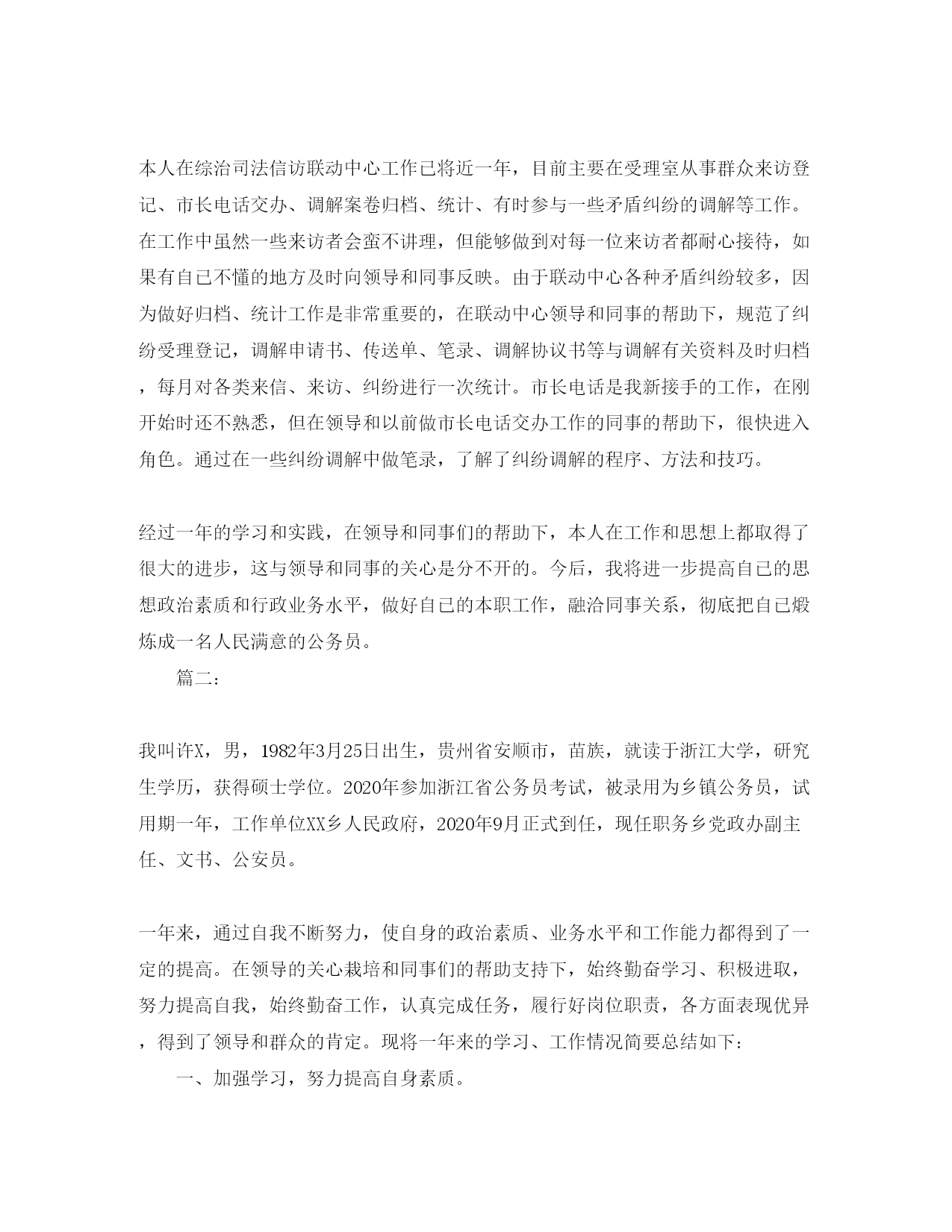 此资料由网络收集而来,如有侵权请告知上传者立即删除。资料共分享,我们负责传递知识。2020年乡镇公务员年终总结篇一:作为一名初任公务员,我于2020年XX月荣幸地来到XX乡镇工作。一年来,在各位领导的关心、支持、鼓励和各位同事的热情帮助下,我的思想认识和行政工作能力有了很大的进步,顺利地完成了从一名学生到一名公务员的角色转变。一、学习大量的政治理论知识。由于以前在学校学的是教育专业,因此对政治理论的学习相对较少,而现在作为一名公务员,具备良好的政治理论修养是必须的。XX乡镇有着浓厚的政治理论学习氛围,在这一年中,我在乡镇领导的带领下学习了“三个代表”重要思想,党的xx大、xx届四中全会精神,同时自学了《马克思主义哲学》、《毛泽东思想》。经过学习,我的政治理论修养有了很大的进步。二、积极学习业务知识,理论联系实际。由于以前没有从事过综治、司法和信访之类的工作,自身对法律、政策的了解还停留在比较表面的阶段,因此我努力学习相关法律、政策方面的东西,并报了市委党校的法律专业本科班。在工作中有不懂的地方虚心地向领导和同事请教,刚开始工作时还有点生疏,对于工作的一些程序并不了解,但在他们的帮助下使我对工作程序开始慢慢熟悉。去年10月份,在县委党校参加了为期一个月的初任公务员培训,使自已进一步了解公务员这一职业的特殊性,具备从事公务员这一职务所需的基本知识和基本技能。为更好地从事这一职业打下良好基础。今年初在某某法院民庭学习一周,通过旁听开庭,学会了做笔录的基本格式和方法。三、踏踏实实作好本职工作。本人在综治司法信访联动中心工作已将近一年,目前主要在受理室从事群众来访登记、市长电话交办、调解案卷归档、统计、有时参与一些矛盾纠纷的调解等工作。在工作中虽然一些来访者会蛮不讲理,但能够做到对每一位来访者都耐心接待,如果有自已不懂的地方及时向领导和同事反映。由于联动中心各种矛盾纠纷较多,因为做好归档、统计工作是非常重要的,在联动中心领导和同事的帮助下,规范了纠纷受理登记,调解申请书、传送单、笔录、调解协议书等与调解有关资料及时归档,每月对各类来信、来访、纠纷进行一次统计。市长电话是我新接手的工作,在刚开始时还不熟悉,但在领导和以前做市长电话交办工作的同事的帮助下,很快进入角色。通过在一些纠纷调解中做笔录,了解了纠纷调解的程序、方法和技巧。经过一年的学习和实践,在领导和同事们的帮助下,本人在工作和思想上都取得了很大的进步,这与领导和同事的关心是分不开的。今后,我将进一步提高自已的思想政治素质和行政业务水平,做好自已的本职工作,融洽同事关系,彻底把自已煅炼成一名人民满意的公务员。篇二:我叫许X,男,1982年3月25日出生,贵州省安顺市,苗族,就读于浙江大学,研究生学历,获得硕士学位。2020年参加浙江省公务员考试,被录用为乡镇公务员,试用期一年,工作单位XX乡人民政府,2020年9月正式到任,现任职务乡党政办副主任、文书、公安员。一年来,通过自我不断努力,使自身的政治素质、业务水平和工作能力都得到了一定的提高。在领导的关心栽培和同事们的帮助支持下,始终勤奋学习、积极进取,努力提高自我,始终勤奋工作,认真完成任务,履行好岗位职责,各方面表现优异,得到了领导和群众的肯定。现将一年来的学习、工作情况简要总结如下:一、加强学习,努力提高自身素质。根据工作需要,努力学习税收新政策,积极掌握写作工作技巧和技能,以使自己更加胜任本职工作。在加强专业知识学习的同时,自己还认真学习了党的xx大精神,通过学习,极大地丰富了自己的知识视野,拓宽了自己的知识领域。二、勤于动笔,增强文字功底和思维能力。为了提高自己的写作能力,我从研究已经成型的材料入手,细心揣摩,并请老同志和领导提出意见和建议。对于每月的工作小结和季度总结,我每次都及时督收,并对总结情况进行认真核稿,保证了文件准确、及时上报、发放。三、增强政治理论学习,不断提高政治素养。积极参加省局组织的党风廉政建设的学习,学习马克思主义哲学,邓小平理论,三个代表和省的第八次党代会精神,坚持以邓小平理论和“三个代表”重要思想为指导,全面落实科学发展观,深入学习贯彻党的xx大精神,进一步增强责任感、使命感。牢固树立共产主义理想信念,实践中正确认清职责权限,能够做到廉洁奉公,勤政为民,严格按党章要求,国家公务员法的标准来严格要求自己。坚信老老实实做人,踏踏实实做事,始终把人民群众的根本利益放在首位。四、增强业务学习,不断提高业务能力。深知我们不管是干哪一项工作如果不善于学习就要落后的道理,能将学习当成是自己必不可缺的任务,利用空闲时间在网上学习新知识新业务,坚持边工作边学习,做到在干中学在学中干,学习一些相关的法律法规知识和文件,注重《药品管理法》、《药品注册管理办法》、《行政许可法》
