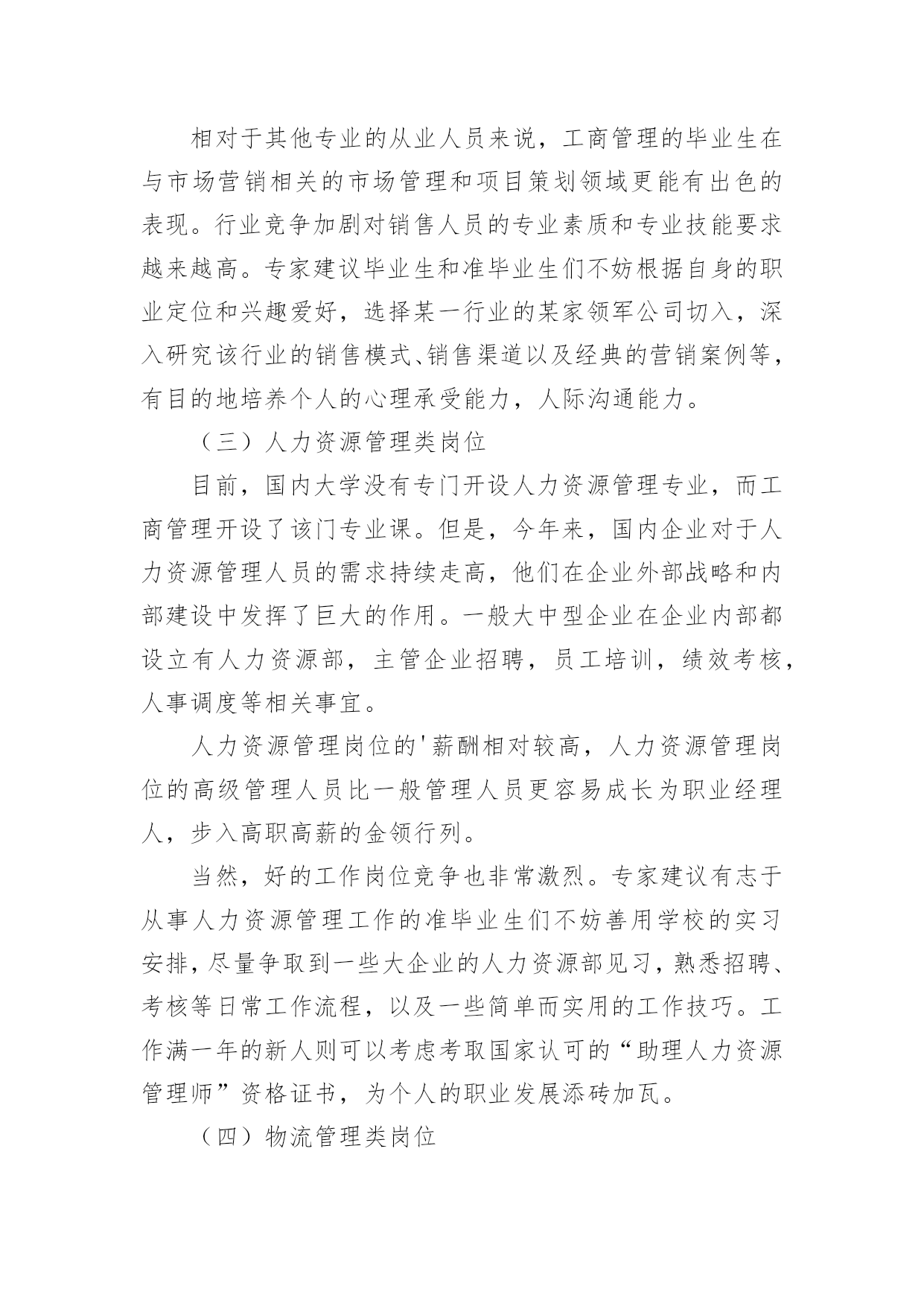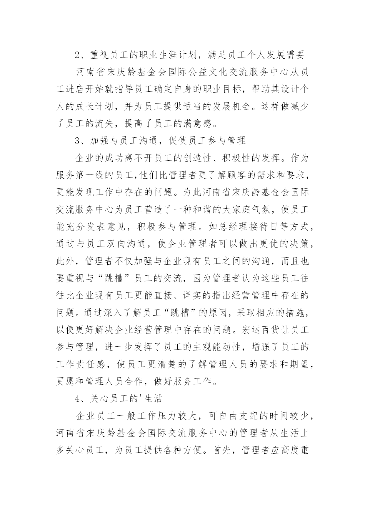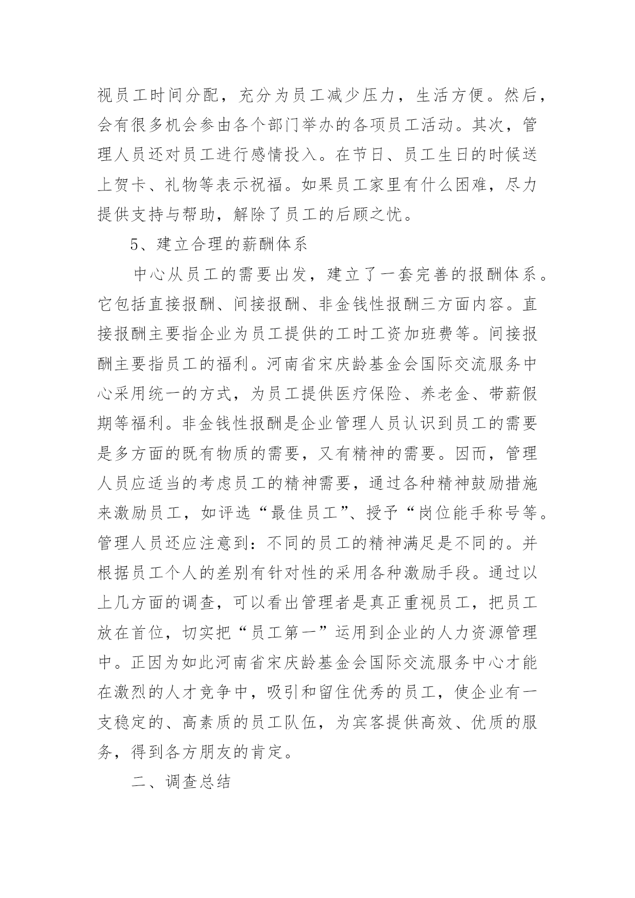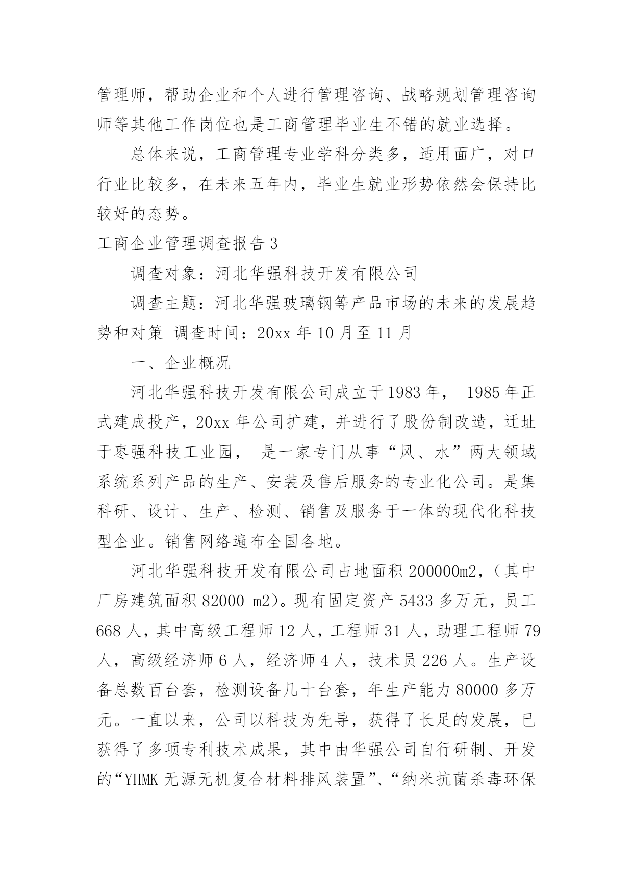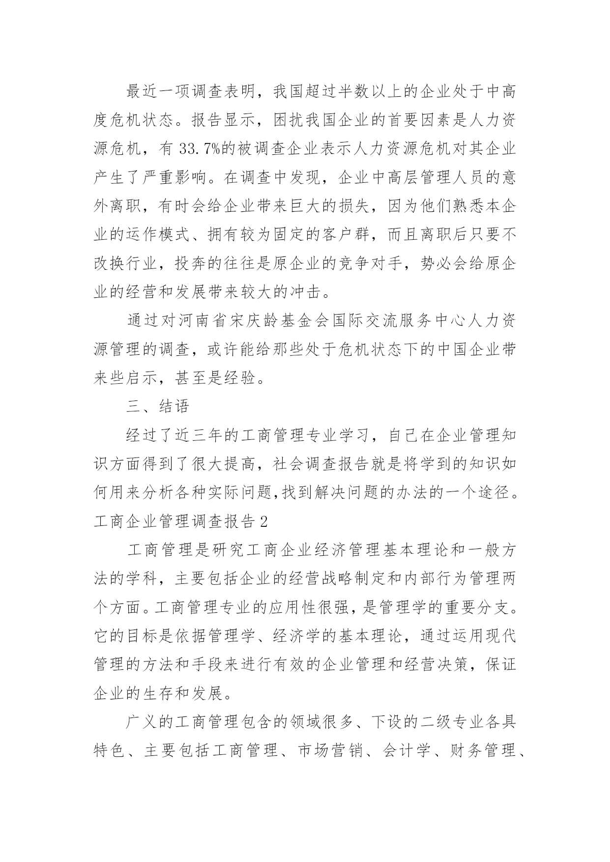 工商企业管理调查报告工商企业管理调查报告4篇在人们素养不断提高的今天,报告的适用范围越来越广泛,报告成为了一种新兴产业。相信很多朋友都对写报告感到非常苦恼吧,以下是小编为大家收集的工商企业管理调查报告,欢迎大家分享。工商企业管理调查报告1一、调查经过此次企业调查,我有计划的对企业的高层管理者,基层员工及人力资源部都进行了走访询问,并重点对工商管理的一个重要分支人力资源管理进行了总结和分析,得出了一下几点见解。1、员工的招聘和录用企业在员工的招聘和录用工作中将主动权掌握在自己手中,通过严格的面试、录用测验等。企业在招聘员工时也向求职者全面客观的介绍企业情况,企业所能为员工提供的培训、晋升、薪酬、福利等,使求职者能从这些信息中判断自己对所应聘的工作是否满意,是否能胜任其职。这一做法将有助于河南省宋庆龄基金会国际交流服务中心选择到更优秀的员工,也有助于员工坚定其在企业长期工作和奋斗的信心,增强企业的凝聚力。2、重视员工的职业生涯计划,满足员工个人发展需要河南省宋庆龄基金会国际公益文化交流服务中心从员工进店开始就指导员工确定自身的职业目标,帮助其设计个人的成长计划,并为员工提供适当的发展机会。这样做减少了员工的流失,提高了员工的满意感。3、加强与员工沟通,促使员工参与管理企业的成功离不开员工的创造性、积极性的发挥。作为服务第一线的员工,他们比管理者更了解顾客的需求和要求,更能发现工作中存在的问题。为此河南省宋庆龄基金会国际交流服务中心为员工营造了一种和谐的大家庭气氛,使员工能充分发表意见,积极参与管理。如总经理接待日等方式,通过与员工双向沟通,使企业管理者可以做出更优的决策,此外,管理者不仅加强与企业现有员工之间的沟通,而且也要重视与“跳槽”员工的交流,因为管理者认为这些员工往往比企业现有员工更能直接、详实的指出经营管理中存在的问题。通过深入了解员工“跳槽”的原因,采取相应的措施,以便更好解决企业经营管理中存在的问题。宏运百货让员工参与管理,进一步发挥了员工的主观能动性,增强了员工的工作责任感,使员工更清楚的了解管理人员的要求和期望,更愿和管理人员合作,做好服务工作。4、关心员工的'生活企业员工一般工作压力较大,可自由支配的时间较少,河南省宋庆龄基金会国际交流服务中心的管理者从生活上多关心员工,为员工提供各种方便。首先,管理者应高度重视员工时间分配,充分为员工减少压力,生活方便。然后,会有很多机会参由各个部门举办的各项员工活动。其次,管理人员还对员工进行感情投入。在节日、员工生日的时候送上贺卡、礼物等表示祝福。如果员工家里有什么困难,尽力提供支持与帮助,解除了员工的后顾之忧。5、建立合理的薪酬体系中心从员工的需要出发,建立了一套完善的报酬体系。它包括直接报酬、间接报酬、非金钱性报酬三方面内容。直接报酬主要指企业为员工提供的工时工资加班费等。间接报酬主要指员工的福利。河南省宋庆龄基金会国际交流服务中心采用统一的方式,为员工提供医疗保险、养老金、带薪假期等福利。非金钱性报酬是企业管理人员认识到员工的需要是多方面的既有物质的需要,又有精神的需要。因而,管理人员应适当的考虑员工的精神需要,通过各种精神鼓励措施来激励员工,如评选“最佳员工”、授予“岗位能手称号等。管理人员还应注意到:不同的员工的精神满足是不同的。并根据员工个人的差别有针对性的采用各种激励手段。通过以上几方面的调查,可以看出管理者是真正重视员工,把员工放在首位,切实把“员工第一”运用到企业的人力资源管理中。正因为如此河南省宋庆龄基金会国际交流服务中心才能在激烈的人才竞争中,吸引和留住优秀的员工,使企业有一支稳定的、高素质的员工队伍,为宾客提供高效、优质的服务,得到各方朋友的肯定。二、调查总结最近一项调查表明,我国超过半数以上的企业处于中高度危机状态。报告显示,困扰我国企业的首要因素是人力资源危机,有33.7%的被调查企业表示人力资源危机对其企业产生了严重影响。在调查中发现,企业中高层管理人员的意外离职,有时会给企业带来巨大的损失,因为他们熟悉本企业的运作模式、拥有较为固定的客户群,而且离职后只要不改换行业,投奔的往往是原企业的竞争对手,势必会给原企业的经营和发展带来较大的冲击。通过对河南省宋庆龄基金会国际交流服务中心人力资源管理的调查,或许能给那些处于危机状态下的中国企业带来些启示,甚至是经验。三、结语经过了近三年的工商管理专业学习,自己在企业管理知识方面得到了很大提高,社会调查报告就是将学到的知识如何用来分析各种实际问题,找到解决问题的办法的一个途径。工商企业管理调查报告2工商管理是研究工商企业经济管理基本理论和一般方法的学科,主要包括企业的经营战略制定和内部行为管理两个方面。工商管理专业的应用性很强,是管理学的重要分支。它的目标是依据管理学、经济学的基本理论,通过运用现代