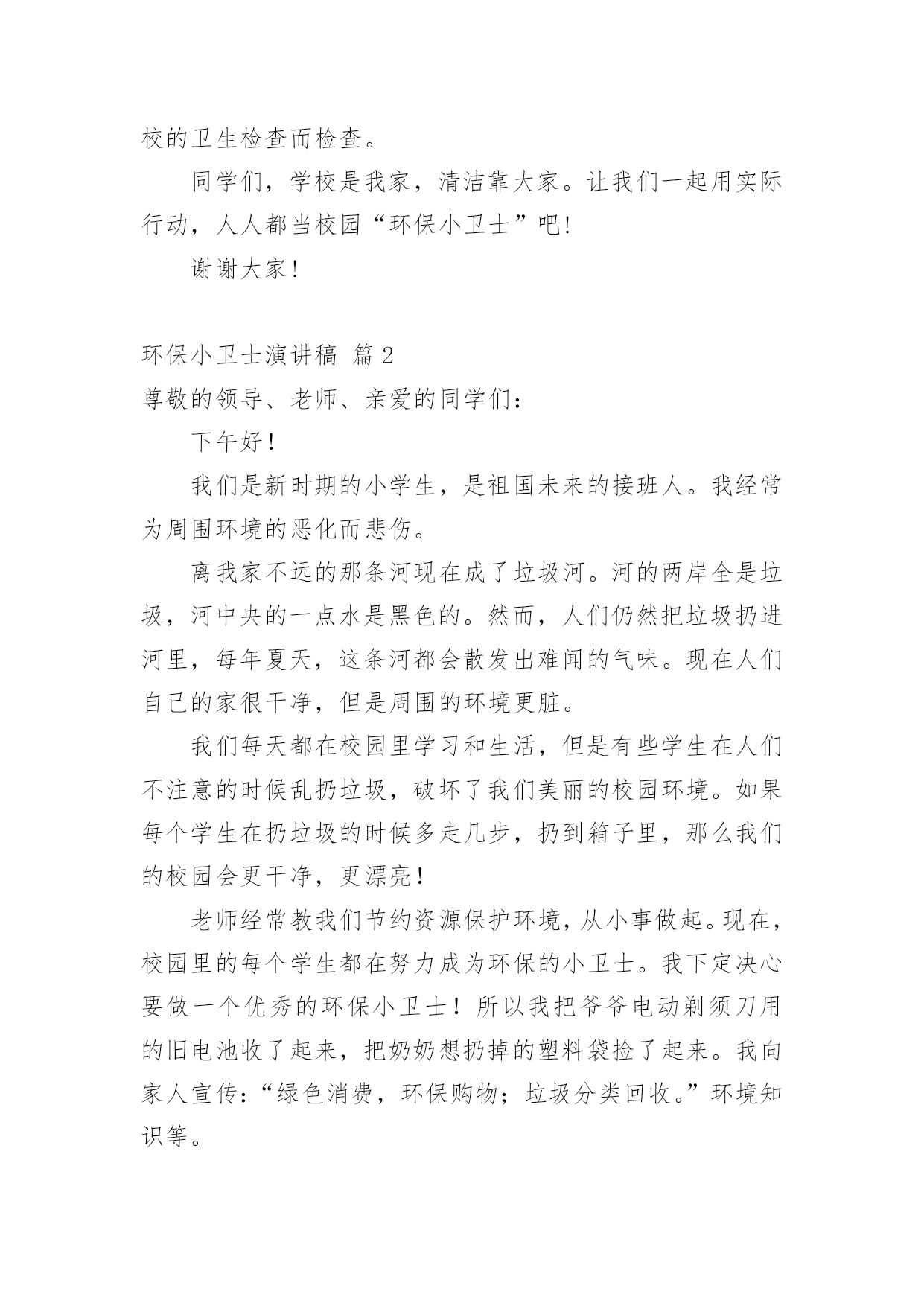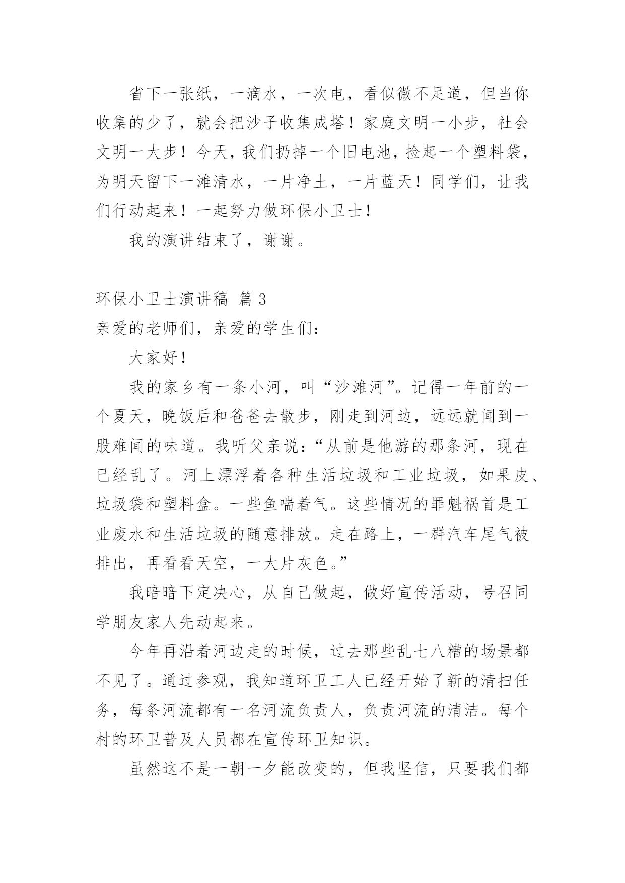 环保小卫士演讲稿【精华】环保小卫士演讲稿三篇演讲稿具有逻辑严密,态度明确,观点鲜明的特点。在不断进步的时代,演讲稿对我们的作用越来越大,相信很多朋友都对写演讲稿感到非常苦恼吧,下面是小编帮大家整理的环保小卫士演讲稿3篇,欢迎阅读,希望大家能够喜欢。环保小卫士演讲稿篇1敬爱的老师,亲爱的同学们:大家好!我是8号,李萧萧,来至龙安小学二年级一班。这次我能站在台上为大家演讲“环保卫士”,我感到非常高兴。在这里,我要感谢老师和同学对我的支持和信任。此时此刻,我兴奋的心情是无法用语言来表达的!当我置身于现在这美丽的校园时,看见有的同学随地吐痰、乱扔纸屑……我非常生气,非常难受。我生气的是个别同学不讲卫生,不讲文明;难受的是美丽的`校园被污染了。我决心做一名校园“环保小卫士”。记得有一次,我看见一位小同学随地乱扔纸屑时,便走过去,严肃地制止了他,让他把纸屑捡起来丢在垃圾桶里,这时,我的好朋友却认为我是多管闲事,可是做一个环保小卫士却在我心里扎了根。在我心目中,学校是我家,保持学校的环境清洁是我的责任和义务。心动不如行动,我做到了时时严格要求自己,处处保持学校环境的清洁,不为学校的卫生检查而检查。同学们,学校是我家,清洁靠大家。让我们一起用实际行动,人人都当校园“环保小卫士”吧!谢谢大家!环保小卫士演讲稿篇2尊敬的领导、老师、亲爱的同学们:下午好!我们是新时期的小学生,是祖国未来的接班人。我经常为周围环境的恶化而悲伤。离我家不远的那条河现在成了垃圾河。河的两岸全是垃圾,河中央的一点水是黑色的。然而,人们仍然把垃圾扔进河里,每年夏天,这条河都会散发出难闻的气味。现在人们自己的家很干净,但是周围的环境更脏。我们每天都在校园里学习和生活,但是有些学生在人们不注意的时候乱扔垃圾,破坏了我们美丽的校园环境。如果每个学生在扔垃圾的时候多走几步,扔到箱子里,那么我们的校园会更干净,更漂亮!老师经常教我们节约资源保护环境,从小事做起。现在,校园里的每个学生都在努力成为环保的小卫士。我下定决心要做一个优秀的环保小卫士!所以我把爷爷电动剃须刀用的旧电池收了起来,把奶奶想扔掉的塑料袋捡了起来。我向家人宣传:“绿色消费,环保购物;垃圾分类回收。”环境知识等。省下一张纸,一滴水,一次电,看似微不足道,但当你收集的少了,就会把沙子收集成塔!家庭文明一小步,社会文明一大步!今天,我们扔掉一个旧电池,捡起一个塑料袋,为明天留下一滩清水,一片净土,一片蓝天!同学们,让我们行动起来!一起努力做环保小卫士!我的演讲结束了,谢谢。环保小卫士演讲稿篇3亲爱的老师们,亲爱的学生们:大家好!我的家乡有一条小河,叫“沙滩河”。记得一年前的一个夏天,晚饭后和爸爸去散步,刚走到河边,远远就闻到一股难闻的味道。我听父亲说:“从前是他游的那条河,现在已经乱了。河上漂浮着各种生活垃圾和工业垃圾,如果皮、垃圾袋和塑料盒。一些鱼喘着气。这些情况的罪魁祸首是工业废水和生活垃圾的随意排放。走在路上,一群汽车尾气被排出,再看看天空,一大片灰色。”我暗暗下定决心,从自己做起,做好宣传活动,号召同学朋友家人先动起来。今年再沿着河边走的时候,过去那些乱七八糟的场景都不见了。通过参观,我知道环卫工人已经开始了新的清扫任务,每条河流都有一名河流负责人,负责河流的清洁。每个村的环卫普及人员都在宣传环卫知识。虽然这不是一朝一夕能改变的,但我坚信,只要我们都有保护环境的责任感,从自己和小事做起,我想我们的家乡会变得更加美好!