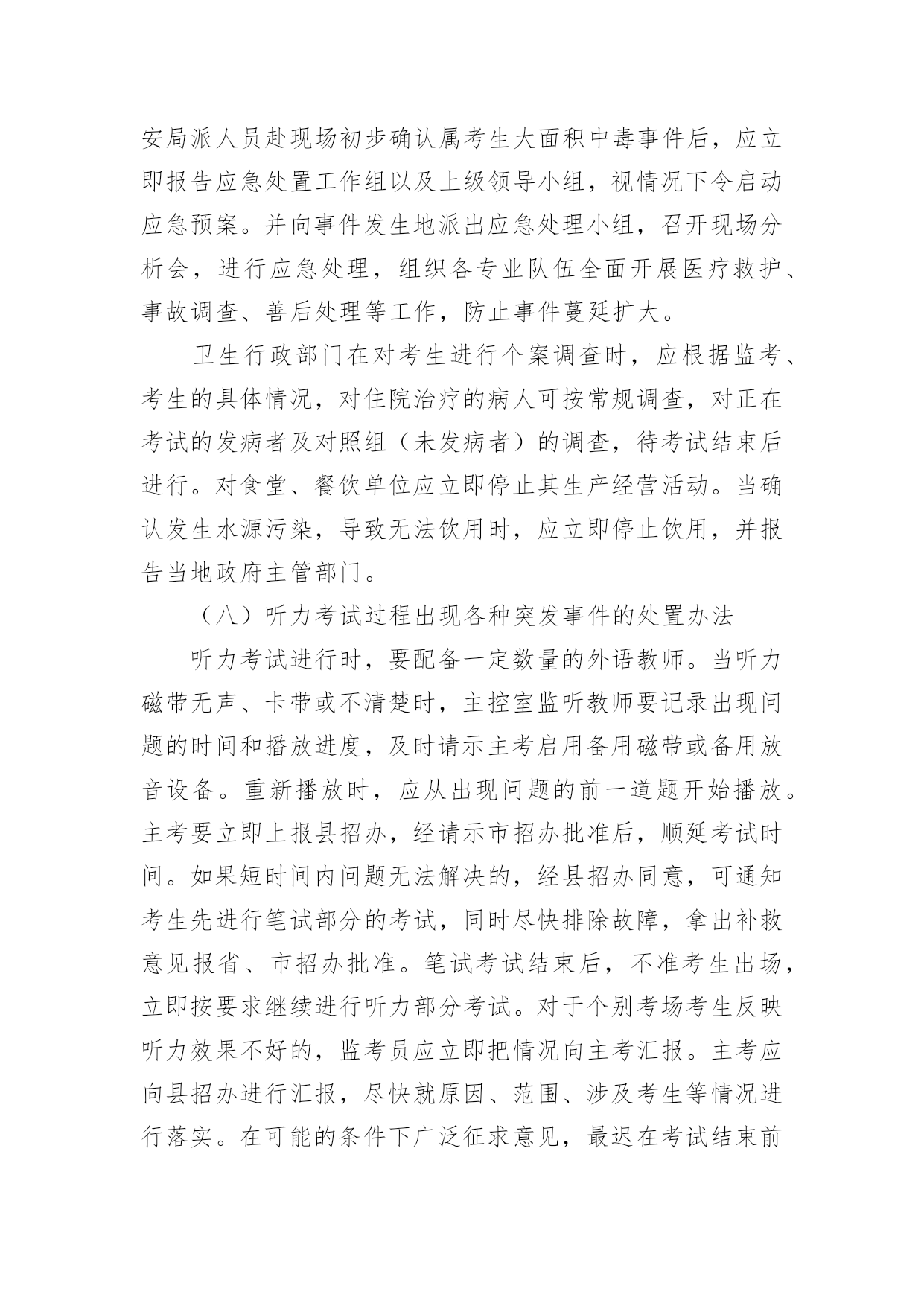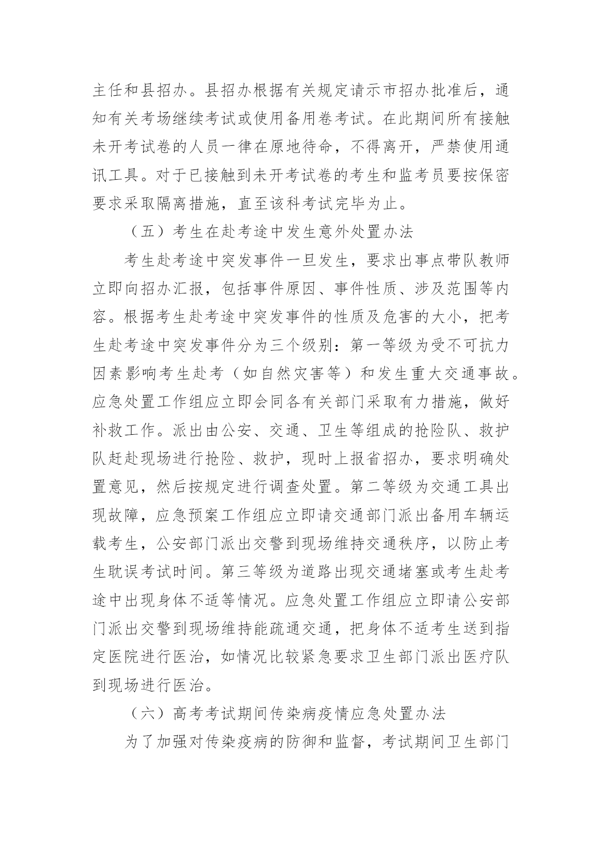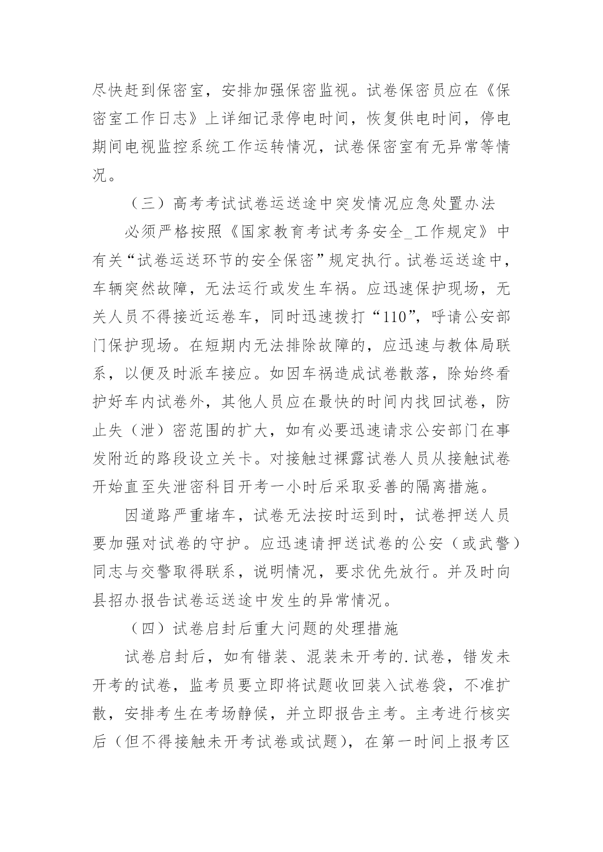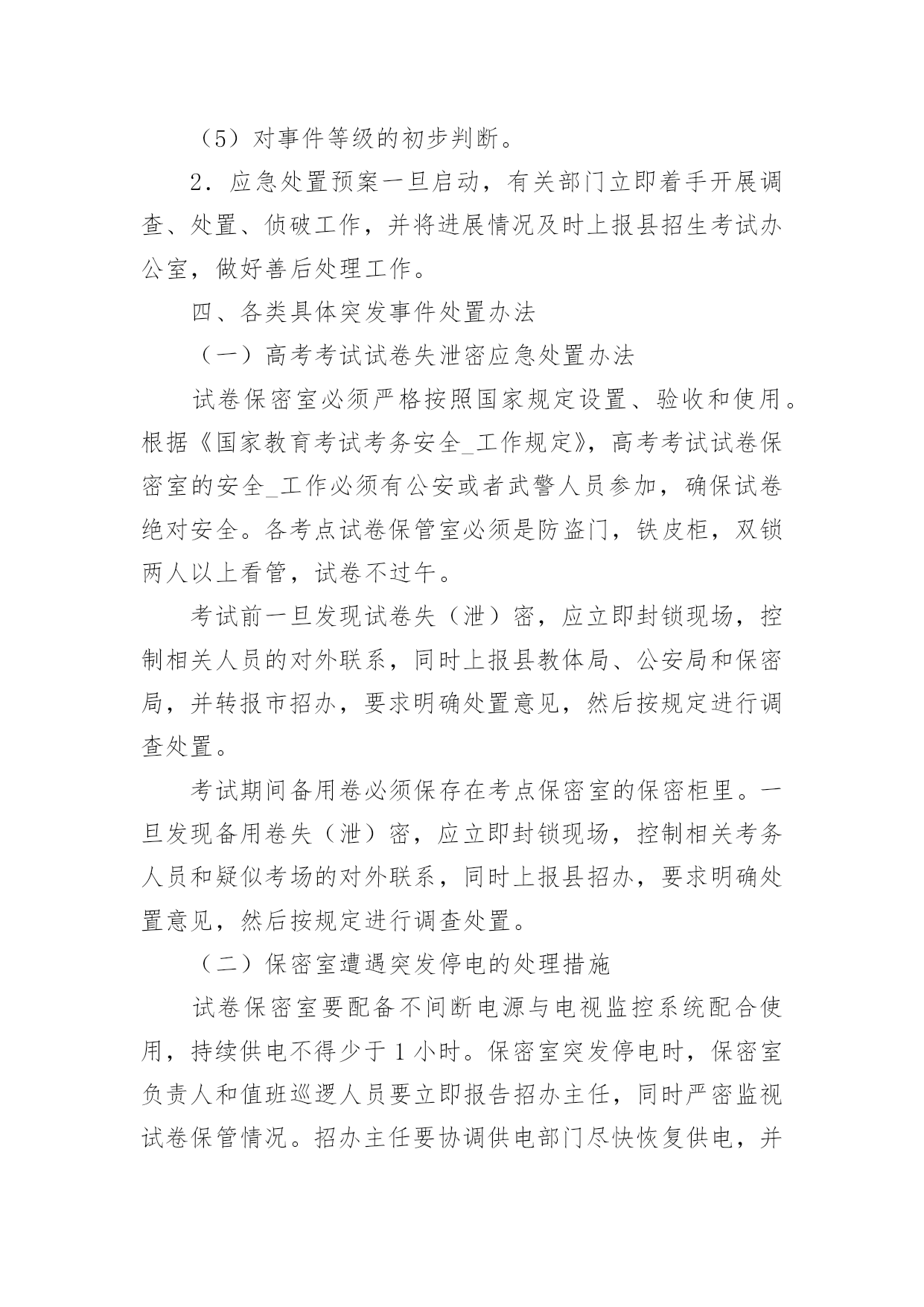 “平安高考”应急处置预案“平安高考”应急处置预案在平日的学习、工作和生活里,有时会突发意外事故,为了避免造成重大损失和危害,常常要提前编制一份优秀的应急预案。应急预案应该怎么编制才好呢?下面是小编精心整理的“平安高考”应急处置预案,欢迎阅读与收藏。“平安高考”应急处置预案1根据省、市打造“平安高考、和谐高考”的指导思想,为确保考试工作的安全有序,进一步增强应对考试安全突发事件的能力,确保高考的良好环境和秩序,制定本工作预案。一、应急处置工作组织机构20xx年普通高招考试突发事件应急处置工作由县政府统一领导,县教育体育局组织协调,安阳县招生办公室具体实施。成立安阳县普通高招考试突发事件应急处置工作领导小组,主管副县长(考区主任)任组长,高招领导小组成员单位的有关负责人为成员。领导小组办公室设在县招办,具体负责实施工作。安阳县高考突发事件应急处置工作领导小组成员名单如下:组长:副县长、成员:领导小组下设办公室,王家岭任办公室主任,县教体局副局长翟玉凤、县教体局纪检书记王新国、县招生办副主任程志国任副主任。二、应急处置工作领导小组职责1.协调社会各方面力量,对高考期间的各类重大突发事件进行处理,保证考试顺利进行。2.在不可抗拒的外来因素对考试产生重大影响时,对有关考试问题做出决定。3.负责向上级报告,并在得到批准的情况下向社会通报考试的重大突发事件。三、应急处置工作的原则与处置程序(一)应急处置基本原则高考突发事件的处理,要遵循加强防范、完善机制、沉着应对、措施果断、科学处理、及时汇报的原则,以有效防止事态的扩大,最大限度地减少损失,维护广大考生的根本利益,确保考生生命安全和试卷安全保密,尽可能保证考试正常、有序进行。(二)应急处置基本程序1.一旦发生高考考试突发事件,第一时间上报“县高考突发事件应急处置工作组办公室”,包括:(1)事件原因;(2)事件性质;(3)波及范围;(4)目前措施;(5)对事件等级的初步判断。2.应急处置预案一旦启动,有关部门立即着手开展调查、处置、侦破工作,并将进展情况及时上报县招生考试办公室,做好善后处理工作。四、各类具体突发事件处置办法(一)高考考试试卷失泄密应急处置办法试卷保密室必须严格按照国家规定设置、验收和使用。根据《国家教育考试考务安全_工作规定》,高考考试试卷保密室的安全_工作必须有公安或者武警人员参加,确保试卷绝对安全。各考点试卷保管室必须是防盗门,铁皮柜,双锁两人以上看管,试卷不过午。考试前一旦发现试卷失(泄)密,应立即封锁现场,控制相关人员的对外联系,同时上报县教体局、公安局和保密局,并转报市招办,要求明确处置意见,然后按规定进行调查处置。考试期间备用卷必须保存在考点保密室的保密柜里。一旦发现备用卷失(泄)密,应立即封锁现场,控制相关考务人员和疑似考场的对外联系,同时上报县招办,要求明确处置意见,然后按规定进行调查处置。(二)保密室遭遇突发停电的处理措施试卷保密室要配备不间断电源与电视监控系统配合使用,持续供电不得少于1小时。保密室突发停电时,保密室负责人和值班巡逻人员要立即报告招办主任,同时严密监视试卷保管情况。招办主任要协调供电部门尽快恢复供电,并尽快赶到保密室,安排加强保密监视。试卷保密员应在《保密室工作日志》上详细记录停电时间,恢复供电时间,停电期间电视监控系统工作运转情况,试卷保密室有无异常等情况。(三)高考考试试卷运送途中突发情况应急处置办法必须严格按照《国家教育考试考务安全_工作规定》中有关“试卷运送环节的安全保密”规定执行。试卷运送途中,车辆突然故障,无法运行或发生车祸。应迅速保护现场,无关人员不得接近运卷车,同时迅速拨打“110”,呼请公安部门保护现场。在短期内无法排除故障的,应迅速与教体局联系,以便及时派车接应。如因车祸造成试卷散落,除始终看护好车内试卷外,其他人员应在最快的时间内找回试卷,防止失(泄)密范围的扩大,如有必要迅速请求公安部门在事发附近的路段设立关卡。对接触过裸露试卷人员从接触试卷开始直至失泄密科目开考一小时后采取妥善的隔离措施。因道路严重堵车,试卷无法按时运到时,试卷押送人员要加强对试卷的守护。应迅速请押送试卷的公安(或武警)同志与交警取得联系,说明情况,要求优先放行。并及时向县招办报告试卷运送途中发生的异常情况。(四)试卷启封后重大问题的处理措施试卷启封后,如有错装、混装未开考的.试卷,错发未开考的试卷,监考员要立即将试题收回装入试卷袋,不准扩散,安排考生在考场静候,并立即报告主考。主考进行核实后(但不得接触未开考试卷或试题),在第一时间上报考区主任和县招办。县招办根据有关规定请示市招办批准后,通知有关考场继续考试或使用备用卷考试。在此期间所有接触未开考试卷的人员一律在原地待命,不得离开,严禁使用通讯工具。对于已接触到未开考试卷的考生和监考员要按