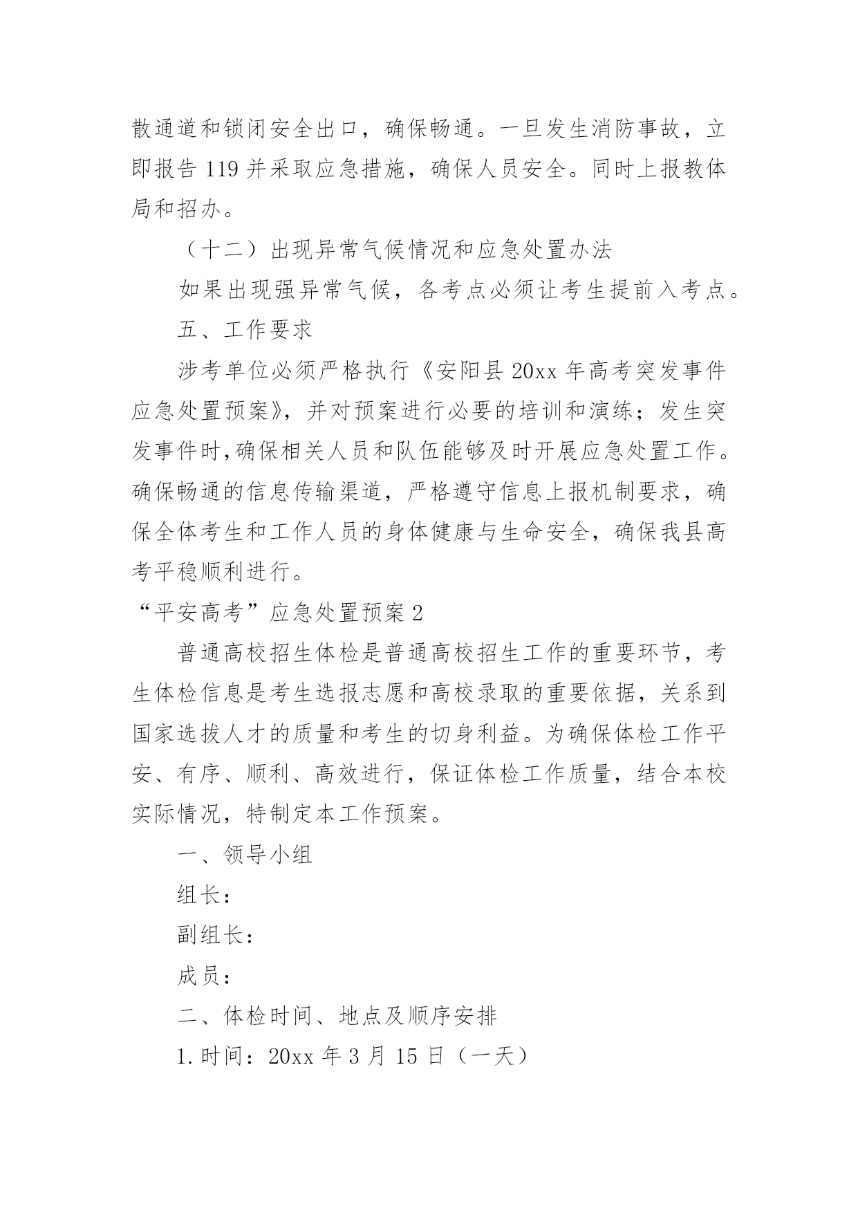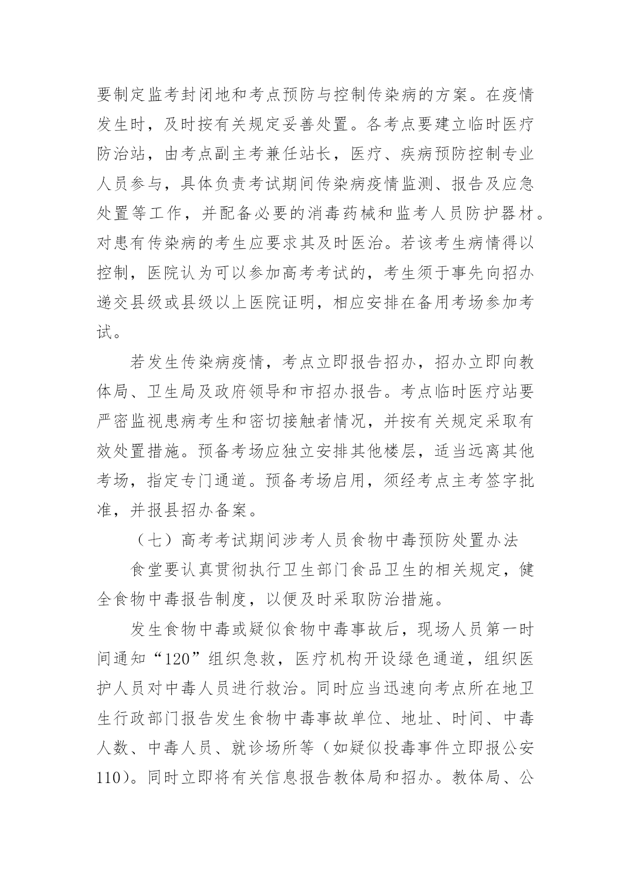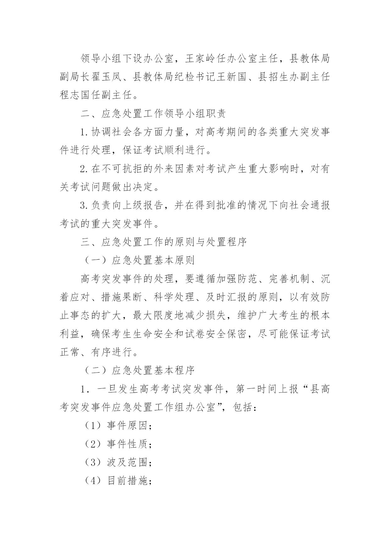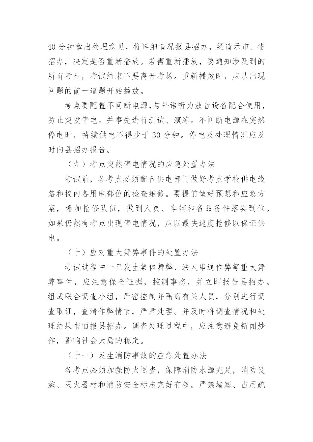 “平安高考”应急处置预案“平安高考”应急处置预案在平日的学习、工作和生活里,有时会突发意外事故,为了避免造成重大损失和危害,常常要提前编制一份优秀的应急预案。应急预案应该怎么编制才好呢?下面是小编精心整理的“平安高考”应急处置预案,欢迎阅读与收藏。“平安高考”应急处置预案1根据省、市打造“平安高考、和谐高考”的指导思想,为确保考试工作的安全有序,进一步增强应对考试安全突发事件的能力,确保高考的良好环境和秩序,制定本工作预案。一、应急处置工作组织机构20xx年普通高招考试突发事件应急处置工作由县政府统一领导,县教育体育局组织协调,安阳县招生办公室具体实施。成立安阳县普通高招考试突发事件应急处置工作领导小组,主管副县长(考区主任)任组长,高招领导小组成员单位的有关负责人为成员。领导小组办公室设在县招办,具体负责实施工作。安阳县高考突发事件应急处置工作领导小组成员名单如下:组长:副县长、成员:领导小组下设办公室,王家岭任办公室主任,县教体局副局长翟玉凤、县教体局纪检书记王新国、县招生办副主任程志国任副主任。二、应急处置工作领导小组职责1.协调社会各方面力量,对高考期间的各类重大突发事件进行处理,保证考试顺利进行。2.在不可抗拒的外来因素对考试产生重大影响时,对有关考试问题做出决定。3.负责向上级报告,并在得到批准的情况下向社会通报考试的重大突发事件。三、应急处置工作的原则与处置程序(一)应急处置基本原则高考突发事件的处理,要遵循加强防范、完善机制、沉着应对、措施果断、科学处理、及时汇报的原则,以有效防止事态的扩大,最大限度地减少损失,维护广大考生的根本利益,确保考生生命安全和试卷安全保密,尽可能保证考试正常、有序进行。(二)应急处置基本程序1.一旦发生高考考试突发事件,第一时间上报“县高考突发事件应急处置工作组办公室”,包括:(1)事件原因;(2)事件性质;(3)波及范围;(4)目前措施;(5)对事件等级的初步判断。2.应急处置预案一旦启动,有关部门立即着手开展调查、处置、侦破工作,并将进展情况及时上报县招生考试办公室,做好善后处理工作。四、各类具体突发事件处置办法(一)高考考试试卷失泄密应急处置办法试卷保密室必须严格按照国家规定设置、验收和使用。根据《国家教育考试考务安全_工作规定》,高考考试试卷保密室的安全_工作必须有公安或者武警人员参加,确保试卷绝对安全。各考点试卷保管室必须是防盗门,铁皮柜,双锁两人以上看管,试卷不过午。考试前一旦发现试卷失(泄)密,应立即封锁现场,控制相关人员的对外联系,同时上报县教体局、公安局和保密局,并转报市招办,要求明确处置意见,然后按规定进行调查处置。考试期间备用卷必须保存在考点保密室的保密柜里。一旦发现备用卷失(泄)密,应立即封锁现场,控制相关考务人员和疑似考场的对外联系,同时上报县招办,要求明确处置意见,然后按规定进行调查处置。(二)保密室遭遇突发停电的处理措施试卷保密室要配备不间断电源与电视监控系统配合使用,持续供电不得少于1小时。保密室突发停电时,保密室负责人和值班巡逻人员要立即报告招办主任,同时严密监视试卷保管情况。招办主任要协调供电部门尽快恢复供电,并尽快赶到保密室,安排加强保密监视。试卷保密员应在《保密室工作日志》上详细记录停电时间,恢复供电时间,停电期间电视监控系统工作运转情况,试卷保密室有无异常等情况。(三)高考考试试卷运送途中突发情况应急处置办法必须严格按照《国家教育考试考务安全_工作规定》中有关“试卷运送环节的安全保密”规定执行。试卷运送途中,车辆突然故障,无法运行或发生车祸。应迅速保护现场,无关人员不得接近运卷车,同时迅速拨打“110”,呼请公安部门保护现场。在短期内无法排除故障的,应迅速与教体局联系,以便及时派车接应。如因车祸造成试卷散落,除始终看护好车内试卷外,其他人员应在最快的时间内找回试卷,防止失(泄)密范围的扩大,如有必要迅速请求公安部门在事发附近的路段设立关卡。对接触过裸露试卷人员从接触试卷开始直至失泄密科目开考一小时后采取妥善的隔离措施。因道路严重堵车,试卷无法按时运到时,试卷押送人员要加强对试卷的守护。应迅速请押送试卷的公安(或武警)同志与交警取得联系,说明情况,要求优先放行。并及时向县招办报告试卷运送途中发生的异常情况。(四)试卷启封后重大问题的处理措施试卷启封后,如有错装、混装未开考的.试卷,错发未开考的试卷,监考员要立即将试题收回装入试卷袋,不准扩散,安排考生在考场静候,并立即报告主考。主考进行核实后(但不得接触未开考试卷或试题),在第一时间上报考区主任和县招办。县招办根据有关规定请示市招办批准后,通知有关考场继续考试或使用备用卷考试。在此期间所有接触未开考试卷的人员一律在原地待命,不得离开,严禁使用通讯工具。对于已接触到未开考试卷的考生和监考员要按