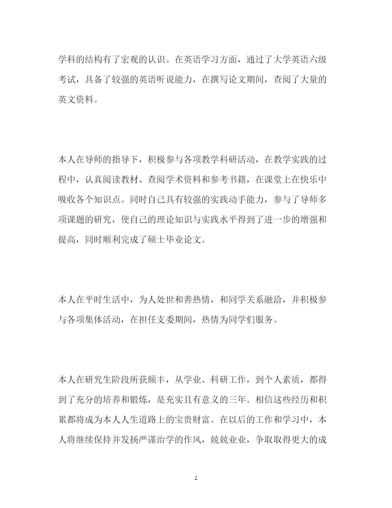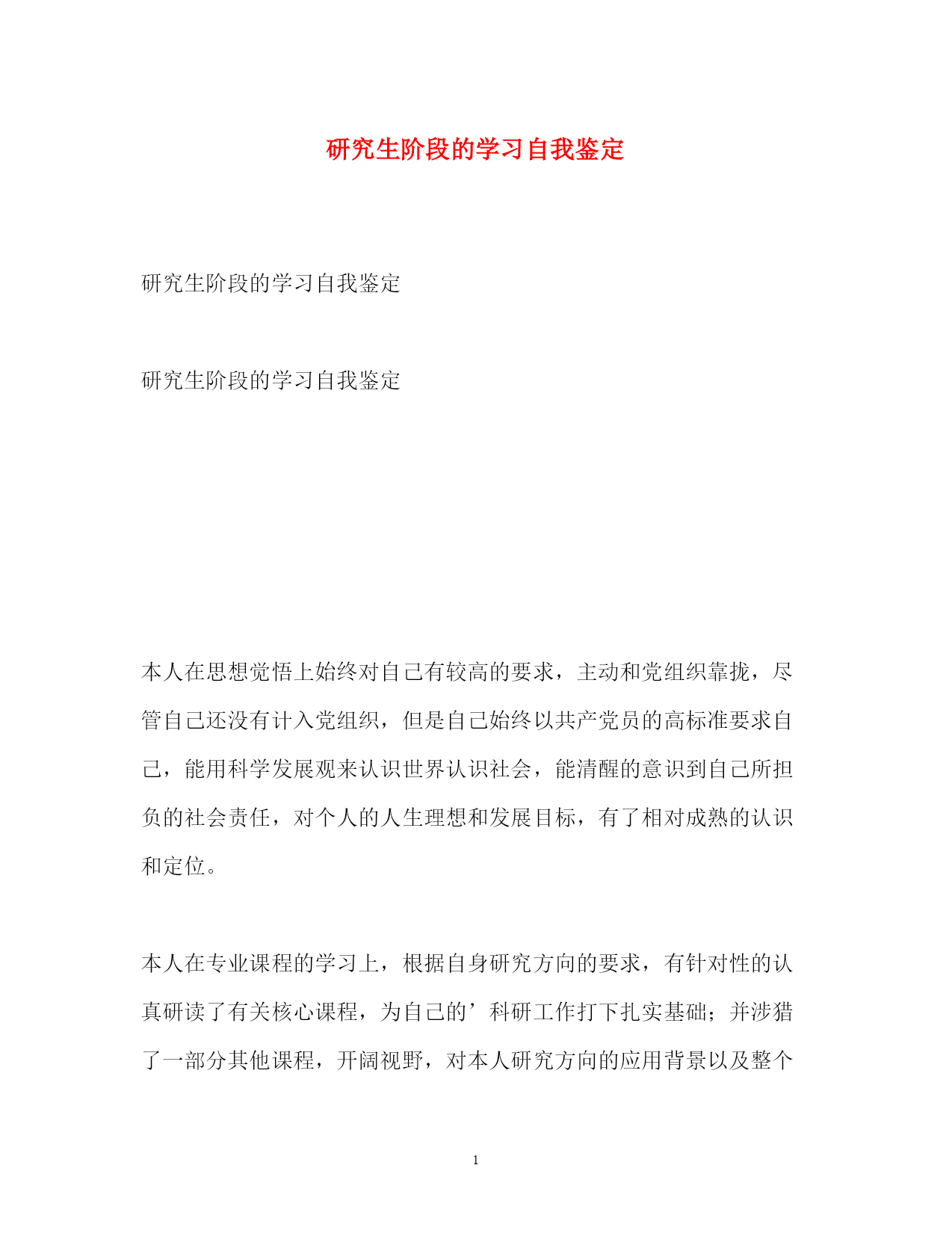此资料由网络收集而来,如有侵权请告知上传者立即删除。资料共分享,我们负责传递知识。PAGEPAGE3研究生阶段的学习自我鉴定研究生阶段的学习自我鉴定研究生阶段的学习自我鉴定本人在思想觉悟上始终对自己有较高的要求,主动和党组织靠拢,尽管自己还没有计入党组织,但是自己始终以共产党员的高标准要求自己,能用科学发展观来认识世界认识社会,能清醒的意识到自己所担负的社会责任,对个人的人生理想和发展目标,有了相对成熟的认识和定位。本人在专业课程的学习上,根据自身研究方向的要求,有针对性的认真研读了有关核心课程,为自己的’科研工作打下扎实基础;并涉猎了一部分其他课程,开阔视野,对本人研究方向的应用背景以及整个学科的结构有了宏观的认识。在英语学习方面,通过了大学英语六级考试,具备了较强的英语听说能力,在撰写论文期间,查阅了大量的英文资料。本人在导师的指导下,积极参与各项教学科研活动,在教学实践的过程中,认真阅读教材、查阅学术资料和参考书籍,在课堂上在快乐中吸收各个知识点。同时自己具有较强的实践动手能力,参与了导师多项课题的研究,使自己的理论知识与实践水平得到了进一步的增强和提高,同时顺利完成了硕士毕业论文。本人在平时生活中,为人处世和善热情,和同学关系融洽,并积极参与各项集体活动,在担任支委期间,热情为同学们服务。本人在研究生阶段所获颇丰,从学业、科研工作,到个人素质,都得到了充分的培养和锻炼,是充实且有意义的三年。相信这些经历和积累都将成为本人人生道路上的宝贵财富。在以后的工作和学习中,本人将继续保持并发扬严谨治学的作风,兢兢业业,争取取得更大的成绩。【自我鉴定】