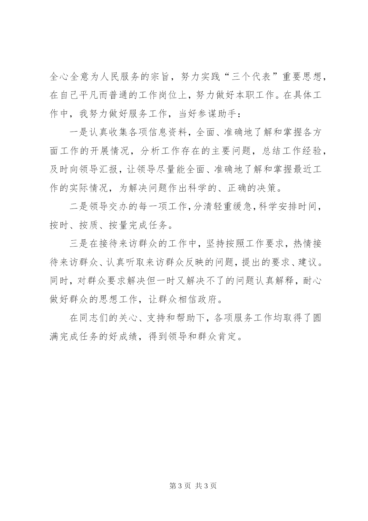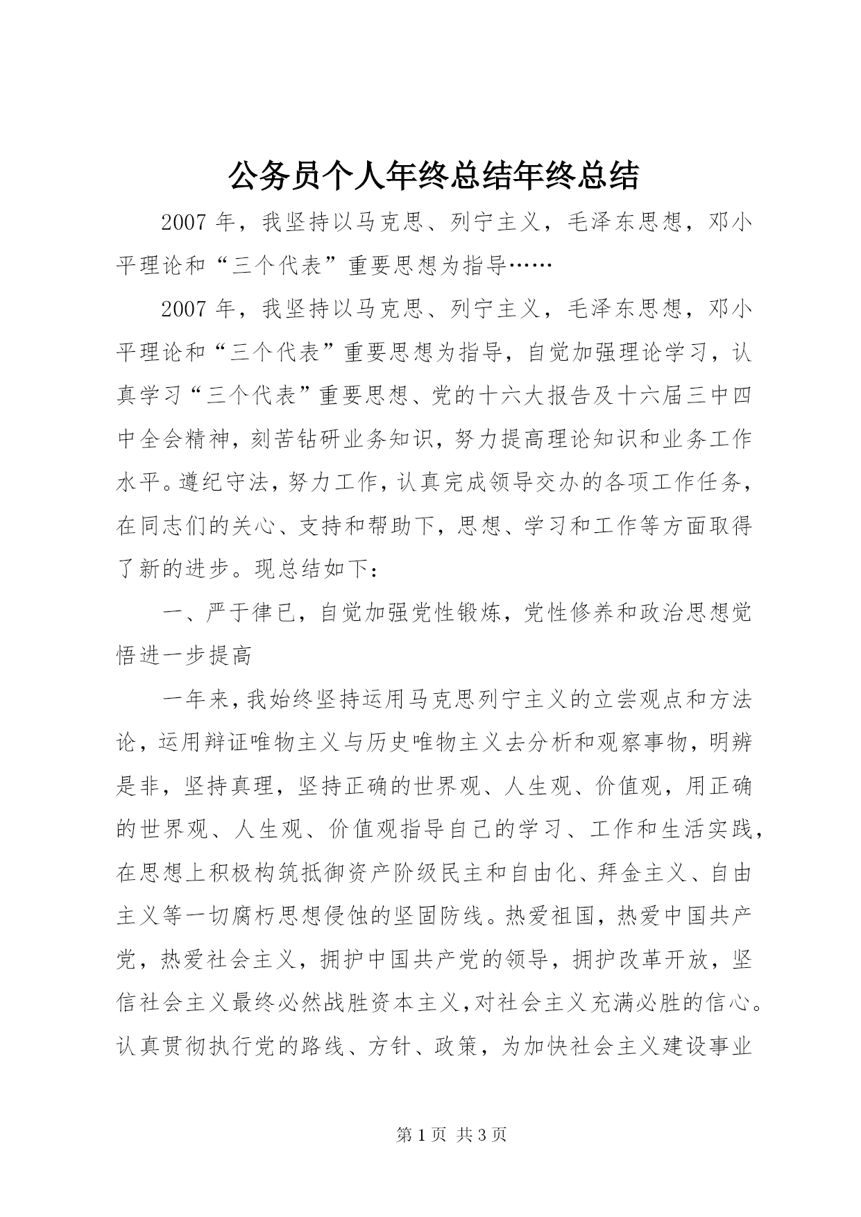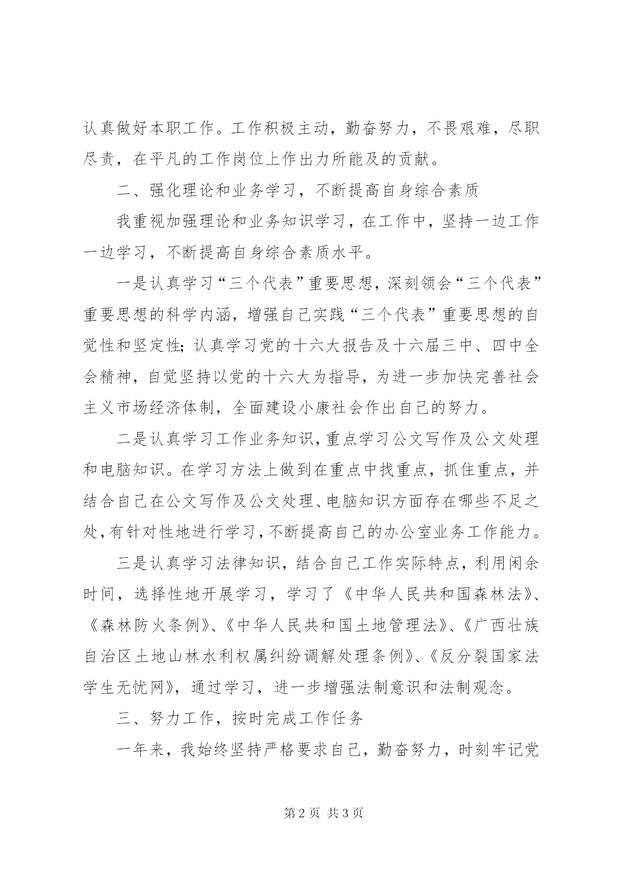第PAGE\*Arabic\*MERGEFORMAT3页共NUMPAGES\*MERGEFORMAT3页公务员个人年终总结年终总结2007年,我坚持以马克思、列宁主义,毛泽东思想,邓小平理论和“三个代表”重要思想为指导……2007年,我坚持以马克思、列宁主义,毛泽东思想,邓小平理论和“三个代表”重要思想为指导,自觉加强理论学习,认真学习“三个代表”重要思想、党的十六大报告及十六届三中四中全会精神,刻苦钻研业务知识,努力提高理论知识和业务工作水平。遵纪守法,努力工作,认真完成领导交办的各项工作任务,在同志们的关心、支持和帮助下,思想、学习和工作等方面取得了新的进步。现总结如下:一、严于律已,自觉加强党性锻炼,党性修养和政治思想觉悟进一步提高一年来,我始终坚持运用马克思列宁主义的立尝观点和方法论,运用辩证唯物主义与历史唯物主义去分析和观察事物,明辨是非,坚持真理,坚持正确的世界观、人生观、价值观,用正确的世界观、人生观、价值观指导自己的学习、工作和生活实践,在思想上积极构筑抵御资产阶级民主和自由化、拜金主义、自由主义等一切腐朽思想侵蚀的坚固防线。热爱祖国,热爱中国共产党,热爱社会主义,拥护中国共产党的领导,拥护改革开放,坚信社会主义最终必然战胜资本主义,对社会主义充满必胜的信心。认真贯彻执行党的路线、方针、政策,为加快社会主义建设事业认真做好本职工作。工作积极主动,勤奋努力,不畏艰难,尽职尽责,在平凡的工作岗位上作出力所能及的贡献。二、强化理论和业务学习,不断提高自身综合素质我重视加强理论和业务知识学习,在工作中,坚持一边工作一边学习,不断提高自身综合素质水平。一是认真学习“三个代表”重要思想,深刻领会“三个代表”重要思想的科学内涵,增强自己实践“三个代表”重要思想的自觉性和坚定性;认真学习党的十六大报告及十六届三中、四中全会精神,自觉坚持以党的十六大为指导,为进一步加快完善社会主义市场经济体制,全面建设小康社会作出自己的努力。二是认真学习工作业务知识,重点学习公文写作及公文处理和电脑知识。在学习方法上做到在重点中找重点,抓住重点,并结合自己在公文写作及公文处理、电脑知识方面存在哪些不足之处,有针对性地进行学习,不断提高自己的办公室业务工作能力。三是认真学习法律知识,结合自己工作实际特点,利用闲余时间,选择性地开展学习,学习了《中华人民共和国森林法》、《森林防火条例》、《中华人民共和国土地管理法》、《广西壮族自治区土地山林水利权属纠纷调解处理条例》、《反分裂国家法学生无忧网》,通过学习,进一步增强法制意识和法制观念。三、努力工作,按时完成工作任务一年来,我始终坚持严格要求自己,勤奋努力,时刻牢记党全心全意为人民服务的宗旨,努力实践“三个代表”重要思想,在自己平凡而普通的工作岗位上,努力做好本职工作。在具体工作中,我努力做好服务工作,当好参谋助手:一是认真收集各项信息资料,全面、准确地了解和掌握各方面工作的开展情况,分析工作存在的主要问题,总结工作经验,及时向领导汇报,让领导尽量能全面、准确地了解和掌握最近工作的实际情况,为解决问题作出科学的、正确的决策。二是领导交办的每一项工作,分清轻重缓急,科学安排时间,按时、按质、按量完成任务。三是在接待来访群众的工作中,坚持按照工作要求,热情接待来访群众、认真听取来访群众反映的问题,提出的要求、建议。同时,对群众要求解决但一时又解决不了的问题认真解释,耐心做好群众的思想工作,让群众相信政府。在同志们的关心、支持和帮助下,各项服务工作均取得了圆满完成任务的好成绩,得到领导和群众肯定。