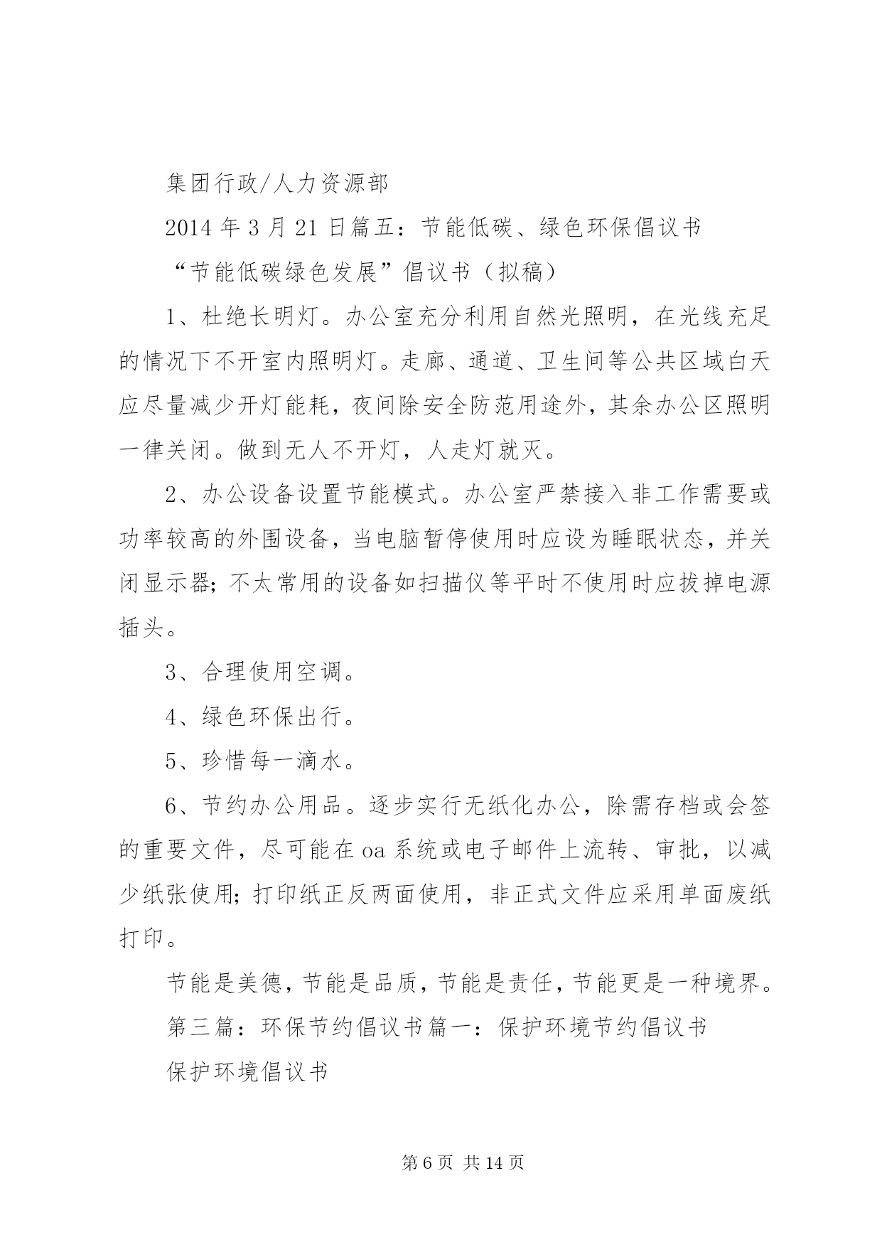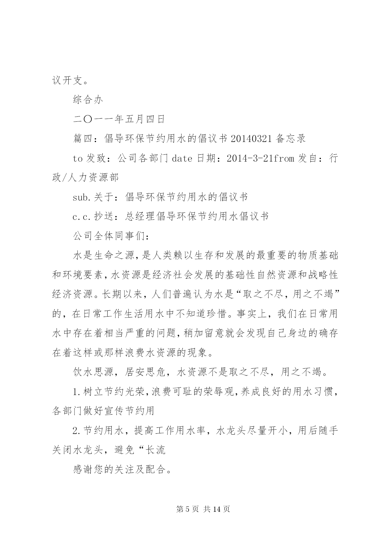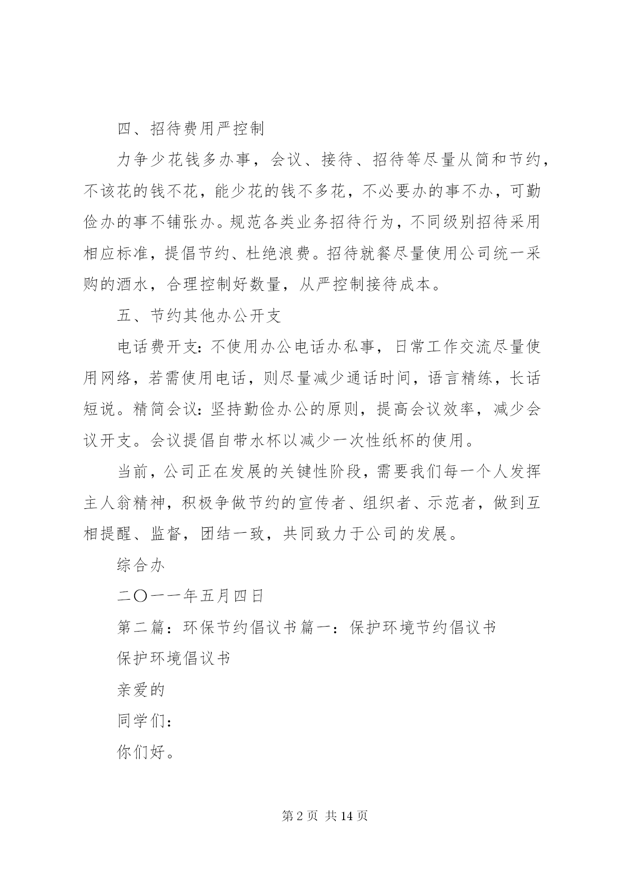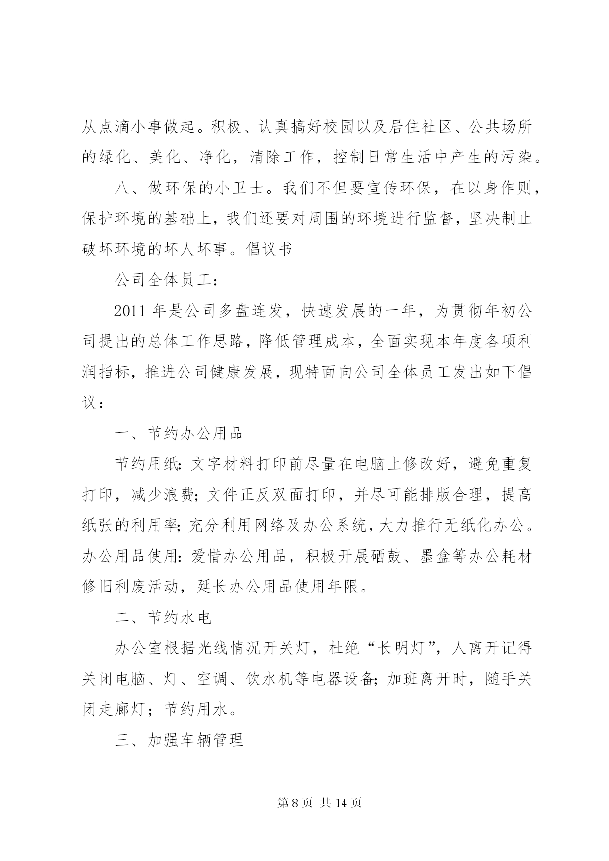 第PAGE\*Arabic\*MERGEFORMAT14页共NUMPAGES\*MERGEFORMAT14页节约环保倡议书公司全体员工:2011年是公司多盘连发,快速发展的一年,为贯彻年初公司提出的总体工作思路,降低管理成本,全面实现本年度各项利润指标,推进公司健康发展,现特面向公司全体员工发出如下倡议:一、节约办公用品节约用纸:文字材料打印前尽量在电脑上修改好,避免重复打印,减少浪费;文件正反双面打印,并尽可能排版合理,提高纸张的利用率;充分利用网络及办公系统,大力推行无纸化办公。办公用品使用:爱惜办公用品,积极开展硒鼓、墨盒等办公耗材修旧利废活动,延长办公用品使用年限。二、节约水电办公室根据光线情况开关灯,杜绝“长明灯”,人离开记得关闭电脑、灯、空调、饮水机等电器设备;加班离开时,随手关闭走廊灯;节约用水。三、加强车辆管理统筹车辆使用,提高车辆使用率,降低汽车运行成本。对于近距离外出办事的,尽量使用自行车,既节约环保、锻炼身体,又避免了堵车、停车等问题。公司已购进两辆自行车供大家使用,如有需要,可到办公室领用。四、招待费用严控制力争少花钱多办事,会议、接待、招待等尽量从简和节约,不该花的钱不花,能少花的钱不多花,不必要办的事不办,可勤俭办的事不铺张办。规范各类业务招待行为,不同级别招待采用相应标准,提倡节约、杜绝浪费。招待就餐尽量使用公司统一采购的酒水,合理控制好数量,从严控制接待成本。五、节约其他办公开支电话费开支:不使用办公电话办私事,日常工作交流尽量使用网络,若需使用电话,则尽量减少通话时间,语言精练,长话短说。精简会议:坚持勤俭办公的原则,提高会议效率,减少会议开支。会议提倡自带水杯以减少一次性纸杯的使用。当前,公司正在发展的关键性阶段,需要我们每一个人发挥主人翁精神,积极争做节约的宣传者、组织者、示范者,做到互相提醒、监督,团结一致,共同致力于公司的发展。综合办二〇一一年五月四日第二篇:环保节约倡议书篇一:保护环境节约倡议书保护环境倡议书亲爱的同学们:你们好。环境是人类及自然界所有生物赖以生存的基础。六、做环保的宣传者。认真学习环保知识,积极参加环保实践活动。七、做环保的执行者。从我做起,从现在做起,从身边做起,从点滴小事做起。八、做环保的小卫士。篇二:“低碳环保节约校园”倡议书“低碳环保节约校园”倡议书随着经济的发展,环境污染已经是全人类的一大难题,节能环保是我们可持续发展的必然方向,弘扬节约美德,倡导低碳生活,建设环保型、节约型校园是我们的当务之急。唤起大众关注环保和节约,是我们广大师生应该承担的使命。2.节约用水。3.节约办公用品。8.不在公共场合吸烟,创建无烟宿舍、无烟教室、无烟为此,让我们一起从节约“一滴水、一度电、一张纸”开始做起。节约能源,就是延长我们的生命;保护环境,就是保护人类自己。中学生作为时代的先锋,更应当积极投身到节能环保行动当中。篇三:节约环保倡议书倡议书公司全体员工:2011年是公司多盘连发,快速发展的一年,为贯彻年初公司提出的总体工作思路,降低管理成本,全面实现本年度各项利润指标,推进公司健康发展,现特面向公司全体员工发出如下倡议:一、节约办公用品节约用纸。文字材料打印前尽量在电脑上修改好,避免重复打印,减少浪费;文件正反双面打印,并尽可能排版合理,提高纸张的利用率;充分利用网络及办公系统,大力推行无纸化办公。二、节约水电三、加强车辆管理统筹车辆使用,提高车辆使用率,降低汽车运行成本。对于近距离外出办事的,尽量使用自行车,既节约环保、锻炼身体,又避免了堵车、停车等问题。四、招待费用严控制力争少花钱多办事,会议、接待、招待等尽量从简和节约,不该花的钱不花,能少花的钱不多花,不必要办的事不办,可勤俭办的事不铺张办。规范各类业务招待行为,不同级别招待采用相应标准,提倡节约、杜绝浪费。五、节约其他办公开支电话费开支:不使用办公电话办私事,日常工作交流尽量使用网络,若需使用电话,则尽量减少通话时间,语言精练,长话短说。精简会议:坚持勤俭办公的原则,提高会议效率,减少会议开支。综合办二〇一一年五月四日篇四:倡导环保节约用水的倡议书20140321备忘录to发致:公司各部门date日期:2014-3-21from发自:行政/人力资源部sub.关于:倡导环保节约用水的倡议书c.c.抄送:总经理倡导环保节约用水倡议书公司全体同事们:水是生命之源,是人类赖以生存和发展的最重要的物质基础和环境要素,水资源是经济社会发展的基础性自然资源和战略性经济资源。长期以来,人们普遍认为水是“取之不尽,用之不竭”的,在日常工作生活用水中不知道珍惜。事实上,我们在日常用水中存在着相当严重的问题,稍加留意就会发现自己身边的确存在着这样或那样浪费水资源的现象。饮水思源,居安思危,水资源不是取之不尽,