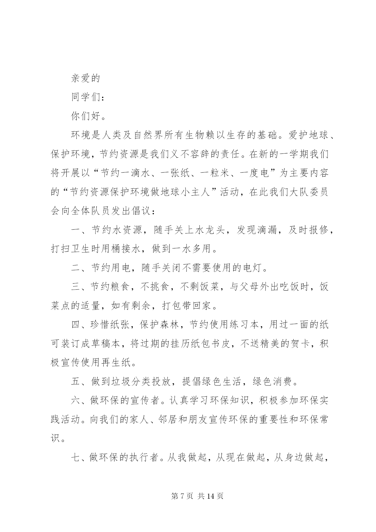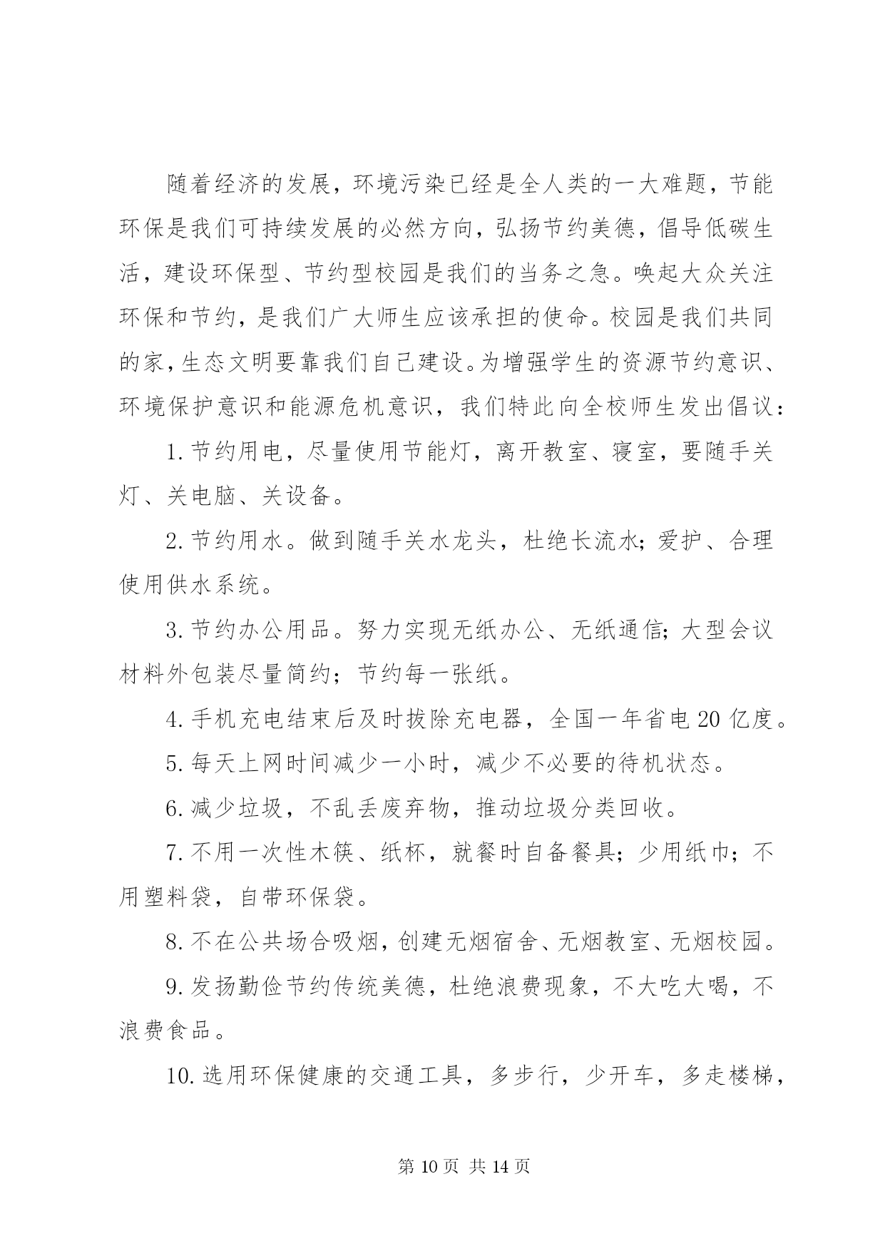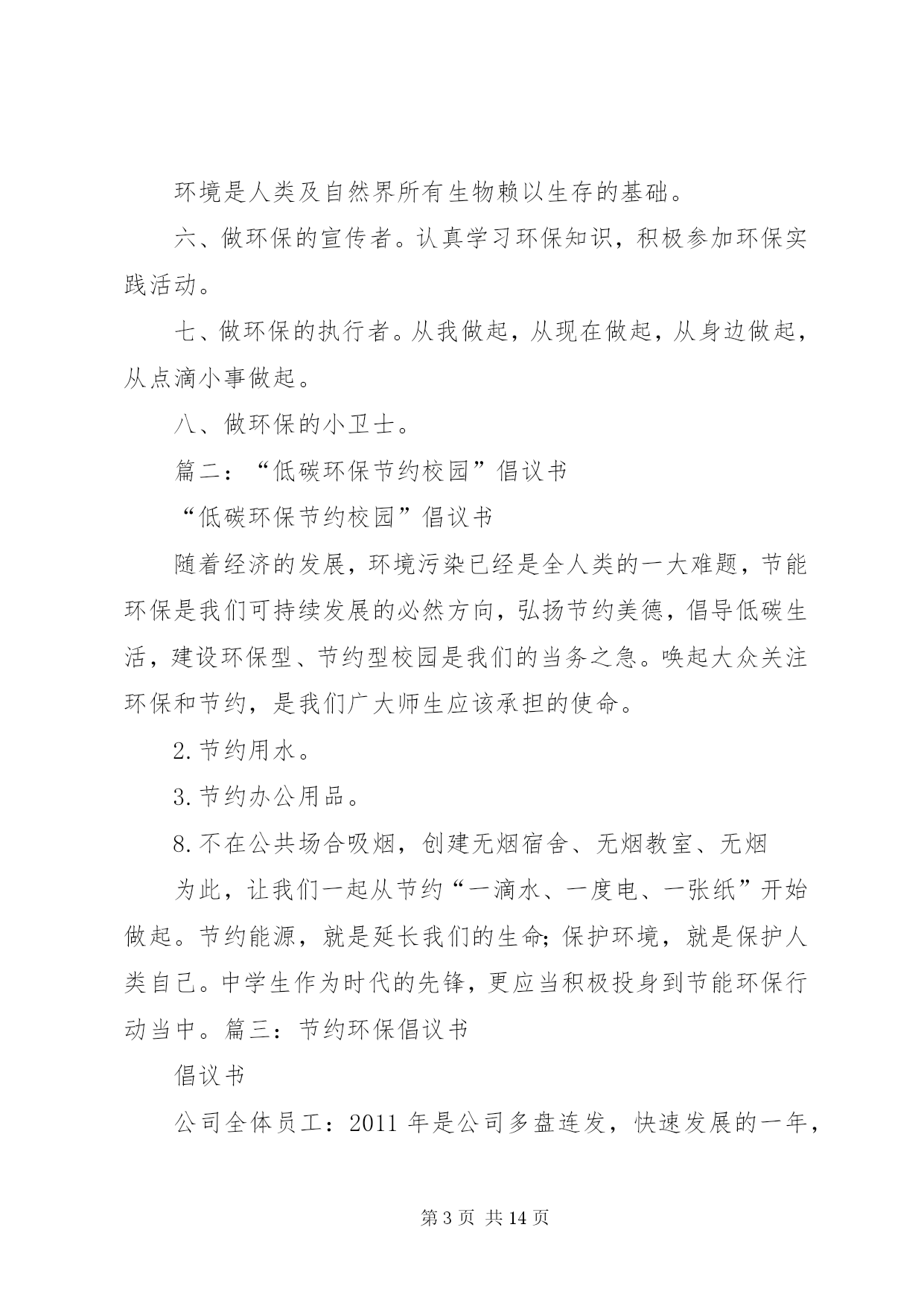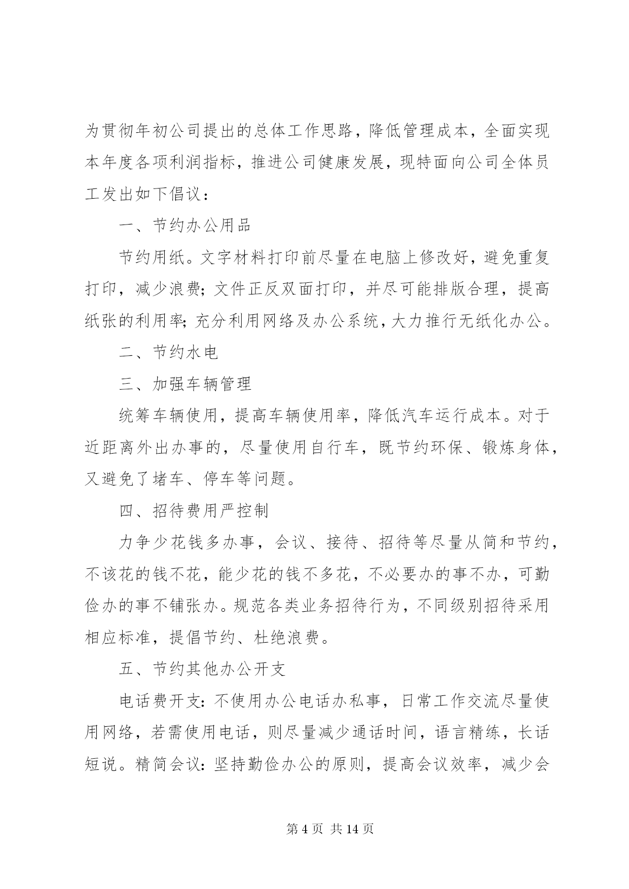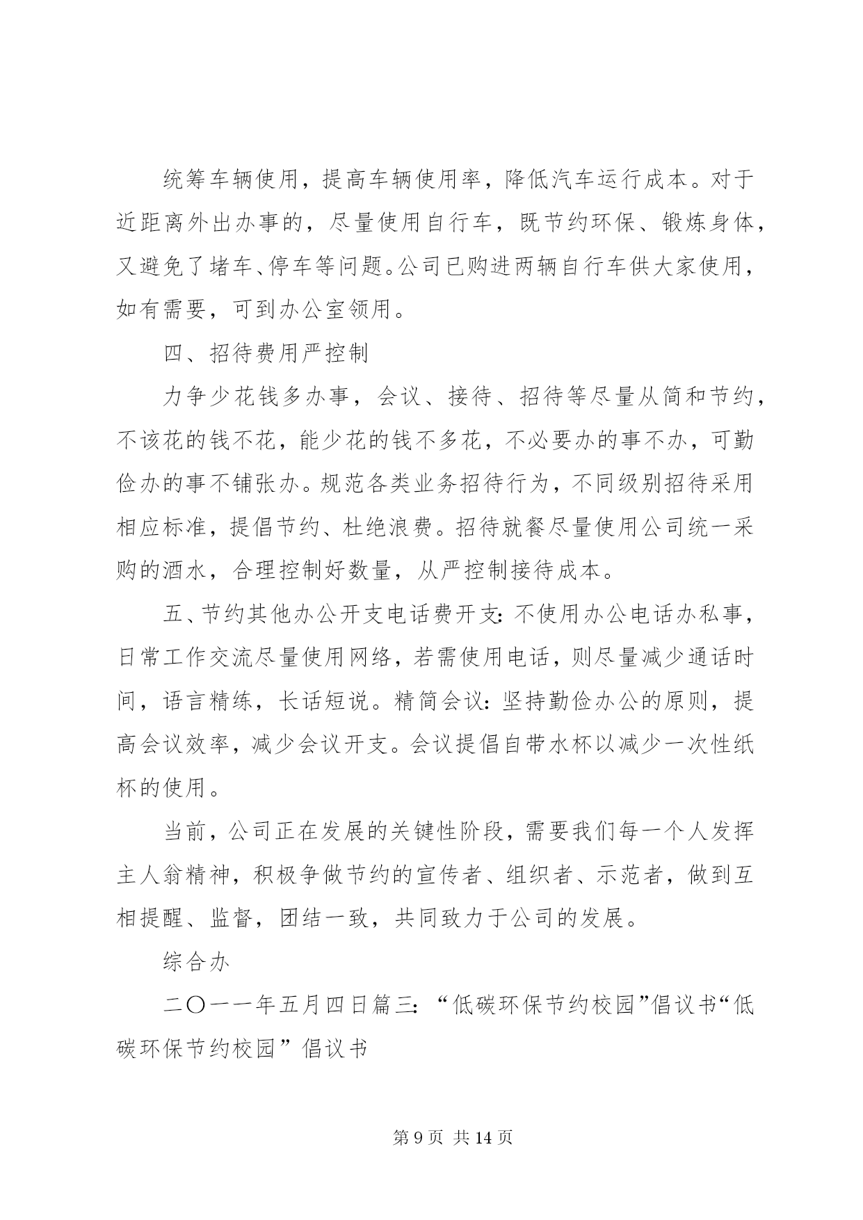 第PAGE\*Arabic\*MERGEFORMAT14页共NUMPAGES\*MERGEFORMAT14页节约环保倡议书公司全体员工:2011年是公司多盘连发,快速发展的一年,为贯彻年初公司提出的总体工作思路,降低管理成本,全面实现本年度各项利润指标,推进公司健康发展,现特面向公司全体员工发出如下倡议:一、节约办公用品节约用纸:文字材料打印前尽量在电脑上修改好,避免重复打印,减少浪费;文件正反双面打印,并尽可能排版合理,提高纸张的利用率;充分利用网络及办公系统,大力推行无纸化办公。办公用品使用:爱惜办公用品,积极开展硒鼓、墨盒等办公耗材修旧利废活动,延长办公用品使用年限。二、节约水电办公室根据光线情况开关灯,杜绝“长明灯”,人离开记得关闭电脑、灯、空调、饮水机等电器设备;加班离开时,随手关闭走廊灯;节约用水。三、加强车辆管理统筹车辆使用,提高车辆使用率,降低汽车运行成本。对于近距离外出办事的,尽量使用自行车,既节约环保、锻炼身体,又避免了堵车、停车等问题。公司已购进两辆自行车供大家使用,如有需要,可到办公室领用。四、招待费用严控制力争少花钱多办事,会议、接待、招待等尽量从简和节约,不该花的钱不花,能少花的钱不多花,不必要办的事不办,可勤俭办的事不铺张办。规范各类业务招待行为,不同级别招待采用相应标准,提倡节约、杜绝浪费。招待就餐尽量使用公司统一采购的酒水,合理控制好数量,从严控制接待成本。五、节约其他办公开支电话费开支:不使用办公电话办私事,日常工作交流尽量使用网络,若需使用电话,则尽量减少通话时间,语言精练,长话短说。精简会议:坚持勤俭办公的原则,提高会议效率,减少会议开支。会议提倡自带水杯以减少一次性纸杯的使用。当前,公司正在发展的关键性阶段,需要我们每一个人发挥主人翁精神,积极争做节约的宣传者、组织者、示范者,做到互相提醒、监督,团结一致,共同致力于公司的发展。综合办二〇一一年五月四日第二篇:环保节约倡议书篇一:保护环境节约倡议书保护环境倡议书亲爱的同学们:你们好。环境是人类及自然界所有生物赖以生存的基础。六、做环保的宣传者。认真学习环保知识,积极参加环保实践活动。七、做环保的执行者。从我做起,从现在做起,从身边做起,从点滴小事做起。八、做环保的小卫士。篇二:“低碳环保节约校园”倡议书“低碳环保节约校园”倡议书随着经济的发展,环境污染已经是全人类的一大难题,节能环保是我们可持续发展的必然方向,弘扬节约美德,倡导低碳生活,建设环保型、节约型校园是我们的当务之急。唤起大众关注环保和节约,是我们广大师生应该承担的使命。2.节约用水。3.节约办公用品。8.不在公共场合吸烟,创建无烟宿舍、无烟教室、无烟为此,让我们一起从节约“一滴水、一度电、一张纸”开始做起。节约能源,就是延长我们的生命;保护环境,就是保护人类自己。中学生作为时代的先锋,更应当积极投身到节能环保行动当中。篇三:节约环保倡议书倡议书公司全体员工:2011年是公司多盘连发,快速发展的一年,为贯彻年初公司提出的总体工作思路,降低管理成本,全面实现本年度各项利润指标,推进公司健康发展,现特面向公司全体员工发出如下倡议:一、节约办公用品节约用纸。文字材料打印前尽量在电脑上修改好,避免重复打印,减少浪费;文件正反双面打印,并尽可能排版合理,提高纸张的利用率;充分利用网络及办公系统,大力推行无纸化办公。二、节约水电三、加强车辆管理统筹车辆使用,提高车辆使用率,降低汽车运行成本。对于近距离外出办事的,尽量使用自行车,既节约环保、锻炼身体,又避免了堵车、停车等问题。四、招待费用严控制力争少花钱多办事,会议、接待、招待等尽量从简和节约,不该花的钱不花,能少花的钱不多花,不必要办的事不办,可勤俭办的事不铺张办。规范各类业务招待行为,不同级别招待采用相应标准,提倡节约、杜绝浪费。五、节约其他办公开支电话费开支:不使用办公电话办私事,日常工作交流尽量使用网络,若需使用电话,则尽量减少通话时间,语言精练,长话短说。精简会议:坚持勤俭办公的原则,提高会议效率,减少会议开支。综合办二〇一一年五月四日篇四:倡导环保节约用水的倡议书20140321备忘录to发致:公司各部门date日期:2014-3-21from发自:行政/人力资源部sub.关于:倡导环保节约用水的倡议书c.c.抄送:总经理倡导环保节约用水倡议书公司全体同事们:水是生命之源,是人类赖以生存和发展的最重要的物质基础和环境要素,水资源是经济社会发展的基础性自然资源和战略性经济资源。长期以来,人们普遍认为水是“取之不尽,用之不竭”的,在日常工作生活用水中不知道珍惜。事实上,我们在日常用水中存在着相当严重的问题,稍加留意就会发现自己身边的确存在着这样或那样浪费水资源的现象。饮水思源,居安思危,水资源不是取之不尽,