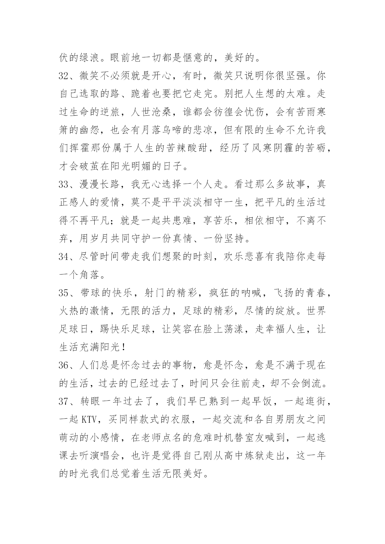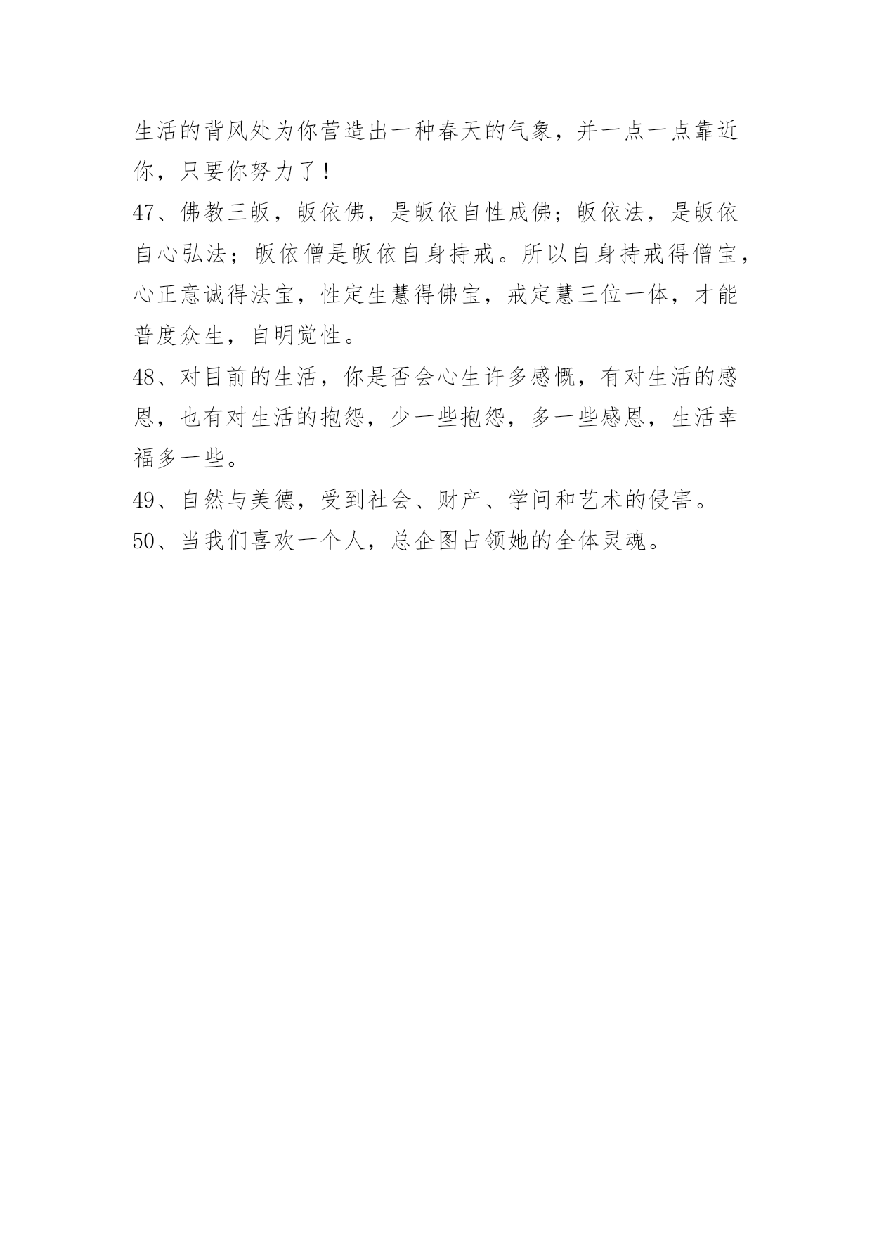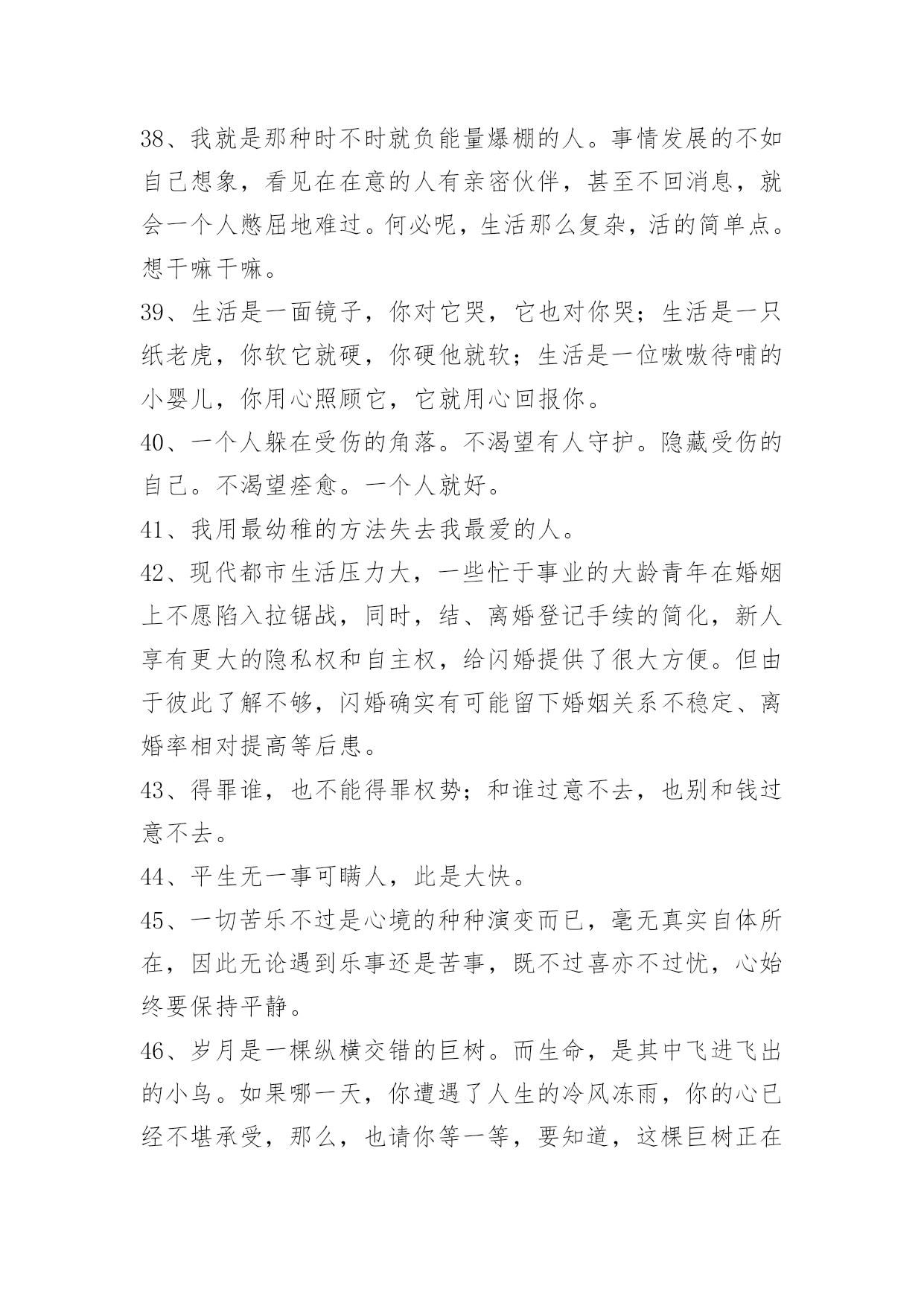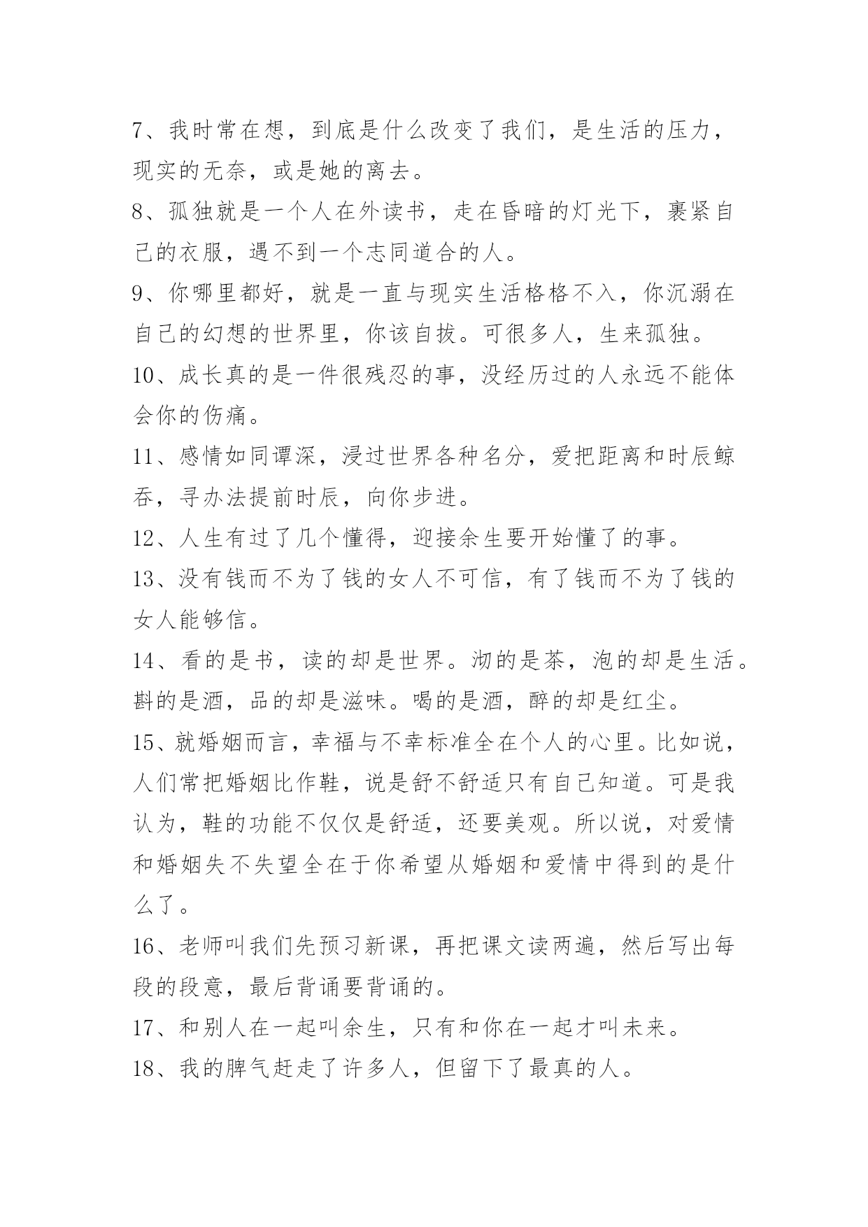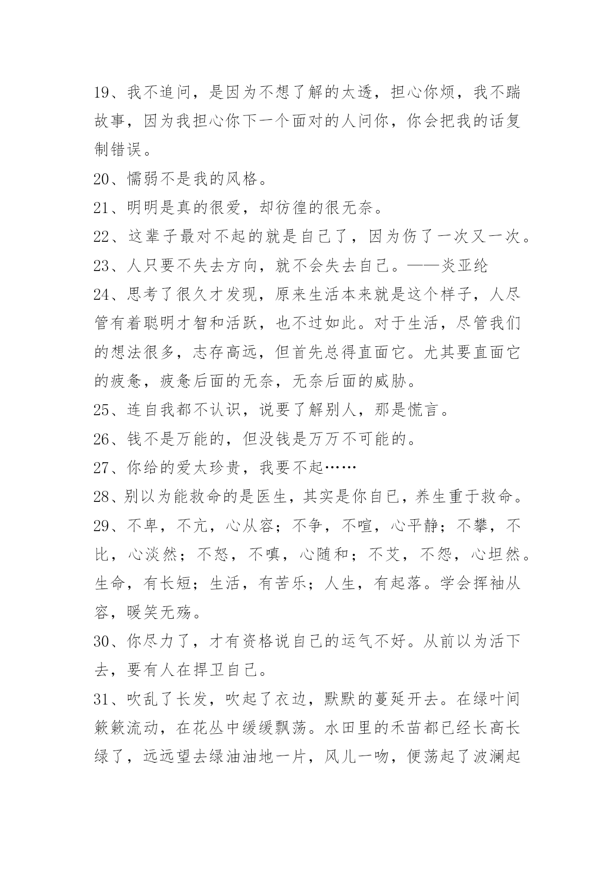 生活唯美感言句子生活唯美感言句子汇总50句精选把自己丢进这孤独的夜里。任凭着寂寞一点一点地侵入我的内脏。这篇文章是小编收集整理的生活唯美感言句子,供大家参考,希望能够对大家有所帮助。1、以前我爱慕大圣的张狂,放荡不羁,直至现在才懂大圣不过如同凡人在做这为了自由的挣扎。2、时间如流水,它在催促我们长大,我觉得吧,催人长大的不是时间啊,是自己。3、美好如约而至,善良从不缺席,走在一条安逸的街,想念着想念的人。以前我们总想着要惊天动地,渐渐长大才明白眼前的小平凡和小幸福才最难能可贵。4、人们会因为他的普通平凡认为我的决定理所应当。但在我眼里,他既不普通也不平凡,只是我真爱他他不真爱我而已。5、对你突然发火的人,你不知道他在心里忍了你多少次;看起来决绝果断的人,你不知道他在心里下定了多少次决心,才能真正做到不回头;闪闪发光如同信仰存在的人,你不知道他背后付出的代价和努力,让他看起来毫不费力。别怪他们太冷漠,别羡慕他们很果断,别说他们不付出,只是你不知道而已。——卢思浩《只是你不知道而已》6、我揣着我和他的故事等待他离开我的日子,也许是冬天,也许是夏天,也许是今天,也许是明天。7、我时常在想,到底是什么改变了我们,是生活的压力,现实的无奈,或是她的离去。8、孤独就是一个人在外读书,走在昏暗的灯光下,裹紧自己的衣服,遇不到一个志同道合的人。9、你哪里都好,就是一直与现实生活格格不入,你沉溺在自己的幻想的世界里,你该自拔。可很多人,生来孤独。10、成长真的是一件很残忍的事,没经历过的人永远不能体会你的伤痛。11、感情如同谭深,浸过世界各种名分,爱把距离和时辰鲸吞,寻办法提前时辰,向你步进。12、人生有过了几个懂得,迎接余生要开始懂了的事。13、没有钱而不为了钱的女人不可信,有了钱而不为了钱的女人能够信。14、看的是书,读的却是世界。沏的是茶,泡的却是生活。斟的是酒,品的却是滋味。喝的是酒,醉的却是红尘。15、就婚姻而言,幸福与不幸标准全在个人的心里。比如说,人们常把婚姻比作鞋,说是舒不舒适只有自己知道。可是我认为,鞋的功能不仅仅是舒适,还要美观。所以说,对爱情和婚姻失不失望全在于你希望从婚姻和爱情中得到的是什么了。16、老师叫我们先预习新课,再把课文读两遍,然后写出每段的段意,最后背诵要背诵的。17、和别人在一起叫余生,只有和你在一起才叫未来。18、我的脾气赶走了许多人,但留下了最真的人。19、我不追问,是因为不想了解的太透,担心你烦,我不踹故事,因为我担心你下一个面对的人问你,你会把我的话复制错误。20、懦弱不是我的风格。21、明明是真的很爱,却彷徨的很无奈。22、这辈子最对不起的就是自己了,因为伤了一次又一次。23、人只要不失去方向,就不会失去自己。——炎亚纶24、思考了很久才发现,原来生活本来就是这个样子,人尽管有着聪明才智和活跃,也不过如此。对于生活,尽管我们的想法很多,志存高远,但首先总得直面它。尤其要直面它的疲惫,疲惫后面的无奈,无奈后面的威胁。25、连自我都不认识,说要了解别人,那是慌言。26、钱不是万能的,但没钱是万万不可能的。27、你给的爱太珍贵,我要不起……28、别以为能救命的是医生,其实是你自已,养生重于救命。29、不卑,不亢,心从容;不争,不喧,心平静;不攀,不比,心淡然;不怒,不嗔,心随和;不艾,不怨,心坦然。生命,有长短;生活,有苦乐;人生,有起落。学会挥袖从容,暖笑无殇。30、你尽力了,才有资格说自己的运气不好。从前以为活下去,要有人在捍卫自己。31、吹乱了长发,吹起了衣边,默默的蔓延开去。在绿叶间簌簌流动,在花丛中缓缓飘荡。水田里的禾苗都已经长高长绿了,远远望去绿油油地一片,风儿一吻,便荡起了波澜起伏的绿浪。眼前地一切都是惬意的,美好的。32、微笑不必须就是开心,有时,微笑只说明你很坚强。你自己选取的路、跪着也要把它走完。别把人生想的太难。走过生命的逆旅,人世沧桑,谁都会彷徨会忧伤,会有苦雨寒箫的幽怨,也会有月落乌啼的悲凉,但有限的生命不允许我们挥霍那份属于人生的苦辣酸甜,经历了风寒阴霾的苦砺,才会破茧在阳光明媚的日子。33、漫漫长路,我无心选择一个人走。看过那么多故事,真正感人的爱情,莫不是平平淡淡相守一生,把平凡的生活过得不再平凡;就是一起共患难,享苦乐,相依相守,不离不弃,用岁月共同守护一份真情、一份坚持。34、尽管时间带走我们想聚的时刻,欢乐悲喜有我陪你走每一个角落。35、带球的快乐,射门的精彩,疯狂的呐喊,飞扬的青春,火热的激情,无限的活力,足球的精彩,尽情的绽放。世界足球日,踢快乐足球,让笑容在脸上荡漾,走幸福人生,让生活充满阳光!36、人们总是怀念过去的事物,愈是怀念,愈是不满于现在的生活,过去的已经过去了,时间只会往前走,却不会倒流。37、转眼一年过去了,我们早已熟到一起早饭,一起逛街,一