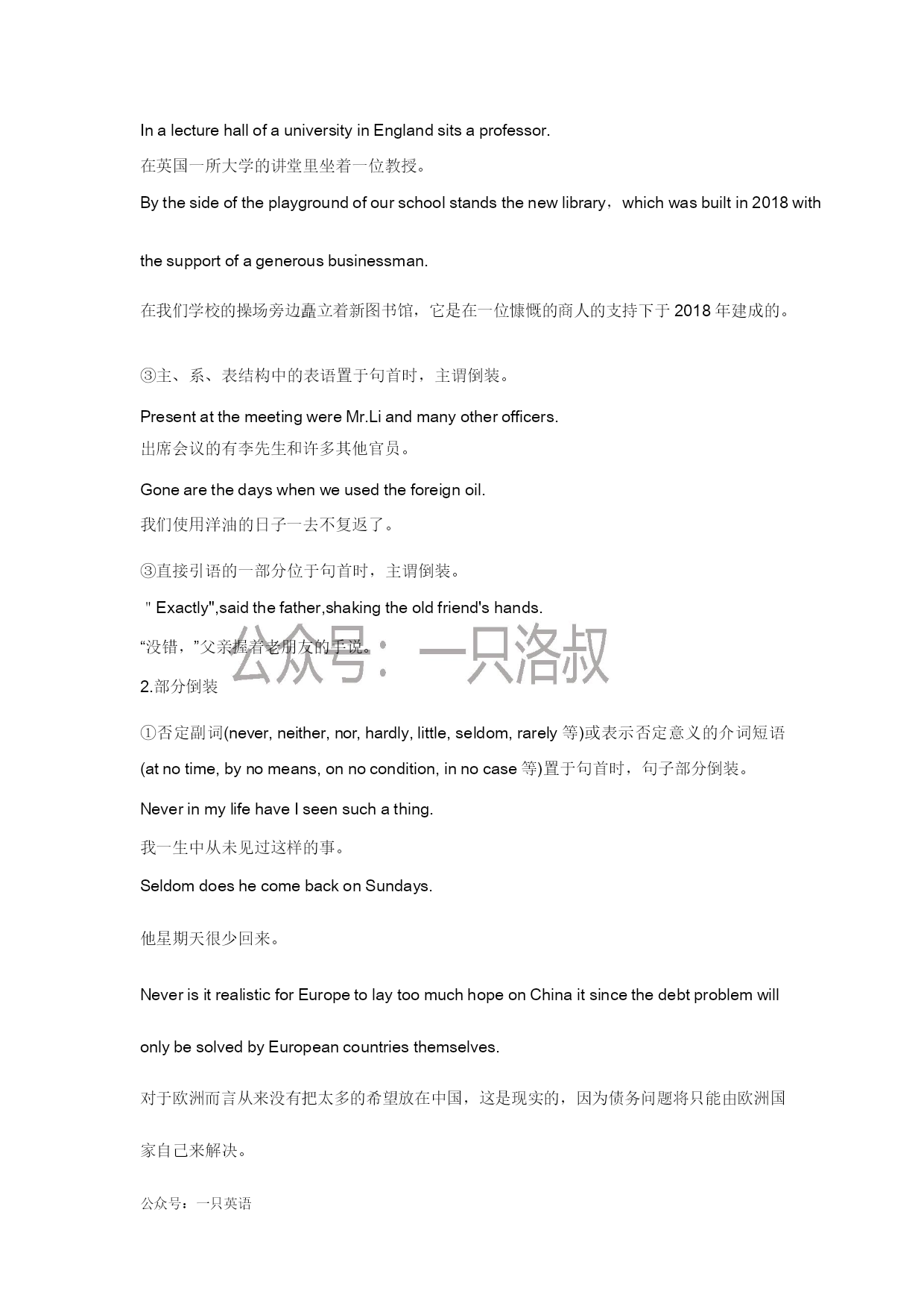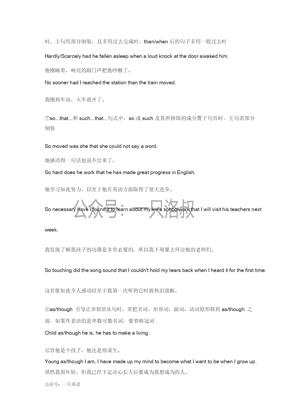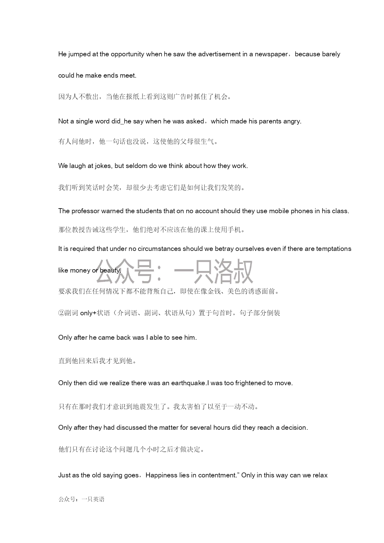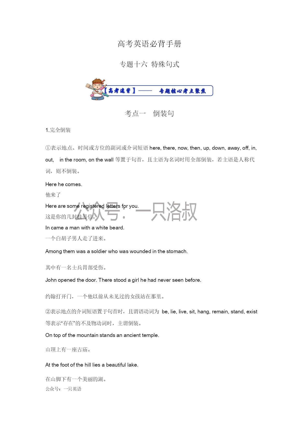 高考英语必背手册专题十六特殊句式考点一倒装句1.完全倒装①表示地点、时间或方位的副词或介词短语here,there,now,then,up,down,away,off,in,out,intheroom,onthewall等置于句首,且主语为名词时用全部倒装,若主语是人称代词,则不倒装。Herehecomes.他来了Herearesomeregisteredlettersforyou.这是你的几封挂号信。Incameamanwithawhitebeard.一个白胡子男人走了进来。Amongthemwasasoldierwhowaswoundedinthestomach.其中有一名士兵胃部受伤。Johnopenedthedoor.Therestoodagirlhehadneverseenbefore.约翰打开门,一个他以前从未见过的女孩站在那里。②表示地点的介词短语置于句首时,且谓语动词为be,lie,live,sit,hang,remain,stand,exist等表示“存在”的不及物动词时,主谓倒装。Ontopofthemountainstandsanancienttemple.山顶上有一座古庙。Atthefootofthehillliesabeautifullake.在山脚下有一个美丽的湖。公众号:一只英语InalecturehallofauniversityinEnglandsitsaprofessor.在英国一所大学的讲堂里坐着一位教授。Bythesideoftheplaygroundofourschoolstandsthenewlibrary,whichwasbuiltin2018withthesupportofagenerousbusinessman.在我们学校的操场旁边矗立着新图书馆,它是在一位慷慨的商人的支持下于2018年建成的。③主、系、表结构中的表语置于句首时,主谓倒装。PresentatthemeetingwereMr.Liandmanyotherofficers.出席会议的有李先生和许多其他官员。Gonearethedayswhenweusedtheforeignoil.我们使用洋油的日子一去不复返了。③直接引语的一部分位于句首时,主谓倒装。"Exactly",saidthefather,shakingtheoldfriend'shands.“没错,”父亲握着老朋友的手说。2.部分倒装①否定副词(never,neither,nor,hardly,little,seldom,rarely等)或表示否定意义的介词短语(atnotime,bynomeans,onnocondition,innocase等)置于句首时,句子部分倒装。NeverinmylifehaveIseensuchathing.我一生中从未见过这样的事。SeldomdoeshecomebackonSundays.他星期天很少回来。NeverisitrealisticforEuropetolaytoomuchhopeonChinaitsincethedebtproblemwillonlybesolvedbyEuropeancountriesthemselves.对于欧洲而言从来没有把太多的希望放在中国,这是现实的,因为债务问题将只能由欧洲国家自己来解决。公众号:一只英语Hejumpedattheopportunitywhenhesawtheadvertisementinanewspaper,becausebarelycouldhemakeendsmeet.因为人不敷出,当他在报纸上看到这则广告时抓住了机会。Notasingleworddid_hesaywhenhewasasked,whichmadehisparentsangry.有人问他时,他一句话也没说,这使他的父母很生气。Welaughatjokes,butseldomdowethinkabouthowtheywork.我们听到笑话时会笑,却很少去考虑它们是如何让我们发笑的。Theprofessorwarnedthestudentsthatonnoaccountshouldtheyusemobilephonesinhisclass.那位教授告诫这些学生,他们绝对不应该在他的课上使用手机。Itisrequiredthatundernocircumstancesshouldwebetrayourselveseveniftherearetemptationslikemoneyorbeauty.要求我们在任何情况下都不能背叛自己,即使在像金钱、美色的诱惑面前。②