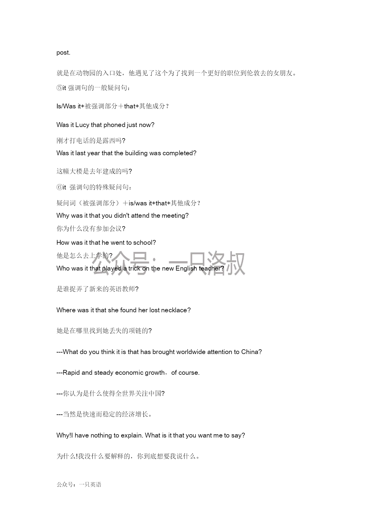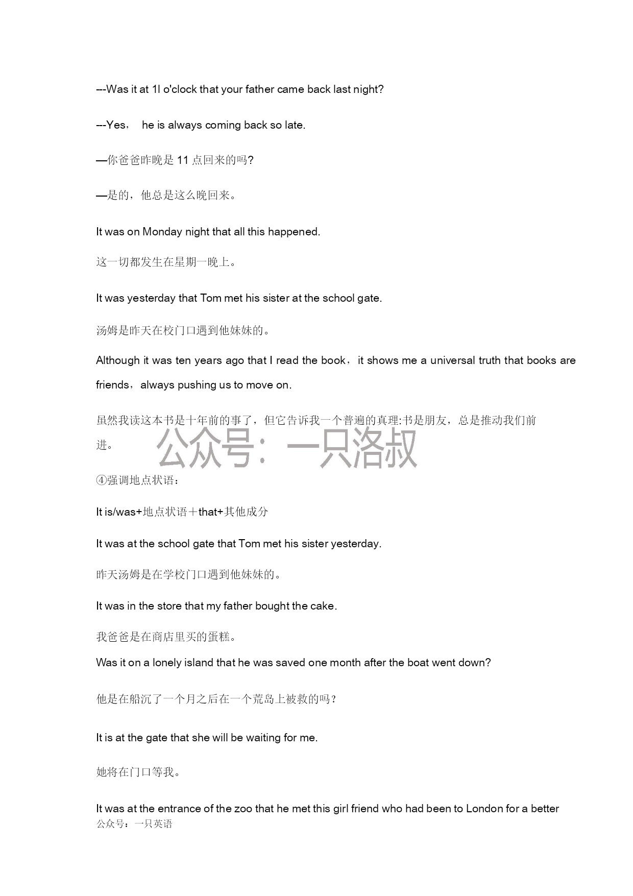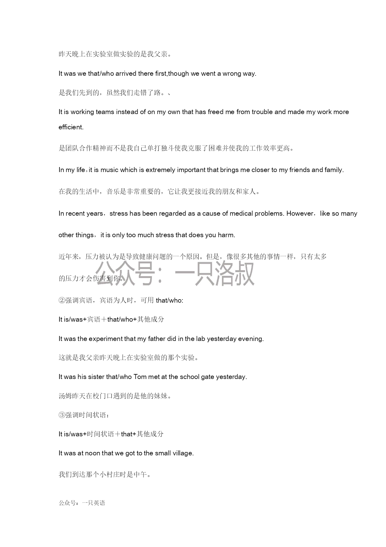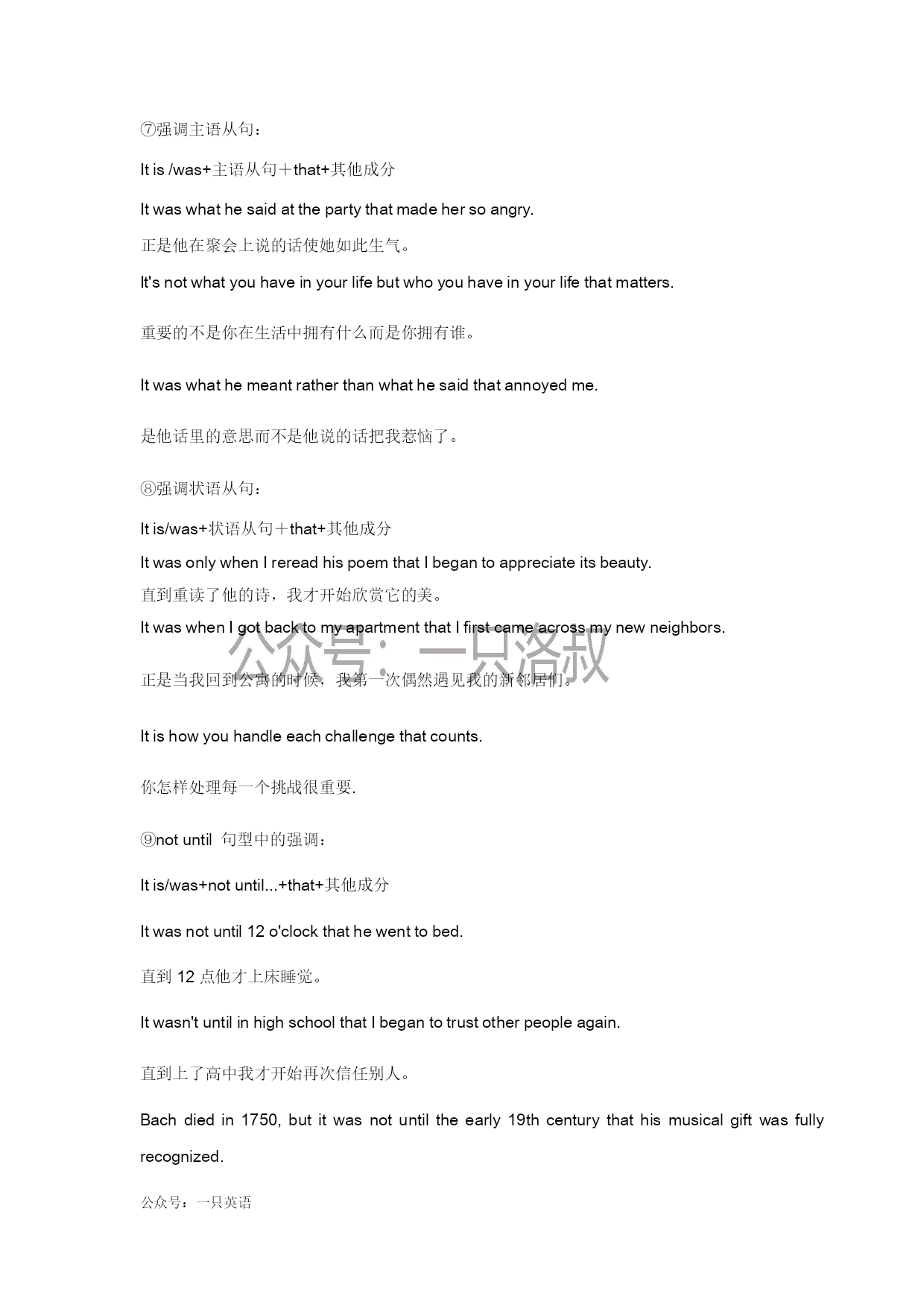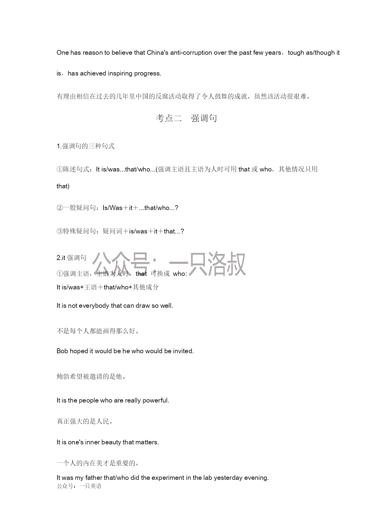 高考英语必背手册专题十六特殊句式考点一倒装句1.完全倒装①表示地点、时间或方位的副词或介词短语here,there,now,then,up,down,away,off,in,out,intheroom,onthewall等置于句首,且主语为名词时用全部倒装,若主语是人称代词,则不倒装。Herehecomes.他来了Herearesomeregisteredlettersforyou.这是你的几封挂号信。Incameamanwithawhitebeard.一个白胡子男人走了进来。Amongthemwasasoldierwhowaswoundedinthestomach.其中有一名士兵胃部受伤。Johnopenedthedoor.Therestoodagirlhehadneverseenbefore.约翰打开门,一个他以前从未见过的女孩站在那里。②表示地点的介词短语置于句首时,且谓语动词为be,lie,live,sit,hang,remain,stand,exist等表示“存在”的不及物动词时,主谓倒装。Ontopofthemountainstandsanancienttemple.山顶上有一座古庙。Atthefootofthehillliesabeautifullake.在山脚下有一个美丽的湖。公众号:一只英语InalecturehallofauniversityinEnglandsitsaprofessor.在英国一所大学的讲堂里坐着一位教授。Bythesideoftheplaygroundofourschoolstandsthenewlibrary,whichwasbuiltin2018withthesupportofagenerousbusinessman.在我们学校的操场旁边矗立着新图书馆,它是在一位慷慨的商人的支持下于2018年建成的。③主、系、表结构中的表语置于句首时,主谓倒装。PresentatthemeetingwereMr.Liandmanyotherofficers.出席会议的有李先生和许多其他官员。Gonearethedayswhenweusedtheforeignoil.我们使用洋油的日子一去不复返了。③直接引语的一部分位于句首时,主谓倒装。"Exactly",saidthefather,shakingtheoldfriend'shands.“没错,”父亲握着老朋友的手说。2.部分倒装①否定副词(never,neither,nor,hardly,little,seldom,rarely等)或表示否定意义的介词短语(atnotime,bynomeans,onnocondition,innocase等)置于句首时,句子部分倒装。NeverinmylifehaveIseensuchathing.我一生中从未见过这样的事。SeldomdoeshecomebackonSundays.他星期天很少回来。NeverisitrealisticforEuropetolaytoomuchhopeonChinaitsincethedebtproblemwillonlybesolvedbyEuropeancountriesthemselves.对于欧洲而言从来没有把太多的希望放在中国,这是现实的,因为债务问题将只能由欧洲国家自己来解决。公众号:一只英语Hejumpedattheopportunitywhenhesawtheadvertisementinanewspaper,becausebarelycouldhemakeendsmeet.因为人不敷出,当他在报纸上看到这则广告时抓住了机会。Notasingleworddid_hesaywhenhewasasked,whichmadehisparentsangry.有人问他时,他一句话也没说,这使他的父母很生气。Welaughatjokes,butseldomdowethinkabouthowtheywork.我们听到笑话时会笑,却很少去考虑它们是如何让我们发笑的。Theprofessorwarnedthestudentsthatonnoaccountshouldtheyusemobilephonesinhisclass.那位教授告诫这些学生,他们绝对不应该在他的课上使用手机。Itisrequiredthatundernocircumstancesshouldwebetrayourselveseveniftherearetemptationslikemoneyorbeauty.要求我们在任何情况下都不能背叛自己,即使在像金钱、美色的诱惑面前。②