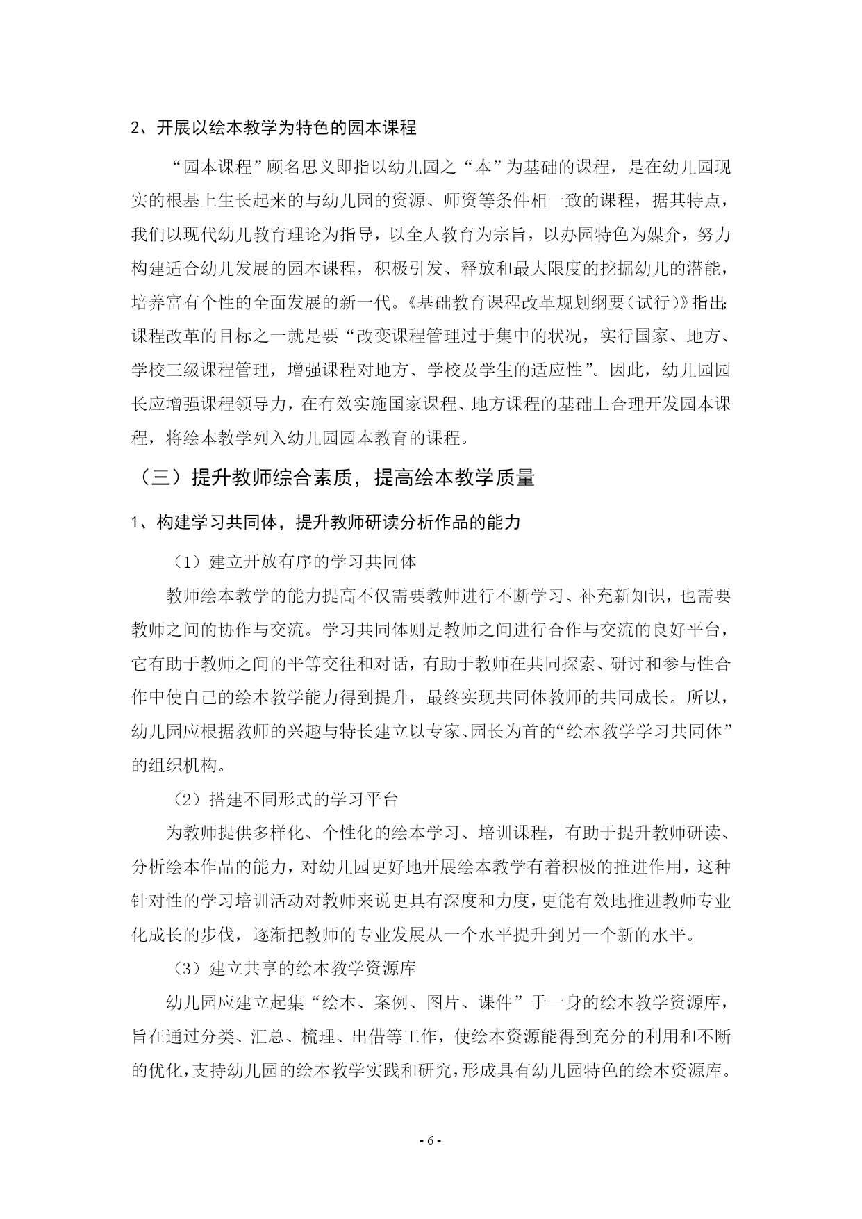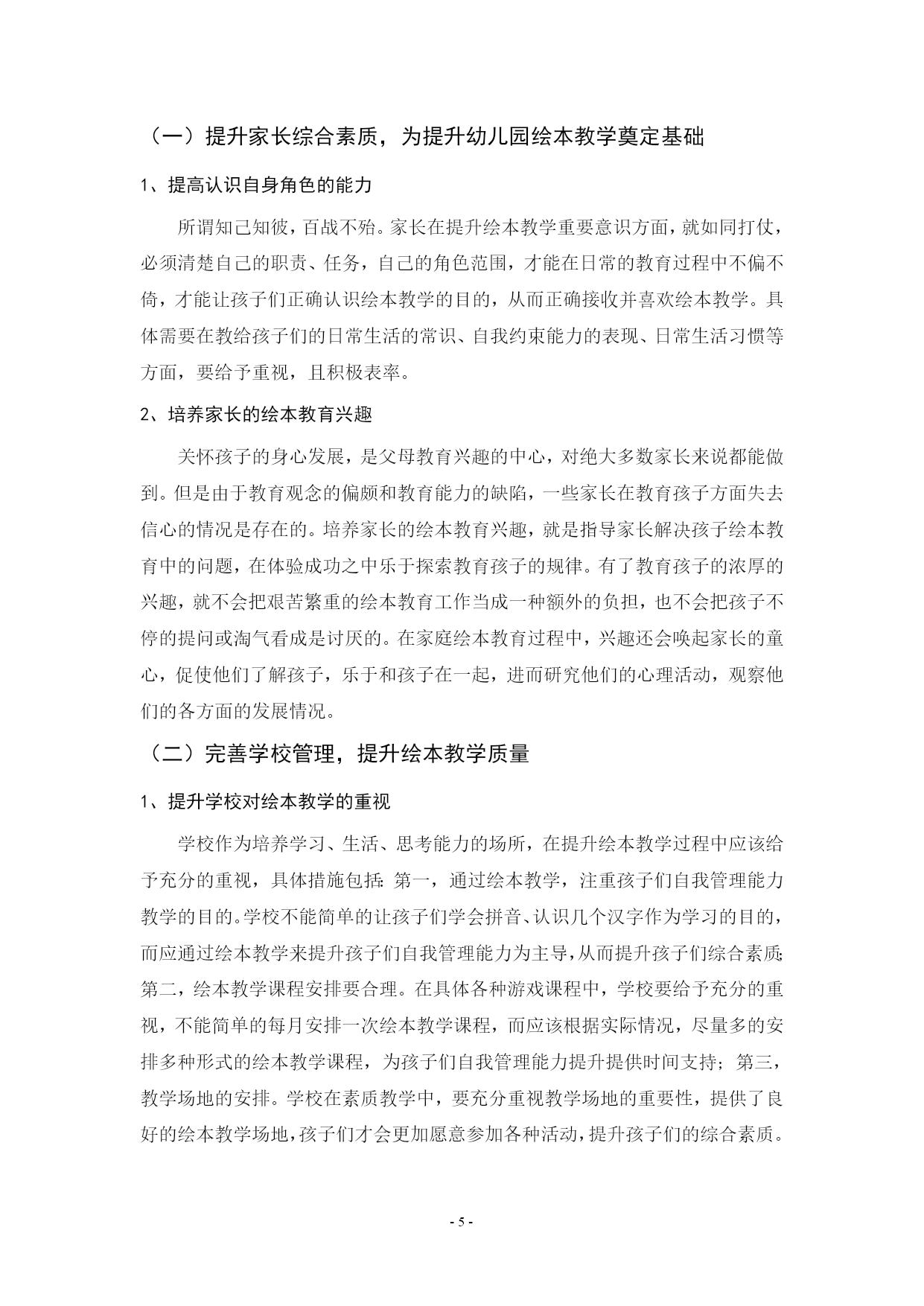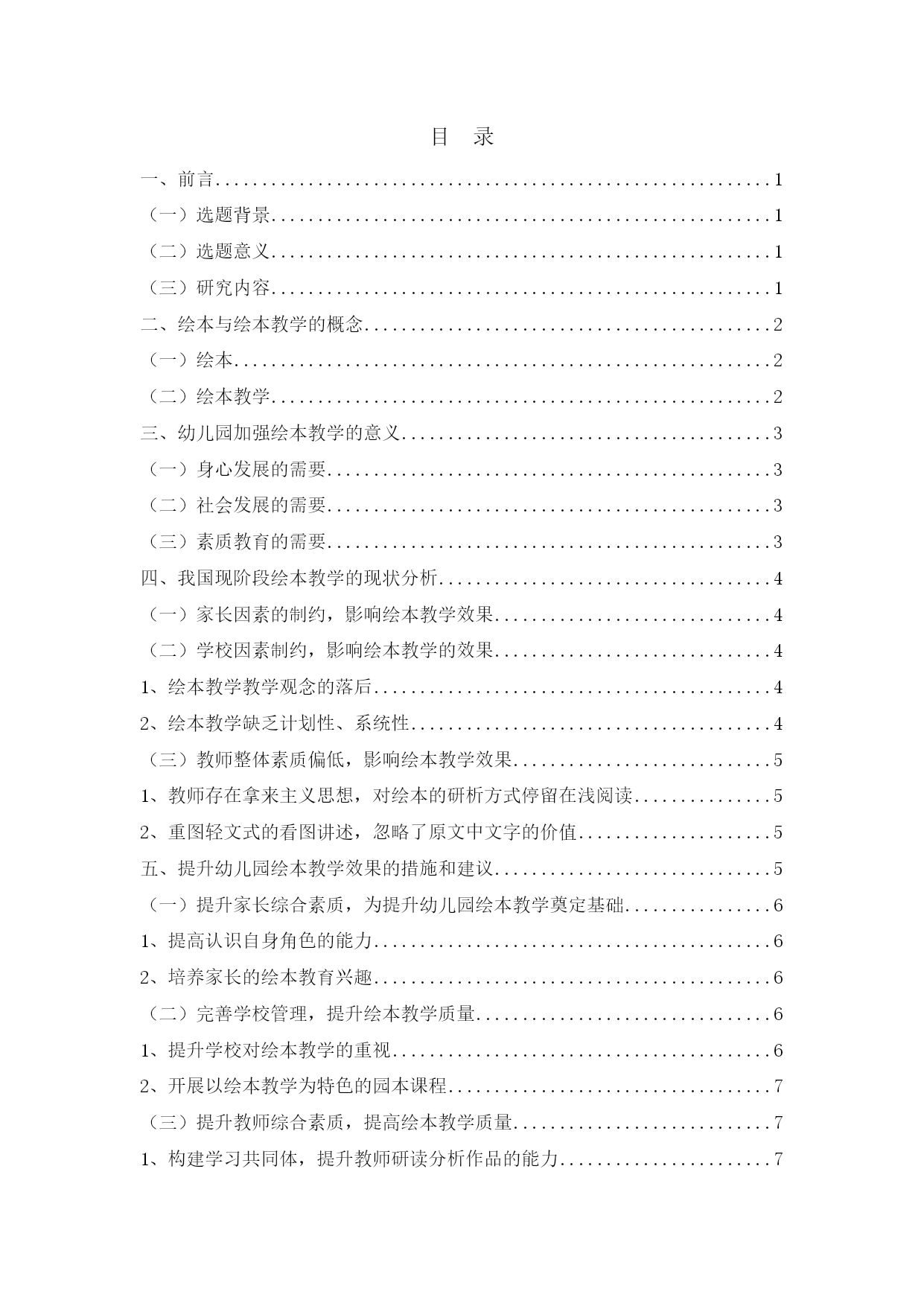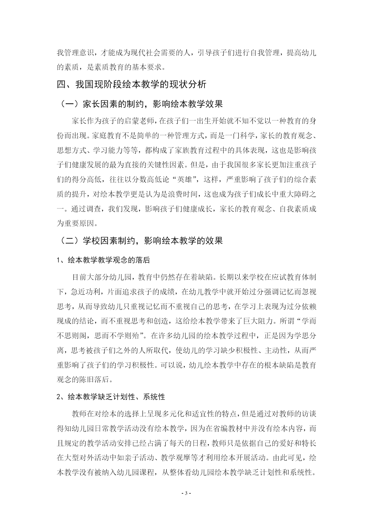 浅谈绘本教学对幼儿发展的影响摘要绘本是二十一世纪国际公认的、最适合幼儿阅读的图画书,作为儿童早期阅读材料的新生力量契合了纲要目标,对幼儿发展有重要的意义,然而目前幼儿园的绘本教学水平参差不齐,极大的造成了绘本教育价值的缺失。本文首先介绍了选题背景与选题意义,第二部分对绘本和绘本教学的相关概念进行了介绍,第三部分分析了绘本教学的重要性,第四部分对我国现阶段幼儿园绘本教学过程中的不足进行了分析和介绍,第四部分针对出现的问题,提出了完善幼儿园绘本教学的措施和建议。关键词:绘本教学;幼儿园;缺失;措施AbstractPicturebookisthetwenty-firstCenturyinternationalrecognized,themostsuitableforchildrentoreadpicturebooks,aschildren'searlyreadingnewmaterialswithprogramobjectives,isofimportantsignificanceforthedevelopmentofchildren,butthecurrentkindergartenpicturebookteachingleveluneven,whichcreatedalackofbookvalueofeducation.Thispaperintroducesthetopicbackgroundandthesignificanceofthetopic,thesecondpartrelatedconceptsofpicturebooksandpicturebooksteachingisintroducedinthispaper,thethirdpartanalyzestheimportanceofpicturebooks,thefourthpartanalyzesandintroducestheproblemsofourpresentkindergartenpicturebooksintheteachingprocess,thefourthpartinviewoftheproblems,putsforwardimprovementmeasureskindergartenpicturebookteachingandsuggestionsKeywords:picturebookteachingkindergartendeletionmeasures目录TOC\o"1-3"\h\z\uHYPERLINK\l"_Toc352229237"一、前言PAGEREF_Toc352229237\h1HYPERLINK\l"_Toc352229238"(一)选题背景PAGEREF_Toc352229238\h1HYPERLINK\l"_Toc352229239"(二)选题意义PAGEREF_Toc352229239\h1HYPERLINK\l"_Toc352229240"(三)研究内容PAGEREF_Toc352229240\h1HYPERLINK\l"_Toc352229241"二、绘本与绘本教学的概念PAGEREF_Toc352229241\h2HYPERLINK\l"_Toc352229242"(一)绘本PAGEREF_Toc352229242\h2HYPERLINK\l"_Toc352229243"(二)绘本教学PAGEREF_Toc352229243\h2HYPERLINK\l"_Toc352229244"三、幼儿园加强绘本教学的意义PAGEREF_Toc352229244\h3HYPERLINK\l"_Toc352229245"(一)身心发展的需要PAGEREF_Toc352229245\h3HYPERLINK\l"_Toc352229246"(二)社会发展的需要PAGEREF_Toc352229246\h3HYPERLINK\l"_Toc352229247"(三)素质教育的需要PAGEREF_Toc352229247\h3HYPERLINK\l"_Toc352229248"四、我国现阶段绘本教学的现状分析PAGEREF_Toc352229248\h4HYPERLINK\l"_Toc352229249"(一)家长因素的制约,影响绘本教学效果PAGEREF_Toc352229249\h4HYPERLINK\l"_Toc352229250"(二)学校因素制约,影响绘本教学的效果PAGEREF_Toc3