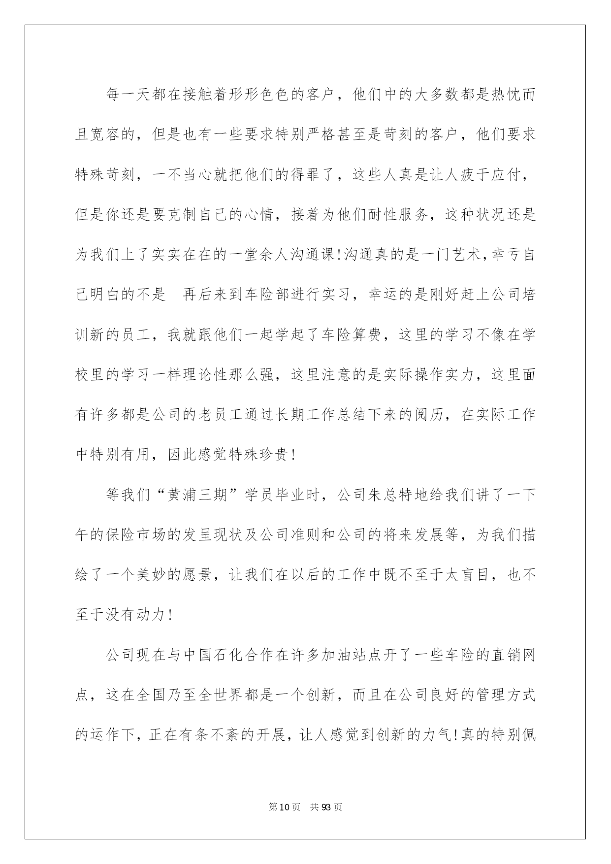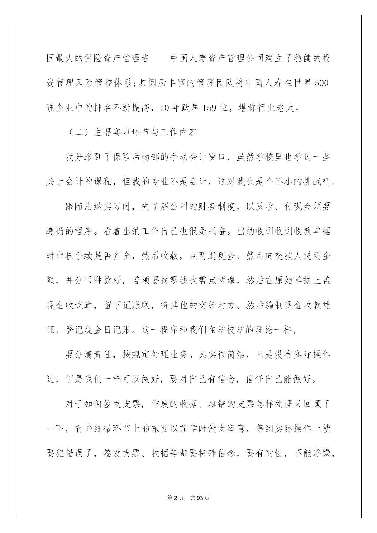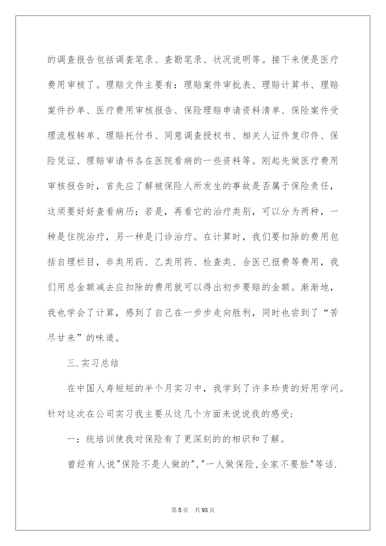 第PAGE\*Arabic\*MERGEFORMAT93页共NUMPAGES\*Arabic\*MERGEFORMAT93页第PAGE\*MERGEFORMAT93页共NUMPAGES\*MERGEFORMAT93页第PAGE\*MERGEFORMAT93页共NUMPAGES\*MERGEFORMAT93页第PAGE\*MERGEFORMAT93页共NUMPAGES\*MERGEFORMAT93页第PAGE\*MERGEFORMAT93页共NUMPAGES\*MERGEFORMAT93页第PAGE\*MERGEFORMAT93页共NUMPAGES\*MERGEFORMAT93页第PAGE\*MERGEFORMAT93页共NUMPAGES\*MERGEFORMAT93页第PAGE\*MERGEFORMAT93页共NUMPAGES\*MERGEFORMAT93页第PAGE\*MERGEFORMAT93页共NUMPAGES\*MERGEFORMAT93页第PAGE\*MERGEFORMAT93页共NUMPAGES\*MERGEFORMAT93页第PAGE\*MERGEFORMAT93页共NUMPAGES\*MERGEFORMAT93页2022保险实习报告保险实习报告在日常生活和工作中,报告的适用范围越来越广泛,写报告的时候要留意内容的完整。在写之前,可以先参考范文,以下是我细心整理的保险实习报告,仅供参考,大家一起来看看吧。保险实习报告1一、实习目的学习了解保险行业及其营销运作状况,在此基础上把所学的商务和营销理论学问与工作实践紧密结合起来,培育实际工作操作实力与分析思索实力,以达到学以致用,并积累肯定的社会处世阅历。二:实习内容(一)公司简介中国人寿保险公司名列我国最具价值品牌前十名,是我国保险行业第一品牌;市场份额将近全国的1/2,拥有最多的全国客户群体和独一无二的全国性多渠道分销网络以及遍布全国的客户服务支持,是中国寿险市场的领导者;随着资产的不断提高,公司已通过为其控股的中国最大的保险资产管理者----中国人寿资产管理公司建立了稳健的投资管理风险管控体系;其阅历丰富的管理团队将中国人寿在世界500强企业中的排名不断提高,10年跃居159位,堪称行业老大。(二)主要实习环节与工作内容我分派到了保险后勤部的手动会计窗口,虽然学校里也学过一些关于会计的课程,但我的专业不是会计,这对我也是个不小的挑战吧。跟随出纳实习时,先了解公司的财务制度,以及收、付现金须要遵循的程序。看着出纳工作自己也很是兴奋。出纳收到收到收款单据时审核手续是否齐全,然后收款,点两遍现金,然后向交款人说明金额,并分币种放好。若须要找零钱也需点两遍,然后在原始单据上盖现金收讫章,留下记账联,将其他的交给对方。然后编制现金收款凭证,登记现金日记账。这一程序和我们在学校学的理论一样,要分清责任,按规定处理业务。其实很简洁,只是没有实际操作过,但是我们一样可以做好,要对自己有信念,信任自己能做好。对于如何签发支票,作废的收据、填错的支票怎样处理又回顾了一下,有些细微环节上的东西以前学时没太留意,等到实际操作上就要犯错误了,签发支票、收据等都要特殊信念,要有耐性,不能浮躁,会计其实是一项比较烦琐的工作,看我们如何对待了,我本人比较喜爱计算,喜爱数字,喜爱把一堆看似一塌糊涂的东西整理的井井有条,所以对待会计肯定要特别特别的谨慎和仔细。刚跟随会计实习时,师傅给我看她处理业务,还给我看了公司的凭证,原始单据,以及明细帐和总帐等,让我总结了出纳的理论与实际的不同处以及会计的理论与实际的不同处。理论学问不是很坚固,有好多地方都很模糊,不知详细该如何做,还须要翻看以前所学的,要把它深化扎根不是很简单啊,还得靠以后工作了在实际操作上去把它扎在心里。会计教给我如何和人们沟通,好多时候都要自己去推断,去确定该如何做,在社会上只能依靠一个人,那就是自己,不要希望别人帮你做点什么,要看看你能帮别人做什么。因本次实习,我还是在理赔部,所以在了解了手动会计后,我们也来了解下人寿保险理赔流程吧:1、假如发生保险事故,您应刚好向保险公司报案,并将相关的资料由自己或托付他人送到保险公司(参观理赔所需单证)。2、保险公司理赔部接到材料后,会立刻立案。如遇重大事故或有疑问的事故,会派专人进行调查。3、调查员依据要求,绽开调查。4、理赔员对材料进行审核,确定事故是否属于保险责任范围,计算出赔付金额。如有疑问可派人调查。作出核赔结论。5、理赔员将审核看法和结论上报,专人签批,签批同意后结案。6、通知您领取赔款或其他书面通知。详细来说理赔的主要步骤是,首先由