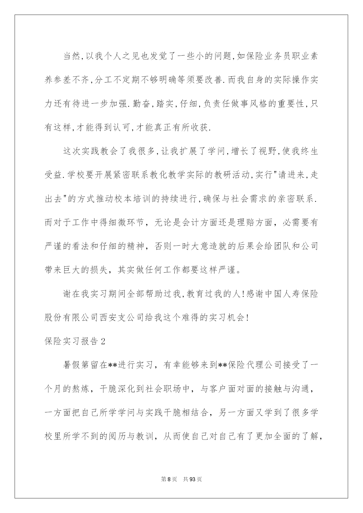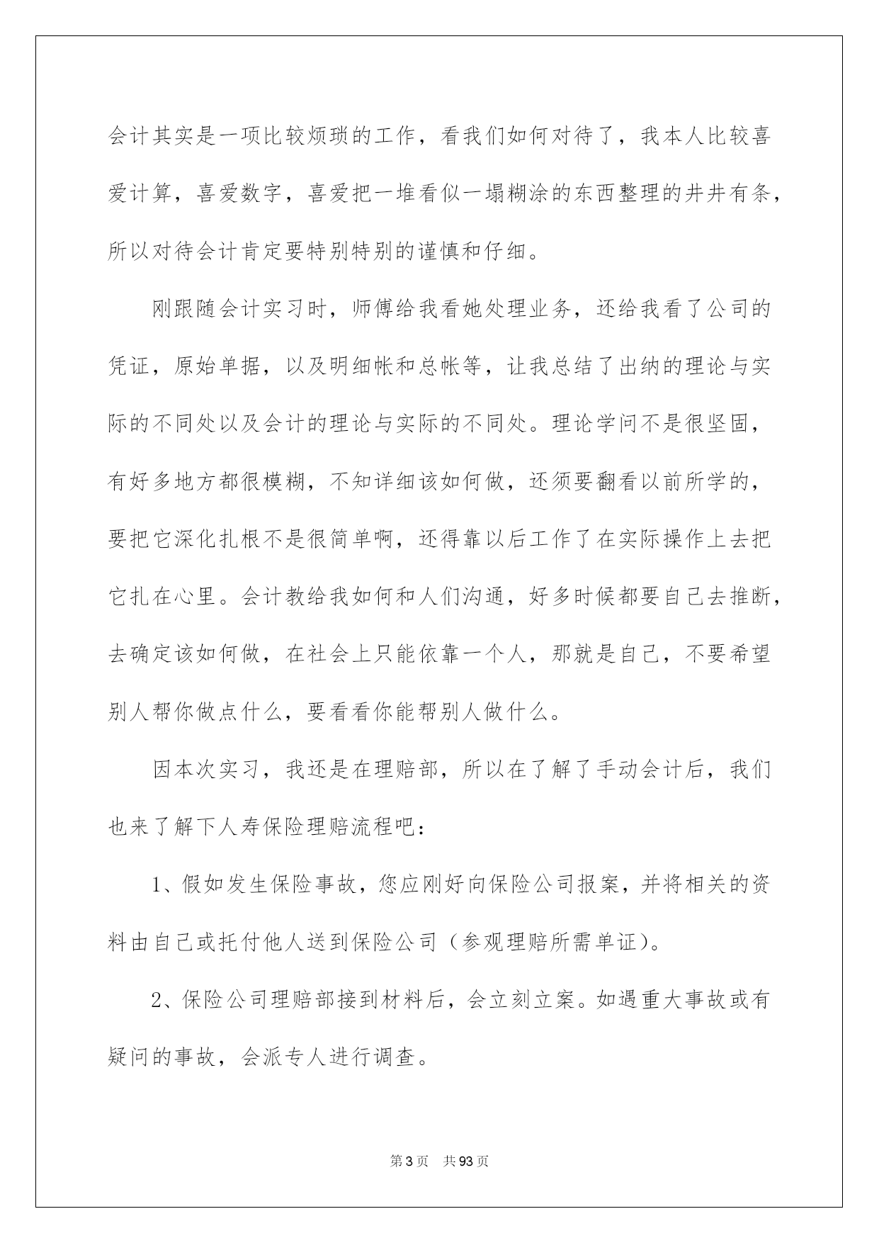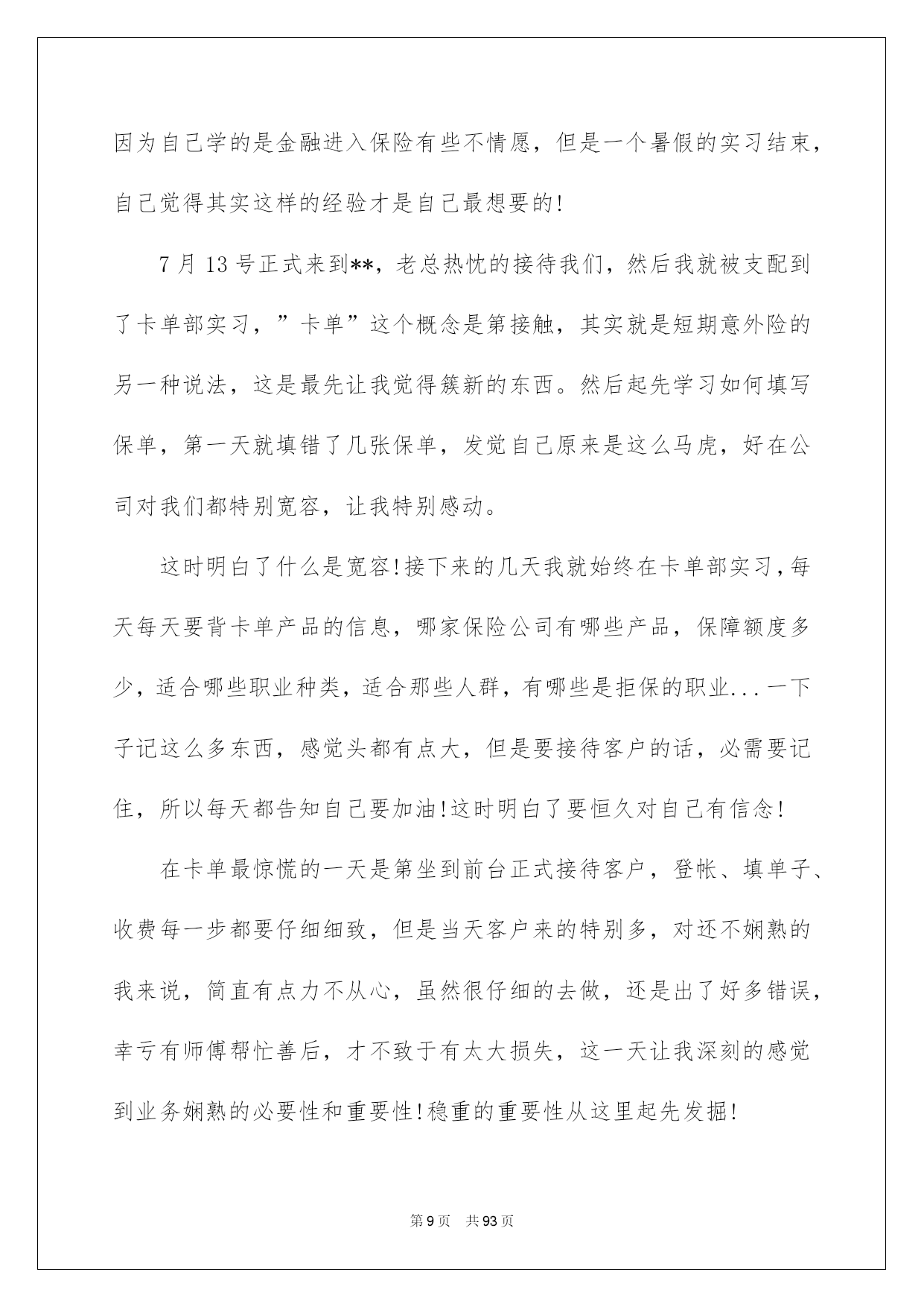 第PAGE\*Arabic\*MERGEFORMAT93页共NUMPAGES\*Arabic\*MERGEFORMAT93页第PAGE\*MERGEFORMAT93页共NUMPAGES\*MERGEFORMAT93页第PAGE\*MERGEFORMAT93页共NUMPAGES\*MERGEFORMAT93页第PAGE\*MERGEFORMAT93页共NUMPAGES\*MERGEFORMAT93页第PAGE\*MERGEFORMAT93页共NUMPAGES\*MERGEFORMAT93页第PAGE\*MERGEFORMAT93页共NUMPAGES\*MERGEFORMAT93页第PAGE\*MERGEFORMAT93页共NUMPAGES\*MERGEFORMAT93页第PAGE\*MERGEFORMAT93页共NUMPAGES\*MERGEFORMAT93页第PAGE\*MERGEFORMAT93页共NUMPAGES\*MERGEFORMAT93页第PAGE\*MERGEFORMAT93页共NUMPAGES\*MERGEFORMAT93页第PAGE\*MERGEFORMAT93页共NUMPAGES\*MERGEFORMAT93页2022保险实习报告保险实习报告在日常生活和工作中,报告的适用范围越来越广泛,写报告的时候要留意内容的完整。在写之前,可以先参考范文,以下是我细心整理的保险实习报告,仅供参考,大家一起来看看吧。保险实习报告1一、实习目的学习了解保险行业及其营销运作状况,在此基础上把所学的商务和营销理论学问与工作实践紧密结合起来,培育实际工作操作实力与分析思索实力,以达到学以致用,并积累肯定的社会处世阅历。二:实习内容(一)公司简介中国人寿保险公司名列我国最具价值品牌前十名,是我国保险行业第一品牌;市场份额将近全国的1/2,拥有最多的全国客户群体和独一无二的全国性多渠道分销网络以及遍布全国的客户服务支持,是中国寿险市场的领导者;随着资产的不断提高,公司已通过为其控股的中国最大的保险资产管理者----中国人寿资产管理公司建立了稳健的投资管理风险管控体系;其阅历丰富的管理团队将中国人寿在世界500强企业中的排名不断提高,10年跃居159位,堪称行业老大。(二)主要实习环节与工作内容我分派到了保险后勤部的手动会计窗口,虽然学校里也学过一些关于会计的课程,但我的专业不是会计,这对我也是个不小的挑战吧。跟随出纳实习时,先了解公司的财务制度,以及收、付现金须要遵循的程序。看着出纳工作自己也很是兴奋。出纳收到收到收款单据时审核手续是否齐全,然后收款,点两遍现金,然后向交款人说明金额,并分币种放好。若须要找零钱也需点两遍,然后在原始单据上盖现金收讫章,留下记账联,将其他的交给对方。然后编制现金收款凭证,登记现金日记账。这一程序和我们在学校学的理论一样,要分清责任,按规定处理业务。其实很简洁,只是没有实际操作过,但是我们一样可以做好,要对自己有信念,信任自己能做好。对于如何签发支票,作废的收据、填错的支票怎样处理又回顾了一下,有些细微环节上的东西以前学时没太留意,等到实际操作上就要犯错误了,签发支票、收据等都要特殊信念,要有耐性,不能浮躁,会计其实是一项比较烦琐的工作,看我们如何对待了,我本人比较喜爱计算,喜爱数字,喜爱把一堆看似一塌糊涂的东西整理的井井有条,所以对待会计肯定要特别特别的谨慎和仔细。刚跟随会计实习时,师傅给我看她处理业务,还给我看了公司的凭证,原始单据,以及明细帐和总帐等,让我总结了出纳的理论与实际的不同处以及会计的理论与实际的不同处。理论学问不是很坚固,有好多地方都很模糊,不知详细该如何做,还须要翻看以前所学的,要把它深化扎根不是很简单啊,还得靠以后工作了在实际操作上去把它扎在心里。会计教给我如何和人们沟通,好多时候都要自己去推断,去确定该如何做,在社会上只能依靠一个人,那就是自己,不要希望别人帮你做点什么,要看看你能帮别人做什么。因本次实习,我还是在理赔部,所以在了解了手动会计后,我们也来了解下人寿保险理赔流程吧:1、假如发生保险事故,您应刚好向保险公司报案,并将相关的资料由自己或托付他人送到保险公司(参观理赔所需单证)。2、保险公司理赔部接到材料后,会立刻立案。如遇重大事故或有疑问的事故,会派专人进行调查。3、调查员依据要求,绽开调查。4、理赔员对材料进行审核,确定事故是否属于保险责任范围,计算出赔付金额。如有疑问可派人调查。作出核赔结论。5、理赔员将审核看法和结论上报,专人签批,签批同意后结案。6、通知您领取赔款或其他书面通知。详细来说理赔的主要步骤是,首先由