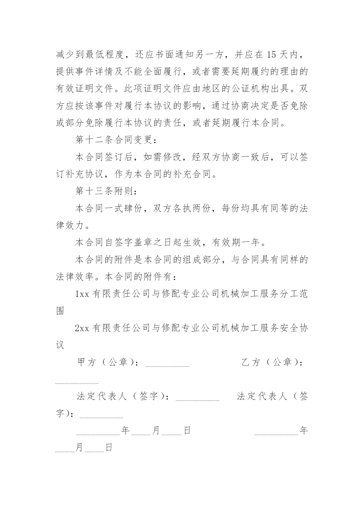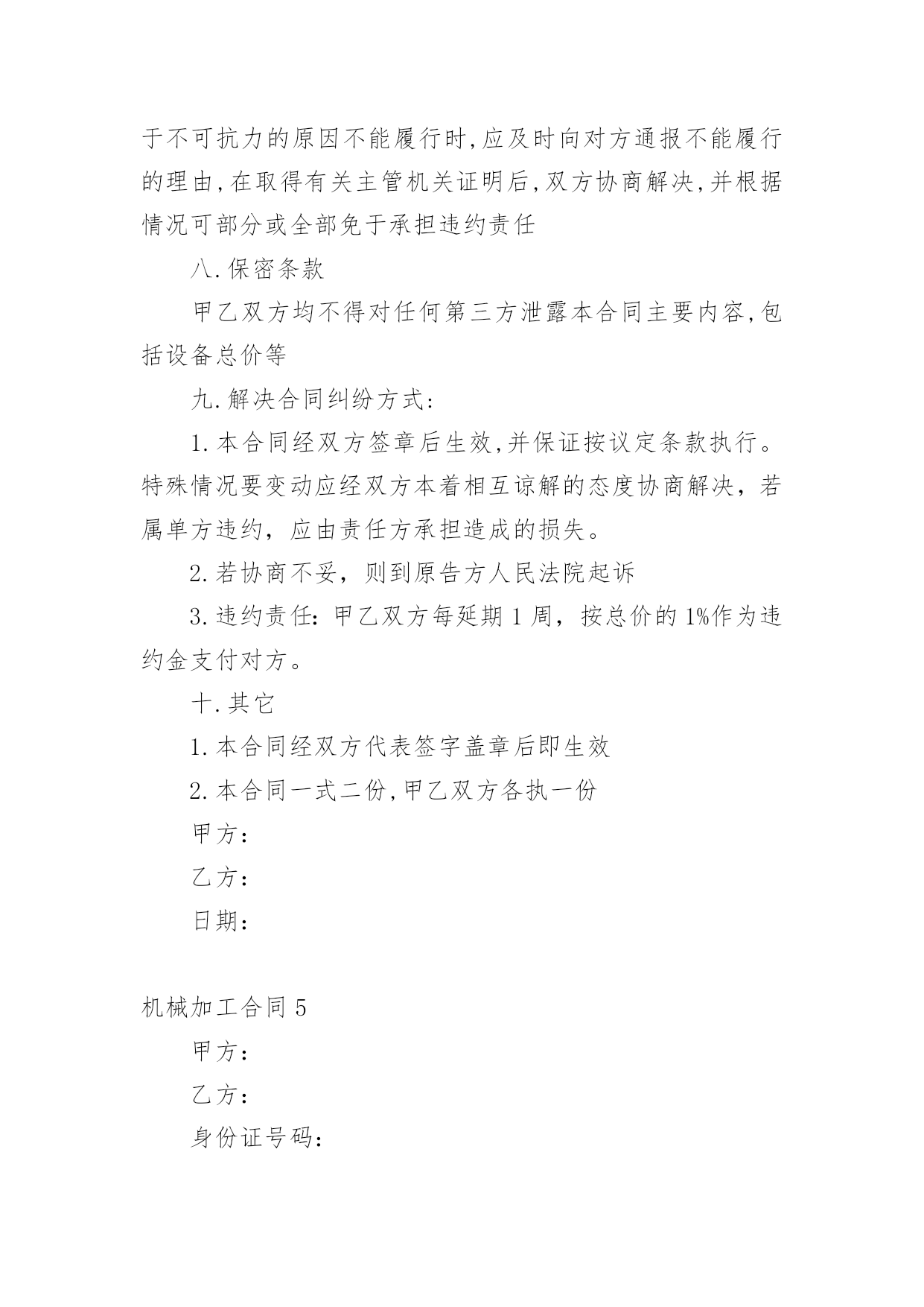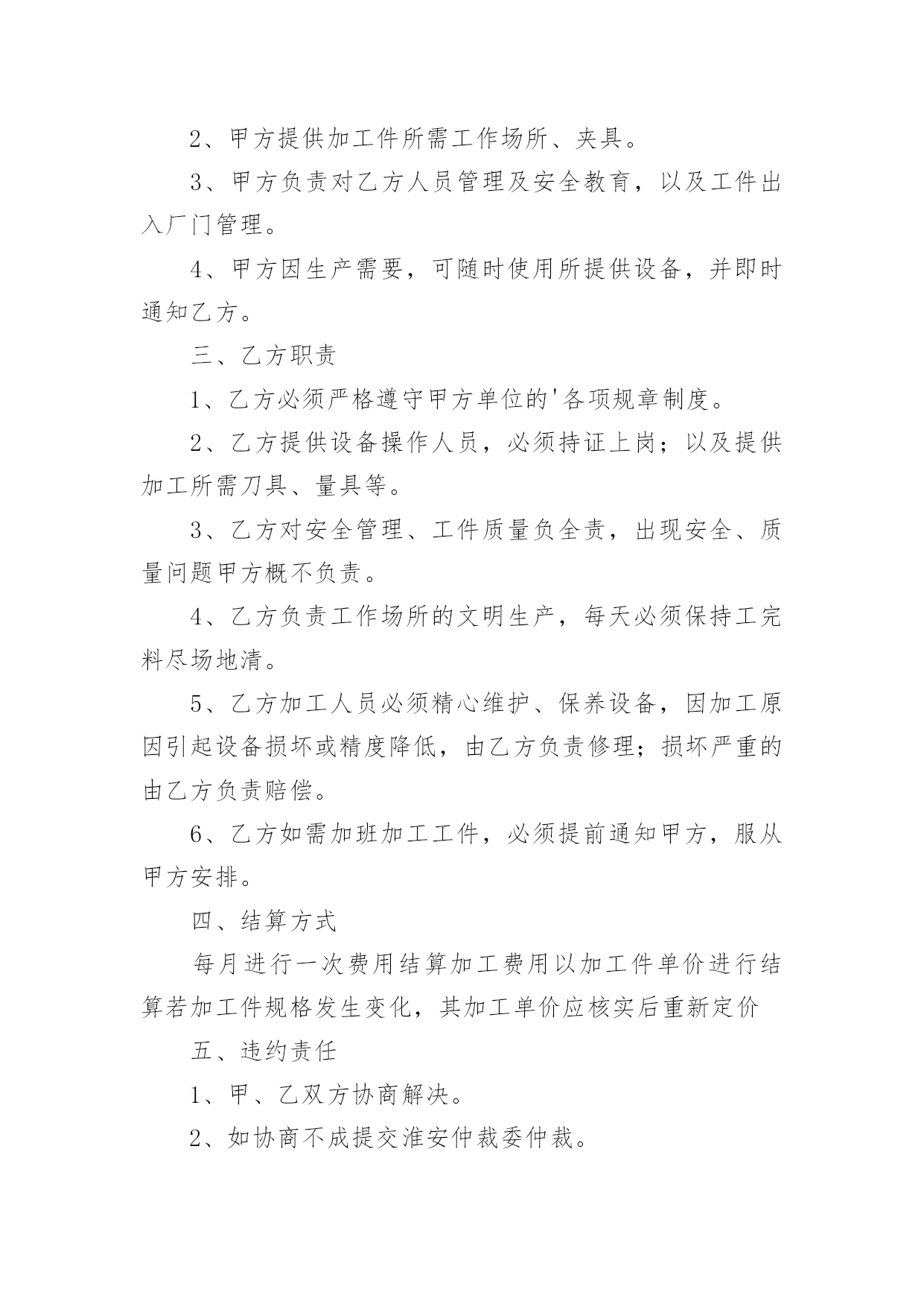 机械加工合同机械加工合同集锦15篇随着人们法律意识的加强,合同出现的次数越来越多,签订合同是为了保障双方的利益,避免不必要的争端。那么常见的合同书是什么样的呢?下面是小编整理的机械加工合同,欢迎大家分享。机械加工合同1甲方:无锡友承机械制造有限公司第一条:乙方按甲方提供的图纸和材料加工零件(见图纸部件加工明细表),总计按甲方提供的每种零件的数量,价格按双方协商所定的的价格(见图纸部件加工明细表)。第二条:乙方须按照外包加工零件清单所列的各项规定,如加工说明、数量、交货日期等确实履行准时交货;延时交货,按总款额的1%/天缴付违约金。第三条:乙方所交的加工品应保质保量,并不得有短缺或不合规格及瑕疵等情况。加工完毕送货至甲方工厂,经过甲方初步验收后入库。(因甲方提供的物料本事质量问题,乙方应及时告知甲方,经过甲方确认,乙方不承担责任)。第四条:通过初步验收的入库货品在甲方再加工时,若发现有不良品时(明显为甲方再加工后的'磨损品除外),则甲方可向乙方要求赔偿或退回乙方重新加工。第五条:付款方式:1、合同双方签订后,甲方预付乙方(人民币)作为合同定金,乙方将零件按时加工完毕,交付甲方工厂,经过甲方验收合格,核算出加工零件总款后,甲方付到本次加工零件总款的%。余款%在甲方第二次订单到货,乙方开具发票与第二次加工零件订单的定金(第二次零件加工订单总款的%)一起支付;以后长期合作以此类推。2、此类付款方式作为双方长期合作的基本条约。甲方(签章):________________乙方(签章):________________20xx年月日机械加工合同2甲方:(以下简称甲方)乙方:(以下简称乙方)一、加工件名称及数量减速箱箱体,数量累计二、甲方职责1、甲方提供加工设备,包括立式车床c5116a、摇臂钻床z3050、5t电动葫芦。2、甲方提供加工件所需工作场所、夹具。3、甲方负责对乙方人员管理及安全教育,以及工件出入厂门管理。4、甲方因生产需要,可随时使用所提供设备,并即时通知乙方。三、乙方职责1、乙方必须严格遵守甲方单位的'各项规章制度。2、乙方提供设备操作人员,必须持证上岗;以及提供加工所需刀具、量具等。3、乙方对安全管理、工件质量负全责,出现安全、质量问题甲方概不负责。4、乙方负责工作场所的文明生产,每天必须保持工完料尽场地清。5、乙方加工人员必须精心维护、保养设备,因加工原因引起设备损坏或精度降低,由乙方负责修理;损坏严重的由乙方负责赔偿。6、乙方如需加班加工工件,必须提前通知甲方,服从甲方安排。四、结算方式每月进行一次费用结算加工费用以加工件单价进行结算若加工件规格发生变化,其加工单价应核实后重新定价五、违约责任1、甲、乙双方协商解决。2、如协商不成提交淮安仲裁委仲裁。3、违约赔偿:以违约造成的实际损失为赔偿依据进行赔偿。六、附则1、本协议未尽事宜双方协商解决2、若协议有修订,以最新协议为准3、本协议经双方签章后生效4、本协议一式四份,双方各执正、副本各一份甲方乙方开户行:开户行:帐号:帐号:甲方签订人:乙方签订人:签订时间:____年____月____日机械加工合同3甲方:xx(以下简称甲方)乙方:xx(以下简称乙方)根据《中华人民共和国合同法》及有关规定,结合发电有限责任公司的具体情况,经双方协商一致,签订本合同,以资共同遵守。第一条工作范围与内容乙方为甲方提供24小时不间断程控电话通讯服务及市话直线服务;电话机移机服务,微波电路、调度总机、输煤调度系统、自动交换机、生产监控系统、生产用时钟显示系统等服务。第二条合同期限本合同期限一年。第三条承包方式包工不包料第四条合同总价本合同总价为人民币(大写)元整(含增值税及附加税)。第五条材料供应1乙方负责本合同范围内所用材料的采购、运输、仓储保管及规定的材料鉴定试验;2乙方采购的材料须符合国家或行业现行的有关标准,并符合国家及上级主管部门规定的进货渠道。第六条验收标准1缺陷消除率100%;2微波设备运行率为99。8%;3交换设备运行率为99。9%;4调度总机运行率为99。9%。第七条质量保证金1本合同质量保证金为合同总价的10%;2因乙方责任而不能履行合同或不能完全履行合同时扣除全部或部分质量保证金。第八条付款方式甲方按时间进度付款,付款时乙方需开具服务业发票(与付款额度相同),乙方在每月25日前补开当月差额部分发票(年总费用十二分之一扣除当月已开发票),甲方在每月25日前结清当月90%的服务费,其余10%未付部分待质保期满,经验收合格后支付。第九条违约责任1甲方不按本合同规定向乙方支付款项,应承担违约责任(包括支付因其违约导致乙方增加的经济支出和从应支付之日起计算的应付款项的利息等)。2乙方不能按照合同规定的进度完工或质量达不到合同规定的要求而使甲方蒙受重大经济损失,及未按本合同规定向