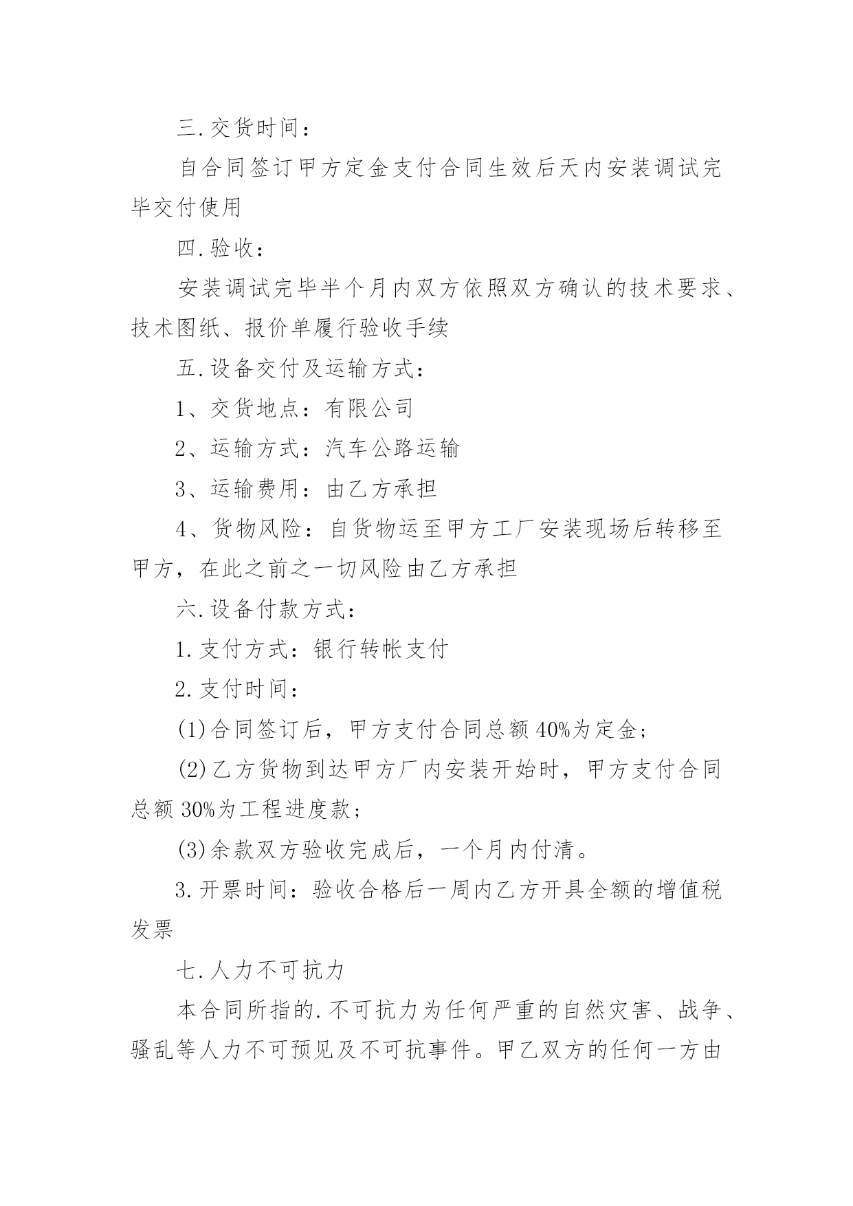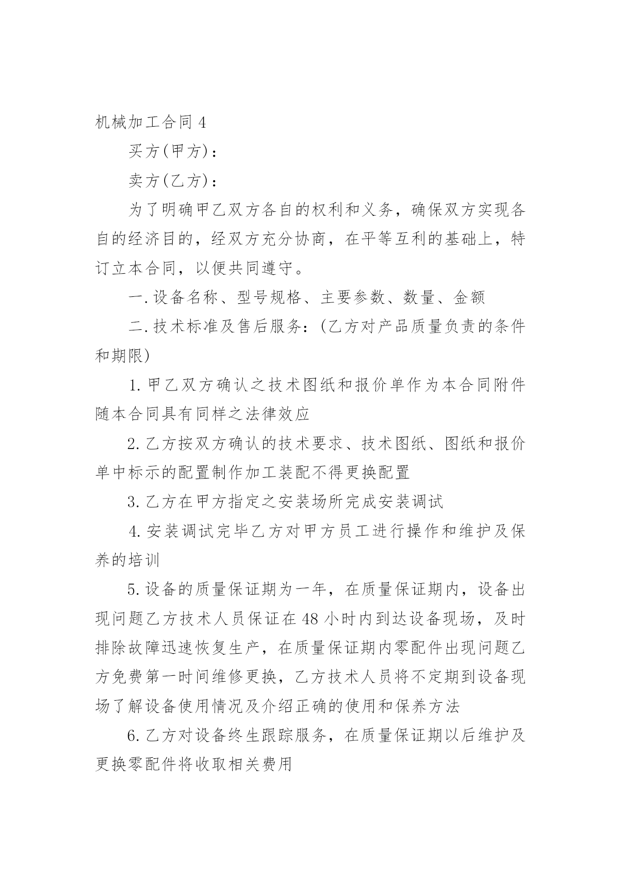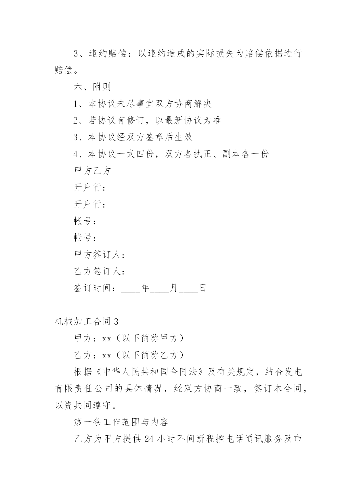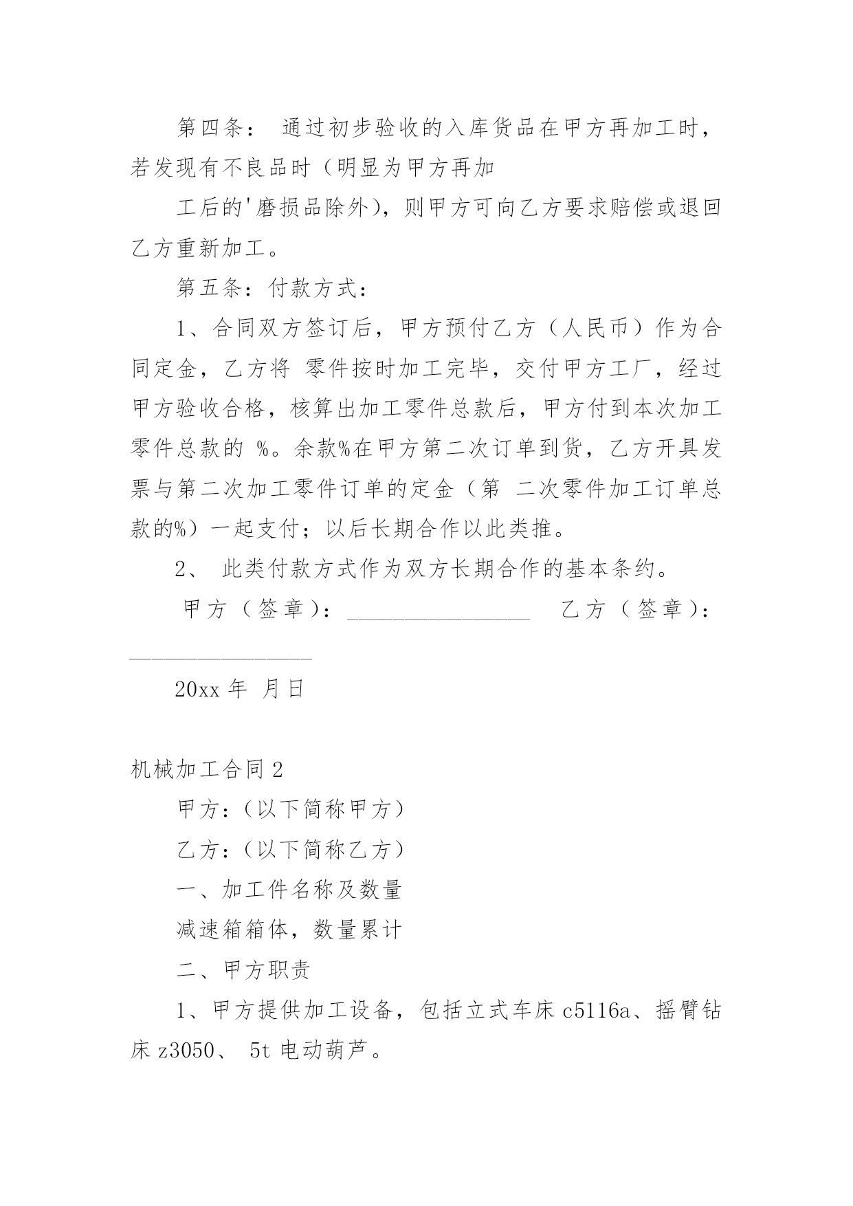 机械加工合同机械加工合同集锦15篇随着人们法律意识的加强,合同出现的次数越来越多,签订合同是为了保障双方的利益,避免不必要的争端。那么常见的合同书是什么样的呢?下面是小编整理的机械加工合同,欢迎大家分享。机械加工合同1甲方:无锡友承机械制造有限公司第一条:乙方按甲方提供的图纸和材料加工零件(见图纸部件加工明细表),总计按甲方提供的每种零件的数量,价格按双方协商所定的的价格(见图纸部件加工明细表)。第二条:乙方须按照外包加工零件清单所列的各项规定,如加工说明、数量、交货日期等确实履行准时交货;延时交货,按总款额的1%/天缴付违约金。第三条:乙方所交的加工品应保质保量,并不得有短缺或不合规格及瑕疵等情况。加工完毕送货至甲方工厂,经过甲方初步验收后入库。(因甲方提供的物料本事质量问题,乙方应及时告知甲方,经过甲方确认,乙方不承担责任)。第四条:通过初步验收的入库货品在甲方再加工时,若发现有不良品时(明显为甲方再加工后的'磨损品除外),则甲方可向乙方要求赔偿或退回乙方重新加工。第五条:付款方式:1、合同双方签订后,甲方预付乙方(人民币)作为合同定金,乙方将零件按时加工完毕,交付甲方工厂,经过甲方验收合格,核算出加工零件总款后,甲方付到本次加工零件总款的%。余款%在甲方第二次订单到货,乙方开具发票与第二次加工零件订单的定金(第二次零件加工订单总款的%)一起支付;以后长期合作以此类推。2、此类付款方式作为双方长期合作的基本条约。甲方(签章):________________乙方(签章):________________20xx年月日机械加工合同2甲方:(以下简称甲方)乙方:(以下简称乙方)一、加工件名称及数量减速箱箱体,数量累计二、甲方职责1、甲方提供加工设备,包括立式车床c5116a、摇臂钻床z3050、5t电动葫芦。2、甲方提供加工件所需工作场所、夹具。3、甲方负责对乙方人员管理及安全教育,以及工件出入厂门管理。4、甲方因生产需要,可随时使用所提供设备,并即时通知乙方。三、乙方职责1、乙方必须严格遵守甲方单位的'各项规章制度。2、乙方提供设备操作人员,必须持证上岗;以及提供加工所需刀具、量具等。3、乙方对安全管理、工件质量负全责,出现安全、质量问题甲方概不负责。4、乙方负责工作场所的文明生产,每天必须保持工完料尽场地清。5、乙方加工人员必须精心维护、保养设备,因加工原因引起设备损坏或精度降低,由乙方负责修理;损坏严重的由乙方负责赔偿。6、乙方如需加班加工工件,必须提前通知甲方,服从甲方安排。四、结算方式每月进行一次费用结算加工费用以加工件单价进行结算若加工件规格发生变化,其加工单价应核实后重新定价五、违约责任1、甲、乙双方协商解决。2、如协商不成提交淮安仲裁委仲裁。3、违约赔偿:以违约造成的实际损失为赔偿依据进行赔偿。六、附则1、本协议未尽事宜双方协商解决2、若协议有修订,以最新协议为准3、本协议经双方签章后生效4、本协议一式四份,双方各执正、副本各一份甲方乙方开户行:开户行:帐号:帐号:甲方签订人:乙方签订人:签订时间:____年____月____日机械加工合同3甲方:xx(以下简称甲方)乙方:xx(以下简称乙方)根据《中华人民共和国合同法》及有关规定,结合发电有限责任公司的具体情况,经双方协商一致,签订本合同,以资共同遵守。第一条工作范围与内容乙方为甲方提供24小时不间断程控电话通讯服务及市话直线服务;电话机移机服务,微波电路、调度总机、输煤调度系统、自动交换机、生产监控系统、生产用时钟显示系统等服务。第二条合同期限本合同期限一年。第三条承包方式包工不包料第四条合同总价本合同总价为人民币(大写)元整(含增值税及附加税)。第五条材料供应1乙方负责本合同范围内所用材料的采购、运输、仓储保管及规定的材料鉴定试验;2乙方采购的材料须符合国家或行业现行的有关标准,并符合国家及上级主管部门规定的进货渠道。第六条验收标准1缺陷消除率100%;2微波设备运行率为99。8%;3交换设备运行率为99。9%;4调度总机运行率为99。9%。第七条质量保证金1本合同质量保证金为合同总价的10%;2因乙方责任而不能履行合同或不能完全履行合同时扣除全部或部分质量保证金。第八条付款方式甲方按时间进度付款,付款时乙方需开具服务业发票(与付款额度相同),乙方在每月25日前补开当月差额部分发票(年总费用十二分之一扣除当月已开发票),甲方在每月25日前结清当月90%的服务费,其余10%未付部分待质保期满,经验收合格后支付。第九条违约责任1甲方不按本合同规定向乙方支付款项,应承担违约责任(包括支付因其违约导致乙方增加的经济支出和从应支付之日起计算的应付款项的利息等)。2乙方不能按照合同规定的进度完工或质量达不到合同规定的要求而使甲方蒙受重大经济损失,及未按本合同规定向
