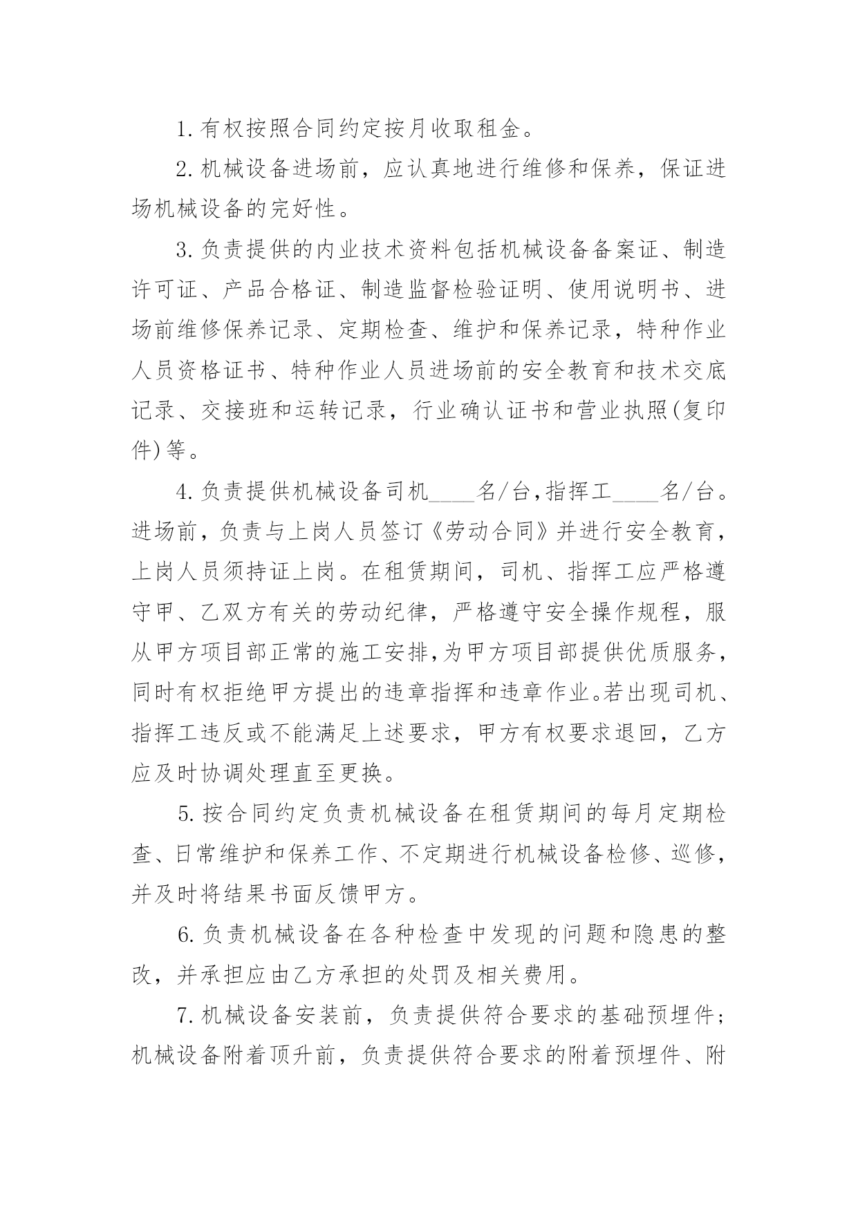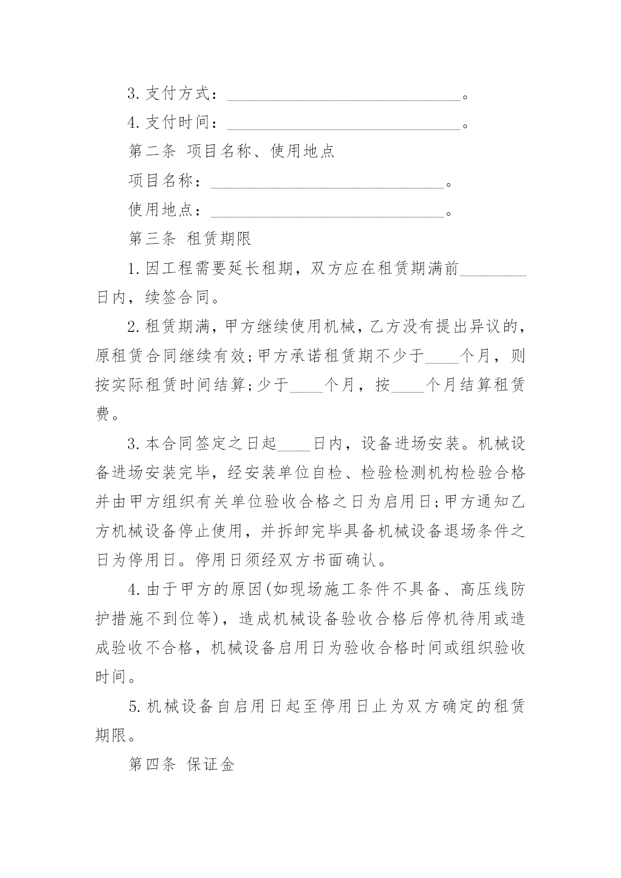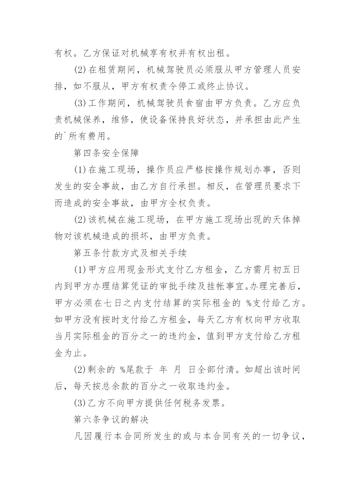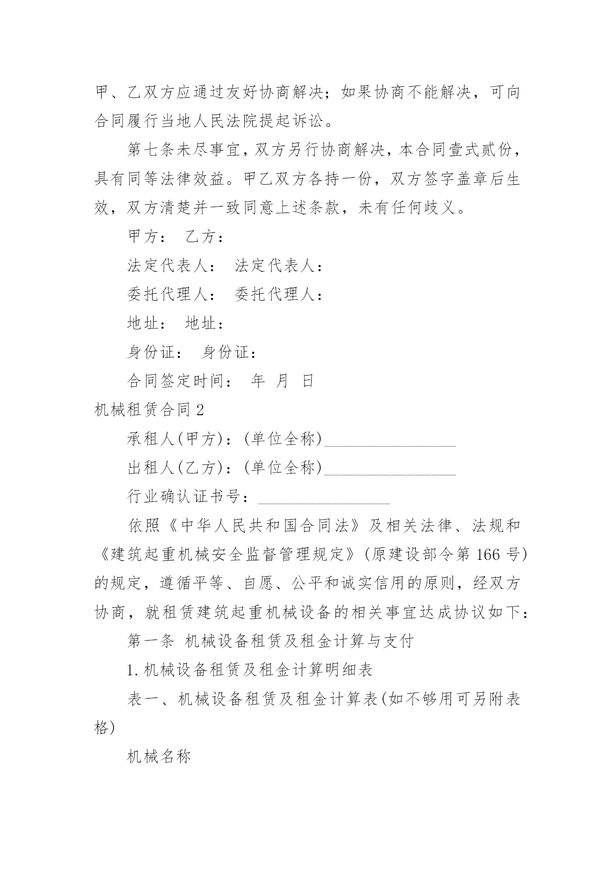 机械租赁合同机械租赁合同【精华】现今社会公众的法律意识不断增强,合同出现在我们生活中的次数越来越多,签订合同也是最有效的法律依据之一。知道吗,写合同可是有方法的哦,下面是小编帮大家整理的机械租赁合同,欢迎阅读与收藏。机械租赁合同1租用方:(以下简称甲方)出租方:(以下简称乙方)根据(合同法)的有关规定,按照平等,互利的原则。为明确甲、乙双方的权利义务,经双方协商一致,特签定本租赁合同。第一条租赁机械的名称和型号:第二条租赁形式。乙方将该设备以月租的形式租用给甲方。每月租金为人民币元,(大写:。)每月月租时间限时为280小时,若超出280小时,每小时按元/小时计算。第三条租赁期限及相关事宜年月日至年月日止,具体租用时间以甲方电话通知为准;如需继续租用,应在本合同期满前五日内,续签定租赁合同。(1)在租赁期间,甲方只有对该机械的使用权,没有所有权。乙方保证对机械享有权并有权出租。(2)在租赁期间,机械驾驶员必须服从甲方管理人员安排,如不服从,甲方有权责令停工或终止协议。(3)工作期间,机械驾驶员食宿由甲方负责。乙方应负责机械保养,维修,使设备保持良好状态,并承担由此产生的`所有费用。第四条安全保障(1)在施工现场,操作员应严格按操作规划办事,否则发生的安全事故,由乙方自行承担。相反,在管理员要求下而造成的安全事故,由甲方全权负责。(2)该机械在施工现场,在甲方施工现场出现的天体掉物对该机械造成的损坏,由甲方负责。第五条付款方式及相关手续(1)甲方应用现金形式支付乙方租金,乙方需月初五日内到甲方办理结算凭证的审批手续及挂帐事宜。办理完善后,甲方必须在七日之内支付结算的实际租金的%支付给乙方。如甲方没有按时支付给乙方租金,每天乙方有权向甲方收取当月实际租金的百分之一的违约金,值到甲方支付给乙方租金为止。(2)剩余的%尾款于年月日全部付清。如超出该时间后,每天按总余款的百分之一收取违约金。(3)乙方不向甲方提供任何税务发票。第六条争议的解决凡因履行本合同所发生的或与本合同有关的一切争议,甲、乙双方应通过友好协商解决;如果协商不能解决,可向合同履行当地人民法院提起诉讼。第七条未尽事宜,双方另行协商解决,本合同壹式贰份,具有同等法律效益。甲乙双方各持一份,双方签字盖章后生效,双方清楚并一致同意上述条款,未有任何歧义。甲方:乙方:法定代表人:法定代表人:委托代理人:委托代理人:地址:地址:身份证:身份证:合同签定时间:年月日机械租赁合同2承租人(甲方):(单位全称)________________出租人(乙方):(单位全称)________________行业确认证书号:________________依照《中华人民共和国合同法》及相关法律、法规和《建筑起重机械安全监督管理规定》(原建设部令第166号)的规定,遵循平等、自愿、公平和诚实信用的原则,经双方协商,就租赁建筑起重机械设备的相关事宜达成协议如下:第一条机械设备租赁及租金计算与支付1.机械设备租赁及租金计算明细表表一、机械设备租赁及租金计算表(如不够用可另附表格)机械名称数量规格/型号生产厂商租赁期限/起止时间租金标准(元/月.台)租金小计(元)合计表二、机械设备操作人员工资计算表工种类别人数月工资工作期限/起止时间工资小计(元)备注塔机司机塔机指挥工施工升降机司机合计2.租金计算。机械设备租金每月合计____________元(见表一)。按合同约定,若是乙方指派操作人员则租金包括工资(见表二),租金每月共计____________元。不足月的尾数日租金按月租金除以30天乘以实际使用天数计算。租金从机械设备启用日起计算。在租赁期内,若非乙方原因造成机械设备停机或停止使用,甲方应按租金标准照常支付租赁费。3.支付方式:____________________________。4.支付时间:____________________________。第二条项目名称、使用地点项目名称:____________________________。使用地点:____________________________。第三条租赁期限1.因工程需要延长租期,双方应在租赁期满前________日内,续签合同。2.租赁期满,甲方继续使用机械,乙方没有提出异议的,原租赁合同继续有效;甲方承诺租赁期不少于____个月,则按实际租赁时间结算;少于____个月,按____个月结算租赁费。3.本合同签定之日起____日内,设备进场安装。机械设备进场安装完毕,经安装单位自检、检验检测机构检验合格并由甲方组织有关单位验收合格之日为启用日;甲方通知乙方机械设备停止使用,并拆卸完毕具备机械设备退场条件之日为停用日。停用日须经双方书面确认。4.由于甲方的原因(如现场施工条件不具备、高压线防护措施不到位等),造成机械设备验收合
