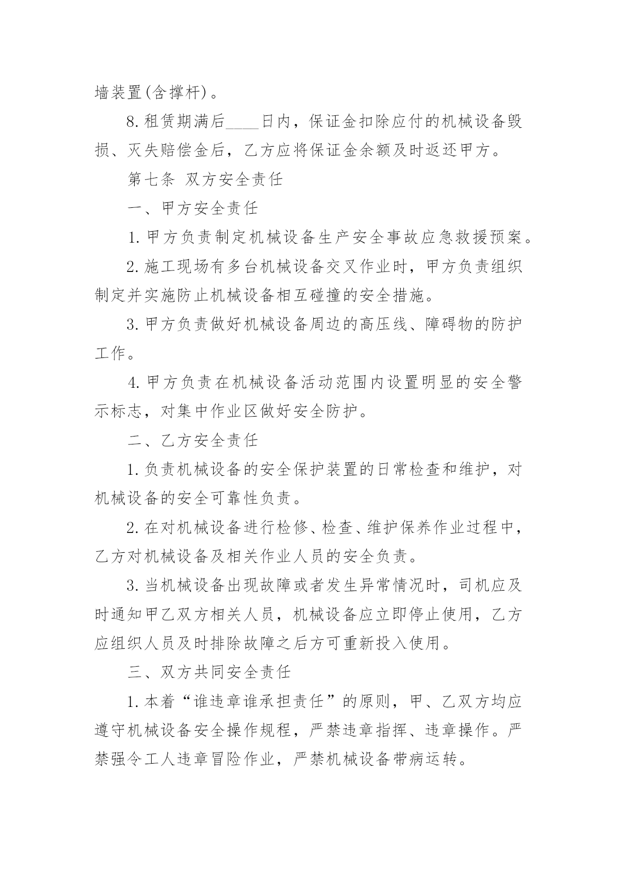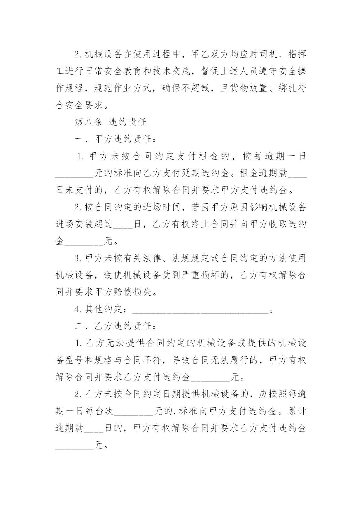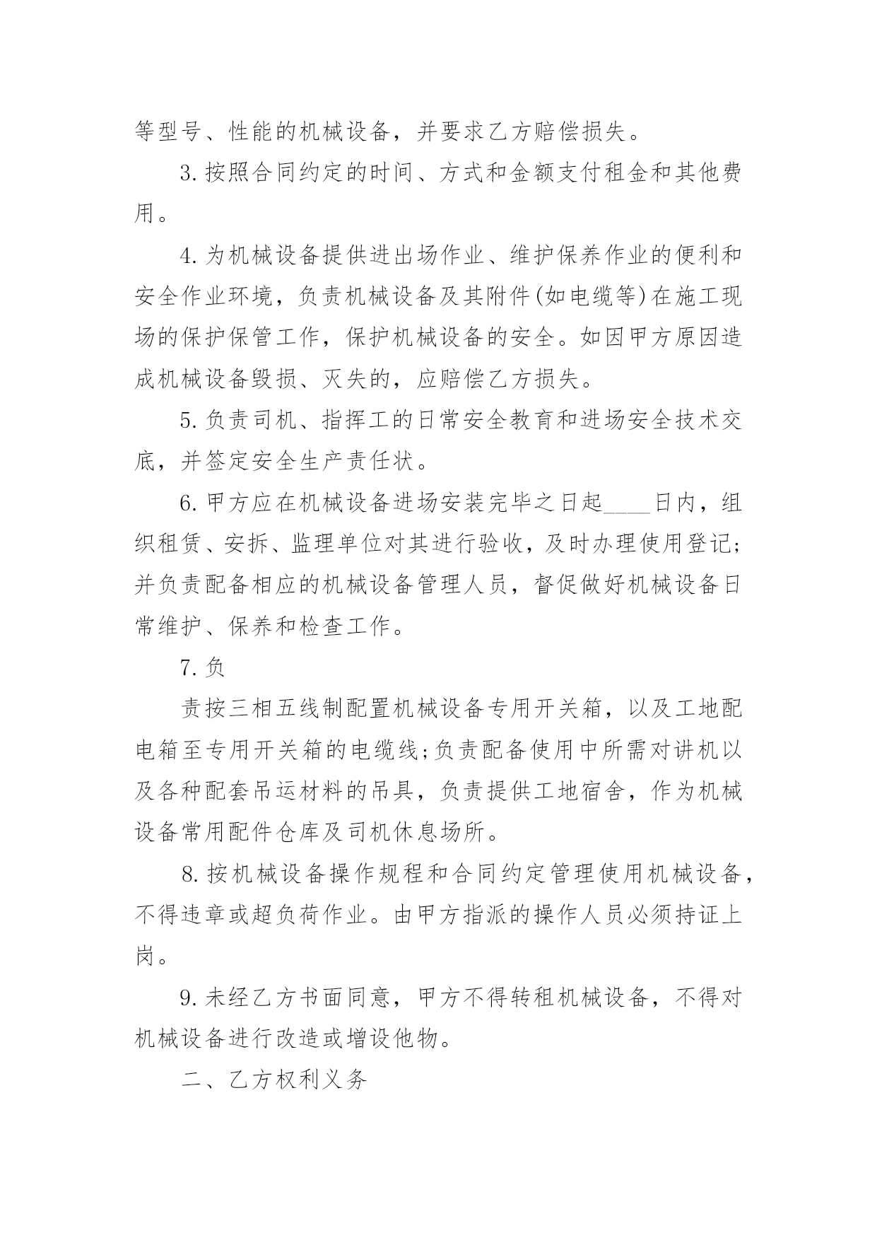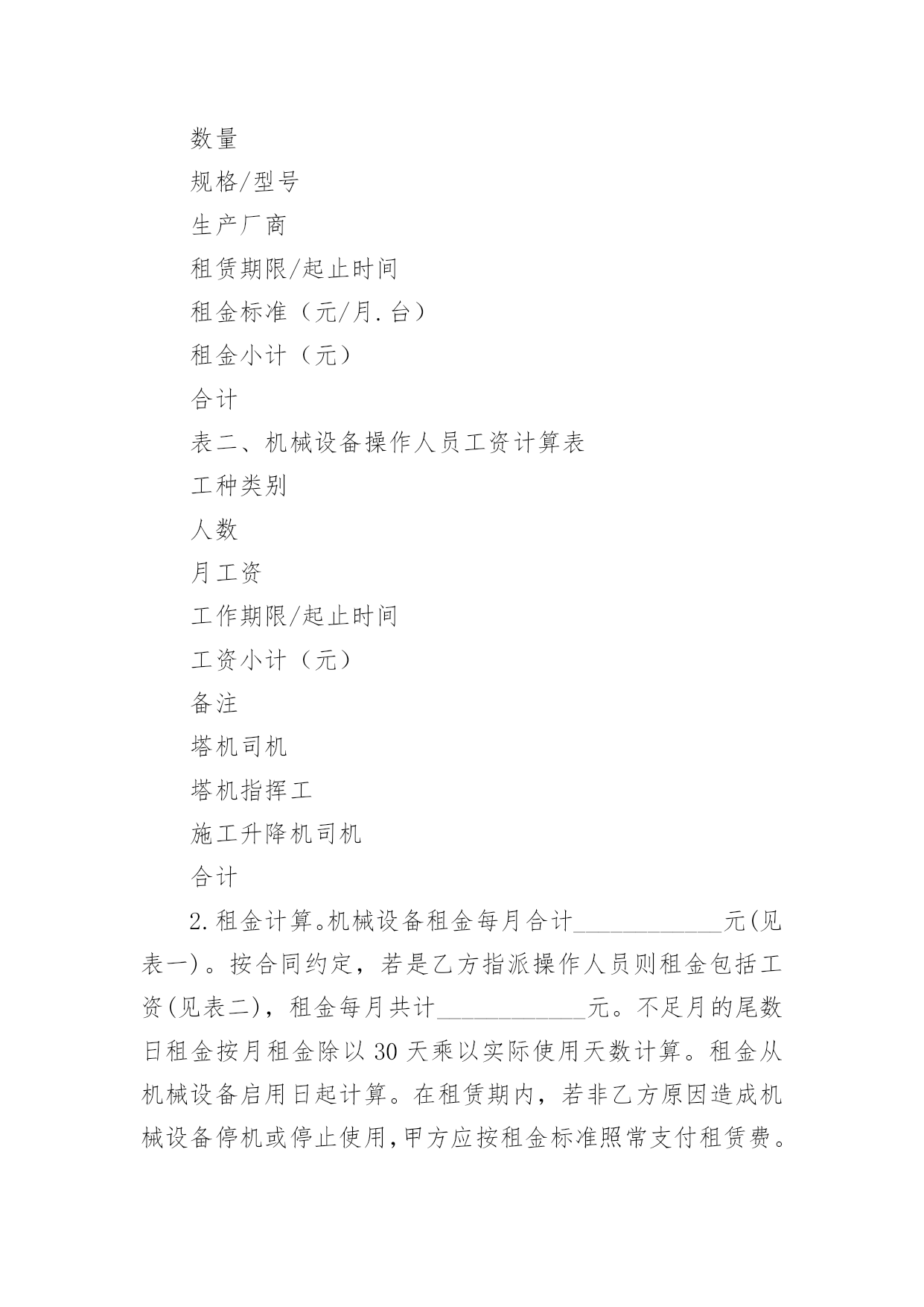 机械租赁合同机械租赁合同【精华】现今社会公众的法律意识不断增强,合同出现在我们生活中的次数越来越多,签订合同也是最有效的法律依据之一。知道吗,写合同可是有方法的哦,下面是小编帮大家整理的机械租赁合同,欢迎阅读与收藏。机械租赁合同1租用方:(以下简称甲方)出租方:(以下简称乙方)根据(合同法)的有关规定,按照平等,互利的原则。为明确甲、乙双方的权利义务,经双方协商一致,特签定本租赁合同。第一条租赁机械的名称和型号:第二条租赁形式。乙方将该设备以月租的形式租用给甲方。每月租金为人民币元,(大写:。)每月月租时间限时为280小时,若超出280小时,每小时按元/小时计算。第三条租赁期限及相关事宜年月日至年月日止,具体租用时间以甲方电话通知为准;如需继续租用,应在本合同期满前五日内,续签定租赁合同。(1)在租赁期间,甲方只有对该机械的使用权,没有所有权。乙方保证对机械享有权并有权出租。(2)在租赁期间,机械驾驶员必须服从甲方管理人员安排,如不服从,甲方有权责令停工或终止协议。(3)工作期间,机械驾驶员食宿由甲方负责。乙方应负责机械保养,维修,使设备保持良好状态,并承担由此产生的`所有费用。第四条安全保障(1)在施工现场,操作员应严格按操作规划办事,否则发生的安全事故,由乙方自行承担。相反,在管理员要求下而造成的安全事故,由甲方全权负责。(2)该机械在施工现场,在甲方施工现场出现的天体掉物对该机械造成的损坏,由甲方负责。第五条付款方式及相关手续(1)甲方应用现金形式支付乙方租金,乙方需月初五日内到甲方办理结算凭证的审批手续及挂帐事宜。办理完善后,甲方必须在七日之内支付结算的实际租金的%支付给乙方。如甲方没有按时支付给乙方租金,每天乙方有权向甲方收取当月实际租金的百分之一的违约金,值到甲方支付给乙方租金为止。(2)剩余的%尾款于年月日全部付清。如超出该时间后,每天按总余款的百分之一收取违约金。(3)乙方不向甲方提供任何税务发票。第六条争议的解决凡因履行本合同所发生的或与本合同有关的一切争议,甲、乙双方应通过友好协商解决;如果协商不能解决,可向合同履行当地人民法院提起诉讼。第七条未尽事宜,双方另行协商解决,本合同壹式贰份,具有同等法律效益。甲乙双方各持一份,双方签字盖章后生效,双方清楚并一致同意上述条款,未有任何歧义。甲方:乙方:法定代表人:法定代表人:委托代理人:委托代理人:地址:地址:身份证:身份证:合同签定时间:年月日机械租赁合同2承租人(甲方):(单位全称)________________出租人(乙方):(单位全称)________________行业确认证书号:________________依照《中华人民共和国合同法》及相关法律、法规和《建筑起重机械安全监督管理规定》(原建设部令第166号)的规定,遵循平等、自愿、公平和诚实信用的原则,经双方协商,就租赁建筑起重机械设备的相关事宜达成协议如下:第一条机械设备租赁及租金计算与支付1.机械设备租赁及租金计算明细表表一、机械设备租赁及租金计算表(如不够用可另附表格)机械名称数量规格/型号生产厂商租赁期限/起止时间租金标准(元/月.台)租金小计(元)合计表二、机械设备操作人员工资计算表工种类别人数月工资工作期限/起止时间工资小计(元)备注塔机司机塔机指挥工施工升降机司机合计2.租金计算。机械设备租金每月合计____________元(见表一)。按合同约定,若是乙方指派操作人员则租金包括工资(见表二),租金每月共计____________元。不足月的尾数日租金按月租金除以30天乘以实际使用天数计算。租金从机械设备启用日起计算。在租赁期内,若非乙方原因造成机械设备停机或停止使用,甲方应按租金标准照常支付租赁费。3.支付方式:____________________________。4.支付时间:____________________________。第二条项目名称、使用地点项目名称:____________________________。使用地点:____________________________。第三条租赁期限1.因工程需要延长租期,双方应在租赁期满前________日内,续签合同。2.租赁期满,甲方继续使用机械,乙方没有提出异议的,原租赁合同继续有效;甲方承诺租赁期不少于____个月,则按实际租赁时间结算;少于____个月,按____个月结算租赁费。3.本合同签定之日起____日内,设备进场安装。机械设备进场安装完毕,经安装单位自检、检验检测机构检验合格并由甲方组织有关单位验收合格之日为启用日;甲方通知乙方机械设备停止使用,并拆卸完毕具备机械设备退场条件之日为停用日。停用日须经双方书面确认。4.由于甲方的原因(如现场施工条件不具备、高压线防护措施不到位等),造成机械设备验收合