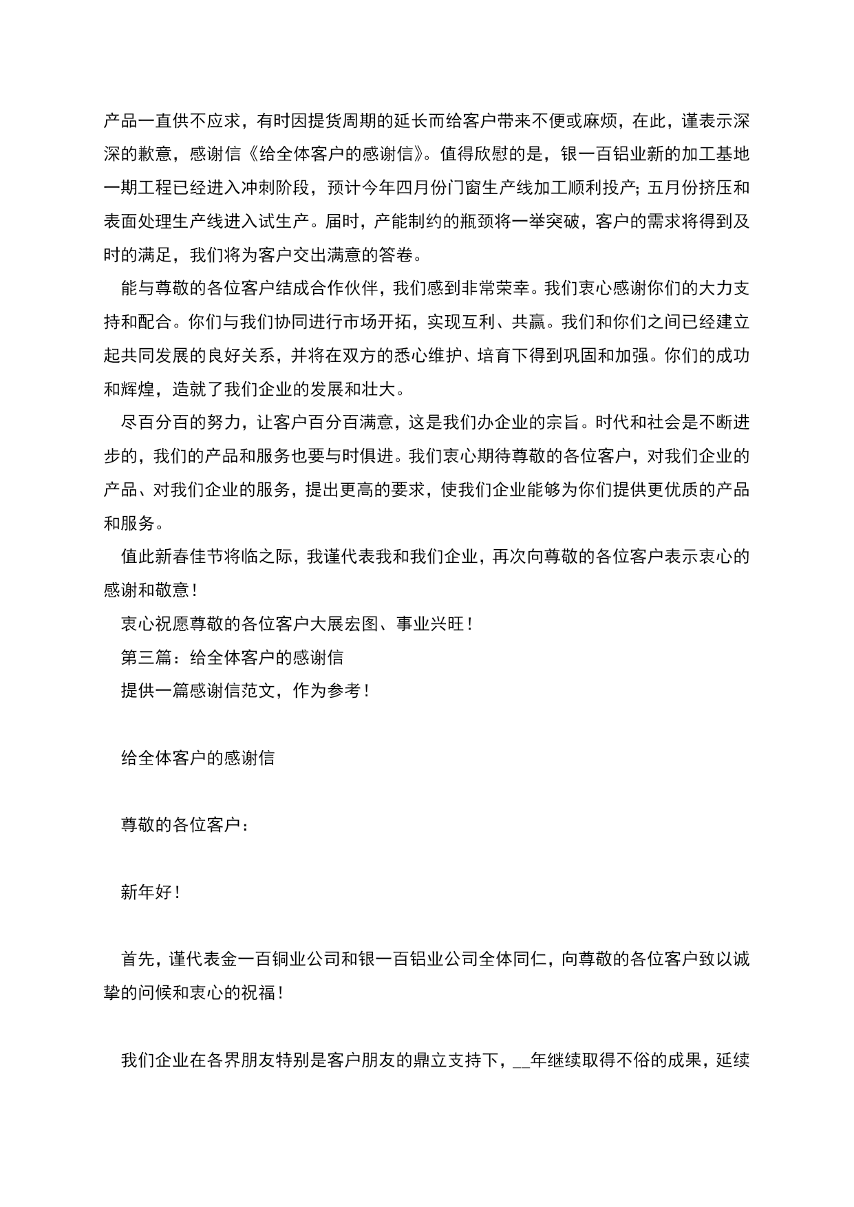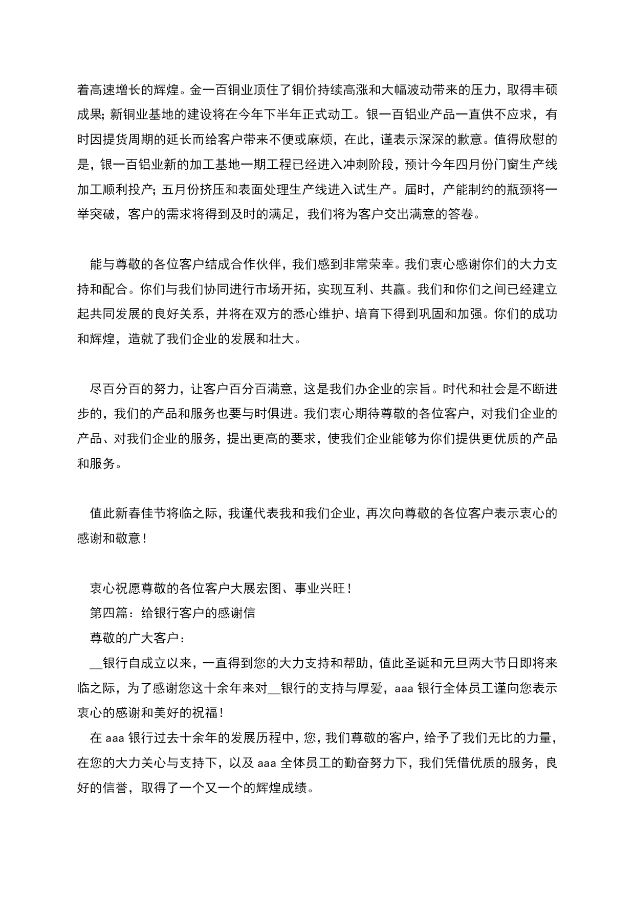 给保险客户的感谢信保险宣传其实是一件很辛苦的事,风吹雨打、酸甜苦辣都要经历,不过宣传也是很快乐的,自从进入这个行业以来,保险让我的内心开始变得更加宽广和融合、坚强与进取。每每心灵受挫、受打击时,一想到您还有众多的客户支持和信赖,看到家人期待的目光和眼神,我就不敢让自已懈怠,而继续勇敢地在这个行业中前行。在过去的日子里,我不知道您是否烦过,我向您介绍保险,是否对我的服务感到满意,但我从内心深处都希望你拥有足够的人寿保险,哪怕不是在我这里购买的,因为每当我看到身边的人没有保险,而有事发生不能承受生命之重时,我就为自己没能事前向他们介绍保险而感到自责。而当我看到身边越来越多的人开始拥有人寿保险时,我的内心便充满了无限的快乐与恬静。从容与宁静是生命力量的体现,源于内心的坦然和安全感。人寿保险虽然不能抵御风险,却可以让人悲痛之余抚慰心灵,让爱我们的人和我们所爱的人深切地感知一份绵绵不绝的爱和深切的责任,从而在内心深处升腾起生的勇气与创造美好的新生活的憧憬,这是其他商品和服务所不能做到的,所以我不止一次地告戒自已,决不要因为情面而不向他人销售保险,也决不要轻易对这个行业说不,我要在这个行业中坚定地走下去,并给更多的人送去满意的保险服务!感谢您让我有机会向您学习和请教,祝福您在新的每一天大展宏图,对于我自己我将不断地去学习和进取,以让自己更加充实和专业,愿您能在未来的日子里,继续给我更多的支持和帮助,助我在这个行业中快速成长!谢谢!愿每个家庭拥有平安!第二篇:给全体客户的感谢信给全体客户的感谢信尊敬的各位客户:新年好!首先,谨代表金一百铜业公司和银一百铝业公司全体同仁,向尊敬的各位客户致以诚挚的问候和衷心的祝福!我们企业在各界朋友特别是客户朋友的鼎立支持下,__年继续取得不俗的成果,延续着高速增长的辉煌,给全体客户的感谢信。金一百铜业顶住了铜价持续高涨和大幅波动带来的压力,取得丰硕成果;新铜业基地的建设将在今年下半年正式动工。银一百铝业产品一直供不应求,有时因提货周期的延长而给客户带来不便或麻烦,在此,谨表示深深的歉意,感谢信《给全体客户的感谢信》。值得欣慰的是,银一百铝业新的加工基地一期工程已经进入冲刺阶段,预计今年四月份门窗生产线加工顺利投产;五月份挤压和表面处理生产线进入试生产。届时,产能制约的瓶颈将一举突破,客户的需求将得到及时的满足,我们将为客户交出满意的答卷。能与尊敬的各位客户结成合作伙伴,我们感到非常荣幸。我们衷心感谢你们的大力支持和配合。你们与我们协同进行市场开拓,实现互利、共赢。我们和你们之间已经建立起共同发展的良好关系,并将在双方的悉心维护、培育下得到巩固和加强。你们的成功和辉煌,造就了我们企业的发展和壮大。尽百分百的努力,让客户百分百满意,这是我们办企业的宗旨。时代和社会是不断进步的,我们的产品和服务也要与时俱进。我们衷心期待尊敬的各位客户,对我们企业的产品、对我们企业的服务,提出更高的要求,使我们企业能够为你们提供更优质的产品和服务。值此新春佳节将临之际,我谨代表我和我们企业,再次向尊敬的各位客户表示衷心的感谢和敬意!衷心祝愿尊敬的各位客户大展宏图、事业兴旺!第三篇:给全体客户的感谢信提供一篇感谢信范文,作为参考!给全体客户的感谢信尊敬的各位客户:新年好!首先,谨代表金一百铜业公司和银一百铝业公司全体同仁,向尊敬的各位客户致以诚挚的问候和衷心的祝福!我们企业在各界朋友特别是客户朋友的鼎立支持下,__年继续取得不俗的成果,延续着高速增长的辉煌。金一百铜业顶住了铜价持续高涨和大幅波动带来的压力,取得丰硕成果;新铜业基地的建设将在今年下半年正式动工。银一百铝业产品一直供不应求,有时因提货周期的延长而给客户带来不便或麻烦,在此,谨表示深深的歉意。值得欣慰的是,银一百铝业新的加工基地一期工程已经进入冲刺阶段,预计今年四月份门窗生产线加工顺利投产;五月份挤压和表面处理生产线进入试生产。届时,产能制约的瓶颈将一举突破,客户的需求将得到及时的满足,我们将为客户交出满意的答卷。能与尊敬的各位客户结成合作伙伴,我们感到非常荣幸。我们衷心感谢你们的大力支持和配合。你们与我们协同进行市场开拓,实现互利、共赢。我们和你们之间已经建立起共同发展的良好关系,并将在双方的悉心维护、培育下得到巩固和加强。你们的成功和辉煌,造就了我们企业的发展和壮大。尽百分百的努力,让客户百分百满意,这是我们办企业的宗旨。时代和社会是不断进步的,我们的产品和服务也要与时俱进。我们衷心期待尊敬的各位客户,对我们企业的产品、对我们企业的服务,提出更高的要求,使我们企业能够为你们提供更优质的产品和服务。值此新春佳节将临之际,我谨代表我和我们企业,再次向尊敬的各位客户表示衷心的感谢和敬意!衷心祝愿尊敬的各位客户大展宏图、事业兴旺!第四篇:给银行客户的感谢信尊敬的广大客户