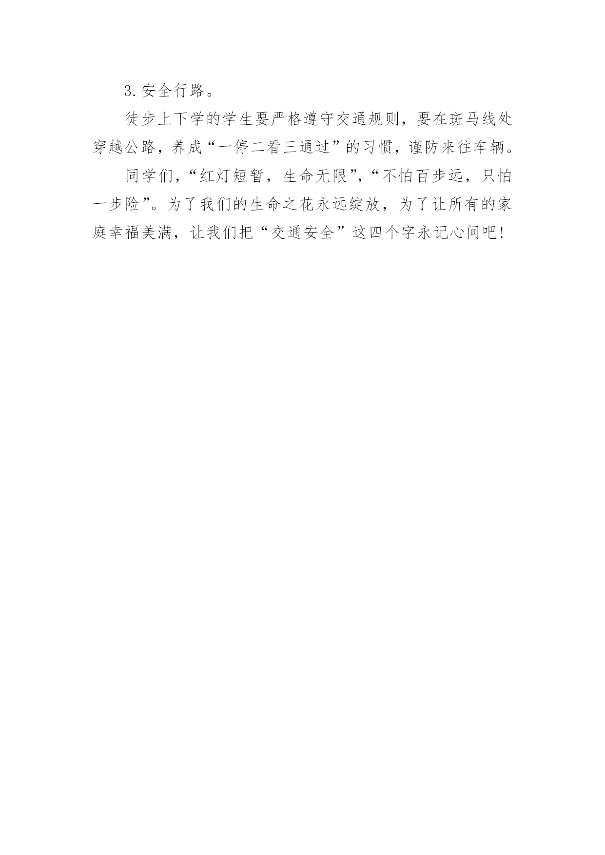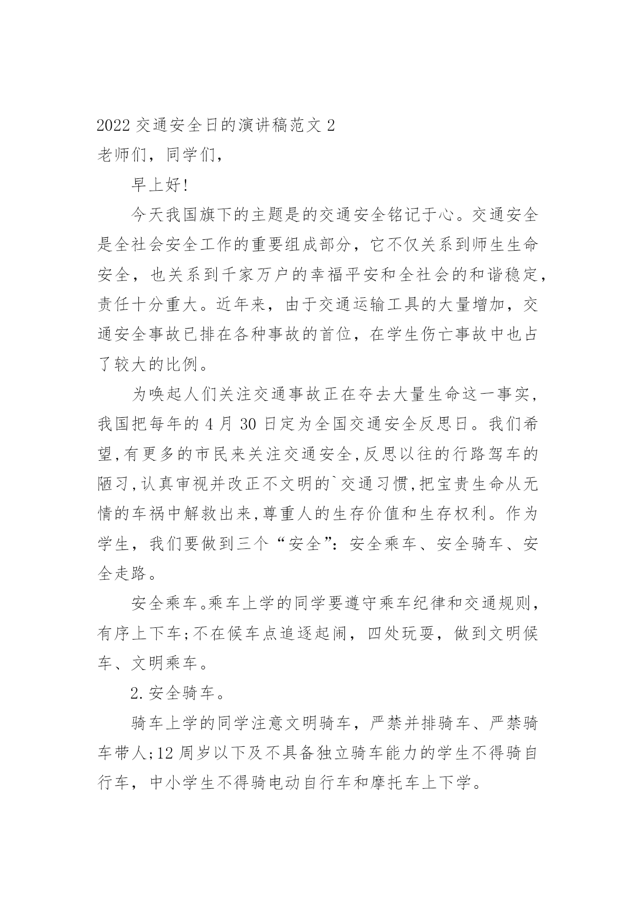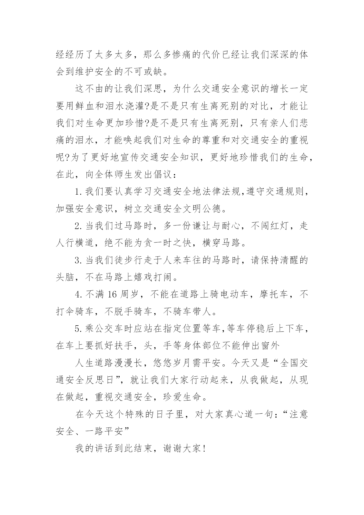 交通安全日的演讲稿2022交通安全日的演讲稿范文演讲稿可以按照用途、性质等来划分,是演讲上一个重要的准备工作。在充满活力,日益开放的今天,很多地方都会使用到演讲稿,那么一般演讲稿是怎么写的呢?下面是小编精心整理的2022交通安全日的演讲稿范文,欢迎阅读与收藏。2022交通安全日的演讲稿范文1尊敬的老师、亲爱的同学们:大家好!今天我讲话的题目是:全国交通安全反思日------注意安全、一路平安!说起死亡,人们常常与战争联系在一起,第一次世界大战两千万人丧失生命。第二次世界大战,又有三千六百万人化为青烟。然而,一个更为残酷的现实被人们忽略。那就是自第一辆汽车问世至今,已有四千万人惨死在飞驰的车轮下。根据公安部交通管理局统计,我国近年来,每年交通事故死亡的人数已经相当于一个县城的人口总数。每年受伤的人数相当于一个中等县的`人数。更为可怕的是,全国每六分钟就有一个人死于车祸。当尖锐的刹车声响起,马路上又多了一抹殷红的血迹。于是,又有一个家庭将被悲哀与泪水笼罩,他们的生命,从此敷上一层阴霾。这样的伤痛我们已经经历了太多太多,那么多惨痛的代价已经让我们深深的体会到维护安全的不可或缺。这不由的让我们深思,为什么交通安全意识的增长一定要用鲜血和泪水浇灌?是不是只有生离死别的对比,才能让我们对生命更加珍惜?是不是只有生离死别,只有亲人们悲痛的泪水,才能唤起我们对生命的尊重和对交通安全的重视呢?为了更好地宣传交通安全知识,更好地珍惜我们的生命,在此,向全体师生发出倡议:1.我们要认真学习交通安全地法律法规,遵守交通规则,加强安全意识,树立交通安全文明公德。2.当我们过马路时,多一份谦让与耐心,不闯红灯,走人行横道,绝不能为贪一时之快,横穿马路。3.当我们徒步行走于人来车往的马路时,请保持清醒的头脑,不在马路上嬉戏打闹。4.不满16周岁,不能在道路上骑电动车,摩托车,不打伞骑车,不脱手骑车,不骑车带人。5.乘公交车时应站在指定位置等车,等车停稳后上下车,在车上要抓好扶手,头,手等身体部位不能伸出窗外人生道路漫漫长,悠悠岁月需平安。今天又是“全国交通安全反思日”,就让我们大家行动起来,从我做起,从现在做起,重视交通安全,珍爱生命。在今天这个特殊的日子里,对大家真心道一句:“注意安全、一路平安”我的讲话到此结束,谢谢大家!2022交通安全日的演讲稿范文2老师们,同学们,早上好!今天我国旗下的主题是的交通安全铭记于心。交通安全是全社会安全工作的重要组成部分,它不仅关系到师生生命安全,也关系到千家万户的幸福平安和全社会的和谐稳定,责任十分重大。近年来,由于交通运输工具的大量增加,交通安全事故已排在各种事故的首位,在学生伤亡事故中也占了较大的比例。为唤起人们关注交通事故正在夺去大量生命这一事实,我国把每年的4月30日定为全国交通安全反思日。我们希望,有更多的市民来关注交通安全,反思以往的行路驾车的陋习,认真审视并改正不文明的`交通习惯,把宝贵生命从无情的车祸中解救出来,尊重人的生存价值和生存权利。作为学生,我们要做到三个“安全”:安全乘车、安全骑车、安全走路。安全乘车。乘车上学的同学要遵守乘车纪律和交通规则,有序上下车;不在候车点追逐起闹,四处玩耍,做到文明候车、文明乘车。2.安全骑车。骑车上学的同学注意文明骑车,严禁并排骑车、严禁骑车带人;12周岁以下及不具备独立骑车能力的学生不得骑自行车,中小学生不得骑电动自行车和摩托车上下学。3.安全行路。徒步上下学的学生要严格遵守交通规则,要在斑马线处穿越公路,养成“一停二看三通过”的习惯,谨防来往车辆。同学们,“红灯短暂,生命无限”,“不怕百步远,只怕一步险”。为了我们的生命之花永远绽放,为了让所有的家庭幸福美满,让我们把“交通安全”这四个字永记心间吧!