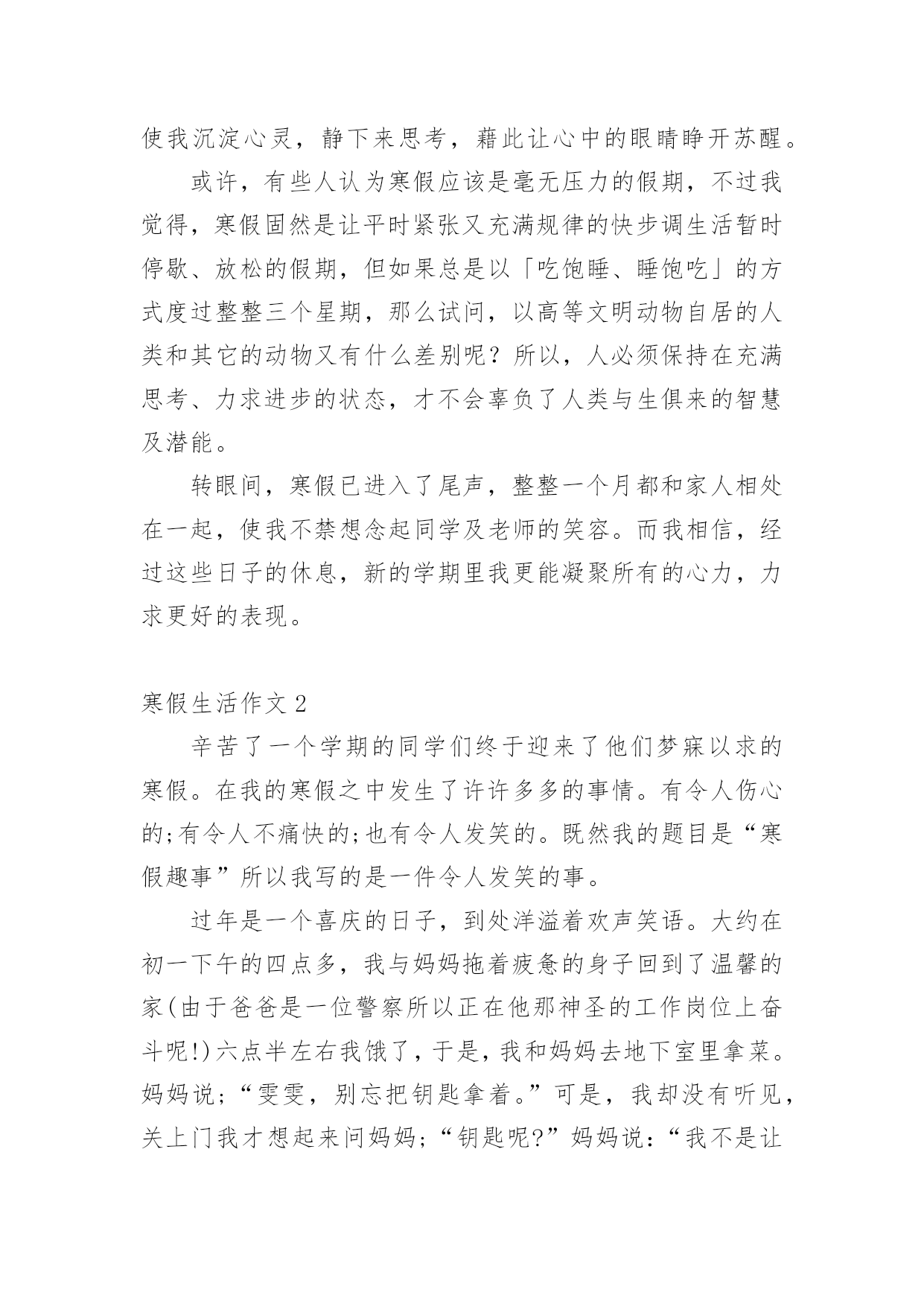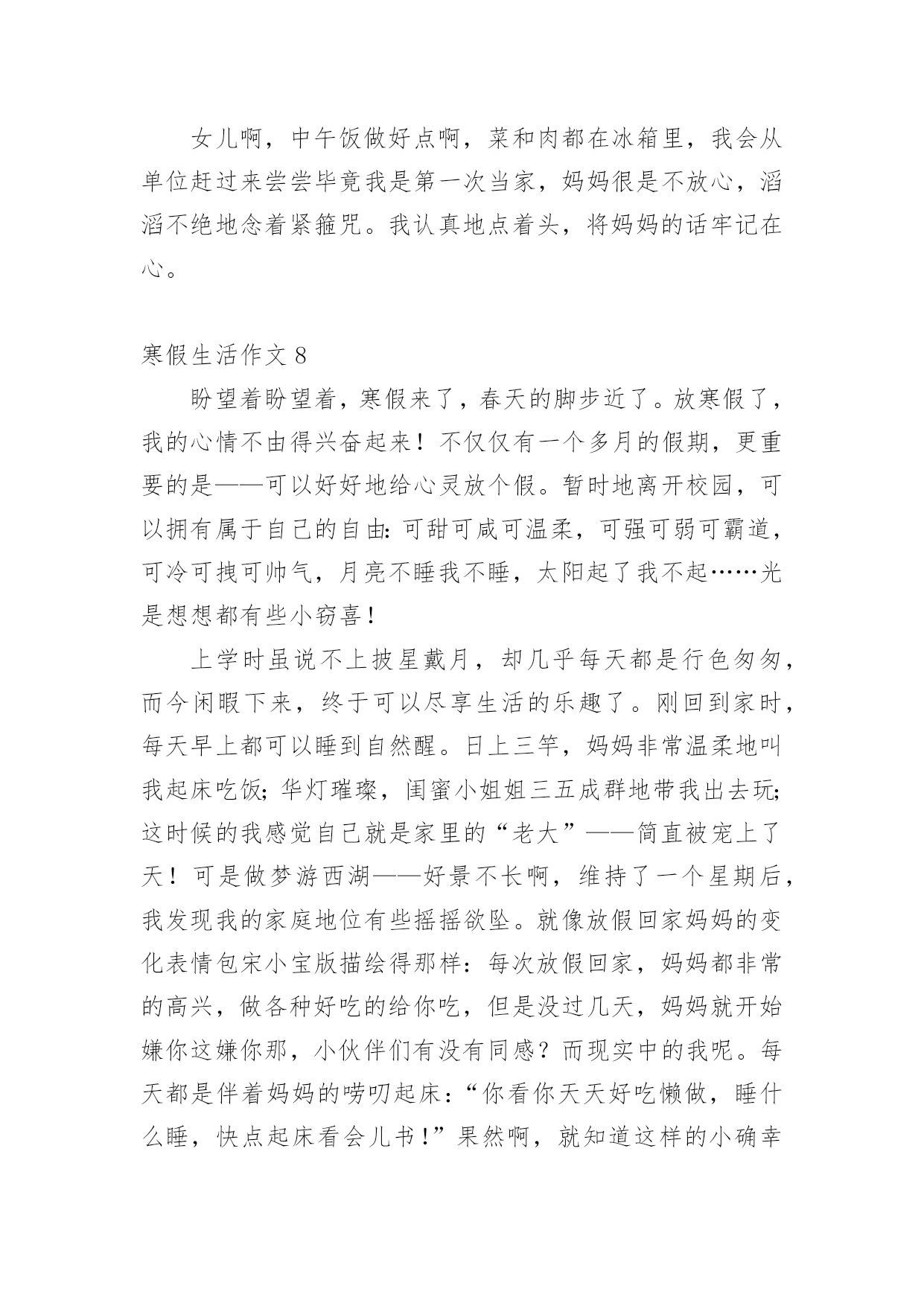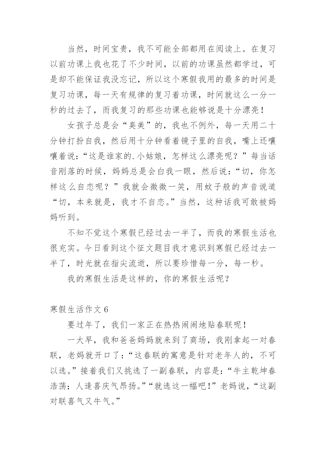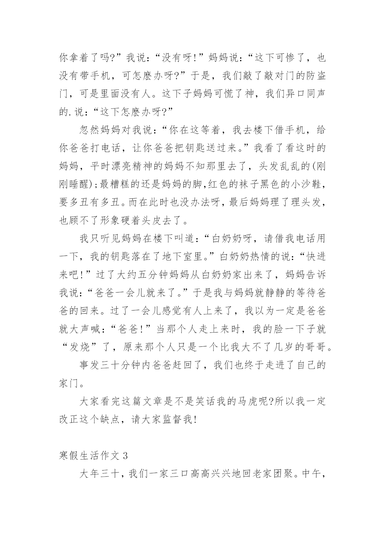 寒假生活作文寒假生活作文【集锦15篇】在平平淡淡的学习、工作、生活中,许多人都写过作文吧,作文是一种言语活动,具有高度的综合性和创造性。你写作文时总是无从下笔?以下是小编帮大家整理的寒假生活作文,仅供参考,希望能够帮助到大家。寒假生活作文1些平时想做却没时间实践的事。我们全家人利用三天的时间开车到位于台中东势的名胜,大雪山森林游乐区享受天然的森林浴,大量吸收对人体有益的芬多精。站在足足有八百九十多岁的巨大神木前,不但让我感受到大自然具有韧性的一面,更让我体会人类的渺小,看着年长的神木依然长满茂密的枝叶,迎风低声吟唱,真让我感慨一些不懂得爱惜生命的人们,连一棵大树都明白要弯下树干抵挡强风,还有什么是我们无法克服的呢?当然,该玩的玩过了,该休息的也休息了,再来就是要重拾书本,找回阅读的'习惯。因为即使是寒假,适当的阅读仍是必要的。所以只要有长假,妈妈总会带我去书店选购书籍,不论是历史、伟人、小说、文学作品??等,都是我喜爱的种类,阅读一本书就好像经历一场有趣的冒险一样,总是令我爱不释手,非得一口气把它看完不可。其实,我觉得书本是知识的来源,尤其是某些发人深省的文学作品,可以使我沉淀心灵,静下来思考,藉此让心中的眼睛睁开苏醒。或许,有些人认为寒假应该是毫无压力的假期,不过我觉得,寒假固然是让平时紧张又充满规律的快步调生活暂时停歇、放松的假期,但如果总是以「吃饱睡、睡饱吃」的方式度过整整三个星期,那么试问,以高等文明动物自居的人类和其它的动物又有什么差别呢?所以,人必须保持在充满思考、力求进步的状态,才不会辜负了人类与生俱来的智慧及潜能。转眼间,寒假已进入了尾声,整整一个月都和家人相处在一起,使我不禁想念起同学及老师的笑容。而我相信,经过这些日子的休息,新的学期里我更能凝聚所有的心力,力求更好的表现。寒假生活作文2辛苦了一个学期的同学们终于迎来了他们梦寐以求的寒假。在我的寒假之中发生了许许多多的事情。有令人伤心的;有令人不痛快的;也有令人发笑的。既然我的题目是“寒假趣事”所以我写的是一件令人发笑的事。过年是一个喜庆的日子,到处洋溢着欢声笑语。大约在初一下午的四点多,我与妈妈拖着疲惫的身子回到了温馨的家(由于爸爸是一位警察所以正在他那神圣的工作岗位上奋斗呢!)六点半左右我饿了,于是,我和妈妈去地下室里拿菜。妈妈说;“雯雯,别忘把钥匙拿着。”可是,我却没有听见,关上门我才想起来问妈妈;“钥匙呢?”妈妈说:“我不是让你拿着了吗?”我说:“没有呀!”妈妈说:“这下可惨了,也没有带手机,可怎麽办呀?”于是,我们敲了敲对门的防盗门,可是里面没有人。这下子妈妈可慌了神,我们异口同声的.说:“这下怎麽办呀?”忽然妈妈对我说:“你在这等着,我去楼下借手机,给你爸爸打电话,让你爸爸把钥匙送过来。”我看了看这时的妈妈,平时漂亮精神的妈妈不知那里去了,头发乱乱的(刚刚睡醒);最糟糕的还是妈妈的脚,红色的袜子黑色的小沙鞋,要多丑有多丑。而在此时也没办法呀,最后妈妈理了理头发,也顾不了形象硬着头皮去了。我只听见妈妈在楼下叫道:“白奶奶呀,请借我电话用一下,我的钥匙落在了地下室里。”白奶奶热情的说:“快进来吧!”过了大约五分钟妈妈从白奶奶家出来了,妈妈告诉我说:“爸爸一会儿就来了。”于是我与妈妈就静静的等待爸爸的回来。过了一会儿感觉有人上来了,我以为一定是爸爸就大声喊:“爸爸!”当那个人走上来时,我的脸一下子就“发烧”了,原来那个人只是一个比我大不了几岁的哥哥。事发三十分钟内爸爸赶回了,我们也终于走进了自己的家门。大家看完这篇文章是不是笑话我的马虎呢?所以我一定改正这个缺点,请大家监督我!寒假生活作文3大年三十,我们一家三口高高兴兴地回老家团聚。中午,我们参加完热闹而又喜庆的祭祖活动后,全家上下又都忙开了。你猜,我们在忙什么呢?待会再告诉你。其实,我们全家总动员在为晚上丰盛的“团圆饭”而忙碌。一切准备就序。奶奶提议说:“我买了糯米粉和面粉,不如我们就再添一道具有家乡风味的特色小吃‘酿丸子’”吧!大家听了都一致赞同,尤其是我和表姐、表妹更是欢呼雀跃。于是,大家分工合作,只见奶奶取出两包面粉和一包糯米粉,倒在盆里和弄起。妈妈去厨房搅拌肉馅。不一会儿,奶奶的面团和弄好了,妈妈加工的香喷喷的馅也出炉了。接着,经验丰富的奶奶做起了示范。奶奶先从面团里挤出一个鸡蛋大小的小面团,然后用手压平,再把馅放在中间,最后像包包子一样包起来。果然,一个标准的、有模有样的“酿丸子”就成型了。我们这些门外汉看奶奶做,觉得很简单,也动起手来。别看我们似模似样地做着,其实,我们做得很糟糕。妈妈也不例外。特别是我做的'“酿丸子”,左边一捏,右边的馅出来了,右边一捏,左边的馅又出来了,必须得用“创可贴”补起来。我看着那打“补丁”的酿丸子,不得不向奶奶取经:“奶奶,怎样做才能做出像您做的‘酿丸子’