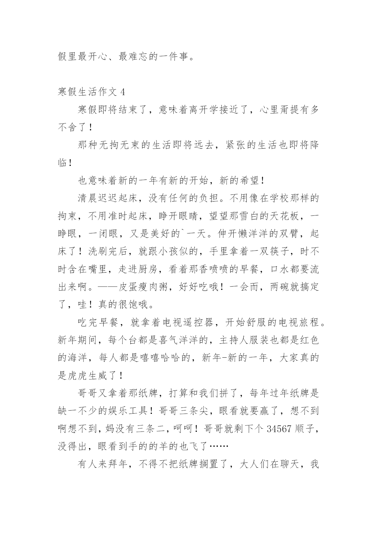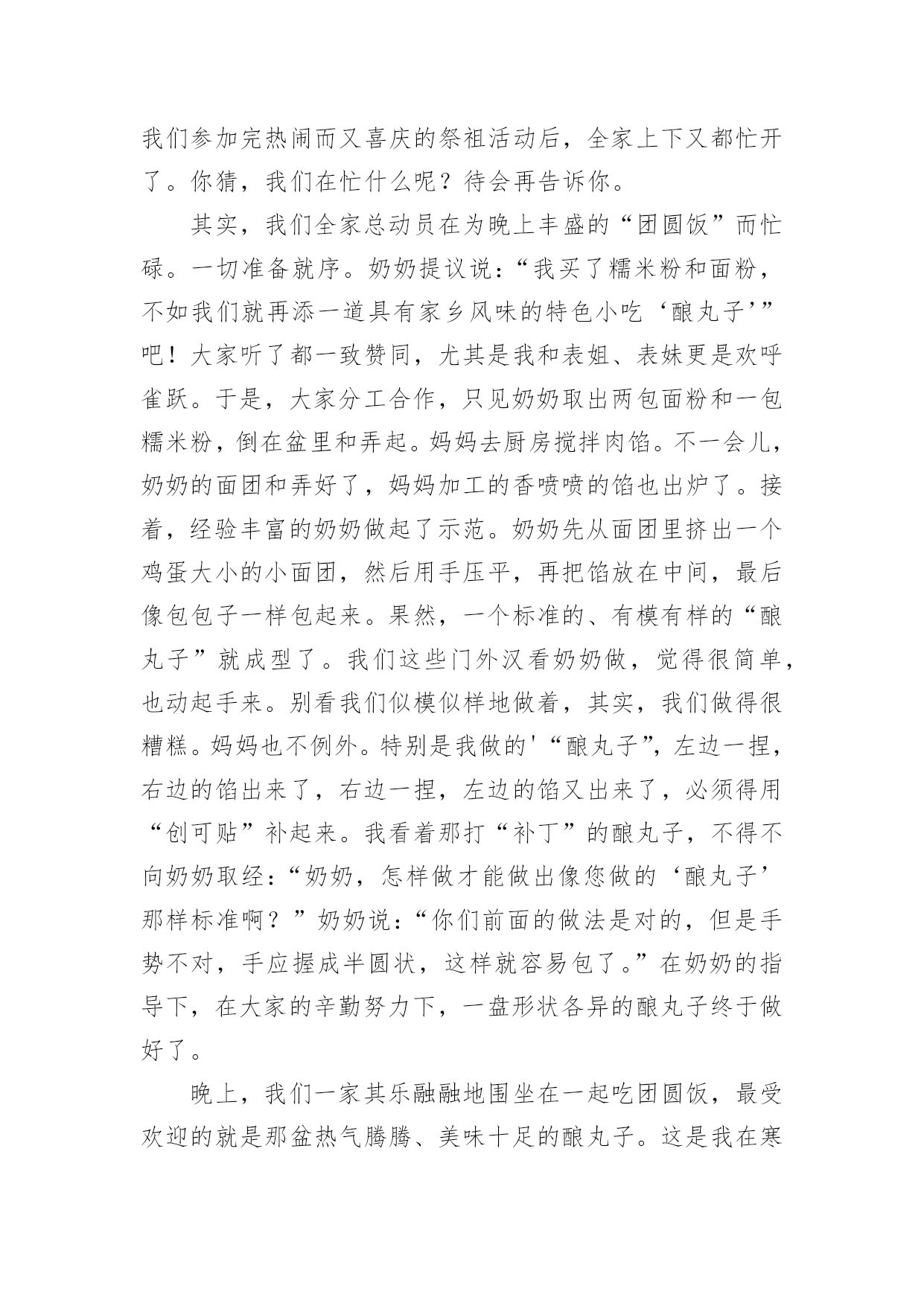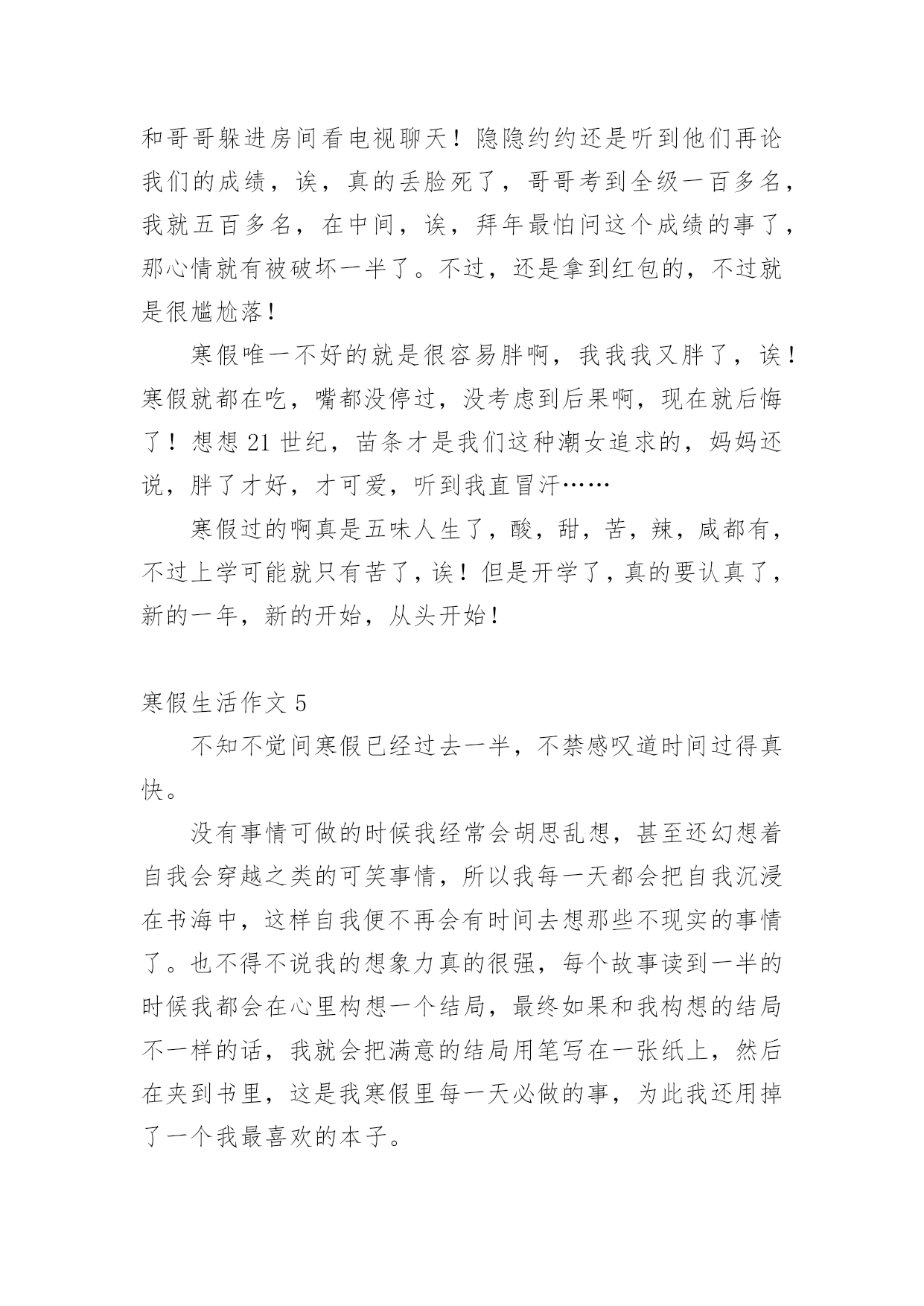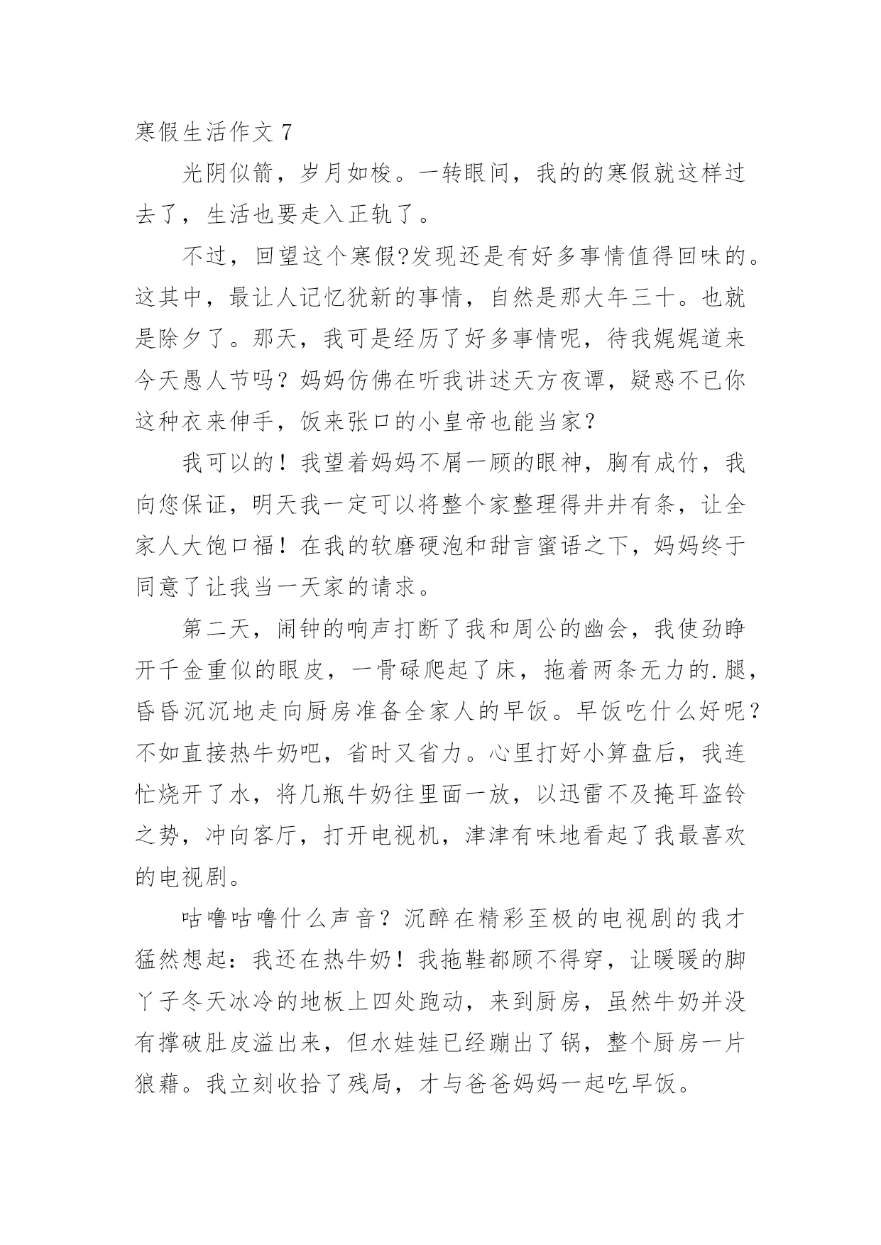 寒假生活作文寒假生活作文【集锦15篇】在平平淡淡的学习、工作、生活中,许多人都写过作文吧,作文是一种言语活动,具有高度的综合性和创造性。你写作文时总是无从下笔?以下是小编帮大家整理的寒假生活作文,仅供参考,希望能够帮助到大家。寒假生活作文1些平时想做却没时间实践的事。我们全家人利用三天的时间开车到位于台中东势的名胜,大雪山森林游乐区享受天然的森林浴,大量吸收对人体有益的芬多精。站在足足有八百九十多岁的巨大神木前,不但让我感受到大自然具有韧性的一面,更让我体会人类的渺小,看着年长的神木依然长满茂密的枝叶,迎风低声吟唱,真让我感慨一些不懂得爱惜生命的人们,连一棵大树都明白要弯下树干抵挡强风,还有什么是我们无法克服的呢?当然,该玩的玩过了,该休息的也休息了,再来就是要重拾书本,找回阅读的'习惯。因为即使是寒假,适当的阅读仍是必要的。所以只要有长假,妈妈总会带我去书店选购书籍,不论是历史、伟人、小说、文学作品??等,都是我喜爱的种类,阅读一本书就好像经历一场有趣的冒险一样,总是令我爱不释手,非得一口气把它看完不可。其实,我觉得书本是知识的来源,尤其是某些发人深省的文学作品,可以使我沉淀心灵,静下来思考,藉此让心中的眼睛睁开苏醒。或许,有些人认为寒假应该是毫无压力的假期,不过我觉得,寒假固然是让平时紧张又充满规律的快步调生活暂时停歇、放松的假期,但如果总是以「吃饱睡、睡饱吃」的方式度过整整三个星期,那么试问,以高等文明动物自居的人类和其它的动物又有什么差别呢?所以,人必须保持在充满思考、力求进步的状态,才不会辜负了人类与生俱来的智慧及潜能。转眼间,寒假已进入了尾声,整整一个月都和家人相处在一起,使我不禁想念起同学及老师的笑容。而我相信,经过这些日子的休息,新的学期里我更能凝聚所有的心力,力求更好的表现。寒假生活作文2辛苦了一个学期的同学们终于迎来了他们梦寐以求的寒假。在我的寒假之中发生了许许多多的事情。有令人伤心的;有令人不痛快的;也有令人发笑的。既然我的题目是“寒假趣事”所以我写的是一件令人发笑的事。过年是一个喜庆的日子,到处洋溢着欢声笑语。大约在初一下午的四点多,我与妈妈拖着疲惫的身子回到了温馨的家(由于爸爸是一位警察所以正在他那神圣的工作岗位上奋斗呢!)六点半左右我饿了,于是,我和妈妈去地下室里拿菜。妈妈说;“雯雯,别忘把钥匙拿着。”可是,我却没有听见,关上门我才想起来问妈妈;“钥匙呢?”妈妈说:“我不是让你拿着了吗?”我说:“没有呀!”妈妈说:“这下可惨了,也没有带手机,可怎麽办呀?”于是,我们敲了敲对门的防盗门,可是里面没有人。这下子妈妈可慌了神,我们异口同声的.说:“这下怎麽办呀?”忽然妈妈对我说:“你在这等着,我去楼下借手机,给你爸爸打电话,让你爸爸把钥匙送过来。”我看了看这时的妈妈,平时漂亮精神的妈妈不知那里去了,头发乱乱的(刚刚睡醒);最糟糕的还是妈妈的脚,红色的袜子黑色的小沙鞋,要多丑有多丑。而在此时也没办法呀,最后妈妈理了理头发,也顾不了形象硬着头皮去了。我只听见妈妈在楼下叫道:“白奶奶呀,请借我电话用一下,我的钥匙落在了地下室里。”白奶奶热情的说:“快进来吧!”过了大约五分钟妈妈从白奶奶家出来了,妈妈告诉我说:“爸爸一会儿就来了。”于是我与妈妈就静静的等待爸爸的回来。过了一会儿感觉有人上来了,我以为一定是爸爸就大声喊:“爸爸!”当那个人走上来时,我的脸一下子就“发烧”了,原来那个人只是一个比我大不了几岁的哥哥。事发三十分钟内爸爸赶回了,我们也终于走进了自己的家门。大家看完这篇文章是不是笑话我的马虎呢?所以我一定改正这个缺点,请大家监督我!寒假生活作文3大年三十,我们一家三口高高兴兴地回老家团聚。中午,我们参加完热闹而又喜庆的祭祖活动后,全家上下又都忙开了。你猜,我们在忙什么呢?待会再告诉你。其实,我们全家总动员在为晚上丰盛的“团圆饭”而忙碌。一切准备就序。奶奶提议说:“我买了糯米粉和面粉,不如我们就再添一道具有家乡风味的特色小吃‘酿丸子’”吧!大家听了都一致赞同,尤其是我和表姐、表妹更是欢呼雀跃。于是,大家分工合作,只见奶奶取出两包面粉和一包糯米粉,倒在盆里和弄起。妈妈去厨房搅拌肉馅。不一会儿,奶奶的面团和弄好了,妈妈加工的香喷喷的馅也出炉了。接着,经验丰富的奶奶做起了示范。奶奶先从面团里挤出一个鸡蛋大小的小面团,然后用手压平,再把馅放在中间,最后像包包子一样包起来。果然,一个标准的、有模有样的“酿丸子”就成型了。我们这些门外汉看奶奶做,觉得很简单,也动起手来。别看我们似模似样地做着,其实,我们做得很糟糕。妈妈也不例外。特别是我做的'“酿丸子”,左边一捏,右边的馅出来了,右边一捏,左边的馅又出来了,必须得用“创可贴”补起来。我看着那打“补丁”的酿丸子,不得不向奶奶取经:“奶奶,怎样做才能做出像您做的‘酿丸子’