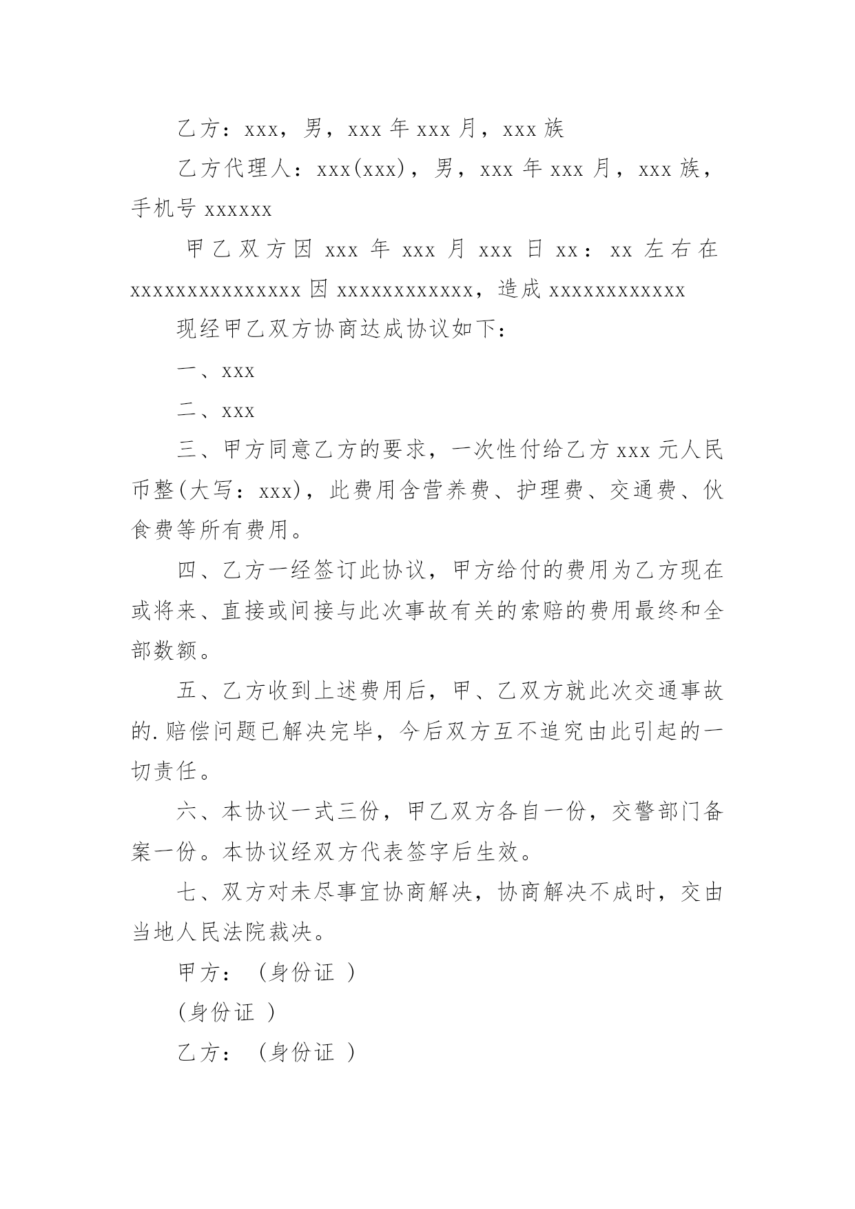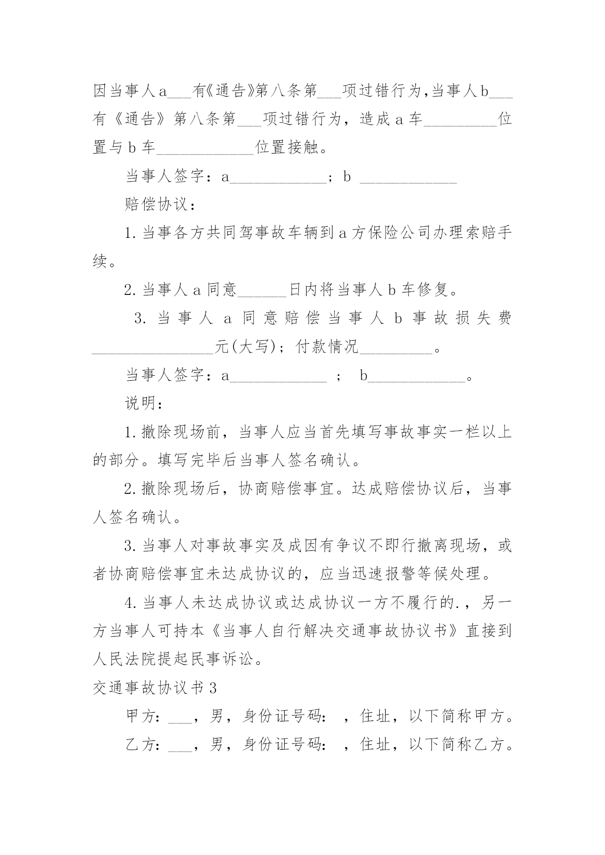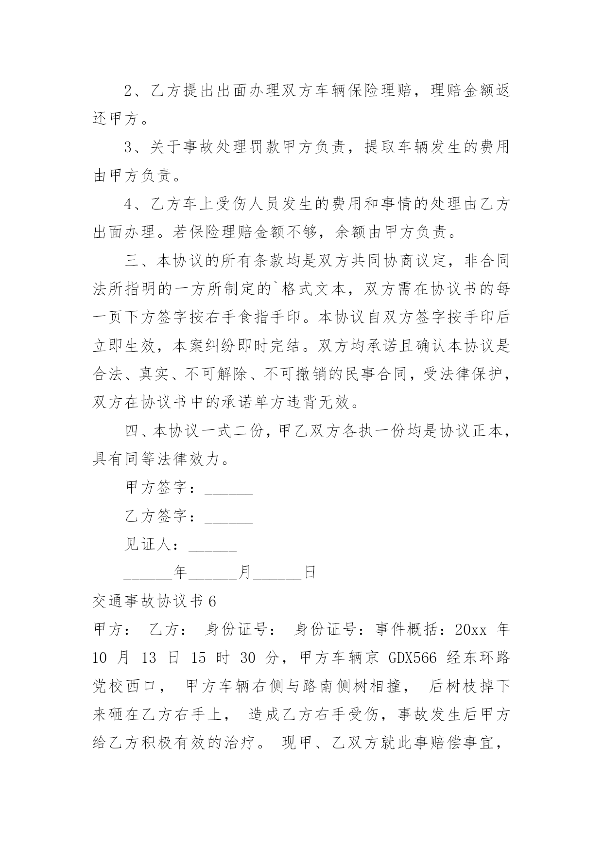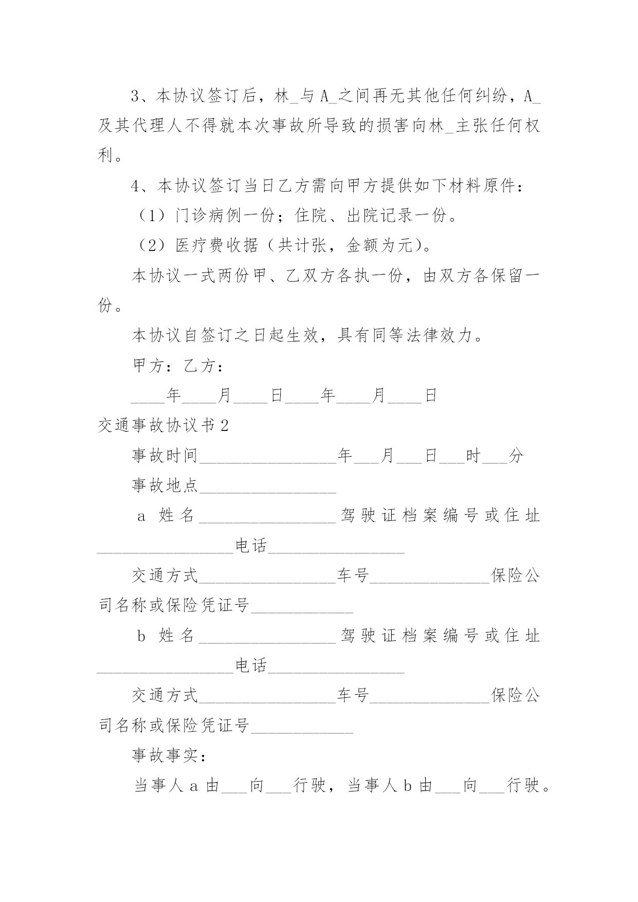 交通事故协议书交通事故协议书在生活中,协议起到的作用越来越大,签订协议能够保证双方合作愉快。什么样的协议才是有效的呢?以下是小编帮大家整理的交通事故协议书,供大家参考借鉴,希望可以帮助到有需要的朋友。交通事故协议书1甲方:林__,身份证号:住址:乙方:A___,身份证号:住址:事故经过:_年_月_日_时,林_驾驶摩托车(牌号为),沿__路由_地向_地行驶,至__处时,由于下雨造成道路湿滑,林_为避开行人A_,但刹车不及,因此将A_刮倒。林_立即将A_送至__医院进行检查、救治,经__医院详细检查,确诊A_并无大碍,只是(以医院的检查报告为准对伤情进行一个描述)。经过医院对A_进行了一系列必要的处理后,A_决定出院现林_、A_双方经过充分协商,自愿达成如下和解协议:1、林_除支付A__年_月_日至_年_月_日的`医疗费外(以医院出具的收费单据为准),另行赔付A_人民币______元(大写)。2、本协议签订当日林_需一次性将元的赔偿款全部支付给A_。3、本协议签订后,林_与A_之间再无其他任何纠纷,A_及其代理人不得就本次事故所导致的损害向林_主张任何权利。4、本协议签订当日乙方需向甲方提供如下材料原件:(1)门诊病例一份;住院、出院记录一份。(2)医疗费收据(共计张,金额为元)。本协议一式两份甲、乙双方各执一份,由双方各保留一份。本协议自签订之日起生效,具有同等法律效力。甲方:乙方:____年____月____日____年____月____日交通事故协议书2事故时间________________年___月___日___时___分事故地点________________a姓名________________驾驶证档案编号或住址________________电话________________交通方式________________车号______________保险公司名称或保险凭证号____________b姓名________________驾驶证档案编号或住址________________电话________________交通方式________________车号______________保险公司名称或保险凭证号____________事故事实:当事人a由___向___行驶,当事人b由___向___行驶。因当事人a___有《通告》第八条第___项过错行为,当事人b___有《通告》第八条第___项过错行为,造成a车_________位置与b车____________位置接触。当事人签字:a____________;b____________赔偿协议:1.当事各方共同驾事故车辆到a方保险公司办理索赔手续。2.当事人a同意______日内将当事人b车修复。3.当事人a同意赔偿当事人b事故损失费_______________元(大写);付款情况_________。当事人签字:a____________;b____________。说明:1.撤除现场前,当事人应当首先填写事故事实一栏以上的部分。填写完毕后当事人签名确认。2.撤除现场后,协商赔偿事宜。达成赔偿协议后,当事人签名确认。3.当事人对事故事实及成因有争议不即行撤离现场,或者协商赔偿事宜未达成协议的,应当迅速报警等候处理。4.当事人未达成协议或达成协议一方不履行的.,另一方当事人可持本《当事人自行解决交通事故协议书》直接到人民法院提起民事诉讼。交通事故协议书3甲方:___,男,身份证号码:,住址,以下简称甲方。乙方:___,男,身份证号码:,住址,以下简称乙方。甲乙双方在平等、自愿的基础上,本着公平公正,合理合法,以人为本的原则,就___年___月___日在___地段发生的'道路交通事故,就交通事故所造成的损害达成赔偿协议如下:一、甲方自愿一次性赔偿乙方各种法定人身损害赔偿项目共计人民币大写:___(小写:___元)。二、乙方同意接受上述赔偿款项,并放弃对甲方的其它一切权利,不再要求甲方进行任何形式的赔偿或承担其它任何责任。三、甲乙双方当事人应积极协助_机关处理事故,保险公司理赔事项,不得相互设置障碍。四、本协议签字合法有效后,乙方保证没有其他权利人或利害关系人就此次交通事故再向甲方主张权利,若造成甲方其它损失,则由乙方承担全部责任。五、本协议于___年___月___日甲、乙双方在_大队的见证下双方签字后立即生效。六、本协议一式三份,甲、乙双方和____大队各持一份。甲方签字:乙方签字:部门:__年__月__日交通事故协议书4甲方:xxx(驾驶员),男,xxx年x月,xxx族,手机号xxxxxxxxx(车主),女,xxx年x月,xxx族,手机号xxxxxxxx乙方:xxx,男,xxx年xxx月,xxx族乙方代理人:xxx(xxx),男,xxx年xxx月,xxx族