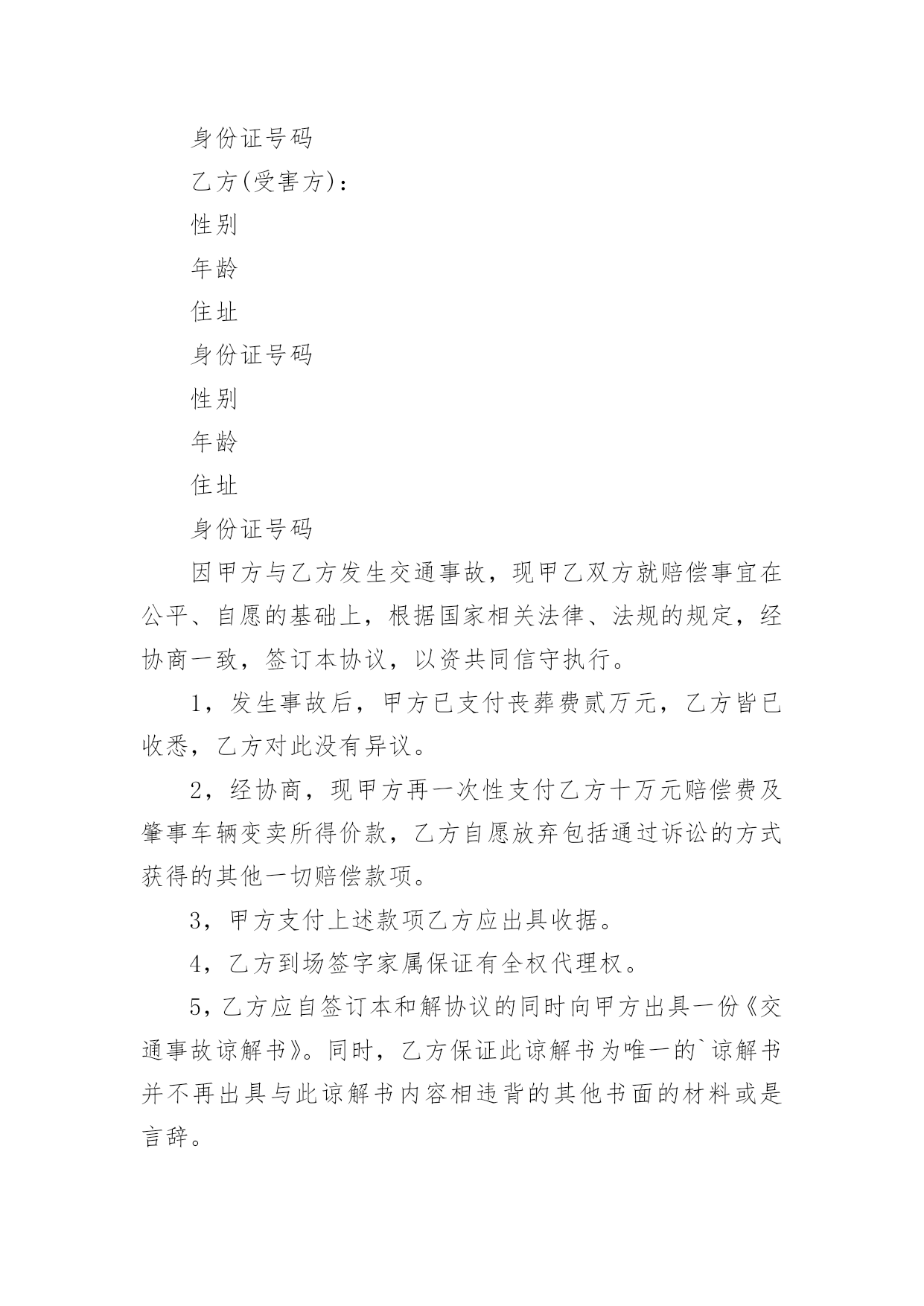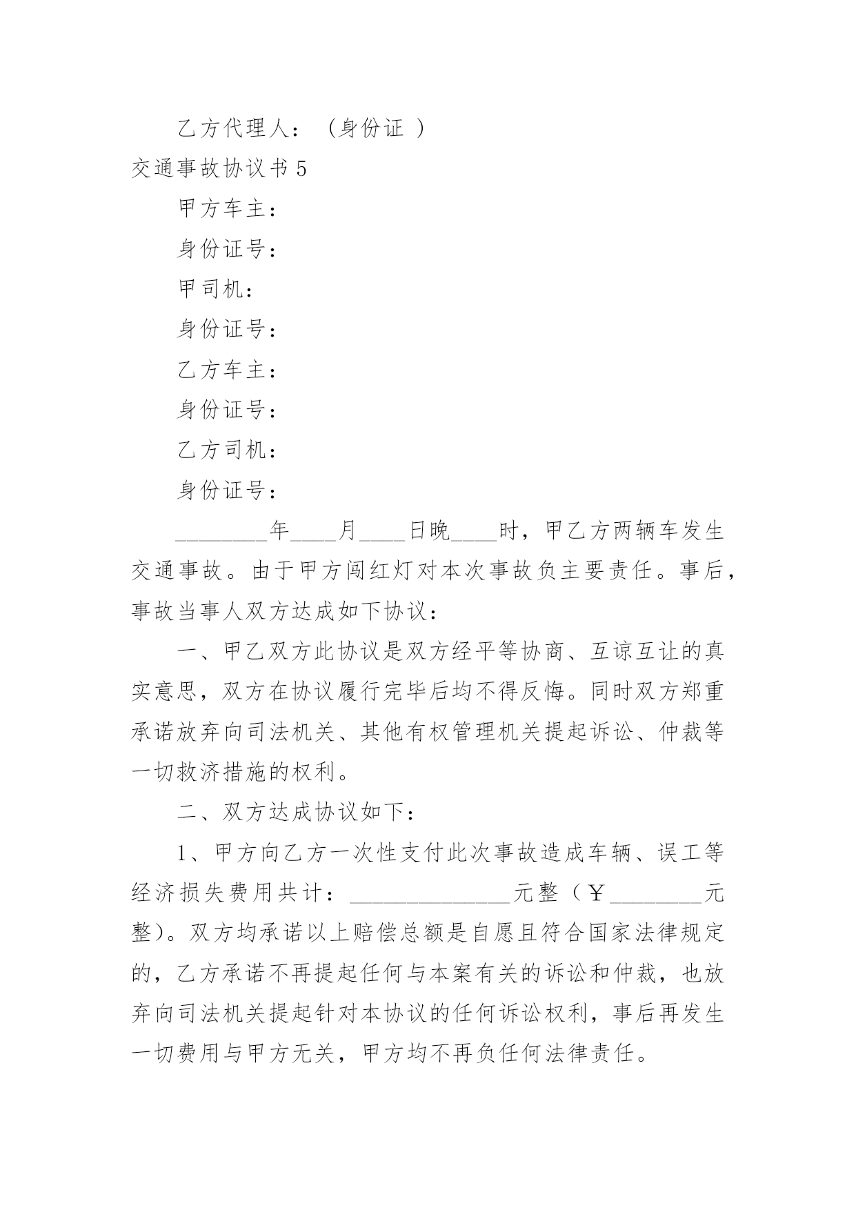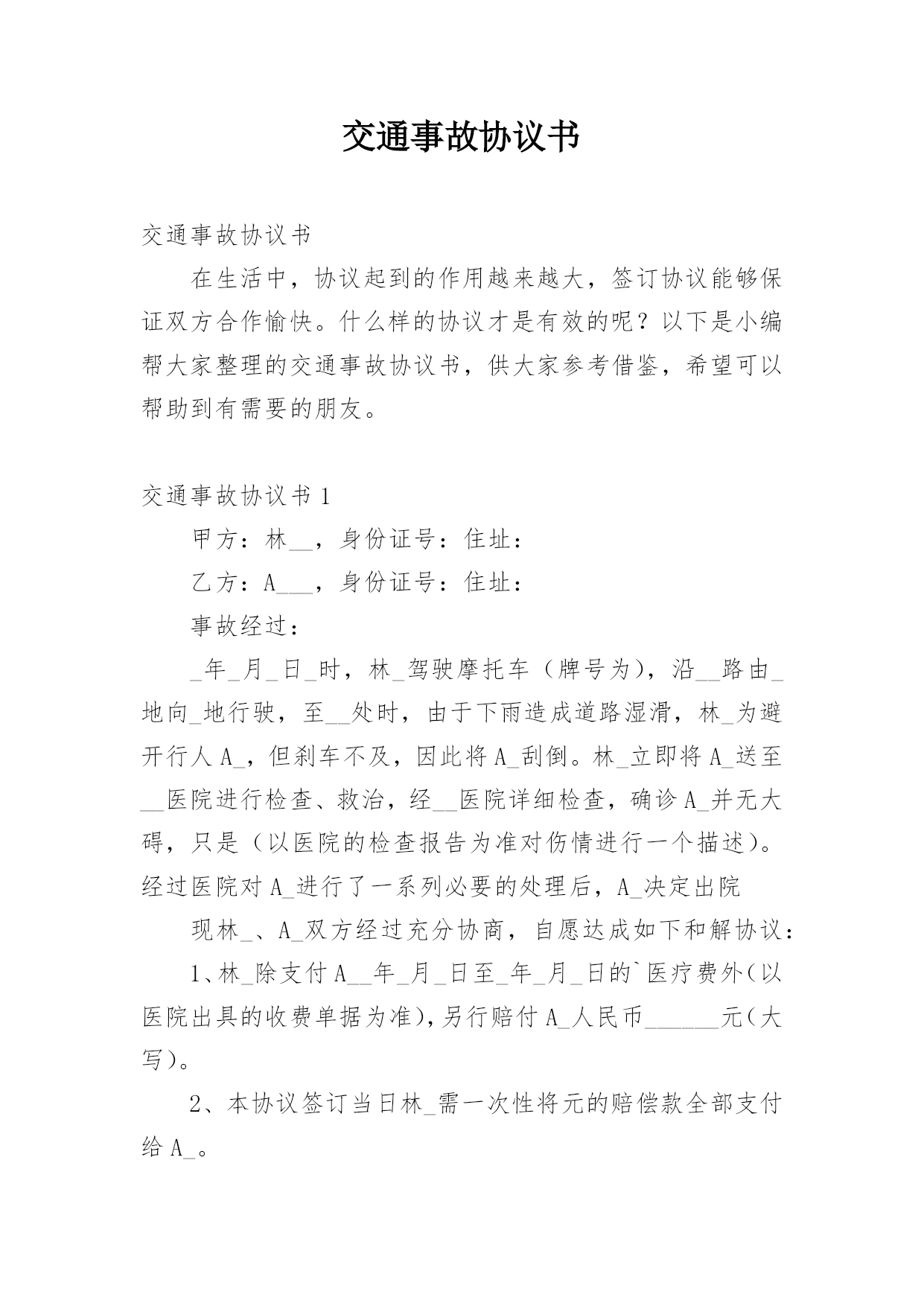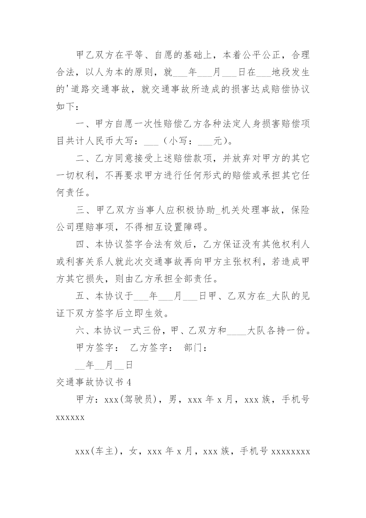 交通事故协议书交通事故协议书在生活中,协议起到的作用越来越大,签订协议能够保证双方合作愉快。什么样的协议才是有效的呢?以下是小编帮大家整理的交通事故协议书,供大家参考借鉴,希望可以帮助到有需要的朋友。交通事故协议书1甲方:林__,身份证号:住址:乙方:A___,身份证号:住址:事故经过:_年_月_日_时,林_驾驶摩托车(牌号为),沿__路由_地向_地行驶,至__处时,由于下雨造成道路湿滑,林_为避开行人A_,但刹车不及,因此将A_刮倒。林_立即将A_送至__医院进行检查、救治,经__医院详细检查,确诊A_并无大碍,只是(以医院的检查报告为准对伤情进行一个描述)。经过医院对A_进行了一系列必要的处理后,A_决定出院现林_、A_双方经过充分协商,自愿达成如下和解协议:1、林_除支付A__年_月_日至_年_月_日的`医疗费外(以医院出具的收费单据为准),另行赔付A_人民币______元(大写)。2、本协议签订当日林_需一次性将元的赔偿款全部支付给A_。3、本协议签订后,林_与A_之间再无其他任何纠纷,A_及其代理人不得就本次事故所导致的损害向林_主张任何权利。4、本协议签订当日乙方需向甲方提供如下材料原件:(1)门诊病例一份;住院、出院记录一份。(2)医疗费收据(共计张,金额为元)。本协议一式两份甲、乙双方各执一份,由双方各保留一份。本协议自签订之日起生效,具有同等法律效力。甲方:乙方:____年____月____日____年____月____日交通事故协议书2事故时间________________年___月___日___时___分事故地点________________a姓名________________驾驶证档案编号或住址________________电话________________交通方式________________车号______________保险公司名称或保险凭证号____________b姓名________________驾驶证档案编号或住址________________电话________________交通方式________________车号______________保险公司名称或保险凭证号____________事故事实:当事人a由___向___行驶,当事人b由___向___行驶。因当事人a___有《通告》第八条第___项过错行为,当事人b___有《通告》第八条第___项过错行为,造成a车_________位置与b车____________位置接触。当事人签字:a____________;b____________赔偿协议:1.当事各方共同驾事故车辆到a方保险公司办理索赔手续。2.当事人a同意______日内将当事人b车修复。3.当事人a同意赔偿当事人b事故损失费_______________元(大写);付款情况_________。当事人签字:a____________;b____________。说明:1.撤除现场前,当事人应当首先填写事故事实一栏以上的部分。填写完毕后当事人签名确认。2.撤除现场后,协商赔偿事宜。达成赔偿协议后,当事人签名确认。3.当事人对事故事实及成因有争议不即行撤离现场,或者协商赔偿事宜未达成协议的,应当迅速报警等候处理。4.当事人未达成协议或达成协议一方不履行的.,另一方当事人可持本《当事人自行解决交通事故协议书》直接到人民法院提起民事诉讼。交通事故协议书3甲方:___,男,身份证号码:,住址,以下简称甲方。乙方:___,男,身份证号码:,住址,以下简称乙方。甲乙双方在平等、自愿的基础上,本着公平公正,合理合法,以人为本的原则,就___年___月___日在___地段发生的'道路交通事故,就交通事故所造成的损害达成赔偿协议如下:一、甲方自愿一次性赔偿乙方各种法定人身损害赔偿项目共计人民币大写:___(小写:___元)。二、乙方同意接受上述赔偿款项,并放弃对甲方的其它一切权利,不再要求甲方进行任何形式的赔偿或承担其它任何责任。三、甲乙双方当事人应积极协助_机关处理事故,保险公司理赔事项,不得相互设置障碍。四、本协议签字合法有效后,乙方保证没有其他权利人或利害关系人就此次交通事故再向甲方主张权利,若造成甲方其它损失,则由乙方承担全部责任。五、本协议于___年___月___日甲、乙双方在_大队的见证下双方签字后立即生效。六、本协议一式三份,甲、乙双方和____大队各持一份。甲方签字:乙方签字:部门:__年__月__日交通事故协议书4甲方:xxx(驾驶员),男,xxx年x月,xxx族,手机号xxxxxxxxx(车主),女,xxx年x月,xxx族,手机号xxxxxxxx乙方:xxx,男,xxx年xxx月,xxx族乙方代理人:xxx(xxx),男,xxx年xxx月,xxx族