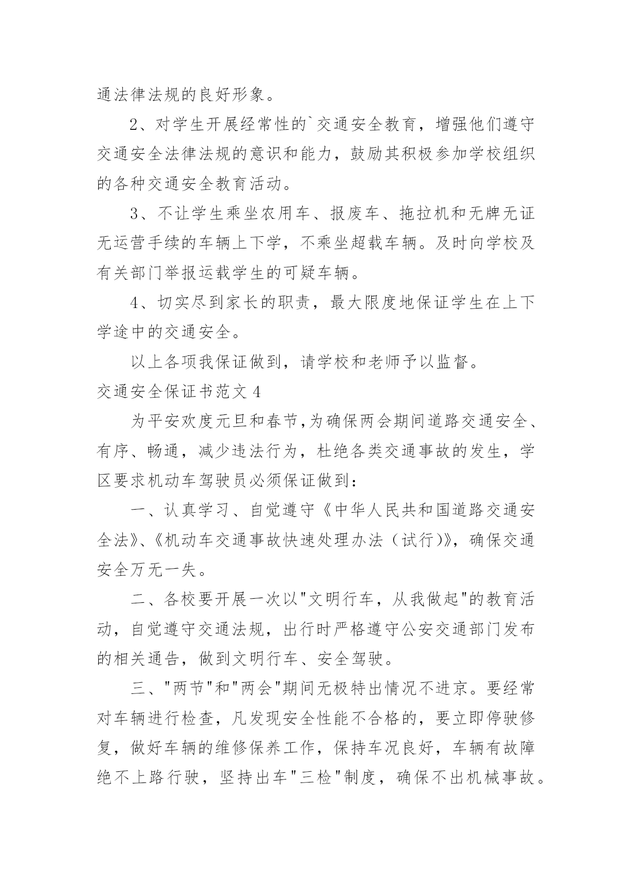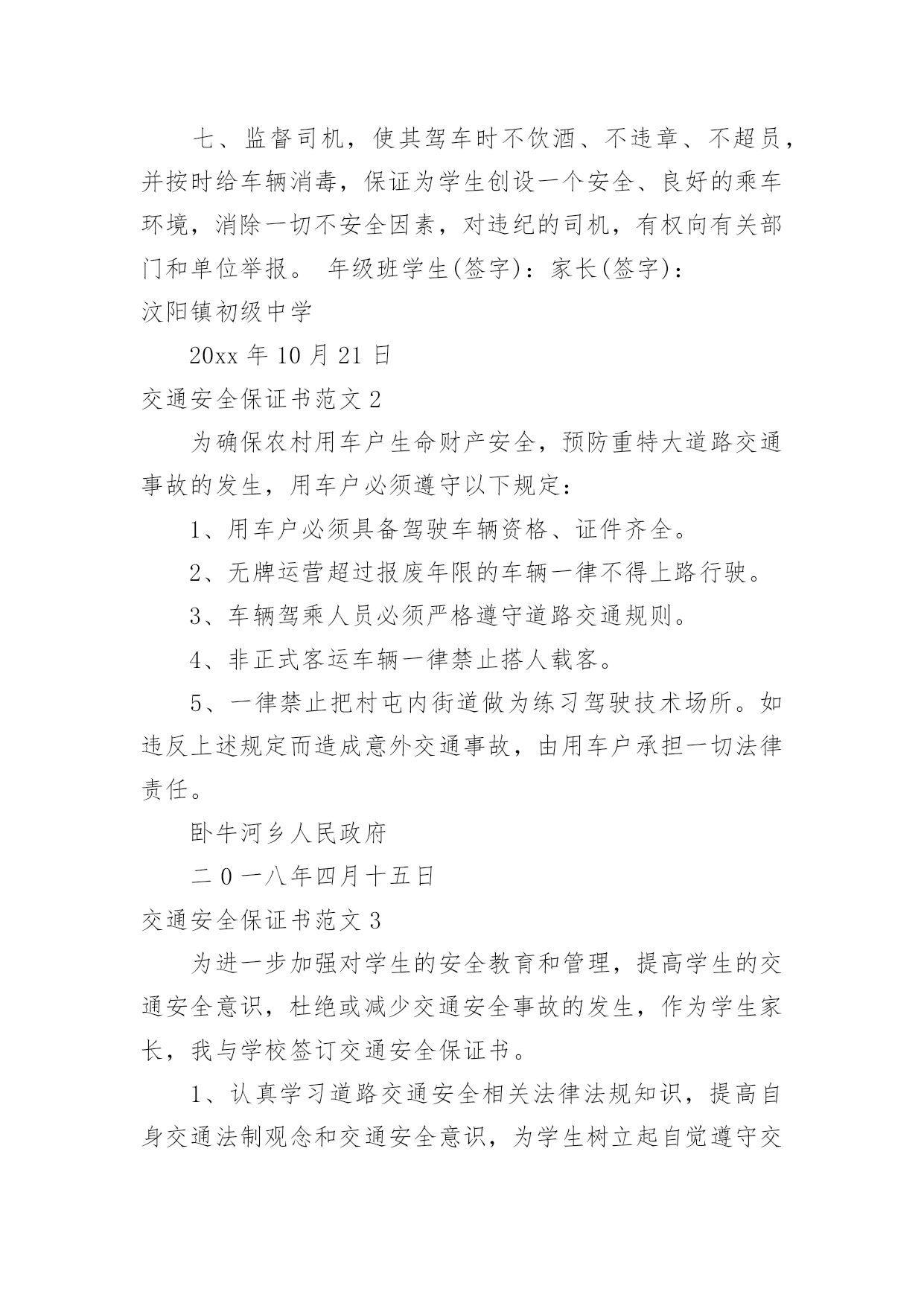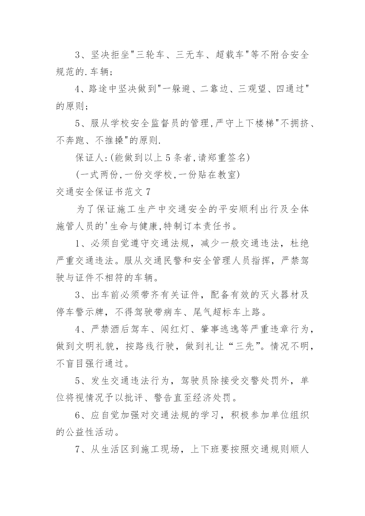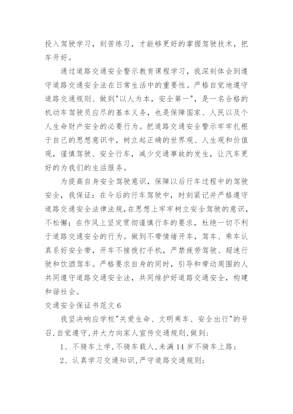 交通安全保证书交通安全保证书范文随着社会一步步向前发展,大家逐渐认识到保证书的重要性,保证书有利于保证者依此进行自我检查、自我约束、自我督促。一听到写保证书就拖延症懒癌齐复发?下面是小编帮大家整理的交通安全保证书范文,仅供参考,大家一起来看看吧。交通安全保证书范文1为保证学生的交通安全,我保证做到:一、认真教育孩子,自觉遵守交通法规,养成良好的行为习惯.不在公路上踢球、游玩、戏闹。上学、放学时时处处注意交通安全。二、教育孩子乘车时要遵守秩序,注意乘车安全。三、作为孩子的第一监护人,我保证孩子不乘坐无标识、无证、无牌或不合手续的报废车、农用车及个别私自组织的无运营手续的违规车辆。否则发生问题,后果自负。四、教育孩子文明乘车,不拥挤,不抢座,不打架,自觉遵守乘车纪律,确保乘车期间的人身安全。五、现在个别接送学生的.车辆超员严重,保证自己的孩子不乘坐超员的车辆。否则由此引发的各种问题,后果由自负。]六、监督孩子在规定的时间内到指定的地点等车、坐车。不得提前出门,更不得在大街上跑闹。七、监督司机,使其驾车时不饮酒、不违章、不超员,并按时给车辆消毒,保证为学生创设一个安全、良好的乘车环境,消除一切不安全因素,对违纪的司机,有权向有关部门和单位举报。年级班学生(签字):家长(签字):汶阳镇初级中学20xx年10月21日交通安全保证书范文2为确保农村用车户生命财产安全,预防重特大道路交通事故的发生,用车户必须遵守以下规定:1、用车户必须具备驾驶车辆资格、证件齐全。2、无牌运营超过报废年限的车辆一律不得上路行驶。3、车辆驾乘人员必须严格遵守道路交通规则。4、非正式客运车辆一律禁止搭人载客。5、一律禁止把村屯内街道做为练习驾驶技术场所。如违反上述规定而造成意外交通事故,由用车户承担一切法律责任。卧牛河乡人民政府二0一八年四月十五日交通安全保证书范文3为进一步加强对学生的安全教育和管理,提高学生的交通安全意识,杜绝或减少交通安全事故的发生,作为学生家长,我与学校签订交通安全保证书。1、认真学习道路交通安全相关法律法规知识,提高自身交通法制观念和交通安全意识,为学生树立起自觉遵守交通法律法规的良好形象。2、对学生开展经常性的`交通安全教育,增强他们遵守交通安全法律法规的意识和能力,鼓励其积极参加学校组织的各种交通安全教育活动。3、不让学生乘坐农用车、报废车、拖拉机和无牌无证无运营手续的车辆上下学,不乘坐超载车辆。及时向学校及有关部门举报运载学生的可疑车辆。4、切实尽到家长的职责,最大限度地保证学生在上下学途中的交通安全。以上各项我保证做到,请学校和老师予以监督。交通安全保证书范文4为平安欢度元旦和春节,为确保两会期间道路交通安全、有序、畅通,减少违法行为,杜绝各类交通事故的发生,学区要求机动车驾驶员必须保证做到:一、认真学习、自觉遵守《中华人民共和国道路交通安全法》、《机动车交通事故快速处理办法(试行)》,确保交通安全万无一失。二、各校要开展一次以"文明行车,从我做起"的教育活动,自觉遵守交通法规,出行时严格遵守公安交通部门发布的相关通告,做到文明行车、安全驾驶。三、"两节"和"两会"期间无极特出情况不进京。要经常对车辆进行检查,凡发现安全性能不合格的,要立即停驶修复,做好车辆的维修保养工作,保持车况良好,车辆有故障绝不上路行驶,坚持出车"三检"制度,确保不出机械事故。四、要做到"六知二保"即知人、知地、知车辆、知技术状况、知行驶路线、知隐患、保安全、保守法,确保春节期间不发生任何问题。五、服从学校交通安全的`管理,遵守学校交通安全管理的各项规定,无极特殊情况没有校长批准不得开车行驶,否则一切后果自负。单位(盖章):驾驶员签名:联系电话:马坊第一学区20xx年1月27日交通安全保证书范文5通过参加华联驾校组织的道路交通安全警示教育课程的学习,我真切认识到"车祸猛于虎"的残酷事实。那一幕幕因人们忽视安全思想学习、违反道路交通安全法规而引发的交通事故场景令人触目惊心,车祸惨剧给国家和家庭造成无法弥补的重大损失。通过观看交通安全宣传片,我深刻体会到道路交通安全就存在于我们日常驾车过程的每一个细节里,稍有懈怠都会酿成恶果,发人深省。通过学习道路交通安全警示教育课程,我的思想意识觉悟得到很大的`提高,对交通安全有了更为深刻到位的理解。学习驾驶机动车,首先学车要谦虚谨慎,不可急躁。其次,开车要集中精力,不要走神。第三,要多学习了解交通法规,驾车做到知法守法,"宁等三分,不抢一秒"。第四,全身心投入驾驶学习,刻苦练习,才能够更好的掌握驾驶技术,把车开好。通过道路交通安全警示教育课程学习,我深刻体会到遵守道路交通安全法在日常生活中的重要性。严格自觉地遵守道路交通规则、做到"以人为本,安全第一",是一名合格的机动车驾驶员应尽的基本义务,也是保障国家、人民以及个人