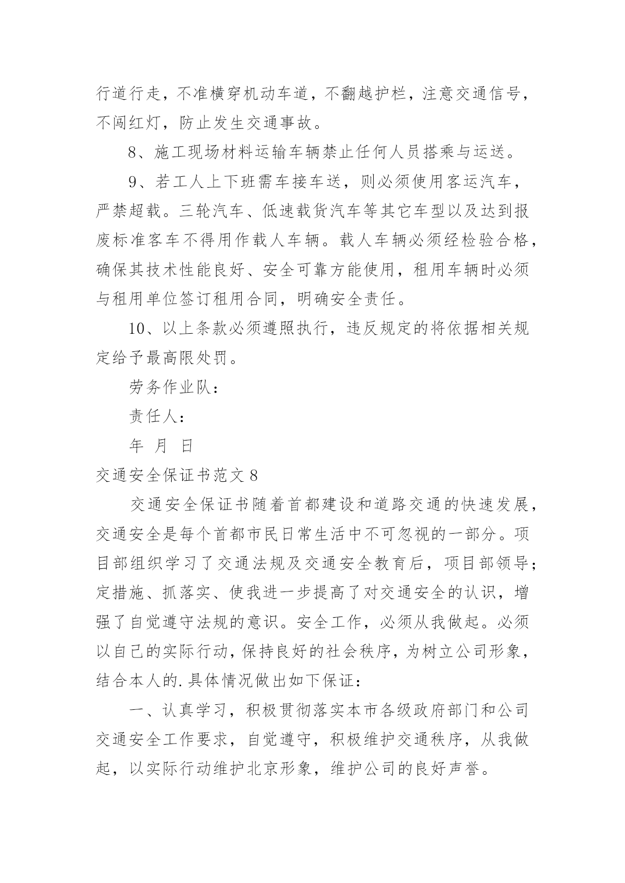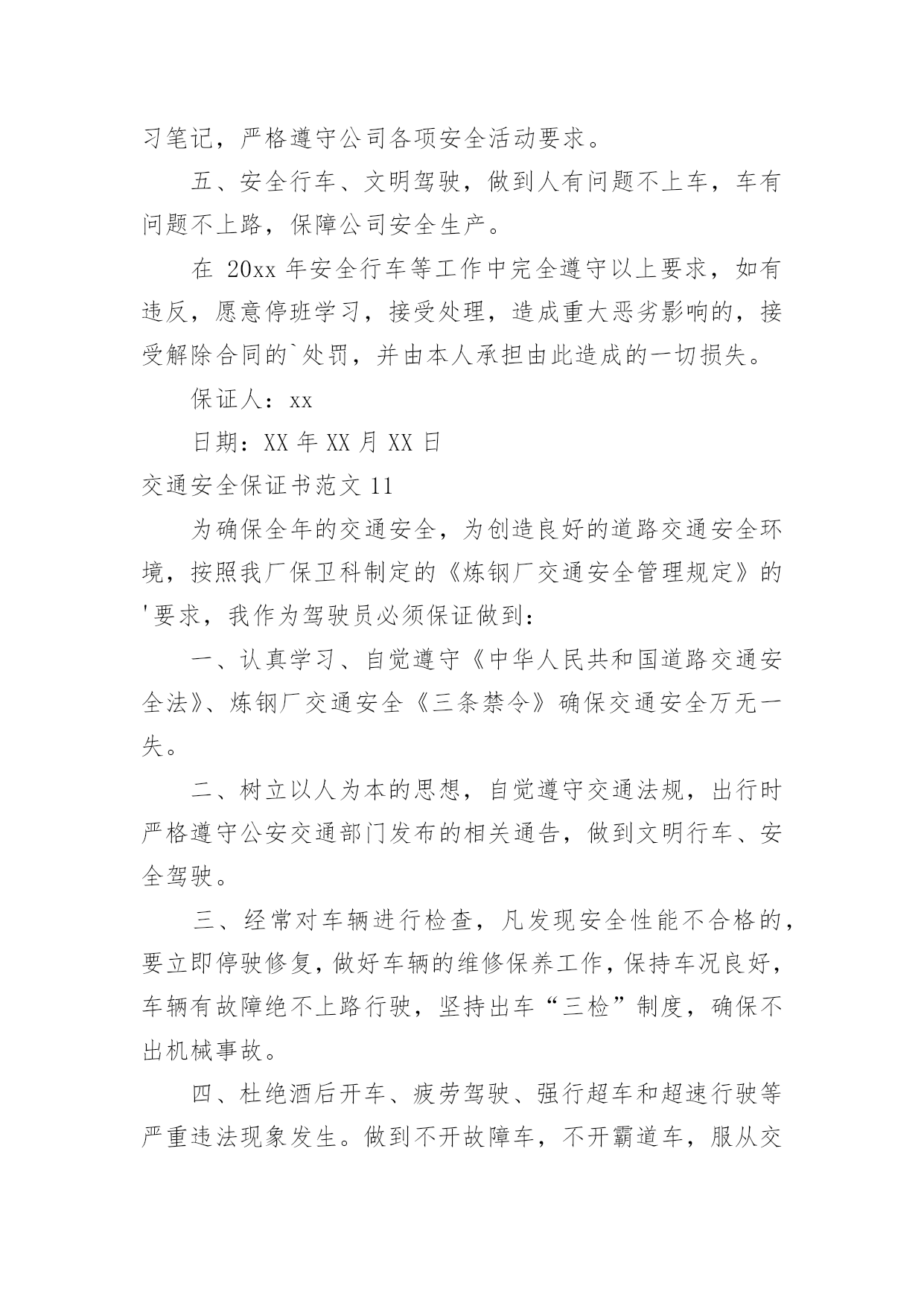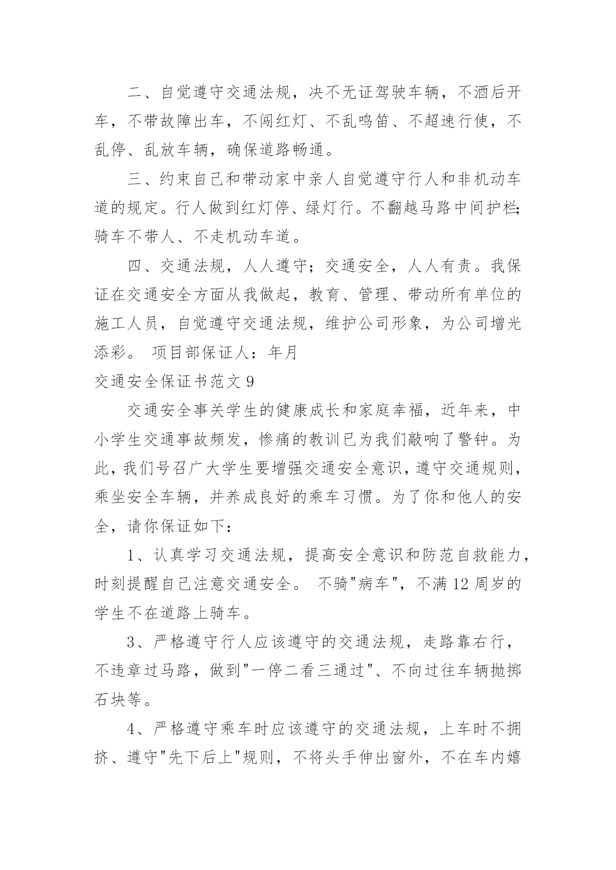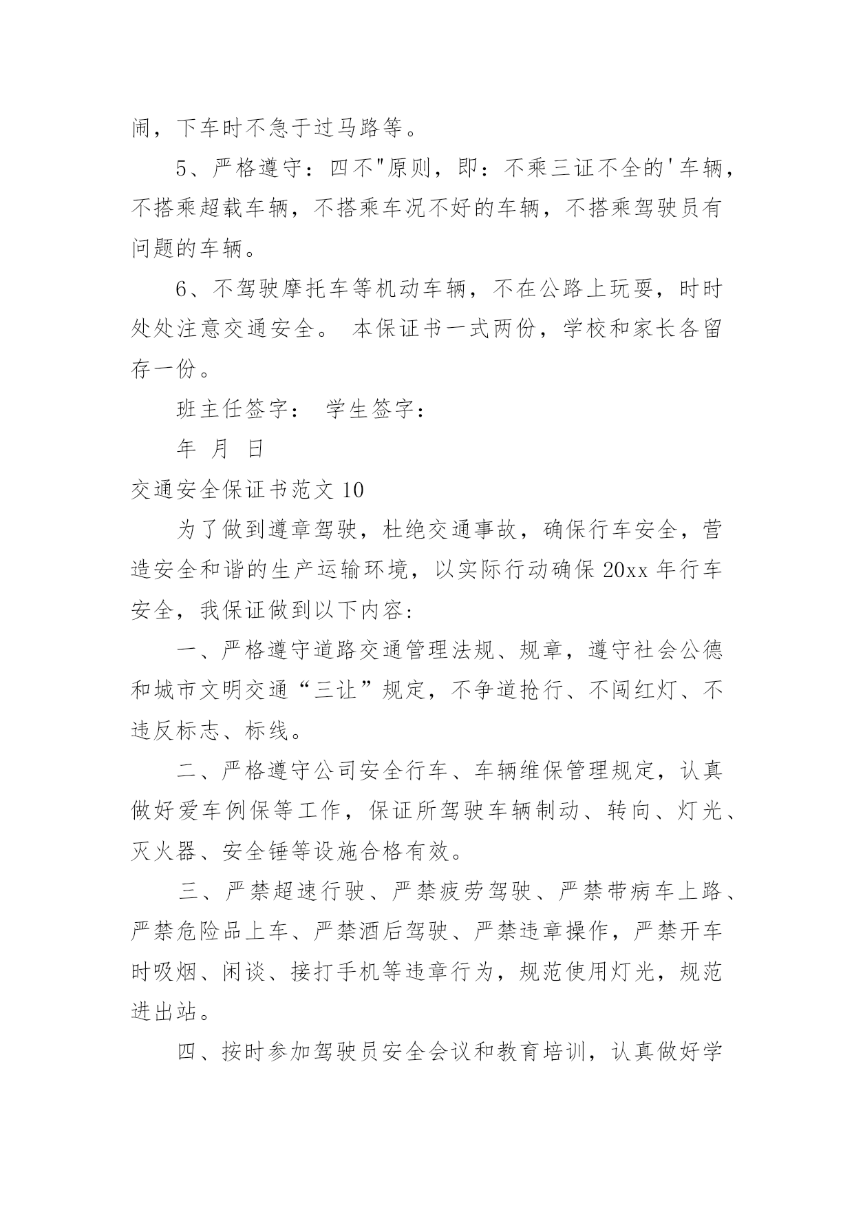 交通安全保证书交通安全保证书范文随着社会一步步向前发展,大家逐渐认识到保证书的重要性,保证书有利于保证者依此进行自我检查、自我约束、自我督促。一听到写保证书就拖延症懒癌齐复发?下面是小编帮大家整理的交通安全保证书范文,仅供参考,大家一起来看看吧。交通安全保证书范文1为保证学生的交通安全,我保证做到:一、认真教育孩子,自觉遵守交通法规,养成良好的行为习惯.不在公路上踢球、游玩、戏闹。上学、放学时时处处注意交通安全。二、教育孩子乘车时要遵守秩序,注意乘车安全。三、作为孩子的第一监护人,我保证孩子不乘坐无标识、无证、无牌或不合手续的报废车、农用车及个别私自组织的无运营手续的违规车辆。否则发生问题,后果自负。四、教育孩子文明乘车,不拥挤,不抢座,不打架,自觉遵守乘车纪律,确保乘车期间的人身安全。五、现在个别接送学生的.车辆超员严重,保证自己的孩子不乘坐超员的车辆。否则由此引发的各种问题,后果由自负。]六、监督孩子在规定的时间内到指定的地点等车、坐车。不得提前出门,更不得在大街上跑闹。七、监督司机,使其驾车时不饮酒、不违章、不超员,并按时给车辆消毒,保证为学生创设一个安全、良好的乘车环境,消除一切不安全因素,对违纪的司机,有权向有关部门和单位举报。年级班学生(签字):家长(签字):汶阳镇初级中学20xx年10月21日交通安全保证书范文2为确保农村用车户生命财产安全,预防重特大道路交通事故的发生,用车户必须遵守以下规定:1、用车户必须具备驾驶车辆资格、证件齐全。2、无牌运营超过报废年限的车辆一律不得上路行驶。3、车辆驾乘人员必须严格遵守道路交通规则。4、非正式客运车辆一律禁止搭人载客。5、一律禁止把村屯内街道做为练习驾驶技术场所。如违反上述规定而造成意外交通事故,由用车户承担一切法律责任。卧牛河乡人民政府二0一八年四月十五日交通安全保证书范文3为进一步加强对学生的安全教育和管理,提高学生的交通安全意识,杜绝或减少交通安全事故的发生,作为学生家长,我与学校签订交通安全保证书。1、认真学习道路交通安全相关法律法规知识,提高自身交通法制观念和交通安全意识,为学生树立起自觉遵守交通法律法规的良好形象。2、对学生开展经常性的`交通安全教育,增强他们遵守交通安全法律法规的意识和能力,鼓励其积极参加学校组织的各种交通安全教育活动。3、不让学生乘坐农用车、报废车、拖拉机和无牌无证无运营手续的车辆上下学,不乘坐超载车辆。及时向学校及有关部门举报运载学生的可疑车辆。4、切实尽到家长的职责,最大限度地保证学生在上下学途中的交通安全。以上各项我保证做到,请学校和老师予以监督。交通安全保证书范文4为平安欢度元旦和春节,为确保两会期间道路交通安全、有序、畅通,减少违法行为,杜绝各类交通事故的发生,学区要求机动车驾驶员必须保证做到:一、认真学习、自觉遵守《中华人民共和国道路交通安全法》、《机动车交通事故快速处理办法(试行)》,确保交通安全万无一失。二、各校要开展一次以"文明行车,从我做起"的教育活动,自觉遵守交通法规,出行时严格遵守公安交通部门发布的相关通告,做到文明行车、安全驾驶。三、"两节"和"两会"期间无极特出情况不进京。要经常对车辆进行检查,凡发现安全性能不合格的,要立即停驶修复,做好车辆的维修保养工作,保持车况良好,车辆有故障绝不上路行驶,坚持出车"三检"制度,确保不出机械事故。四、要做到"六知二保"即知人、知地、知车辆、知技术状况、知行驶路线、知隐患、保安全、保守法,确保春节期间不发生任何问题。五、服从学校交通安全的`管理,遵守学校交通安全管理的各项规定,无极特殊情况没有校长批准不得开车行驶,否则一切后果自负。单位(盖章):驾驶员签名:联系电话:马坊第一学区20xx年1月27日交通安全保证书范文5通过参加华联驾校组织的道路交通安全警示教育课程的学习,我真切认识到"车祸猛于虎"的残酷事实。那一幕幕因人们忽视安全思想学习、违反道路交通安全法规而引发的交通事故场景令人触目惊心,车祸惨剧给国家和家庭造成无法弥补的重大损失。通过观看交通安全宣传片,我深刻体会到道路交通安全就存在于我们日常驾车过程的每一个细节里,稍有懈怠都会酿成恶果,发人深省。通过学习道路交通安全警示教育课程,我的思想意识觉悟得到很大的`提高,对交通安全有了更为深刻到位的理解。学习驾驶机动车,首先学车要谦虚谨慎,不可急躁。其次,开车要集中精力,不要走神。第三,要多学习了解交通法规,驾车做到知法守法,"宁等三分,不抢一秒"。第四,全身心投入驾驶学习,刻苦练习,才能够更好的掌握驾驶技术,把车开好。通过道路交通安全警示教育课程学习,我深刻体会到遵守道路交通安全法在日常生活中的重要性。严格自觉地遵守道路交通规则、做到"以人为本,安全第一",是一名合格的机动车驾驶员应尽的基本义务,也是保障国家、人民以及个人