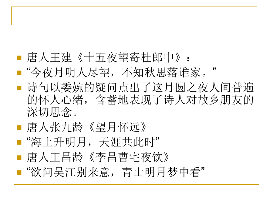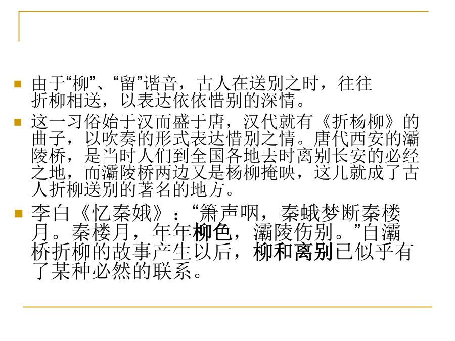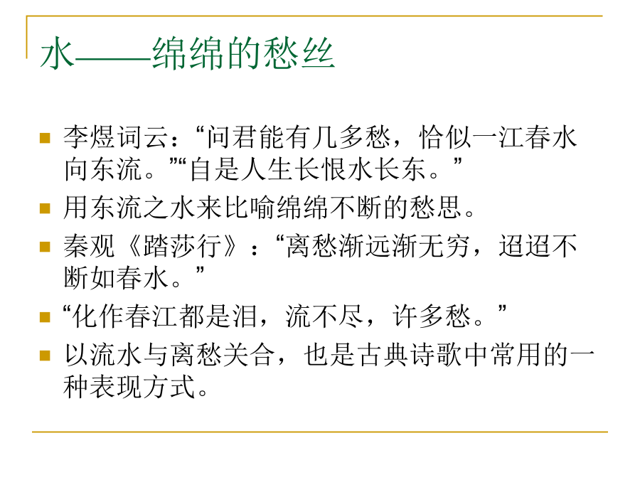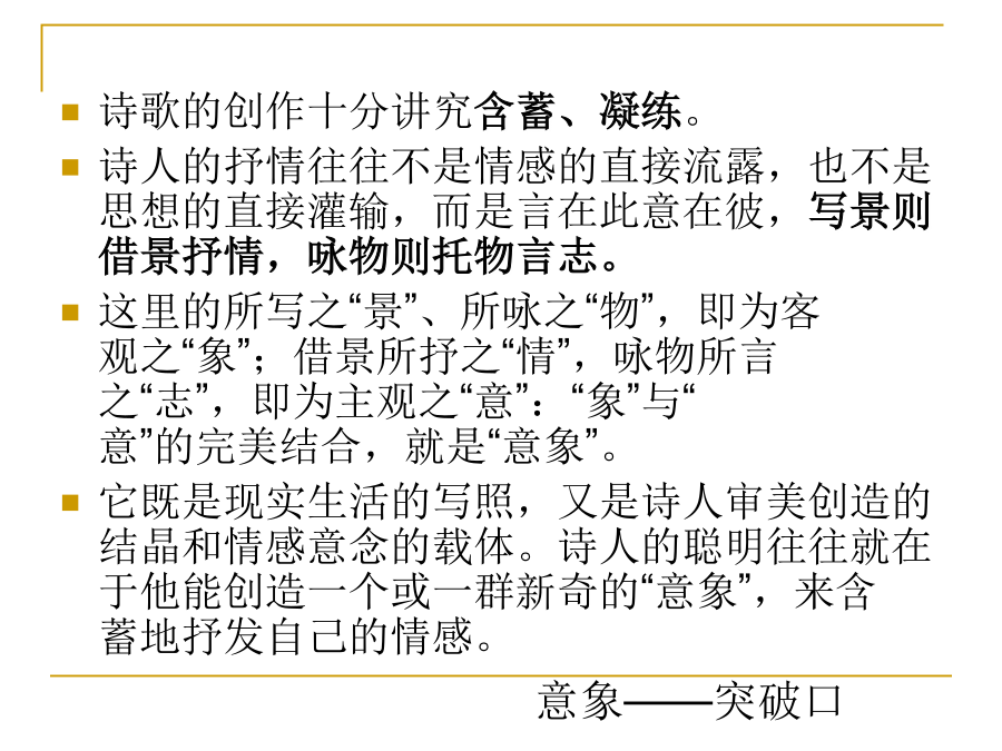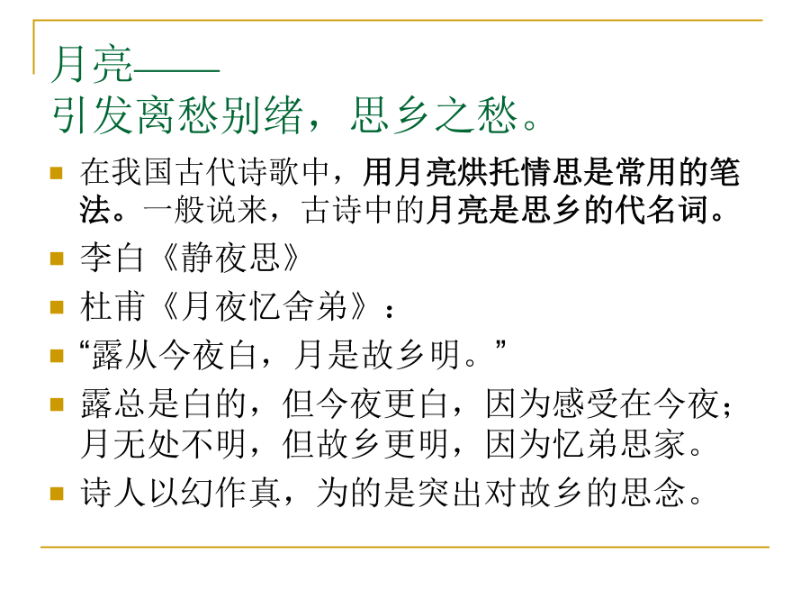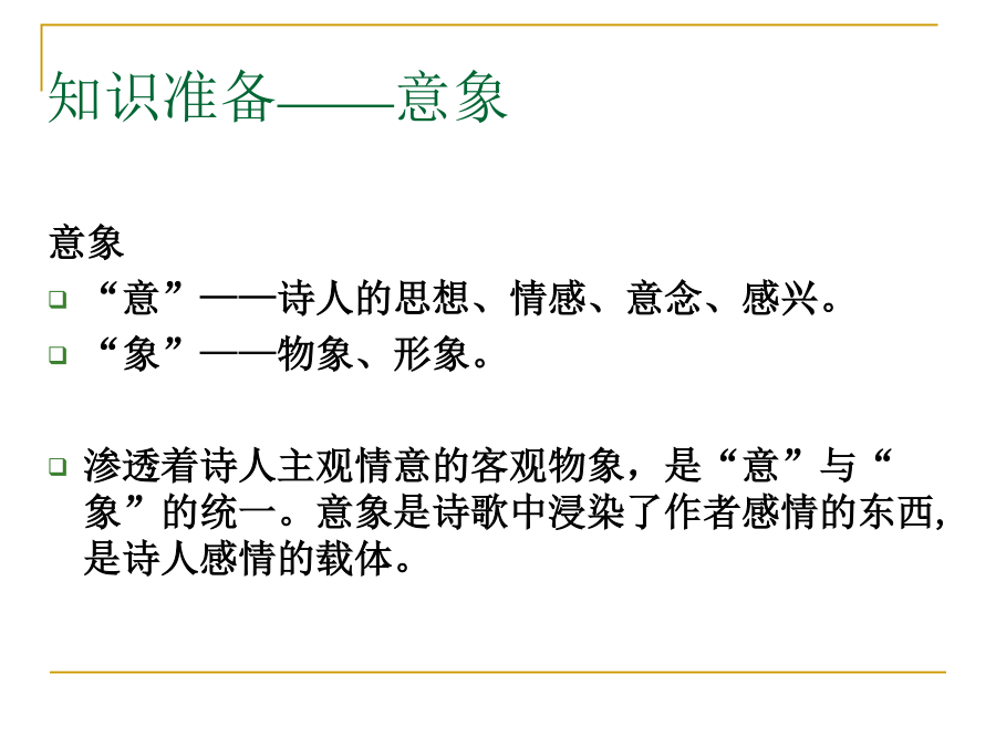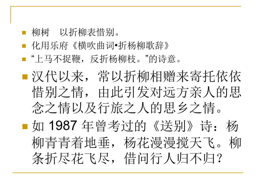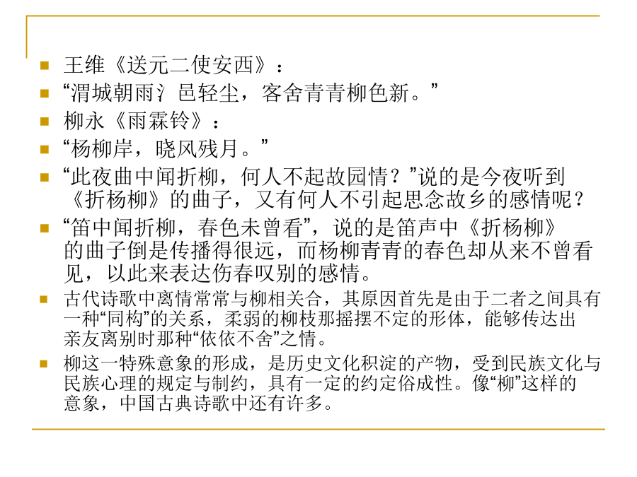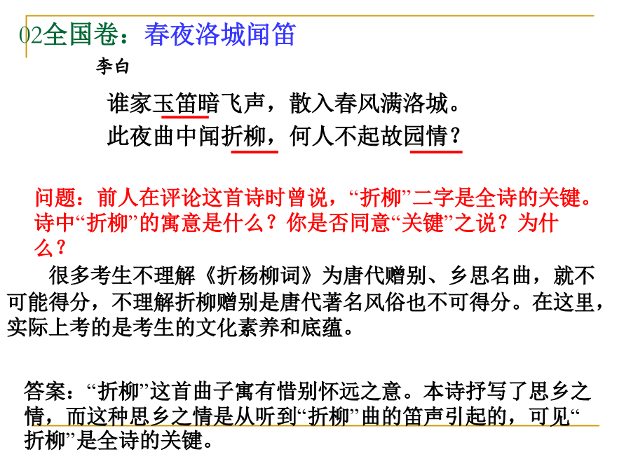 高考常见意象汇总02全国卷:春夜洛城闻笛李白诗歌的创作十分讲究含蓄、凝练。诗人的抒情往往不是情感的直接流露,也不是思想的直接灌输,而是言在此意在彼,写景则借景抒情,咏物则托物言志。这里的所写之“景”、所咏之“物”,即为客观之“象”;借景所抒之“情”,咏物所言之“志”,即为主观之“意”:“象”与“意”的完美结合,就是“意象”。它既是现实生活的写照,又是诗人审美创造的结晶和情感意念的载体。诗人的聪明往往就在于他能创造一个或一群新奇的“意象”,来含蓄地抒发自己的情感。知识准备——意象月亮——引发离愁别绪,思乡之愁。水——绵绵的愁丝柳树以折柳表惜别。化用乐府《横吹曲词•折杨柳歌辞》“上马不捉鞭,反折杨柳枝。”的诗意。汉代以来,常以折柳相赠来寄托依依惜别之情,由此引发对远方亲人的思念之情以及行旅之人的思乡之情。如1987年曾考过的《送别》诗:杨柳青青着地垂,杨花漫漫搅天飞。柳条折尽花飞尽,借问行人归不归?王维《送元二使安西》:“渭城朝雨氵邑轻尘,客舍青青柳色新。”柳永《雨霖铃》:“杨柳岸,晓风残月。”“此夜曲中闻折柳,何人不起故园情?”说的是今夜听到《折杨柳》的曲子,又有何人不引起思念故乡的感情呢?“笛中闻折柳,春色未曾看”,说的是笛声中《折杨柳》的曲子倒是传播得很远,而杨柳青青的春色却从来不曾看见,以此来表达伤春叹别的感情。古代诗歌中离情常常与柳相关合,其原因首先是由于二者之间具有一种“同构”的关系,柔弱的柳枝那摇摆不定的形体,能够传达出亲友离别时那种“依依不舍”之情。柳这一特殊意象的形成,是历史文化积淀的产物,受到民族文化与民族心理的规定与制约,具有一定的约定俗成性。像“柳”这样的意象,中国古典诗歌中还有许多。梧桐——离愁、凄苦王昌龄《长信秋词》:“金井梧桐秋叶黄,珠帘不卷夜来霜。熏笼玉枕无颜色,卧听南宫清漏长。”写的是被剥夺了青春、自由和幸福的少女,在凄凉寂寞的深宫里,形孤影单、卧听宫漏的情景。诗歌的起首句以井边叶黄的梧桐破题,烘托了一个萧瑟冷寂的氛围。元人徐再思《双调水仙子•夜雨》:“一声梧叶一声秋,一点芭蕉一点愁,三更归梦三更后。”以梧桐叶落和雨打芭蕉写尽愁思。芭蕉——孤独忧愁特别是离情别绪芳草——在中国古典诗歌中喻离恨菊花——诗人人格的写照梅花杜鹃——凄凉、哀伤李白《蜀道难》:“又闻子归啼夜月,愁空山。”李白诗云:“杨花飘落子规啼,闻道龙标过五溪。”白居易《琵琶行》:“杜鹃啼血猿哀鸣。”秦观《踏莎行》“可堪孤馆闭春寒,杜鹃声里斜阳暮。”文天祥《金陵驿二首》:“从今别江南路,化作啼鹃带血归。”杜鹃的啼叫又好像是说“不如归去,不如归去”,它的啼叫容易触动人们的乡愁乡思,宋代范仲淹诗云:“夜入翠烟啼,昼寻芳树飞,春山无限好,犹道不如归。”宋人贺铸《忆秦娥》:“三更月,中庭恰照梨花雪;梨花雪,不胜凄断,杜鹃啼血。”三更月光照在庭院里雪白的梨花上,杜鹃鸟在凄厉地鸣叫着,使人禁不住倍加思念亲人,伤心欲绝。词人通过描写凄清的景物,寄托了幽深的乡思。“子规夜半犹啼血,不信东风唤不回”(宋人王令《送春》)等,都以杜鹃鸟的哀鸣,来表达哀怨、凄凉或思归的情思。鸿雁——游子思乡怀亲之情和羁旅伤感。阅读下面唐诗,完成(1)~(2)题。(2003年春季北京题)闻雁(韦应物)寒塘(赵嘏)故园渺何处?归思方悠哉。晓发梳临水,寒塘坐见秋。淮南秋夜雨,高斋闻雁来。乡心正无限,一雁过南楼。鹧鸪鸟鹧鸪的鸣声让人听起来极容易勾起旅途艰险的联想和满腔的离愁别绪。“落照苍茫秋草明,鹧鸪啼处远人行”唐人李群玉《九子坡闻鹧鸪》“江晚正愁余,山深闻鹧鸪”辛弃疾《菩萨蛮•书江西造口壁》猿啼蝉—品行高洁寒蝉—悲凉常见意象——地点表送别常见意象——乐器以浮云比喻在外漂泊的游子,如“浮云游子意,落日故人情”(李白《送友人》);鸳鸯、比目鱼,指恩爱的夫妇,如“得成比目何辞死,愿作鸳鸯不羡仙”(唐人卢照邻《长安古意》);丁香,指愁思或情结,如“自从南浦别,愁见丁香结”(唐人牛峤《感恩多》),“丁香空结雨中愁”等等。燕子----今非昔比、物在人亡嫦娥----孤独、悔恨杨花----离散、漂泊杨柳----离别日----暗喻明君佩剑----表达要建功立业的壮烈情怀流水----暗示年华或时光易逝。长亭----离别南浦、西楼—送别之地登楼、危栏----常有思乡怀远之意一些常见意象比较固定的文化内涵